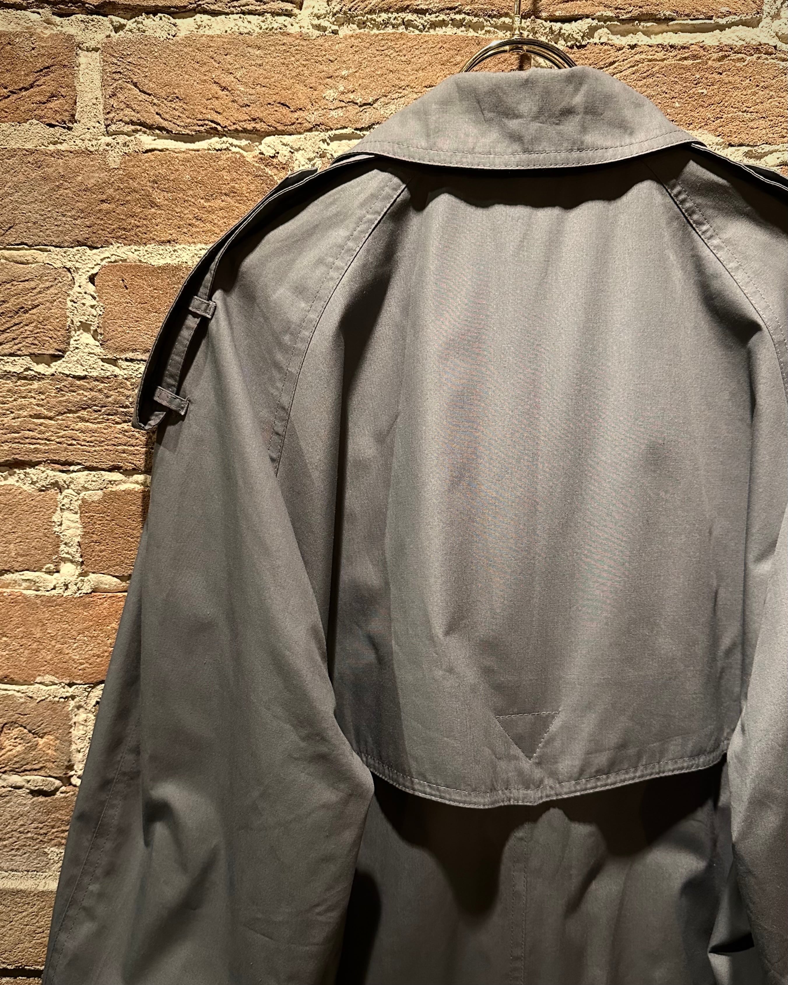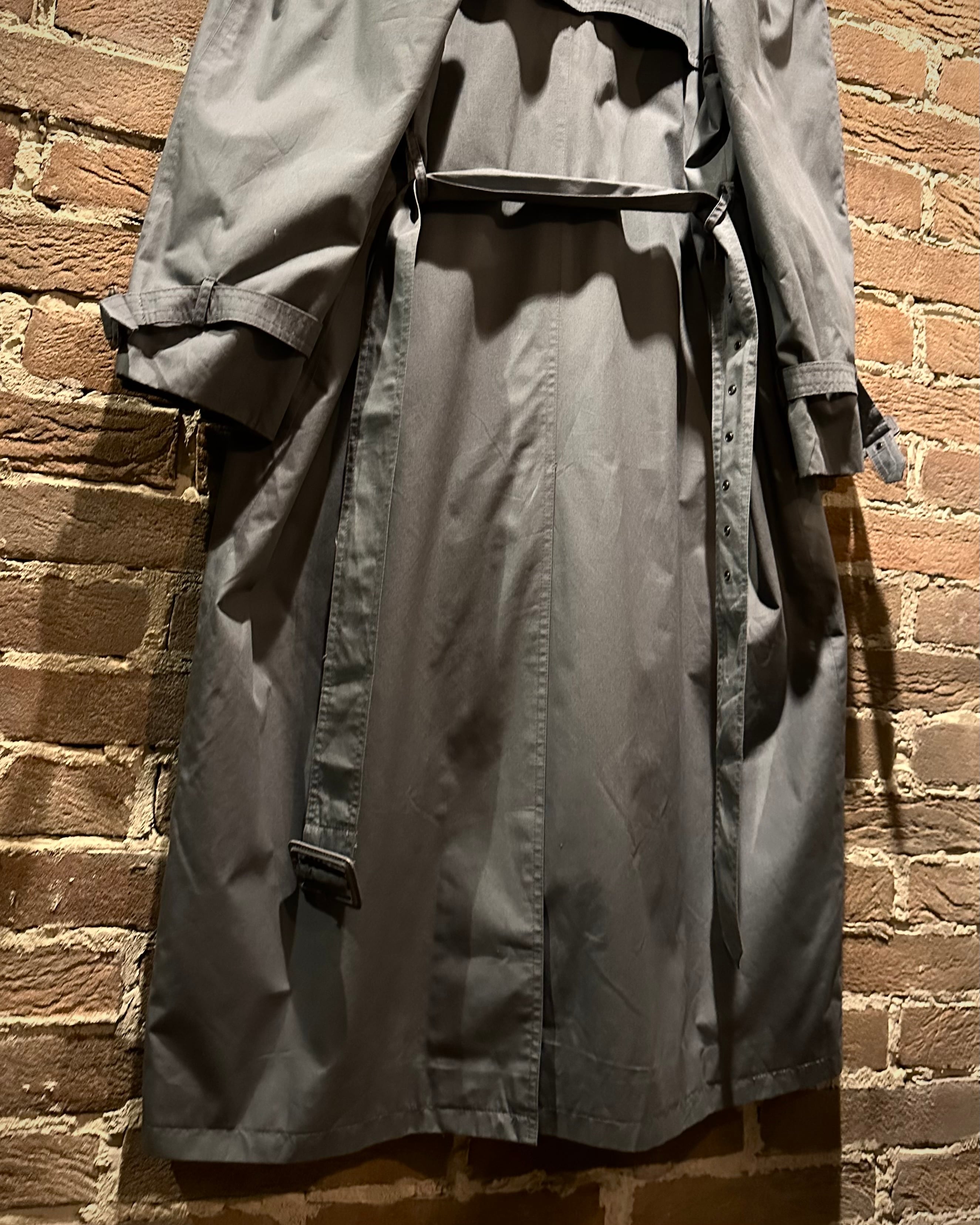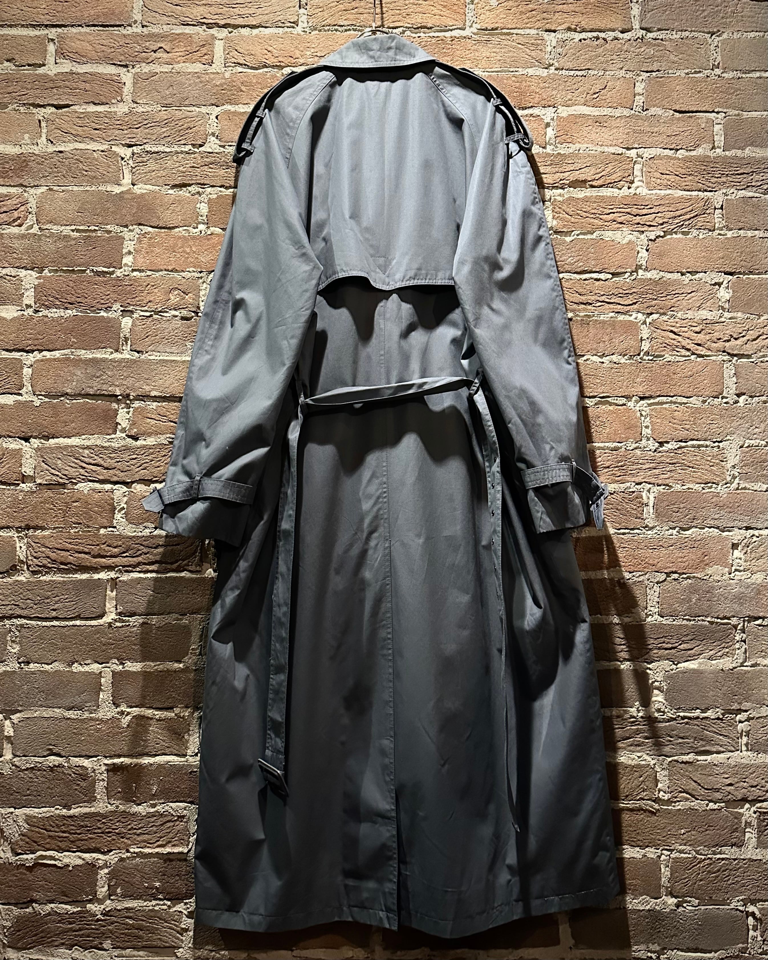 ハリとコシを持ちながらも、滑らかな質感に仕上げられた、くすんだグレーカラーの上質な素材を使用したトレンチコート。