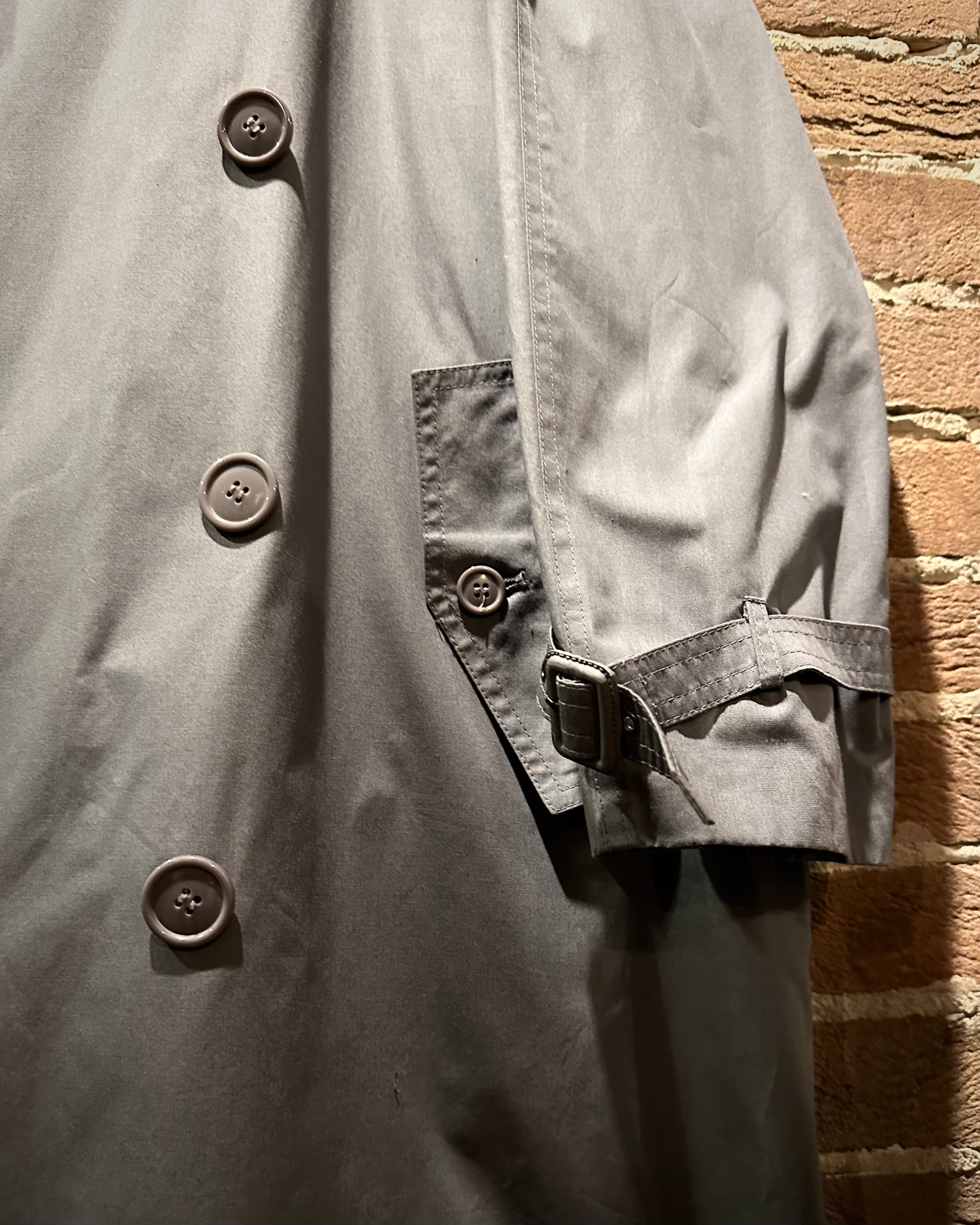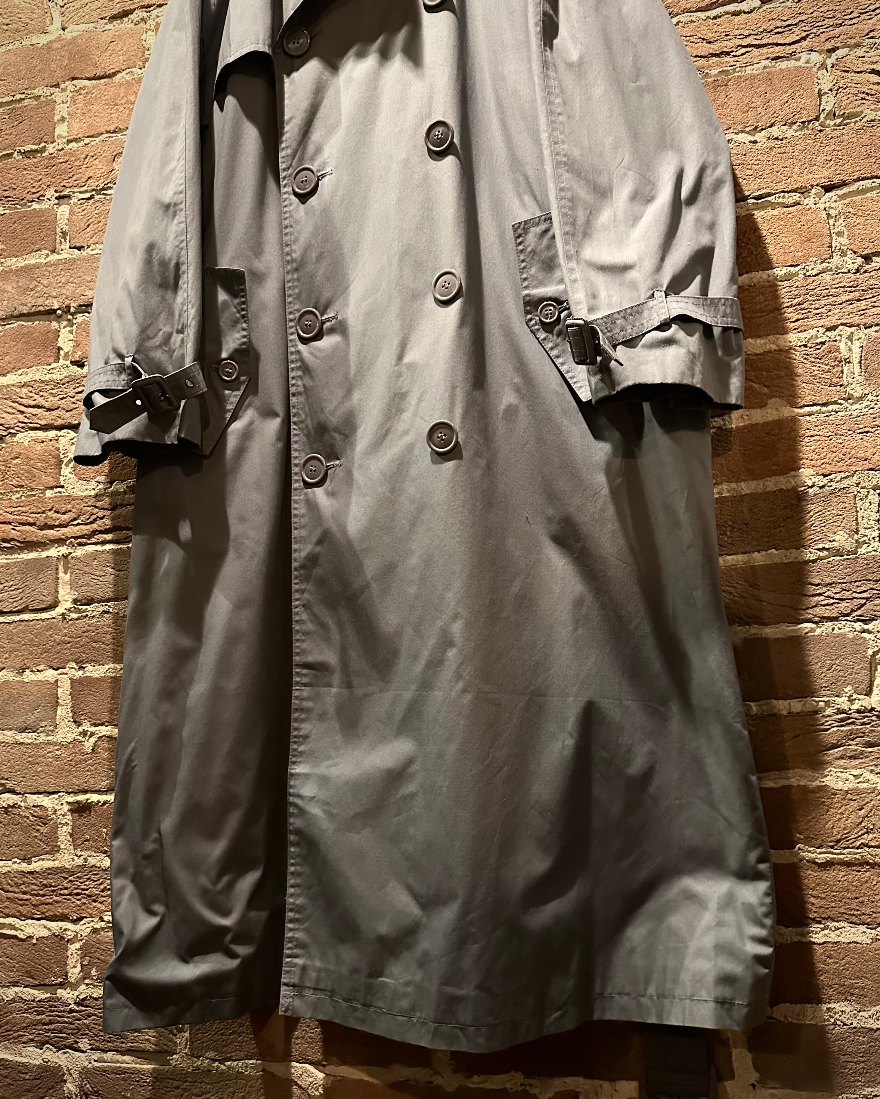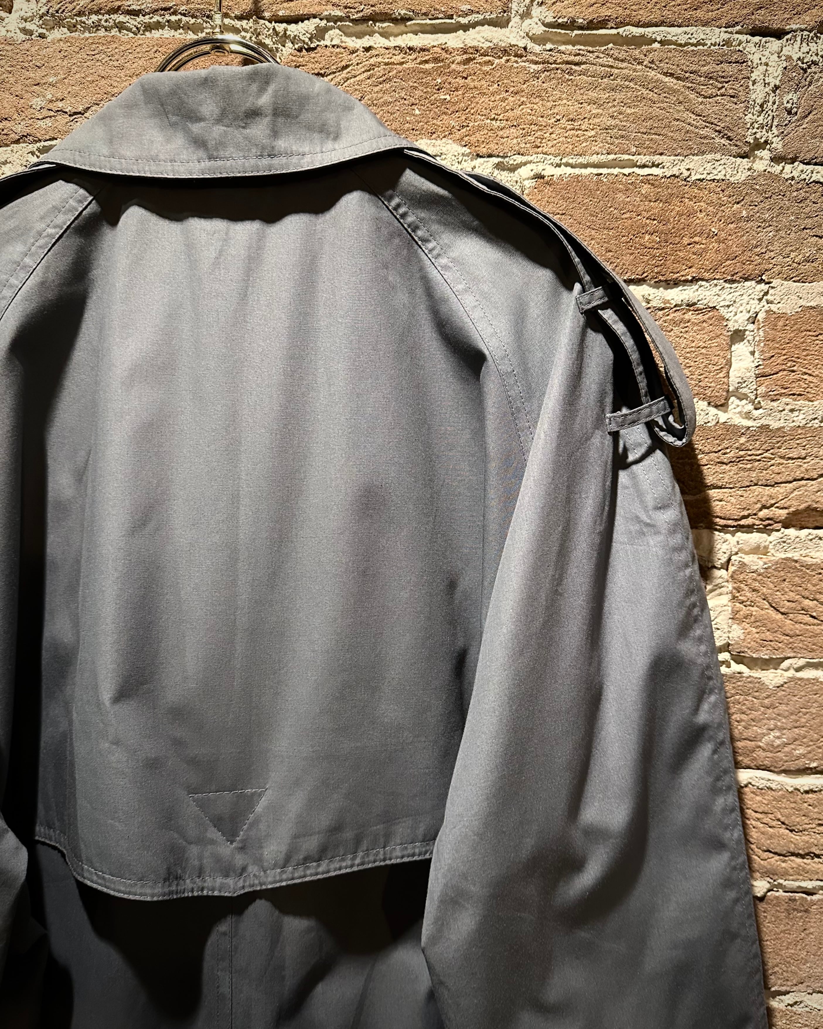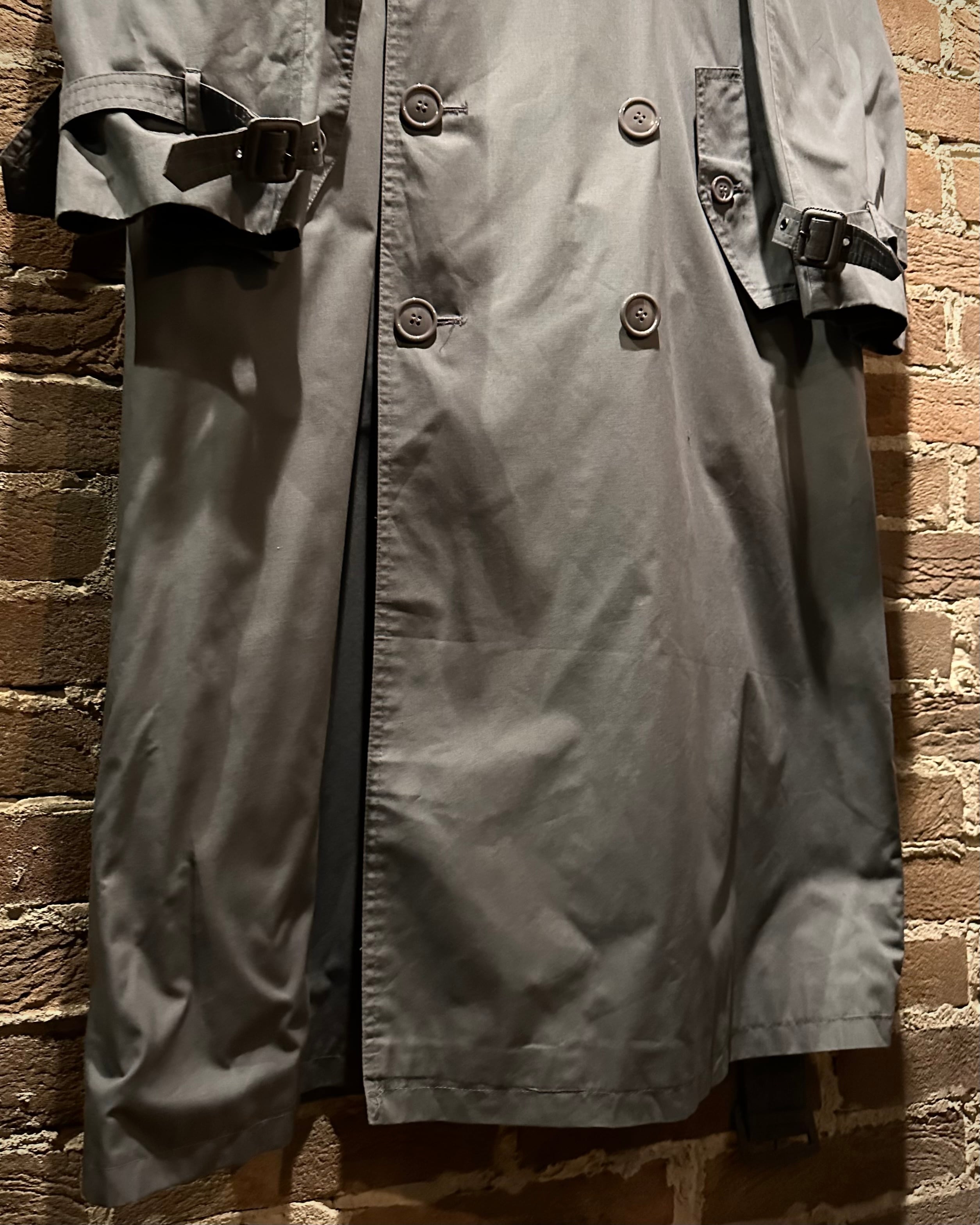ハリとコシを持ちながらも、滑らかな質感に仕上げられた、くすんだグレーカラーの上質な素材を使用したトレンチコート。