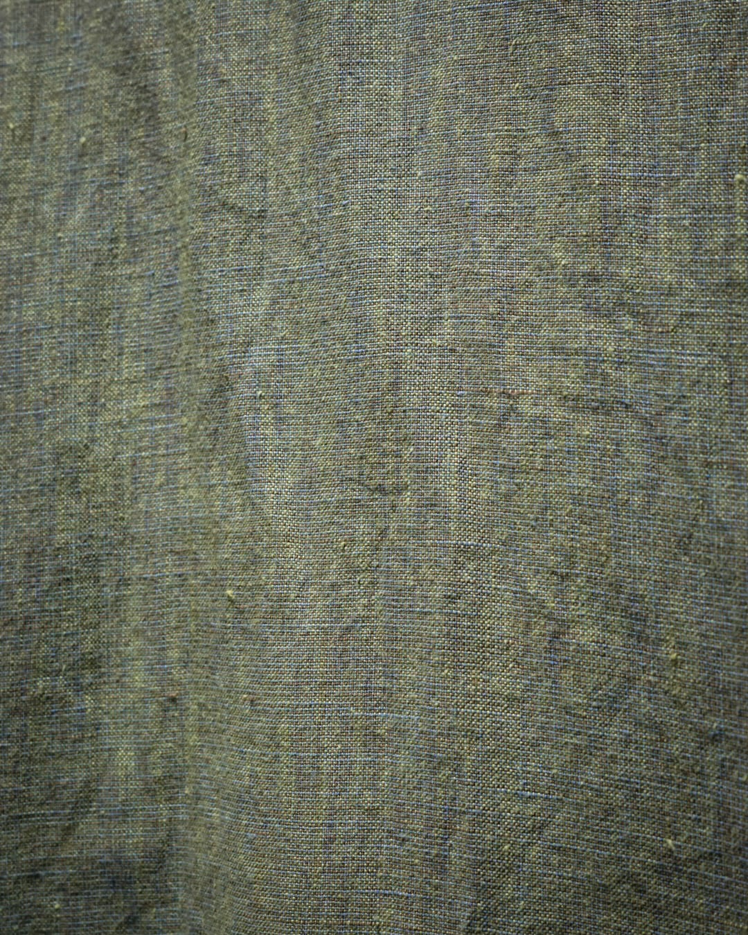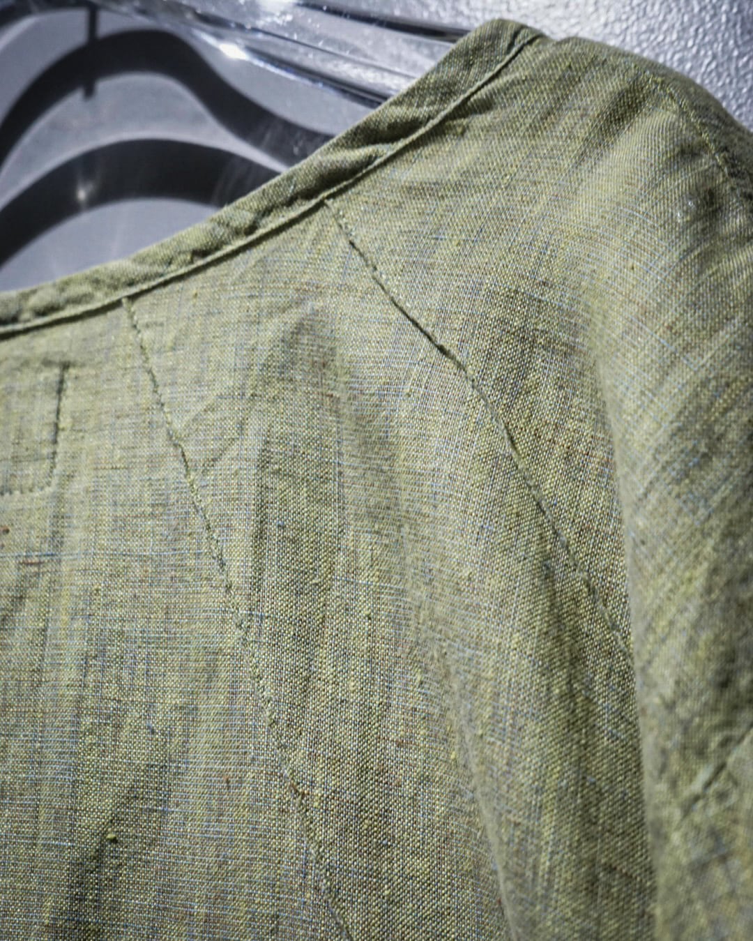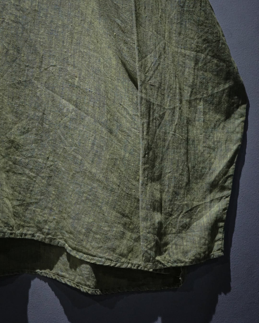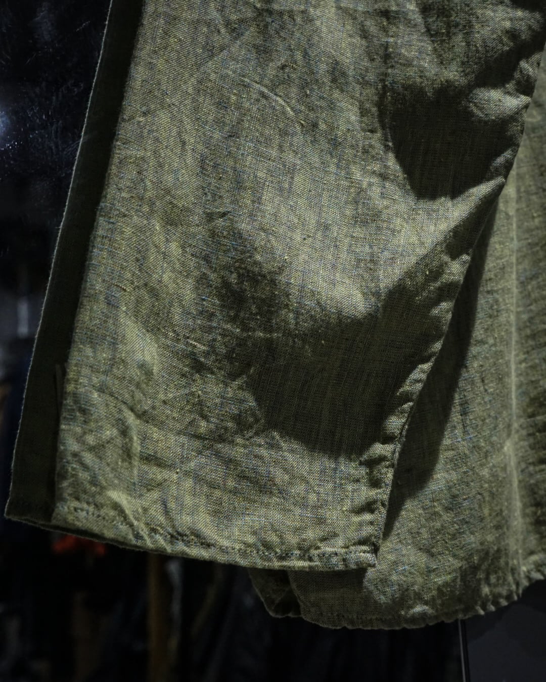 ボディには100%リネンを使用。リネン特有のドライなタッチと軽やかさ、自然なシワ感が相まって、奥行きのある表情を演出。淡いオリーブカラーも相まって、どこか柔らかく、空気を纏うような軽やかな雰囲気に仕上がっています。
