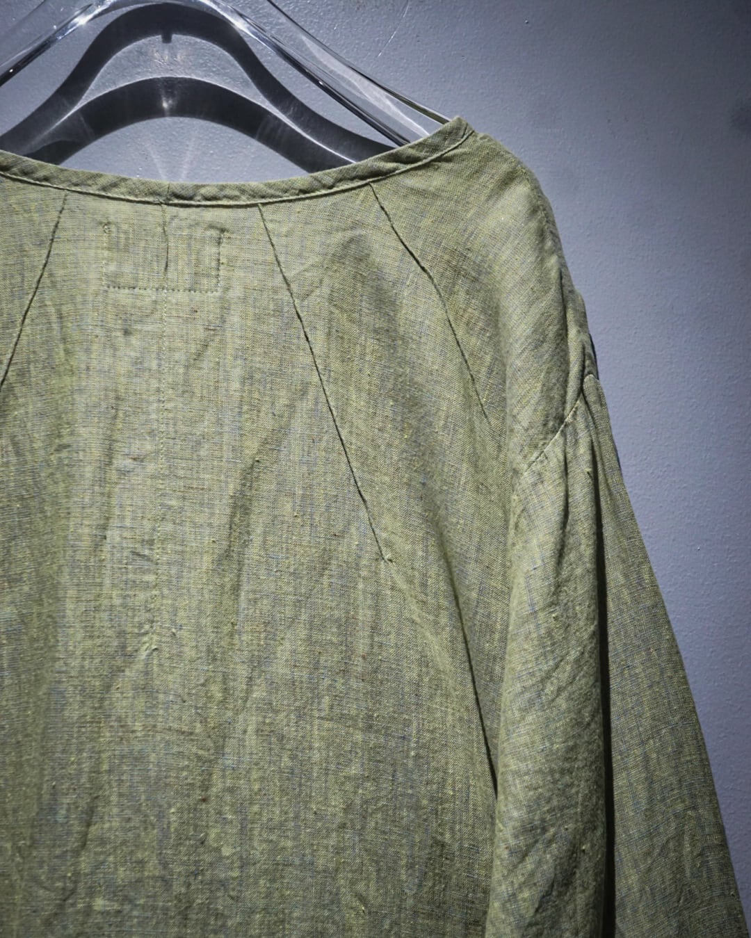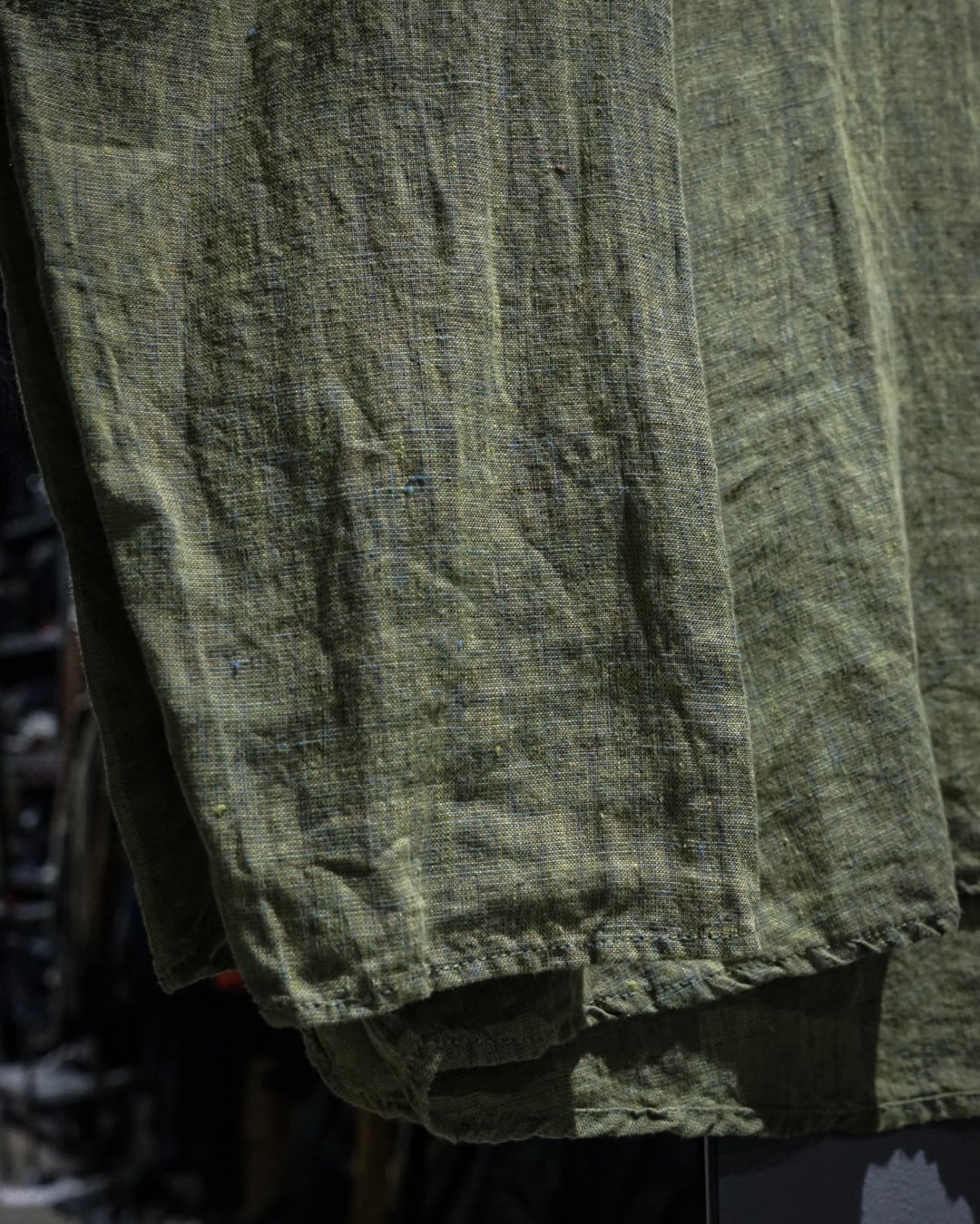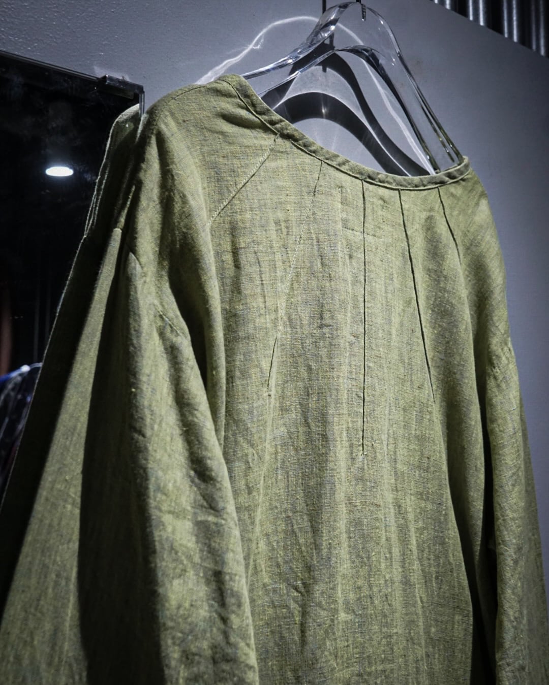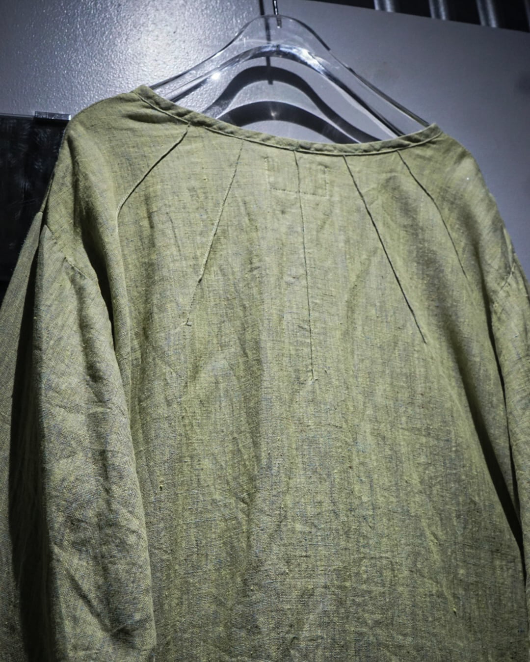 ボディには100%リネンを使用。リネン特有のドライなタッチと軽やかさ、自然なシワ感が相まって、奥行きのある表情を演出。淡いオリーブカラーも相まって、どこか柔らかく、空気を纏うような軽やかな雰囲気に仕上がっています。