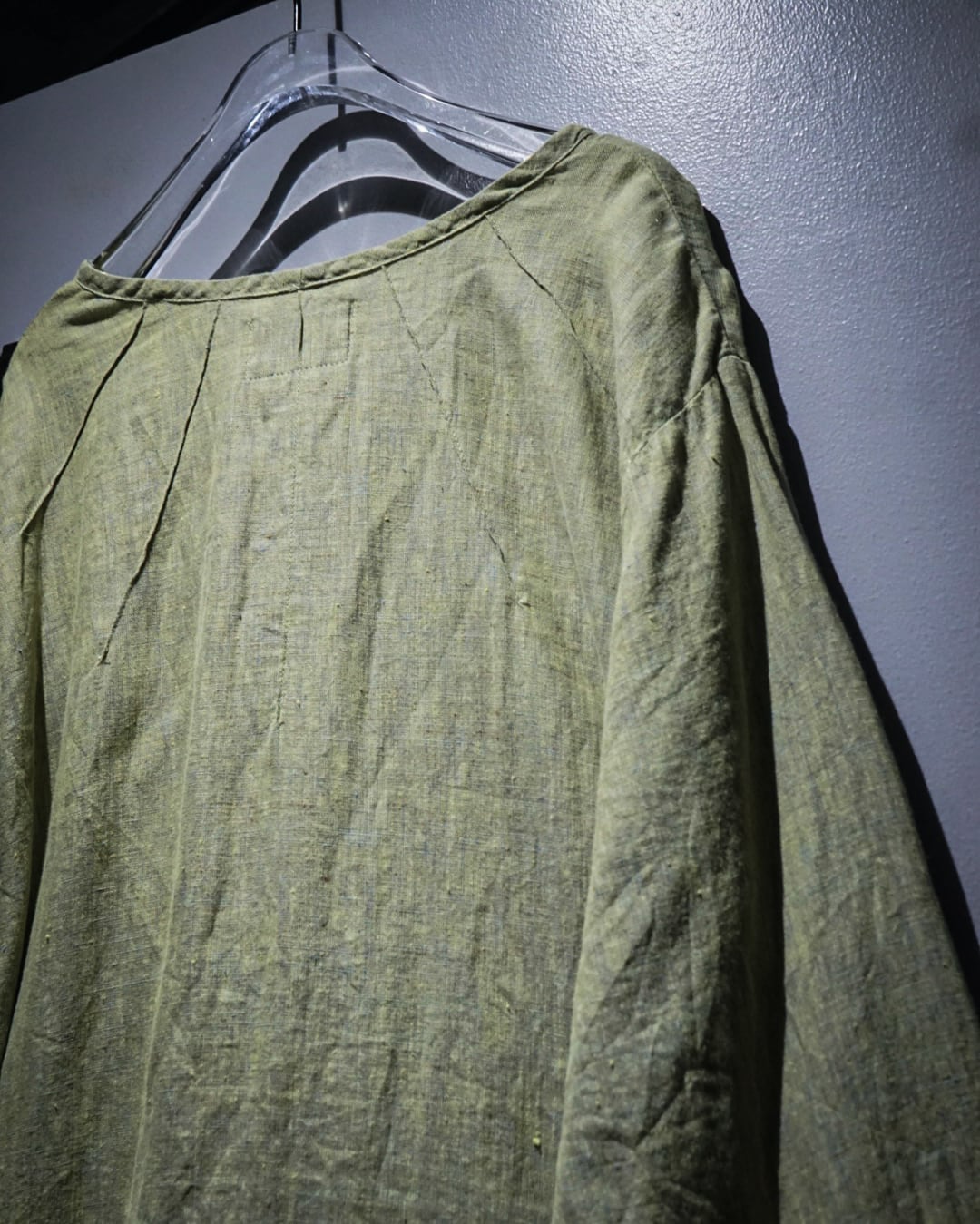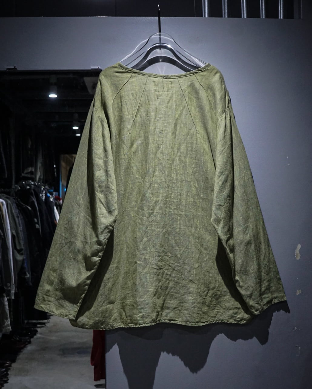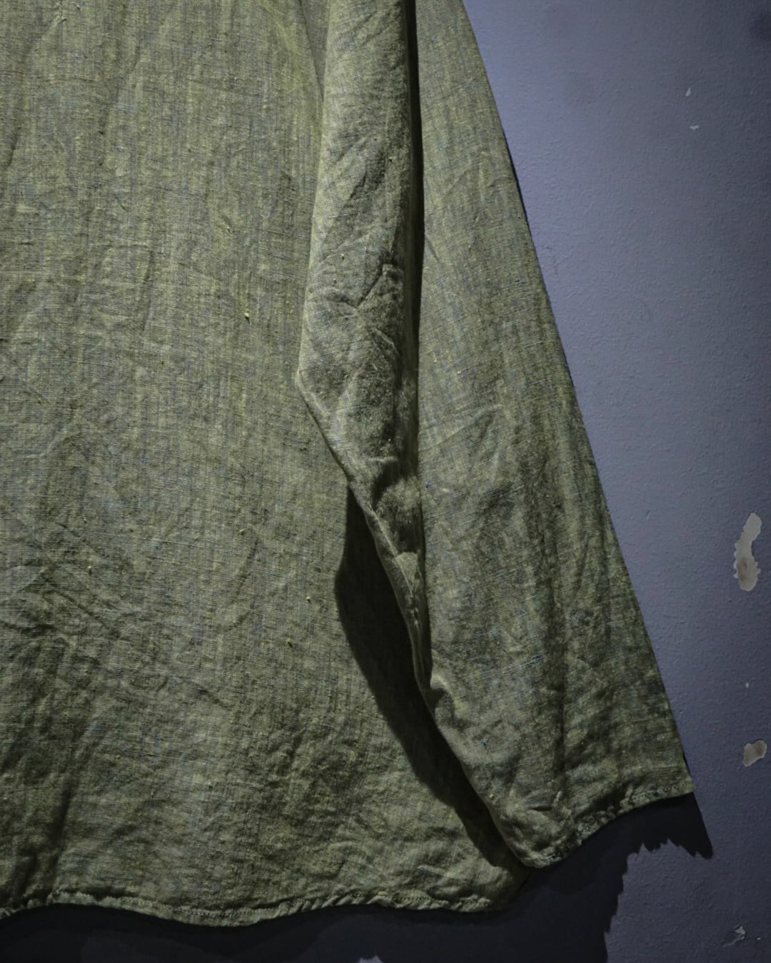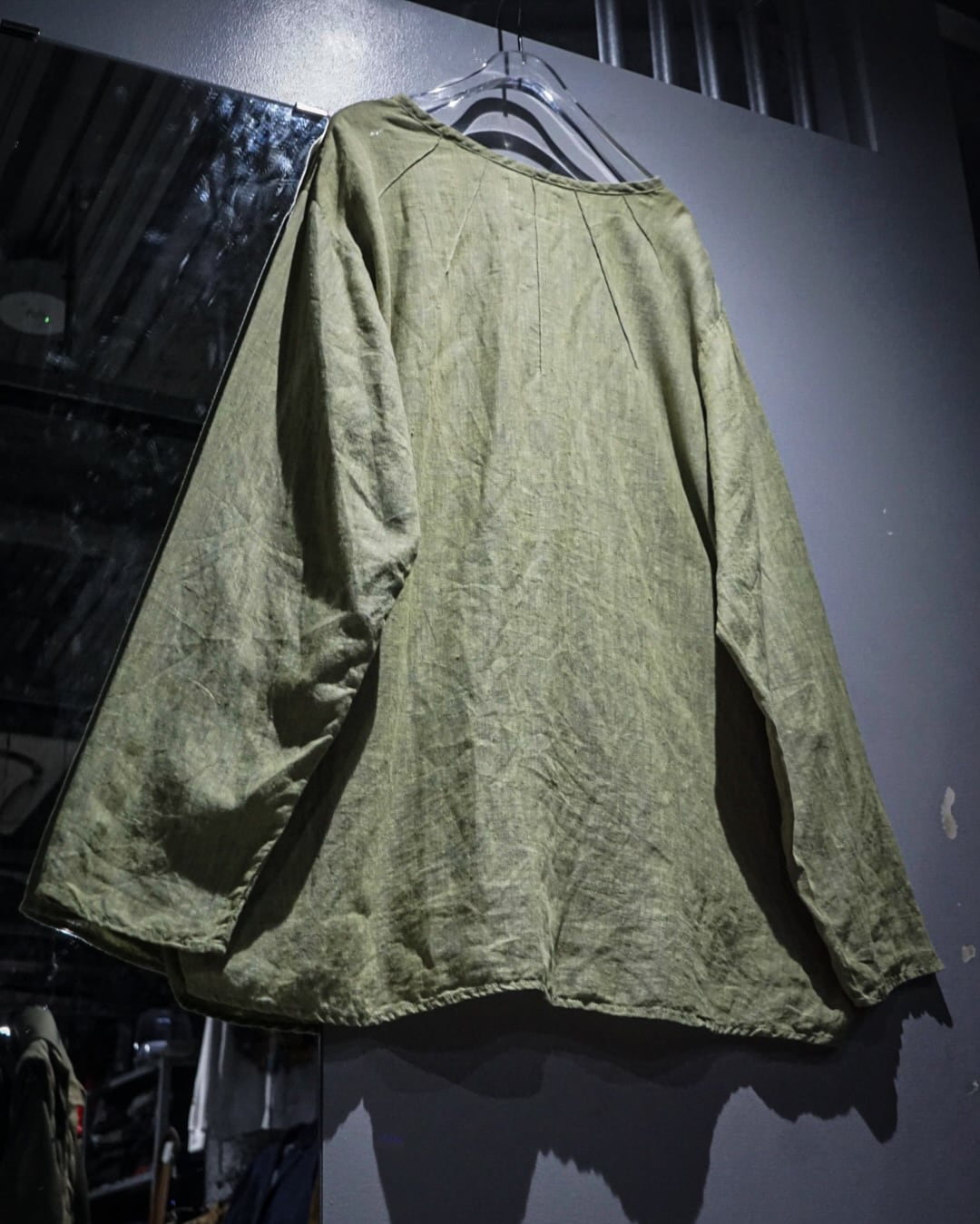 ボディには100%リネンを使用。リネン特有のドライなタッチと軽やかさ、自然なシワ感が相まって、奥行きのある表情を演出。淡いオリーブカラーも相まって、どこか柔らかく、空気を纏うような軽やかな雰囲気に仕上がっています。