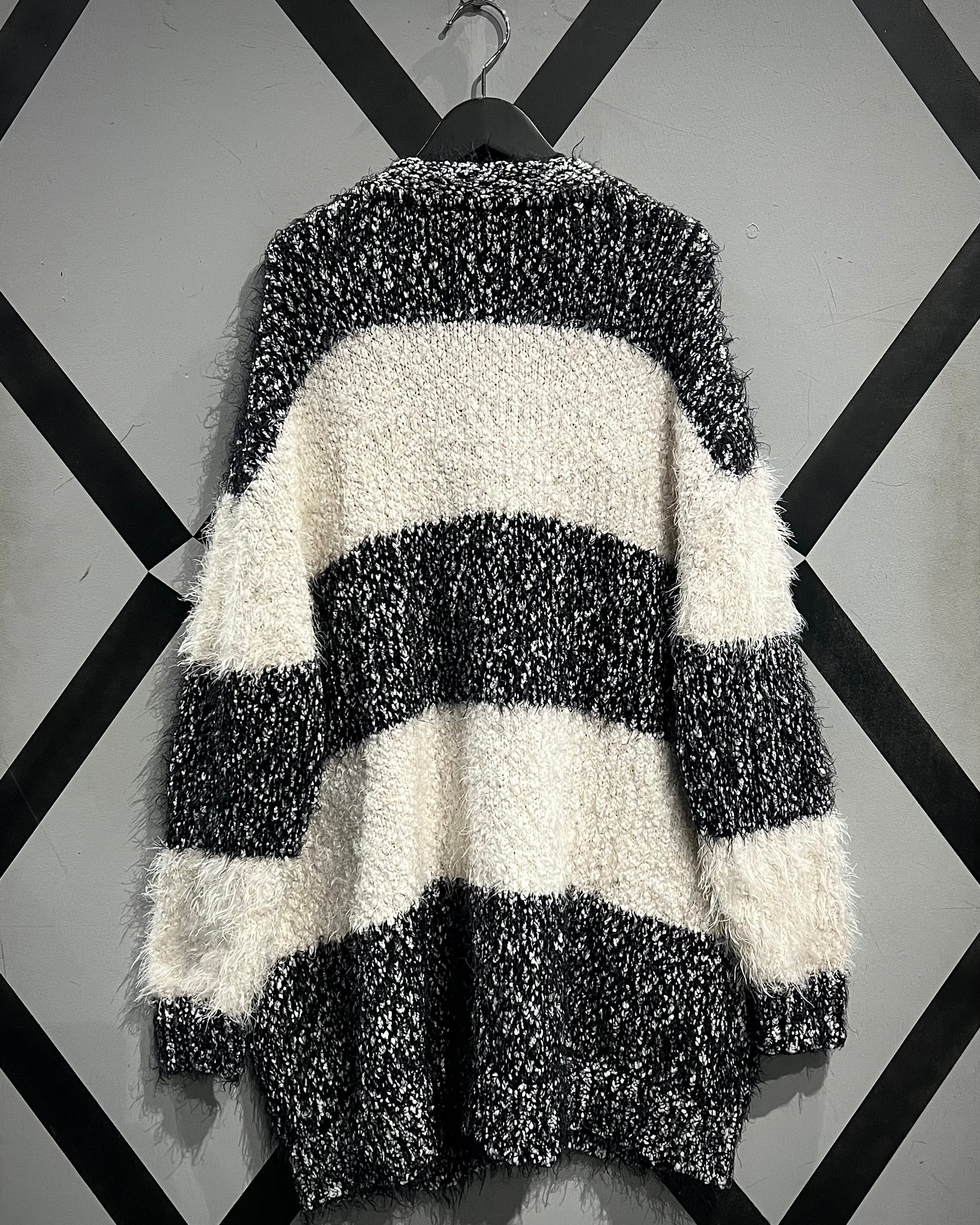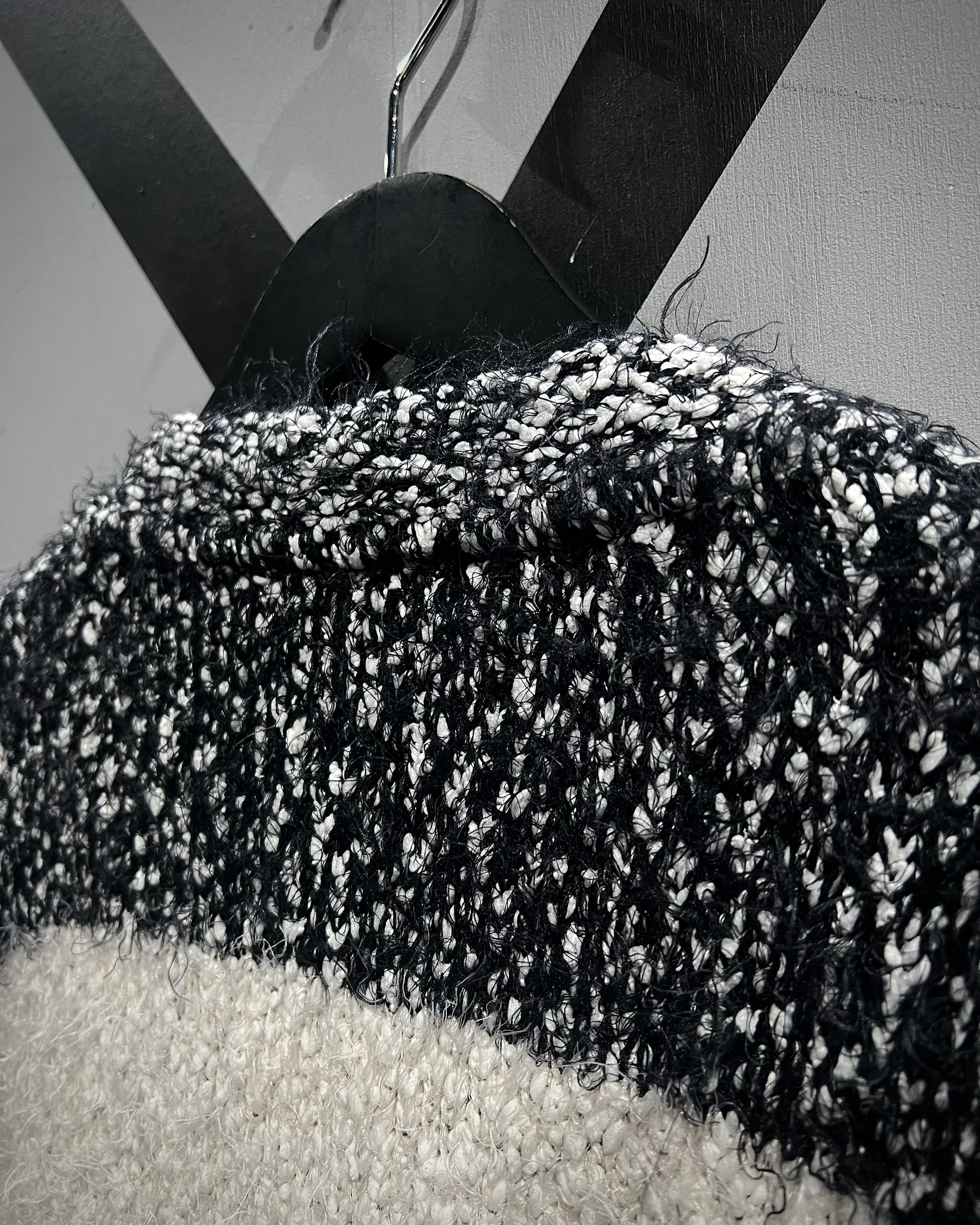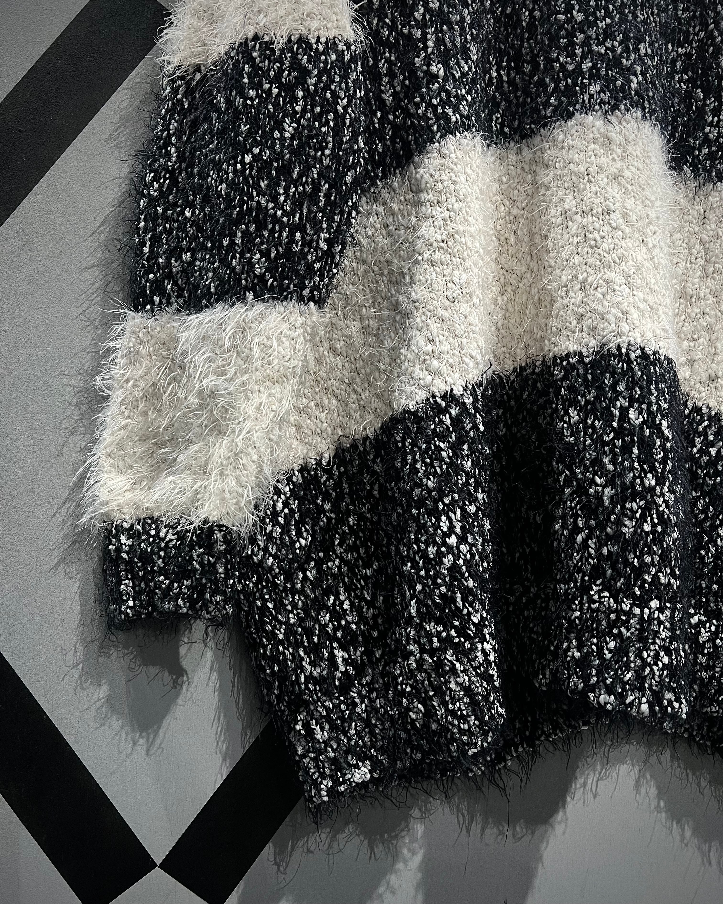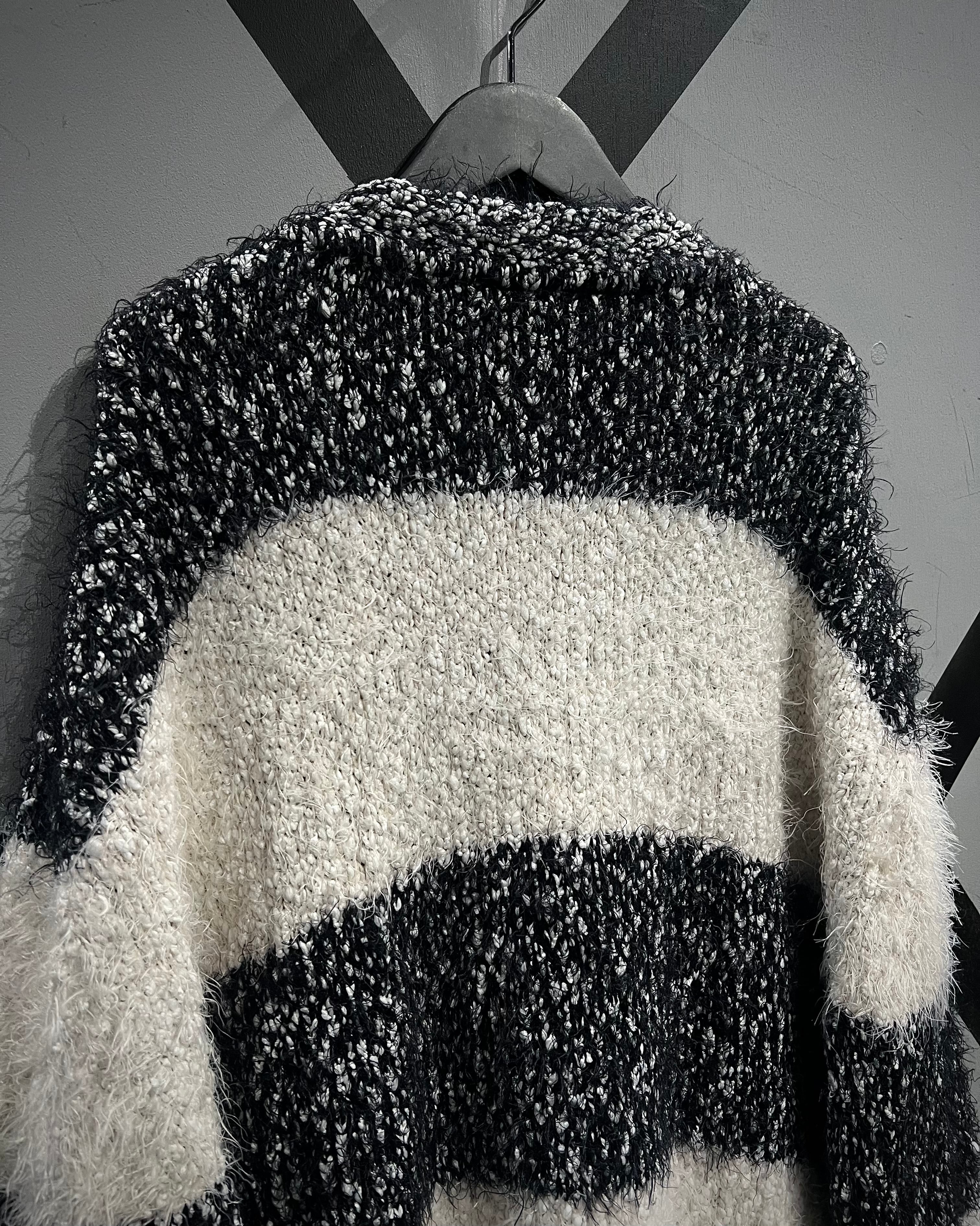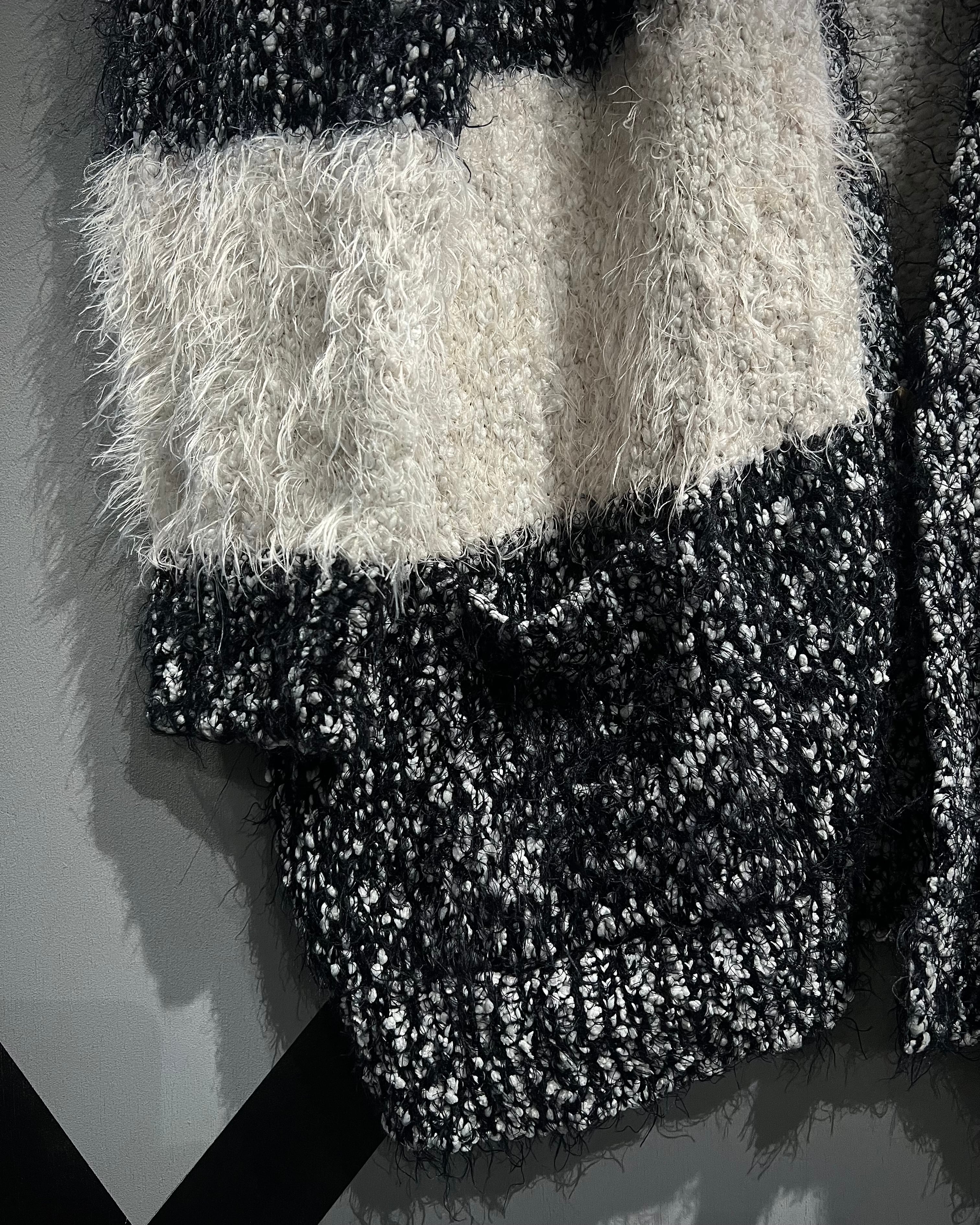 ブラック×ホワイトの大胆なボーダーに、毛足の長い起毛糸とブークレ調の糸を織り交ぜた編み地が特徴。ラフに編み上げられた表情がどこかパンクやグランジを想起させつつ、モノトーンでまとめることで都会的なバランスへと昇華しています。