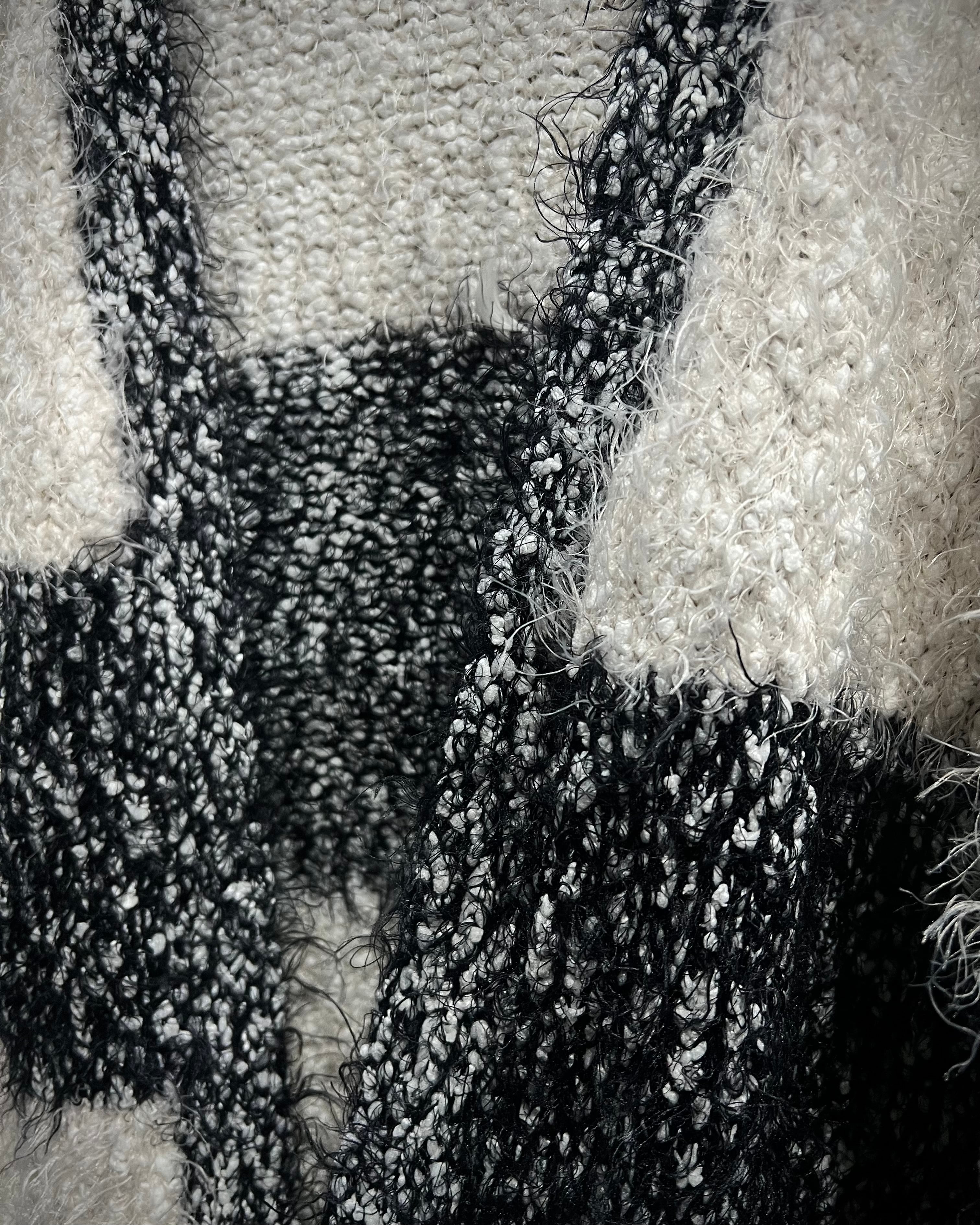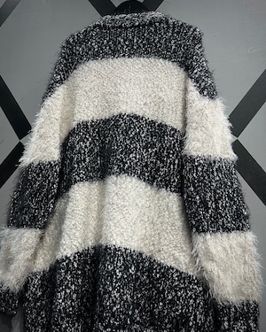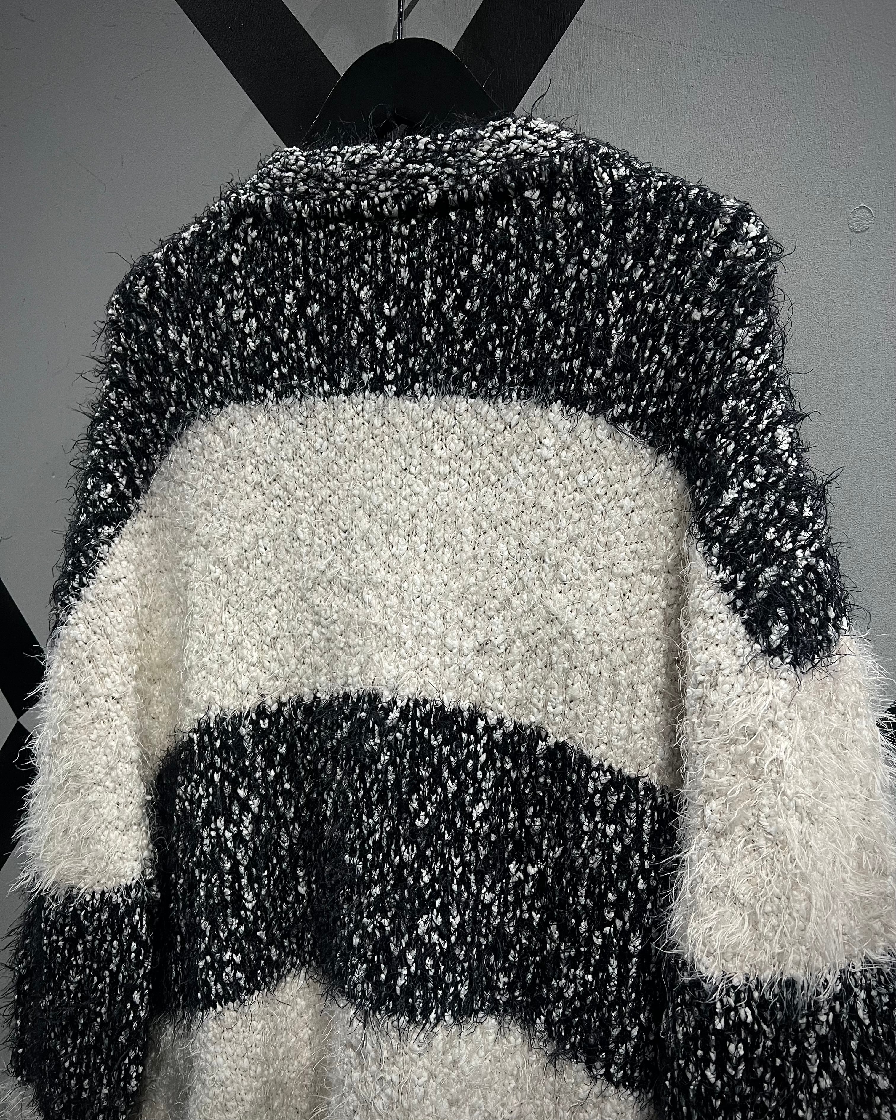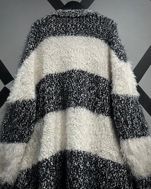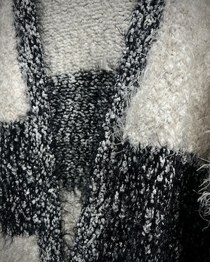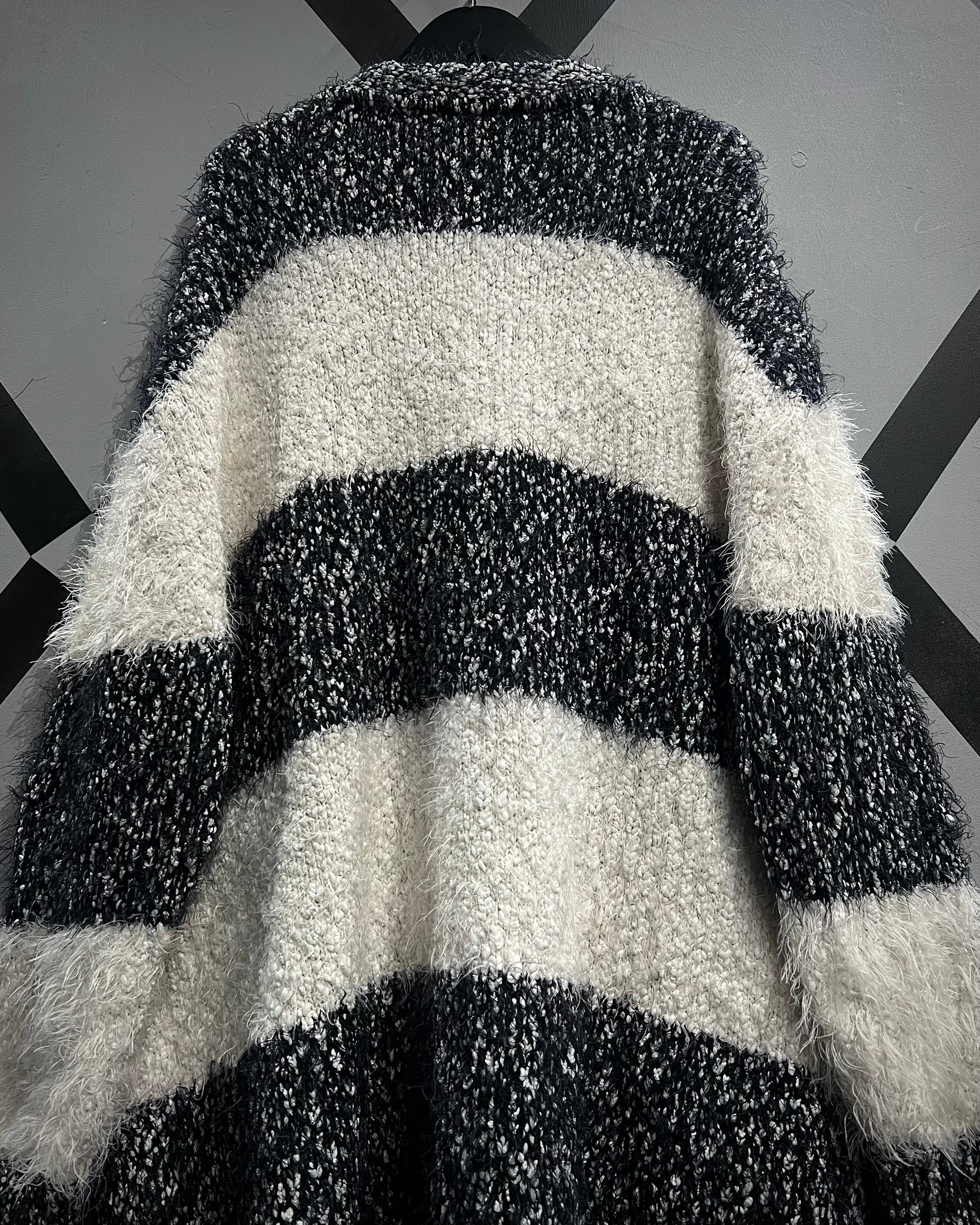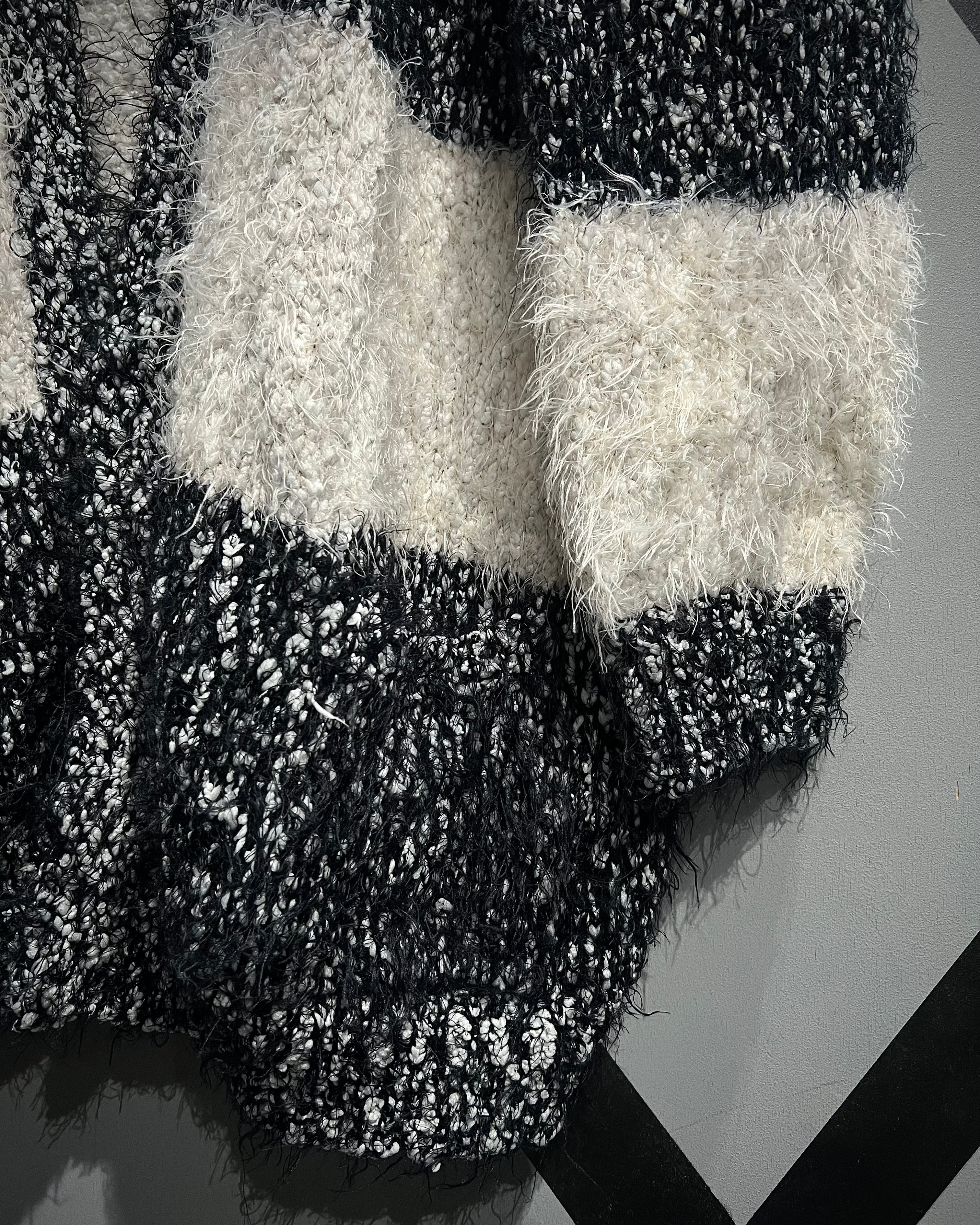 ブラック×ホワイトの大胆なボーダーに、毛足の長い起毛糸とブークレ調の糸を織り交ぜた編み地が特徴。ラフに編み上げられた表情がどこかパンクやグランジを想起させつつ、モノトーンでまとめることで都会的なバランスへと昇華しています。