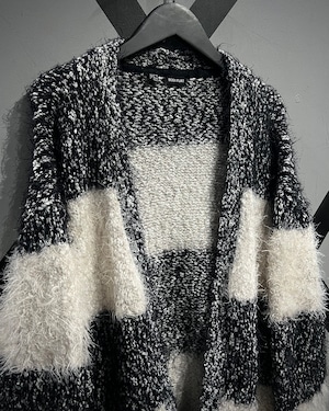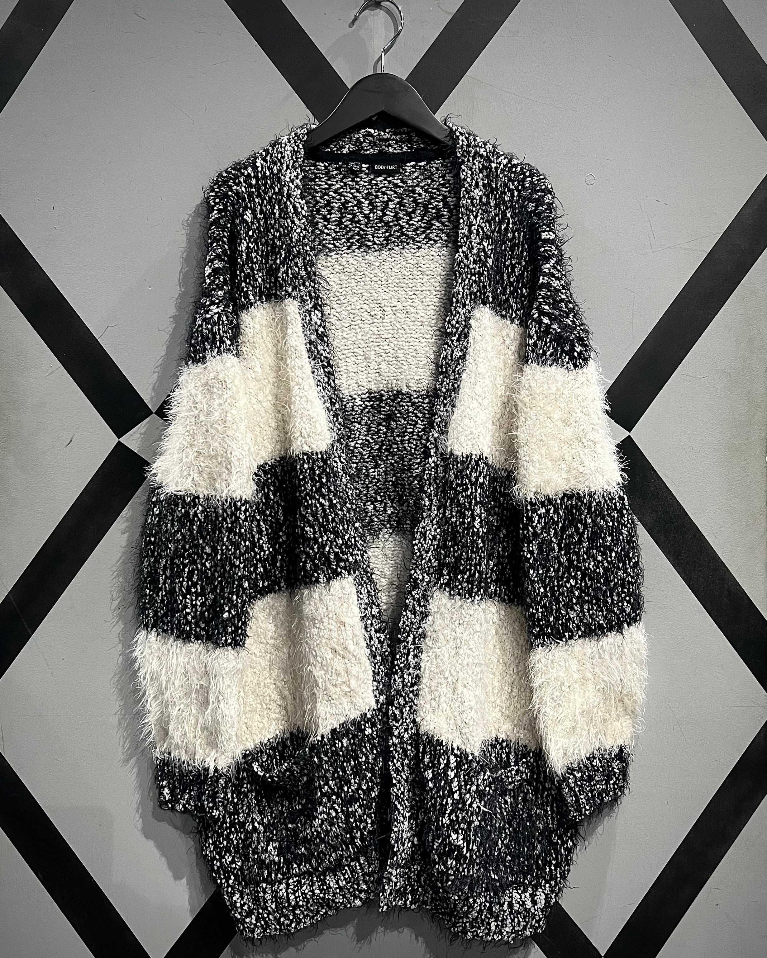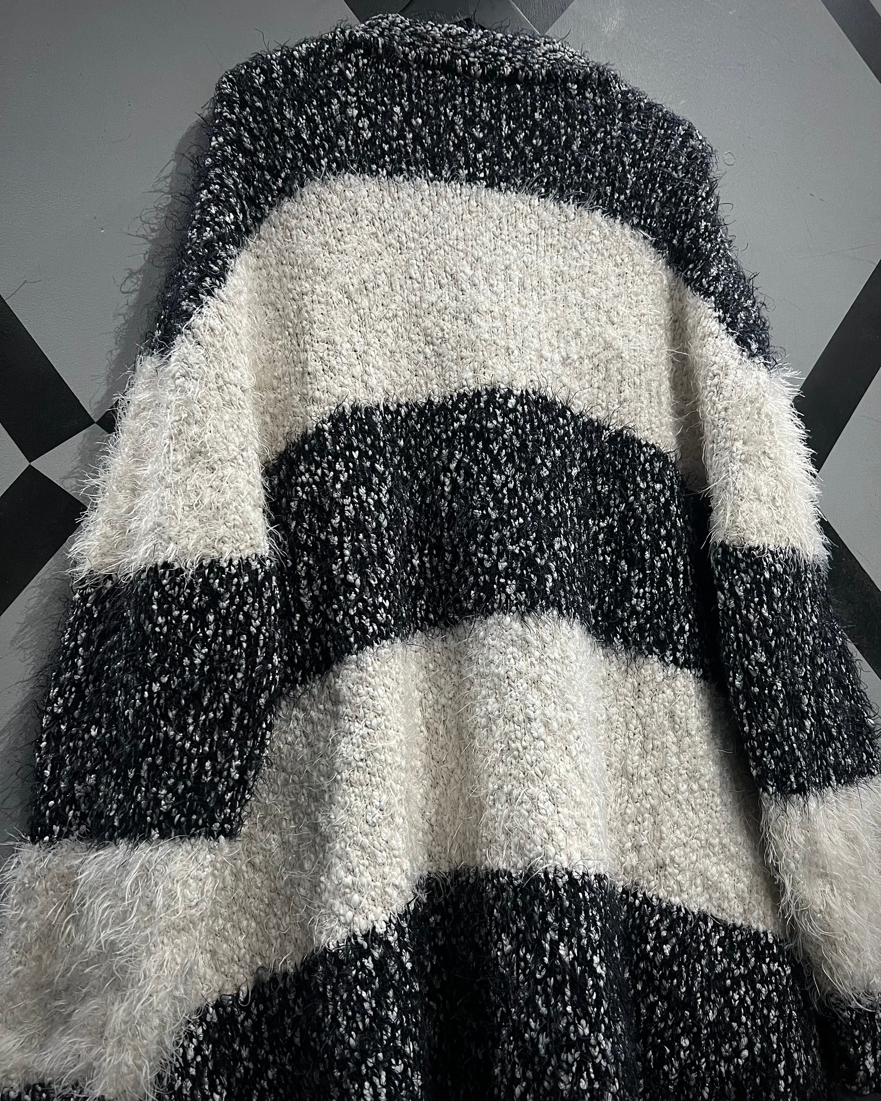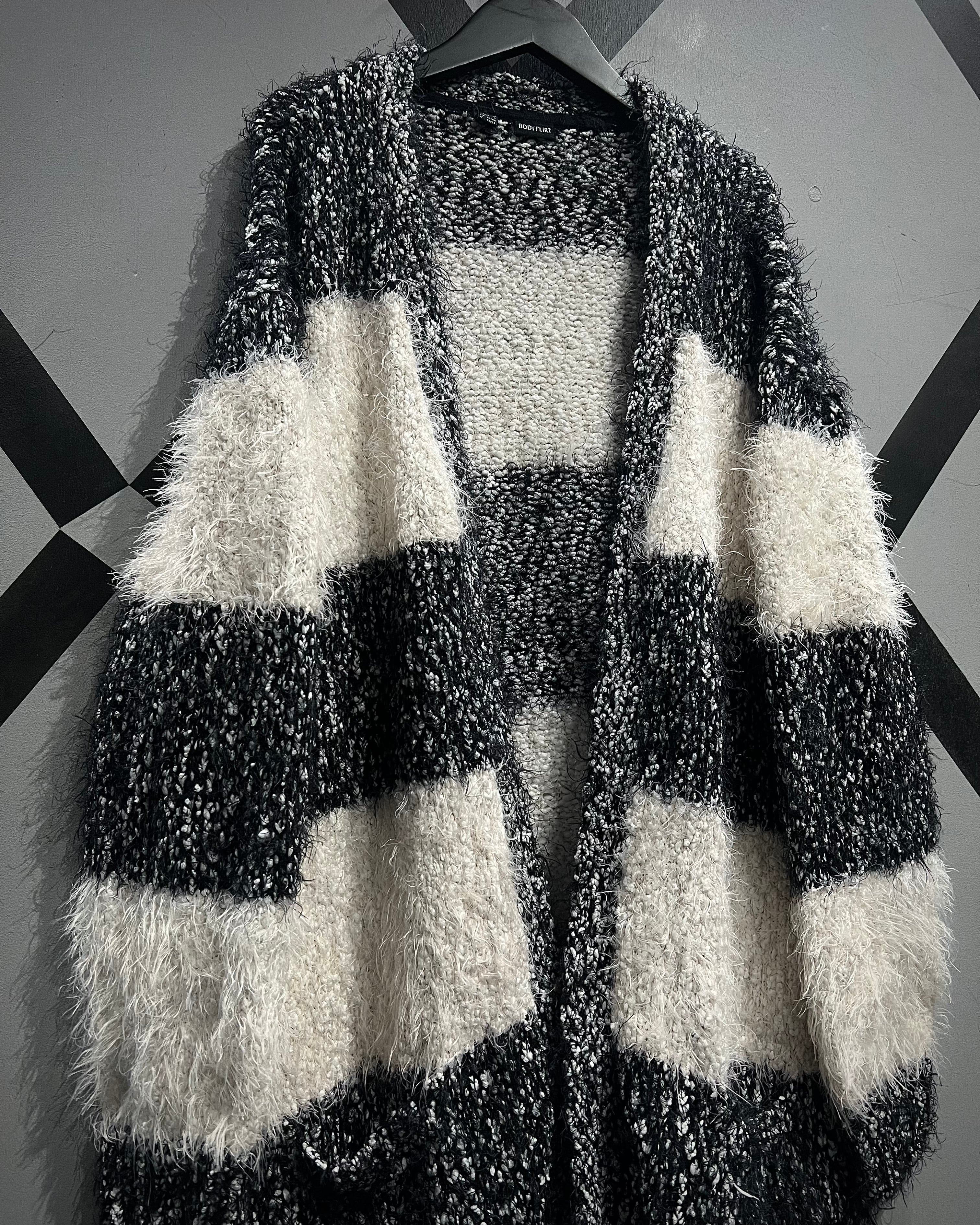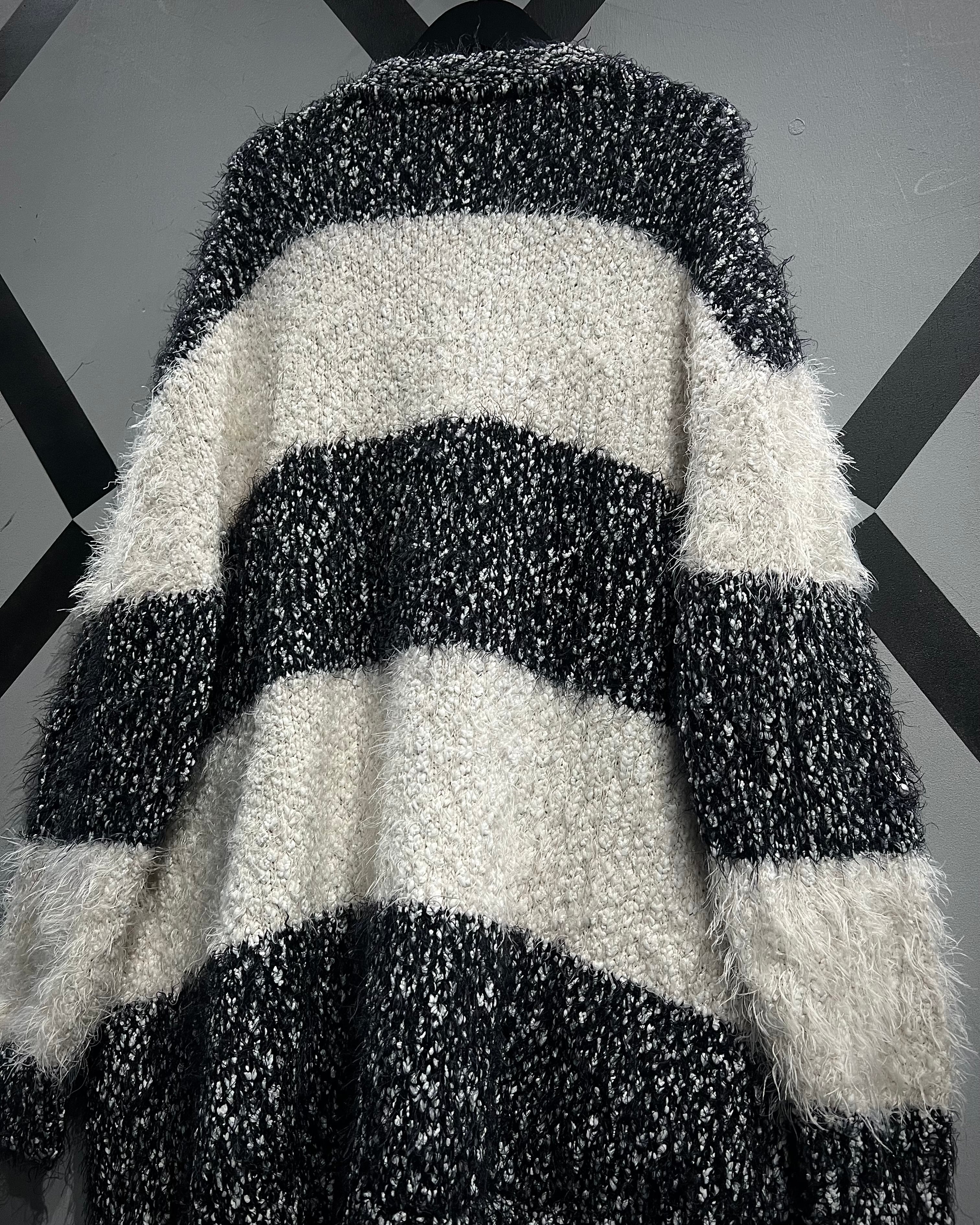 ブラック×ホワイトの大胆なボーダーに、毛足の長い起毛糸とブークレ調の糸を織り交ぜた編み地が特徴。ラフに編み上げられた表情がどこかパンクやグランジを想起させつつ、モノトーンでまとめることで都会的なバランスへと昇華しています。