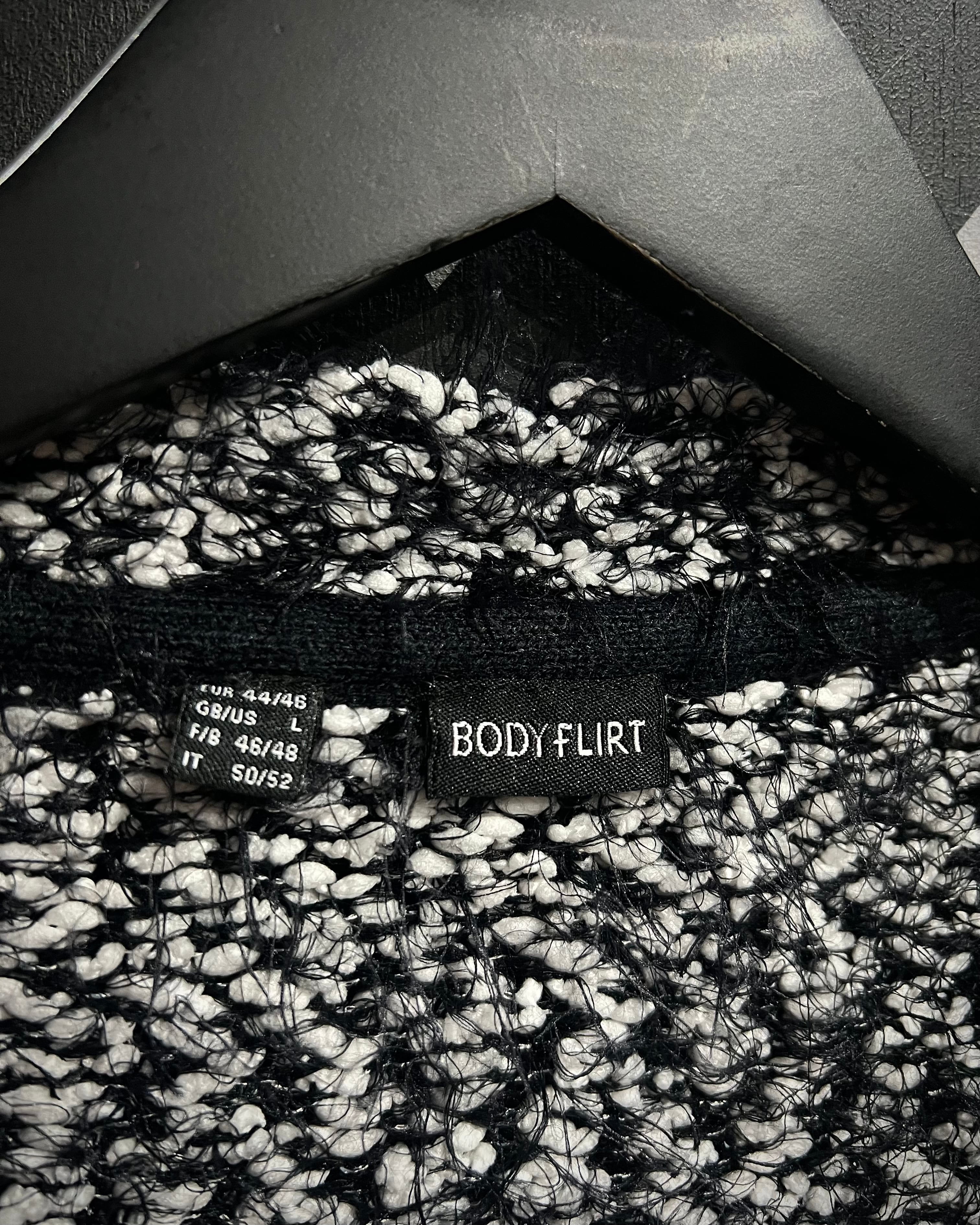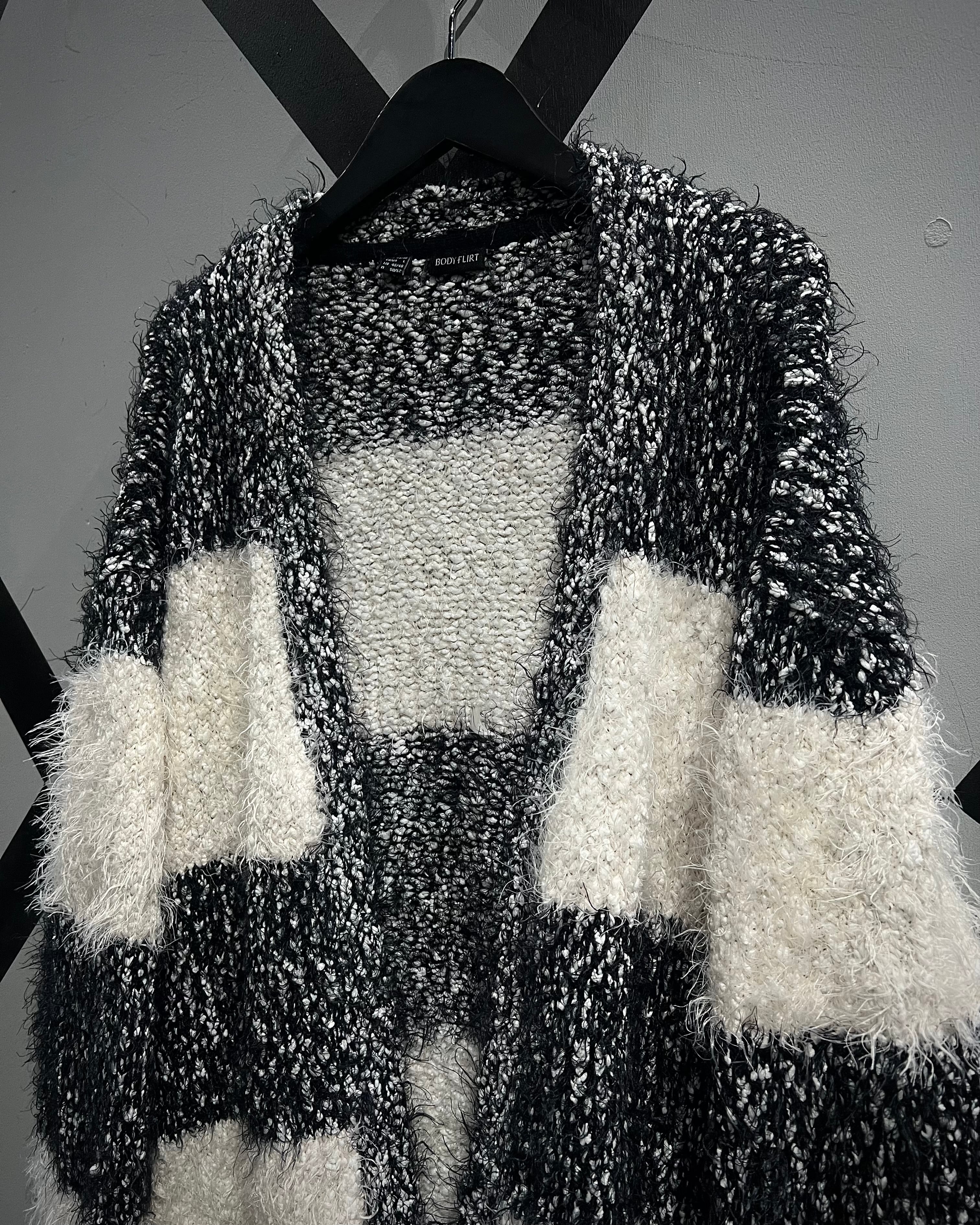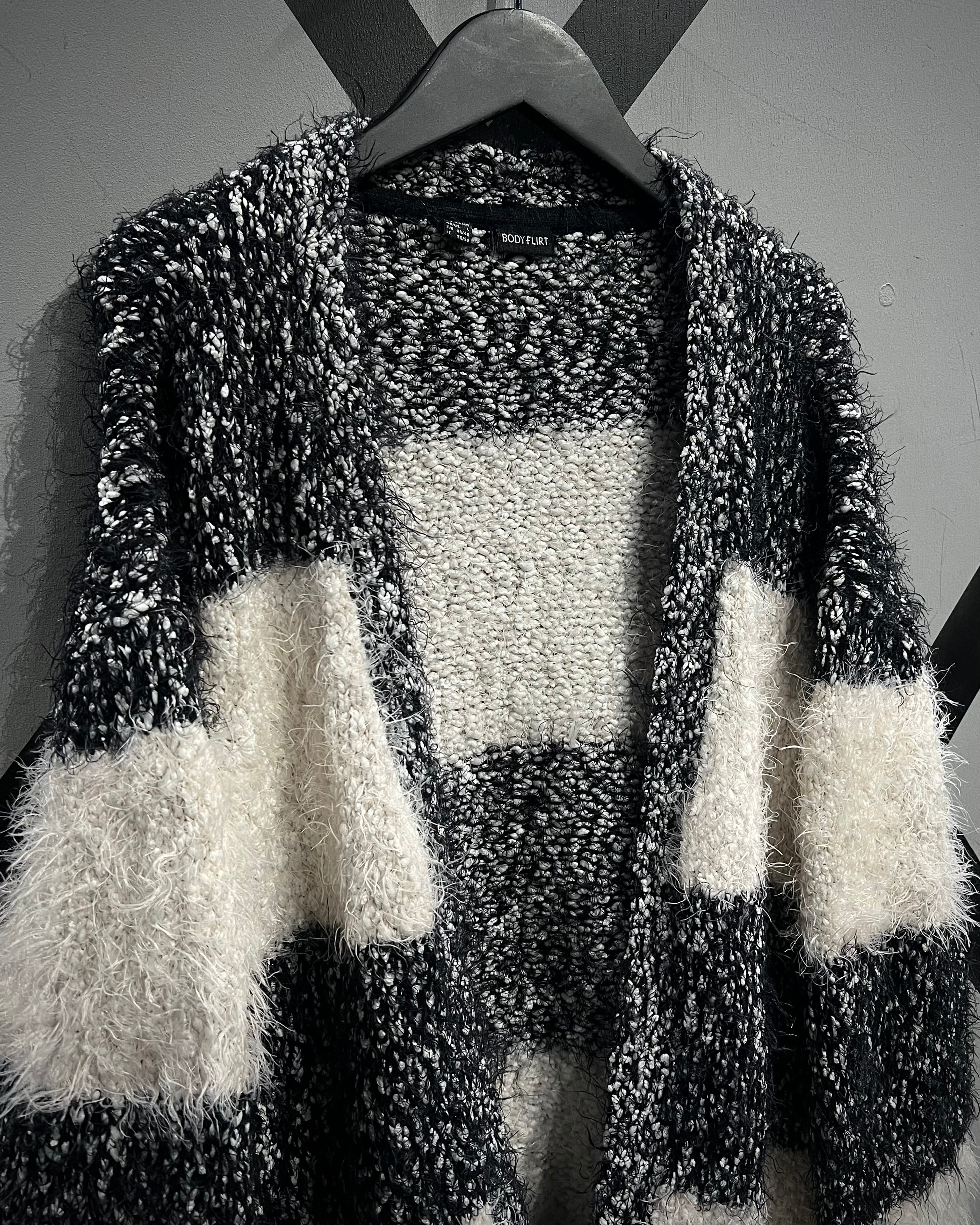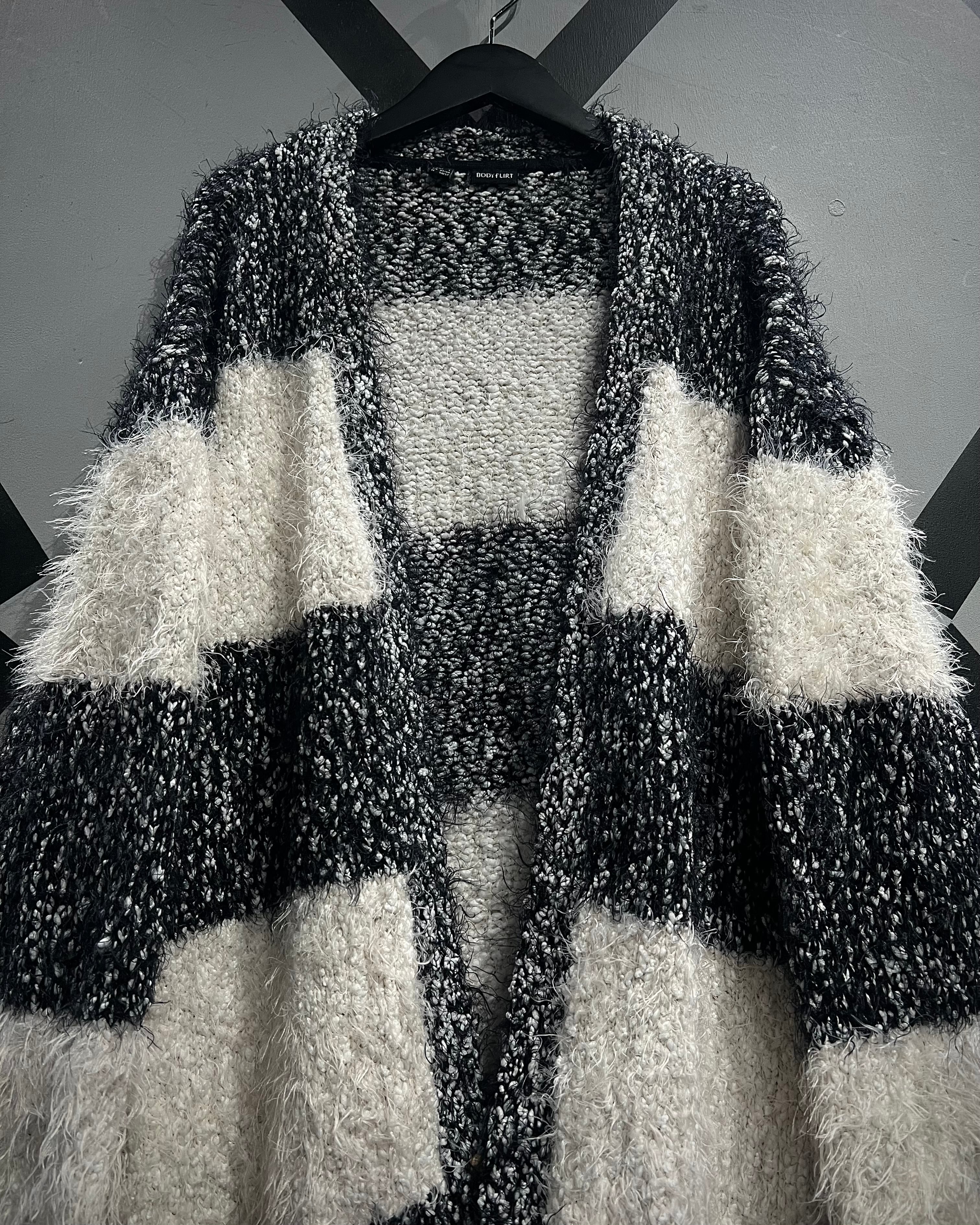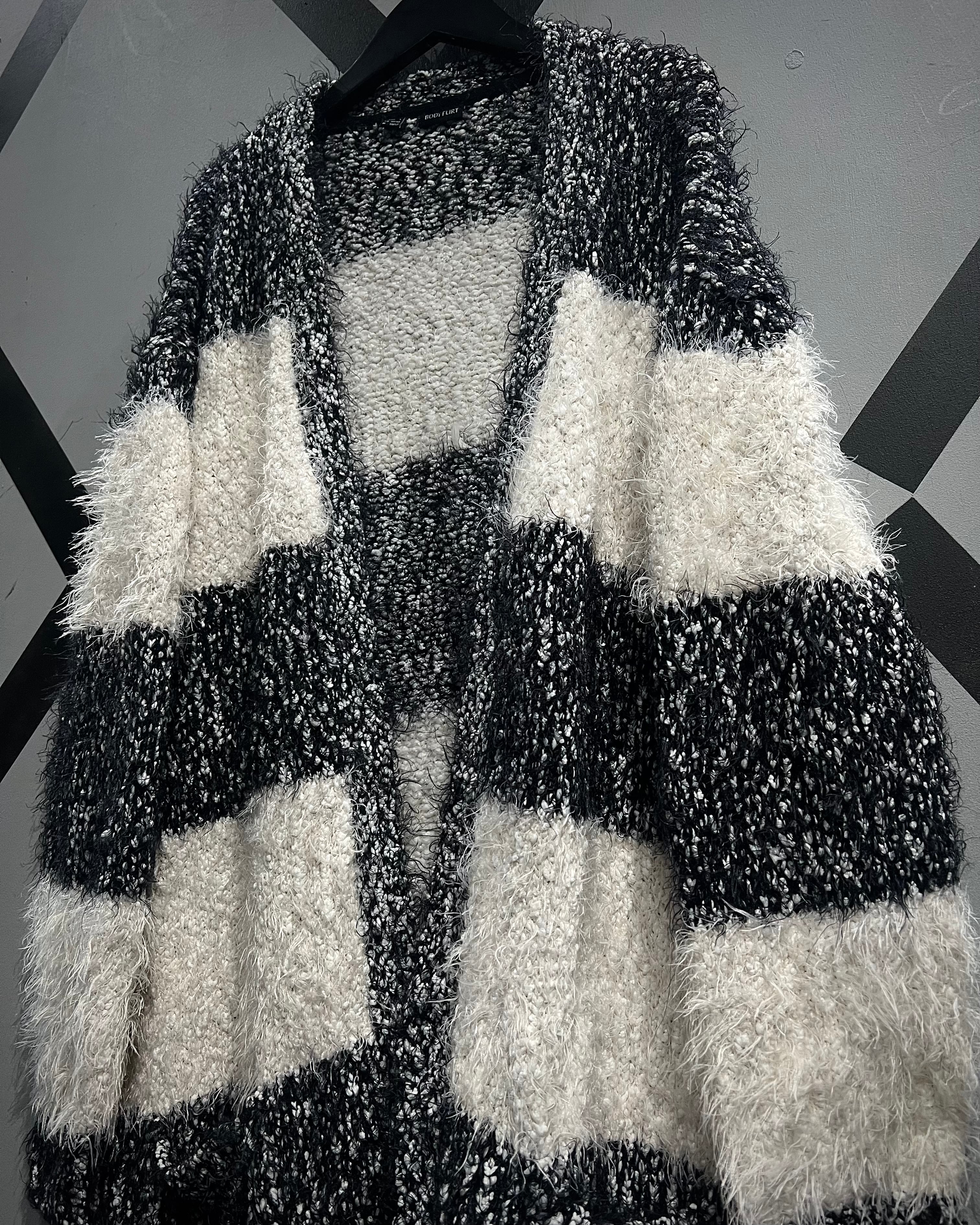 ブラック×ホワイトの大胆なボーダーに、毛足の長い起毛糸とブークレ調の糸を織り交ぜた編み地が特徴。ラフに編み上げられた表情がどこかパンクやグランジを想起させつつ、モノトーンでまとめることで都会的なバランスへと昇華しています。