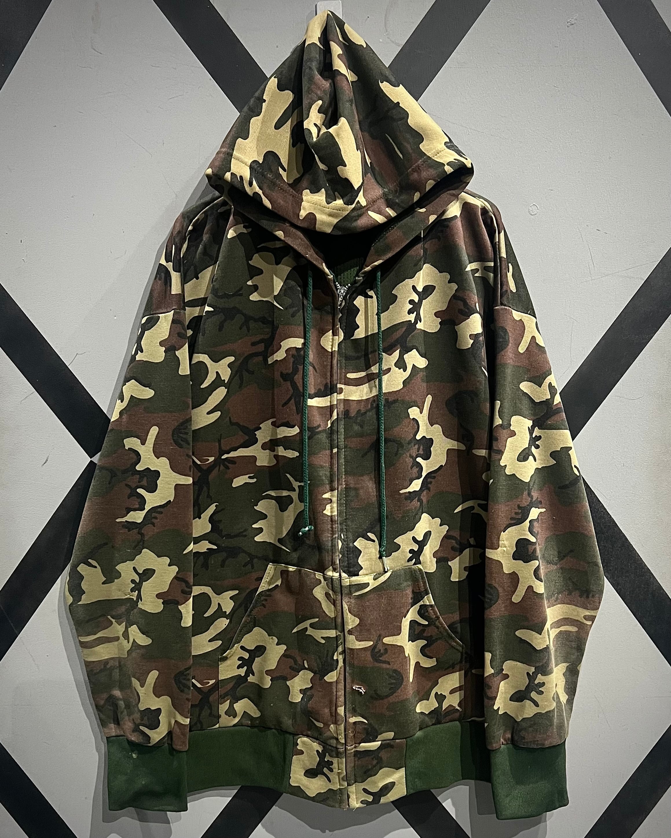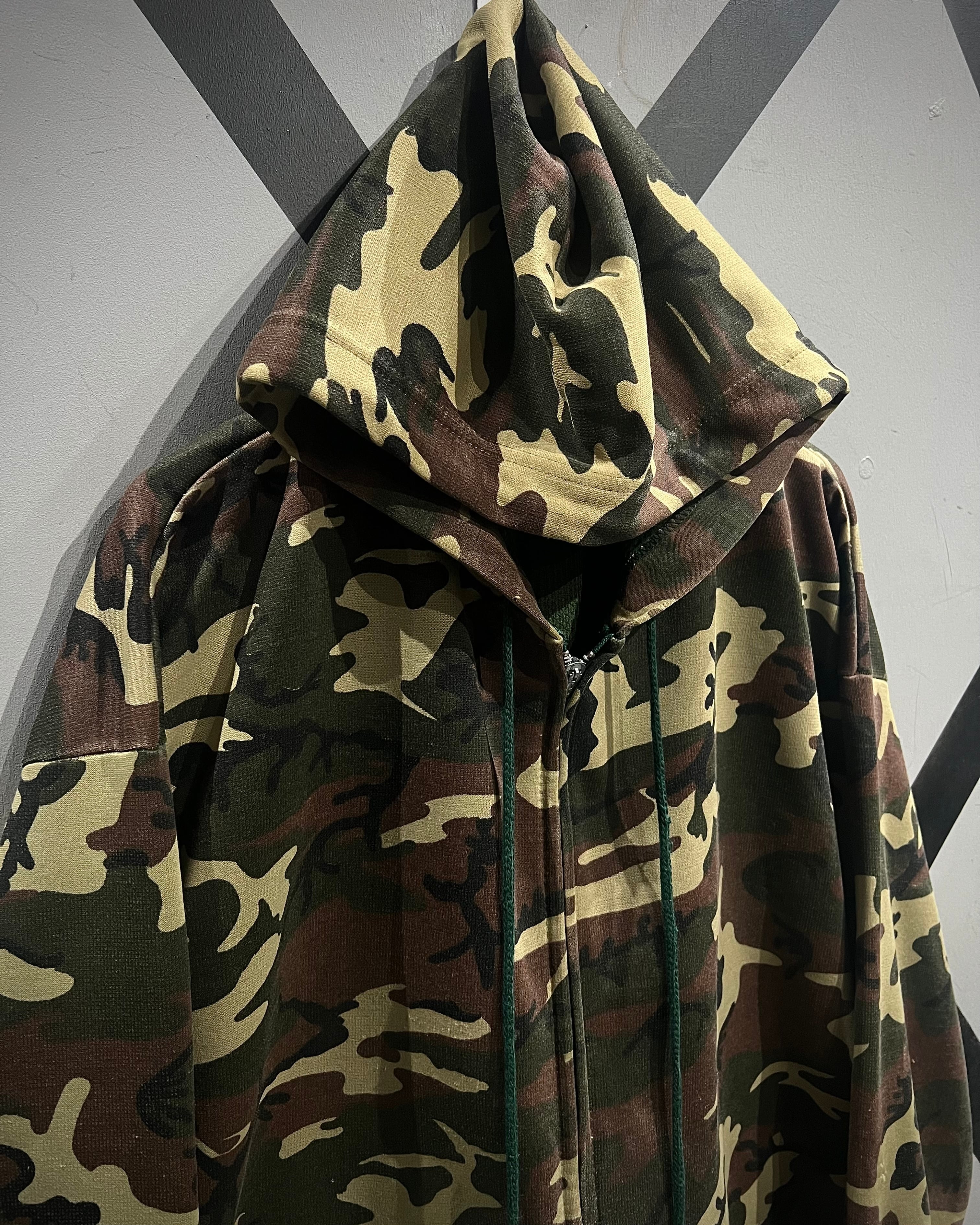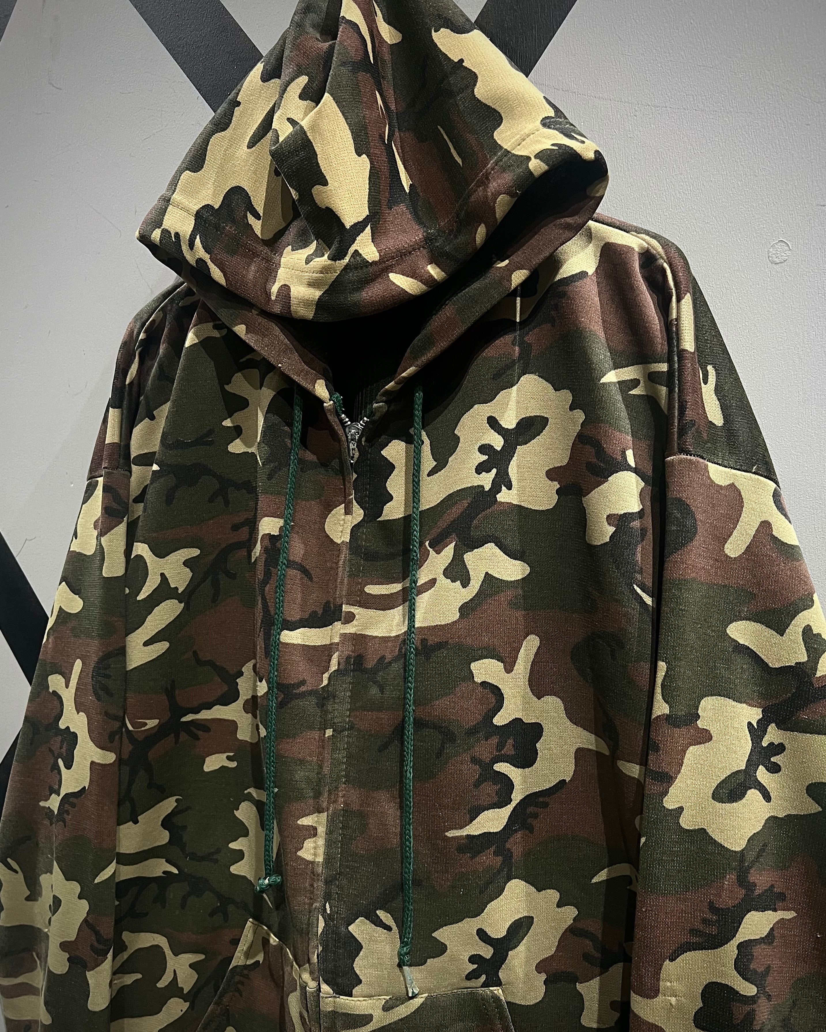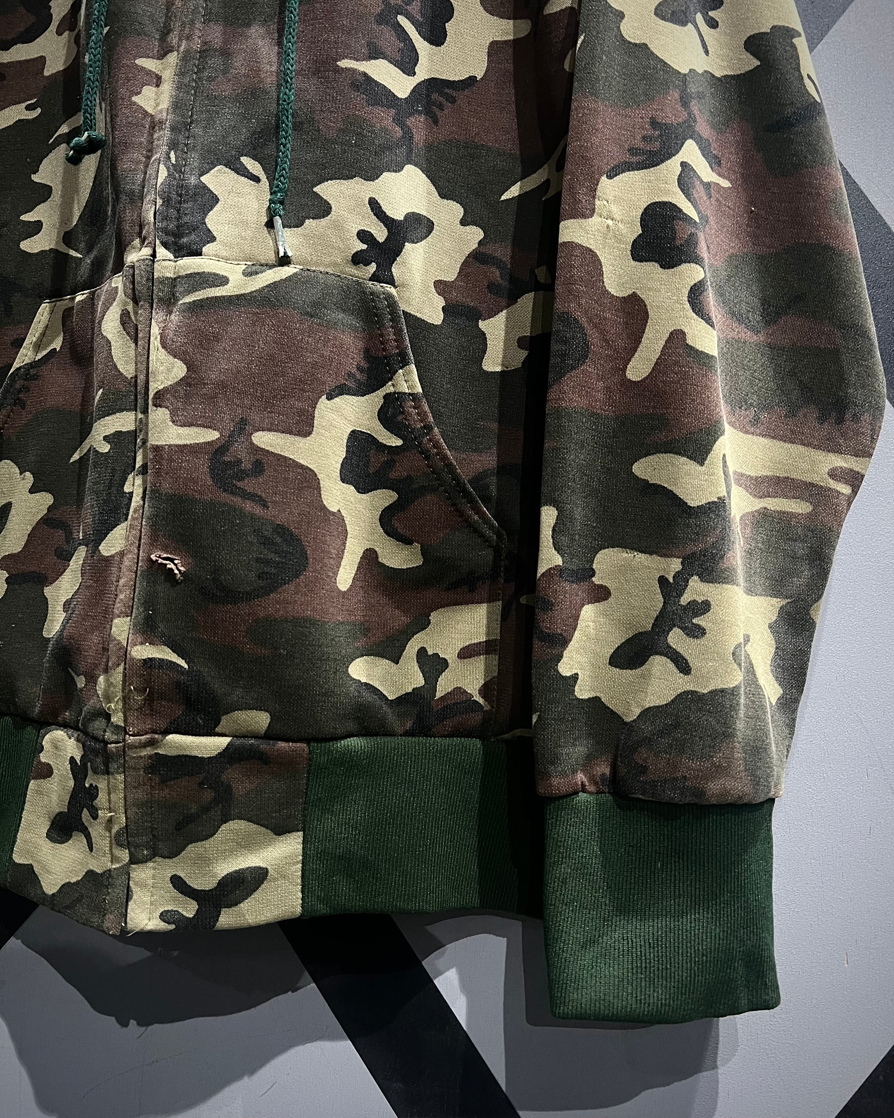 80’sらしい無骨なムードと、現代的なストリート感を兼ね備えたウッドランドカモのジップアップフーディ。
