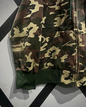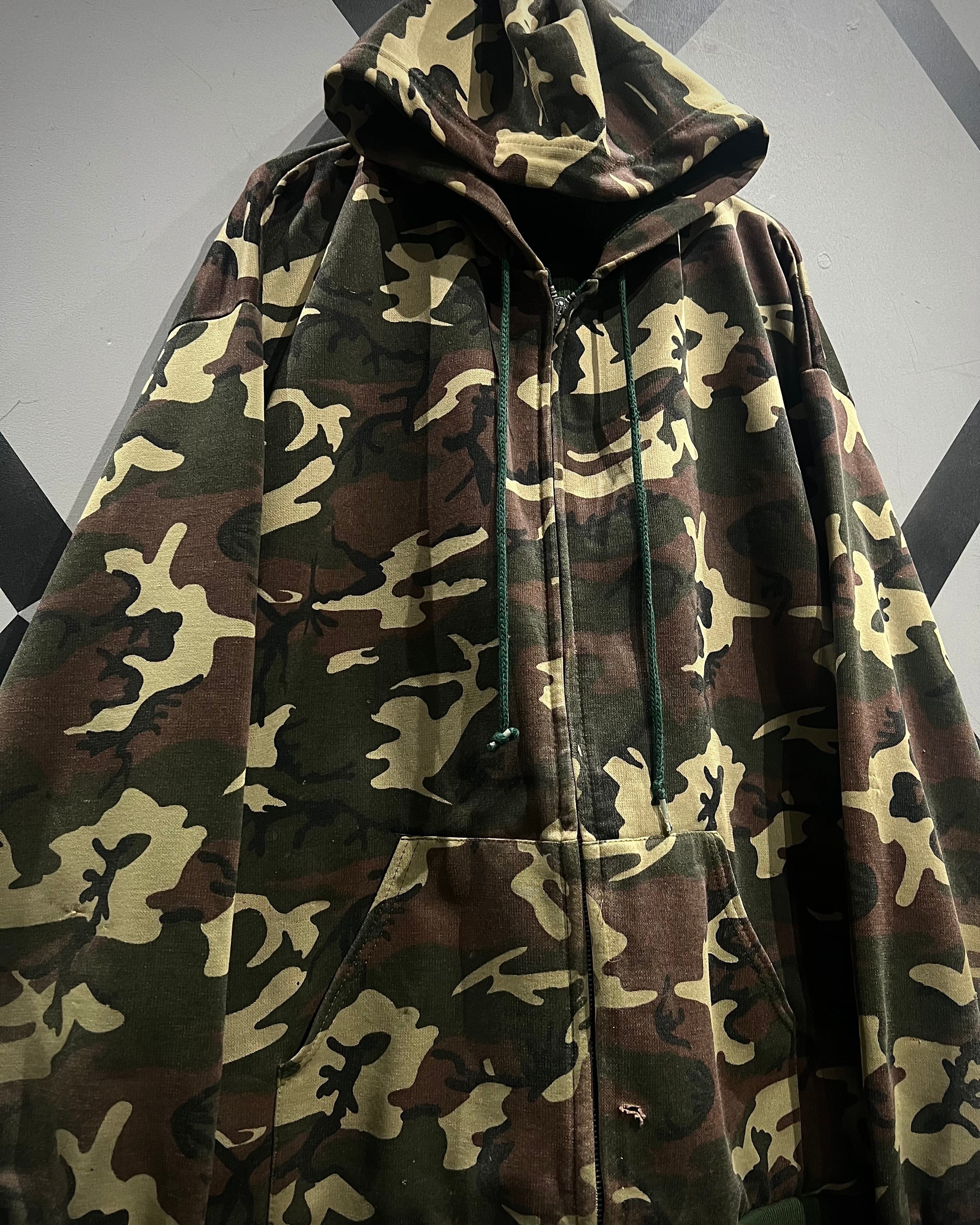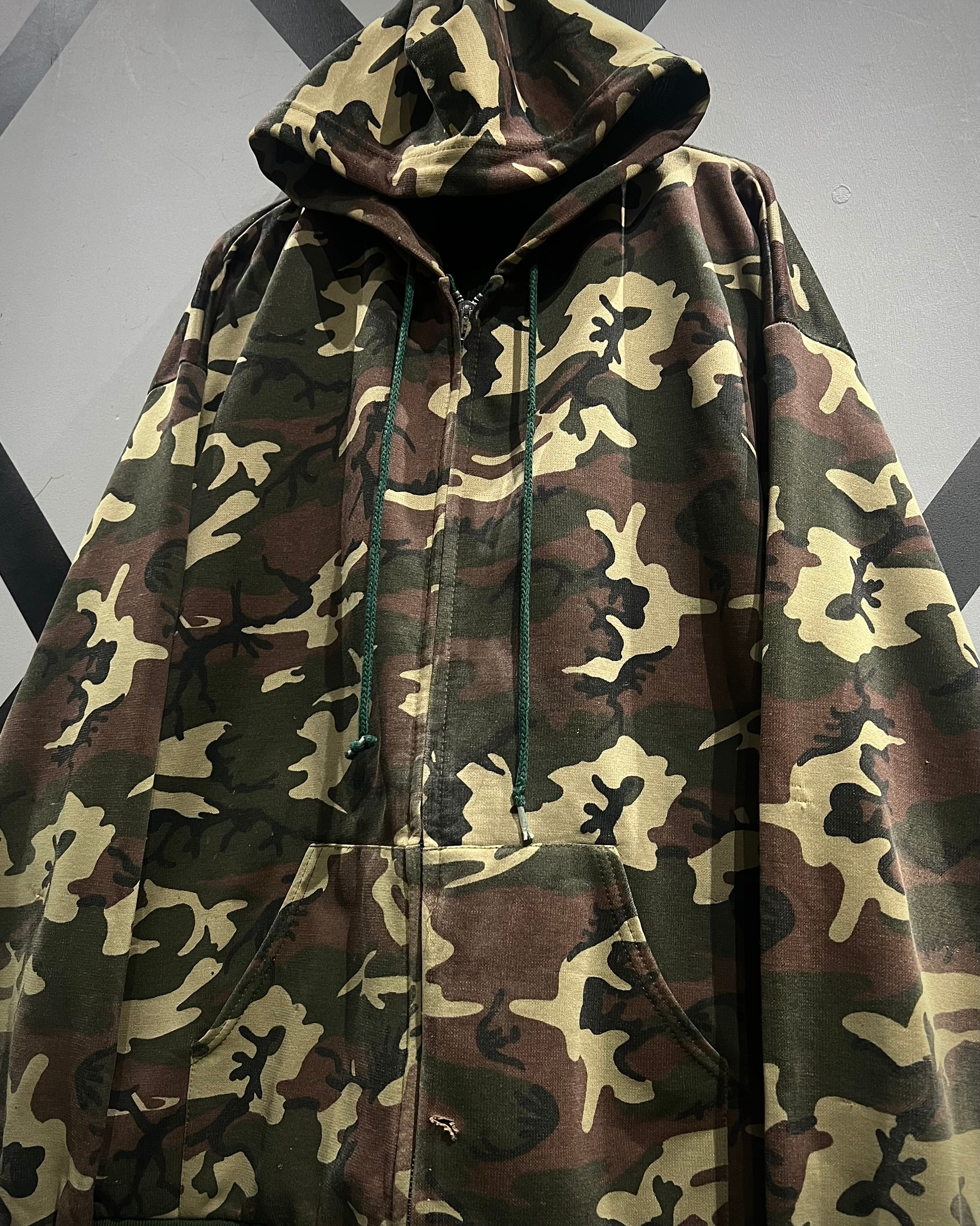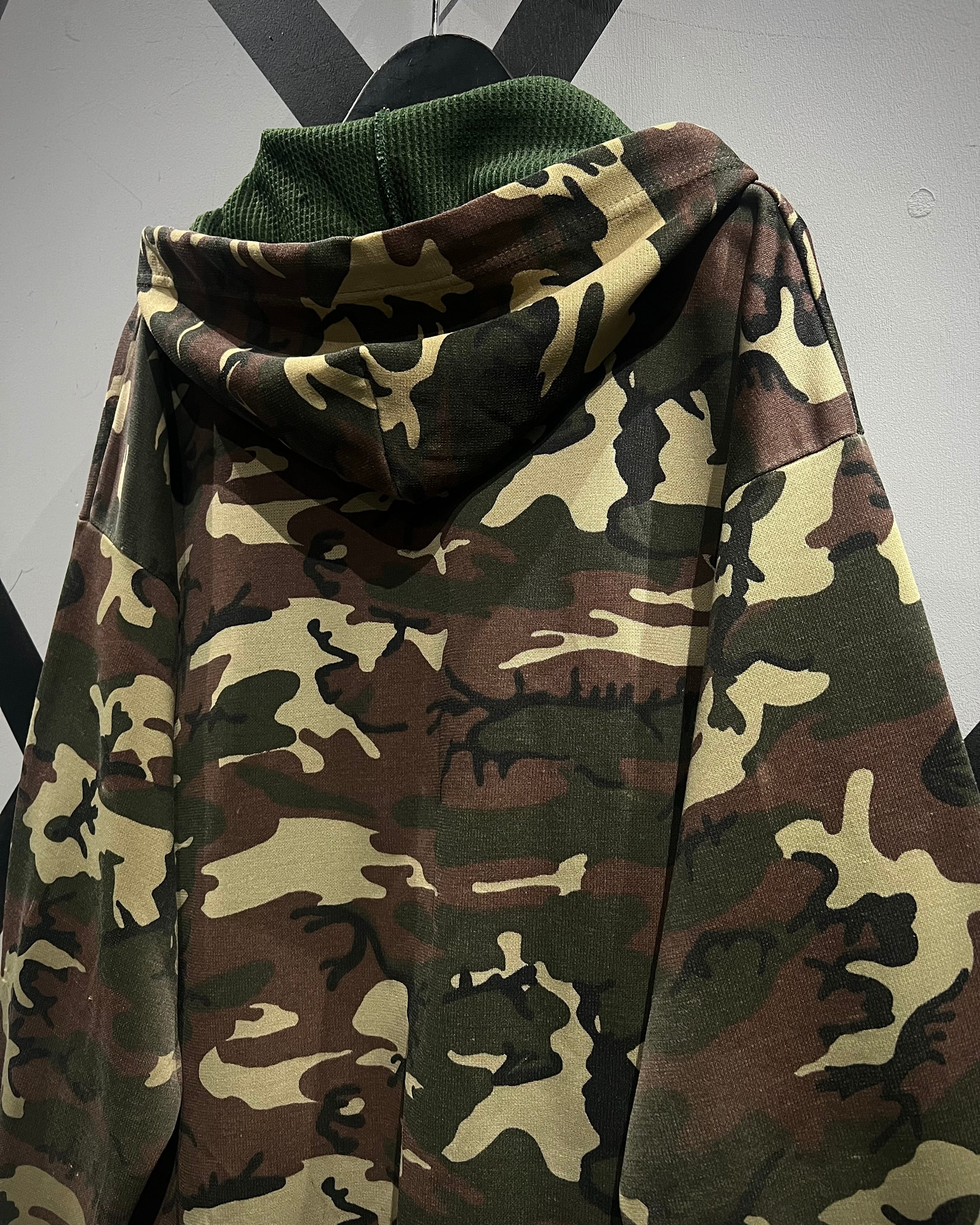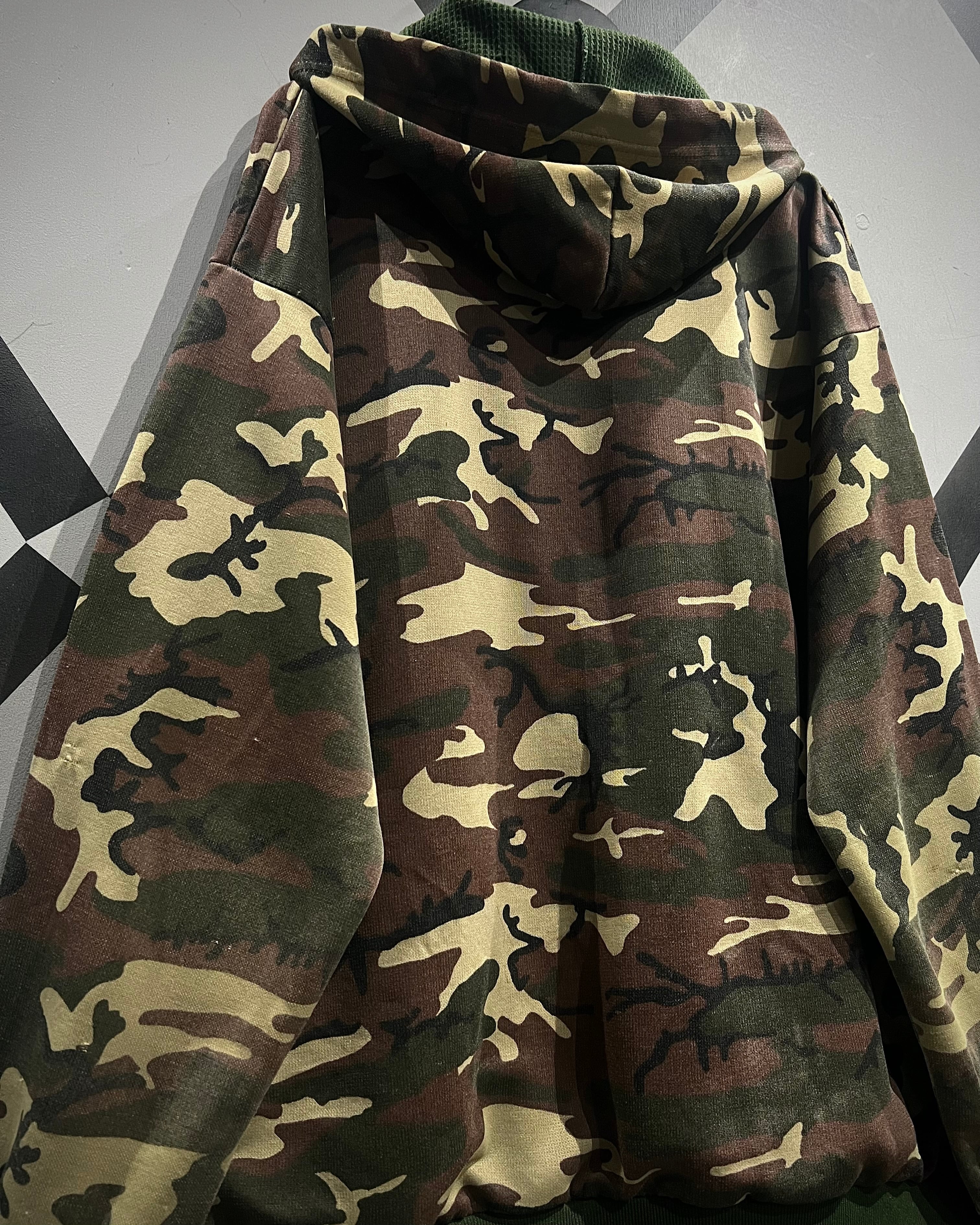 80’sらしい無骨なムードと、現代的なストリート感を兼ね備えたウッドランドカモのジップアップフーディ。