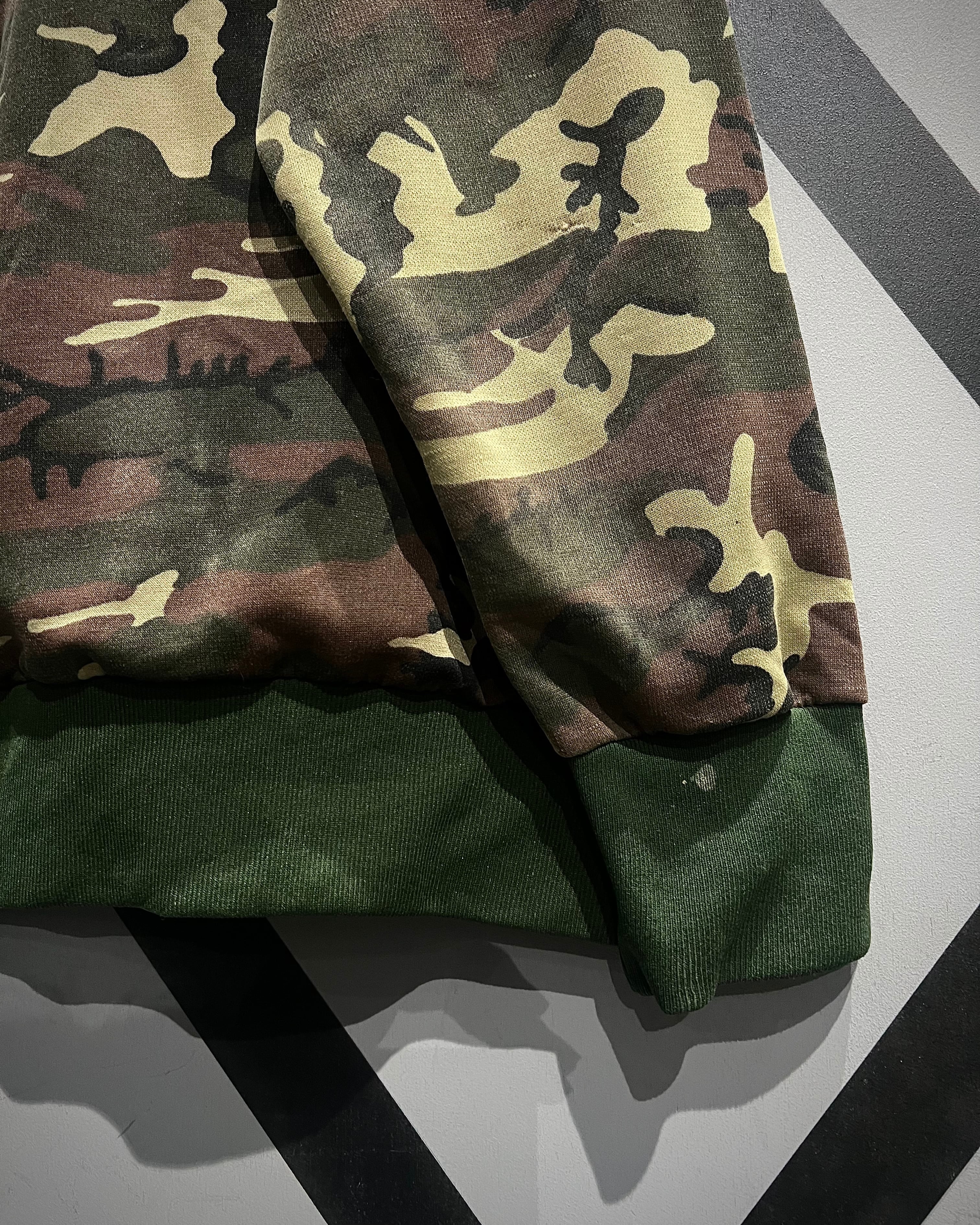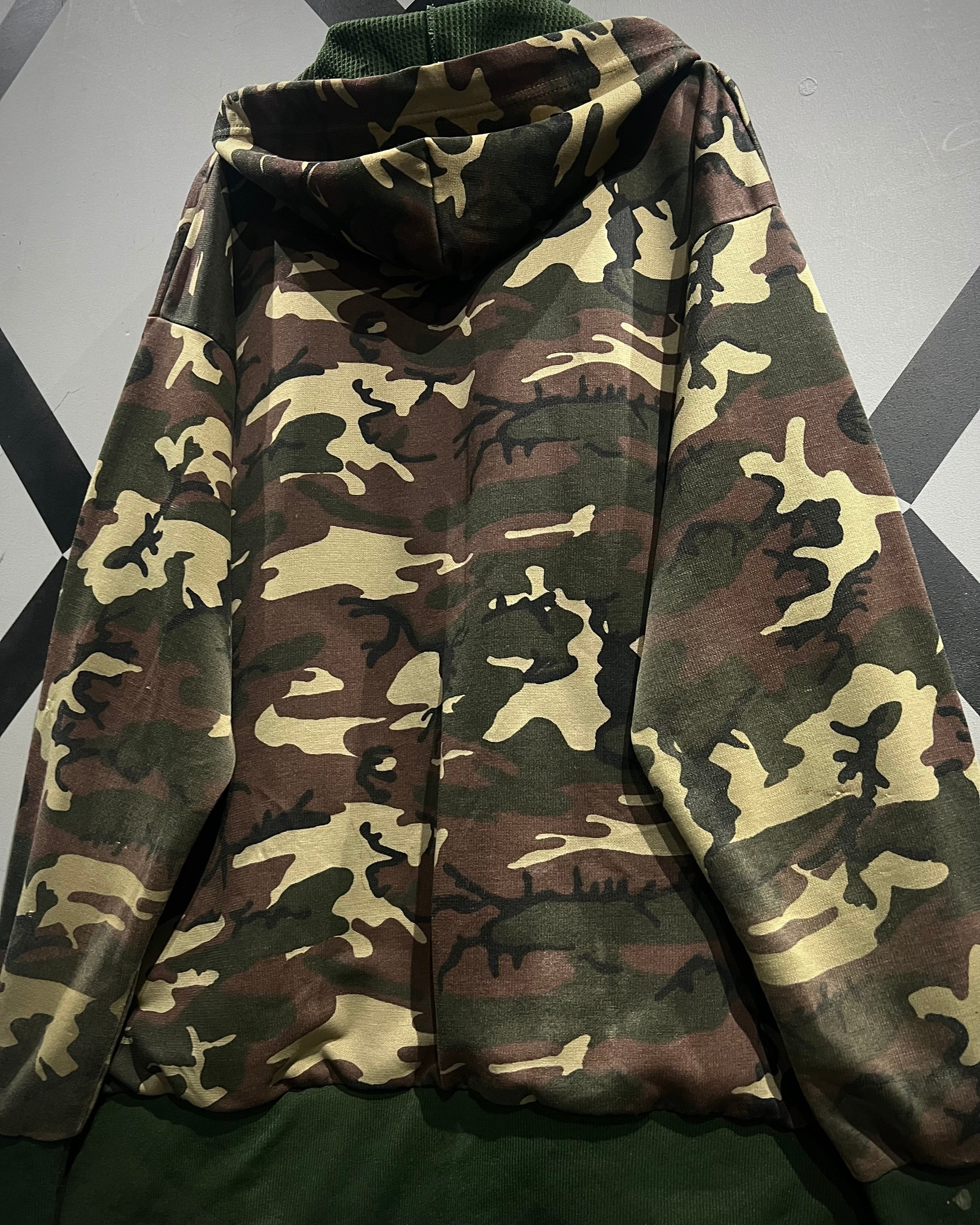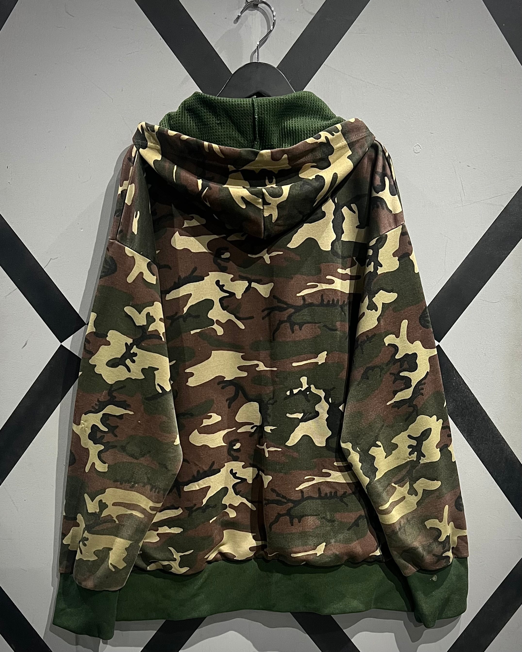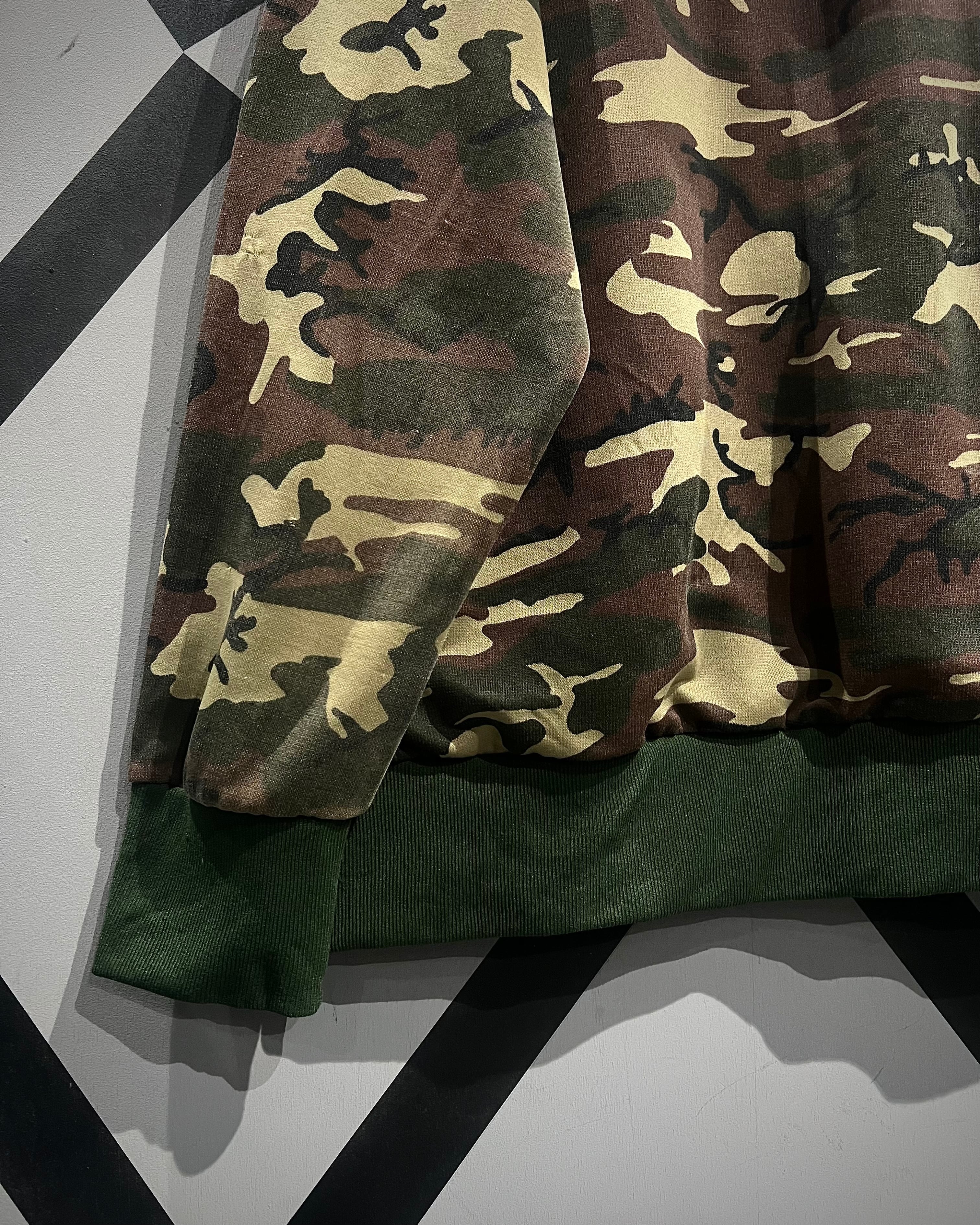 80’sらしい無骨なムードと、現代的なストリート感を兼ね備えたウッドランドカモのジップアップフーディ。
