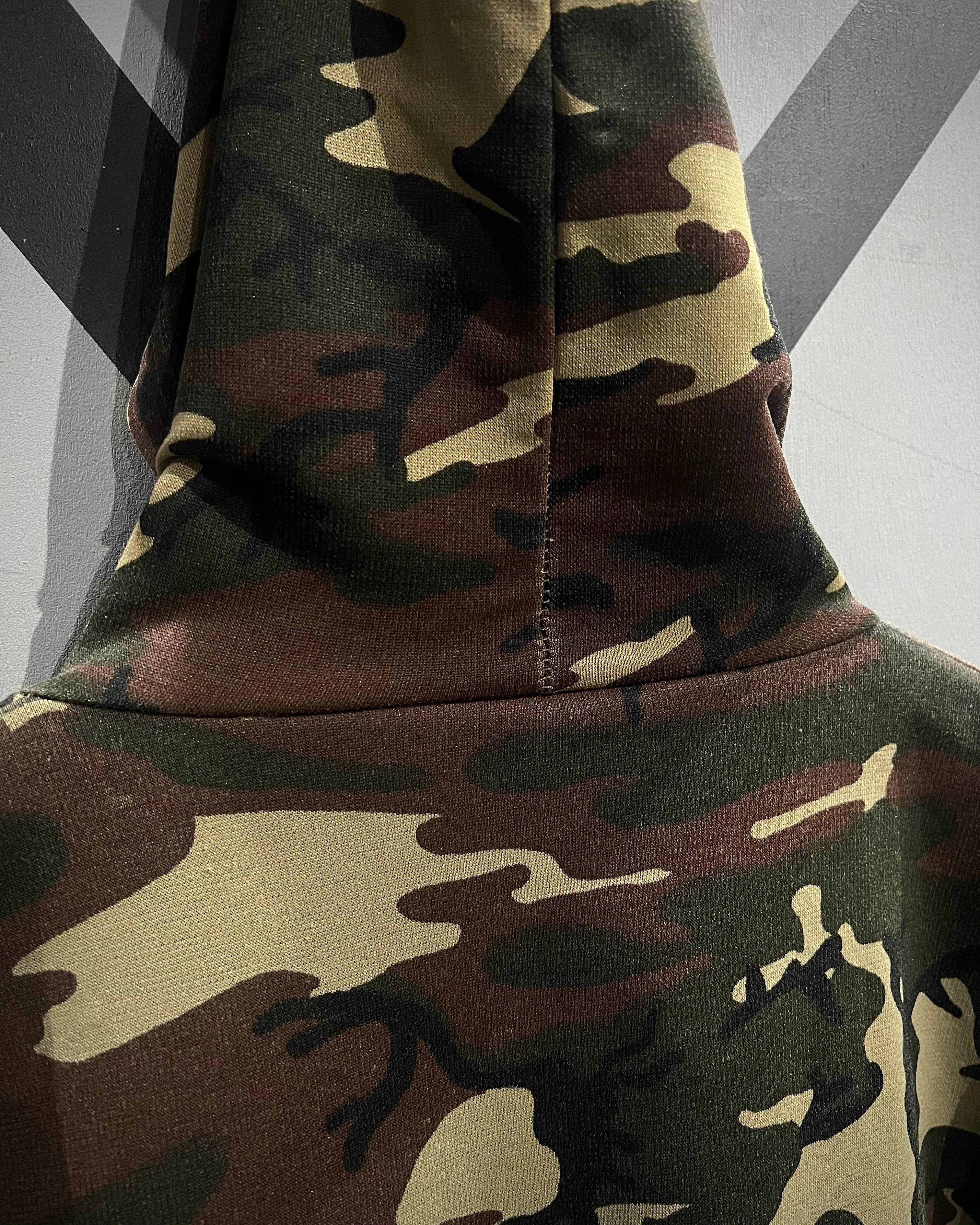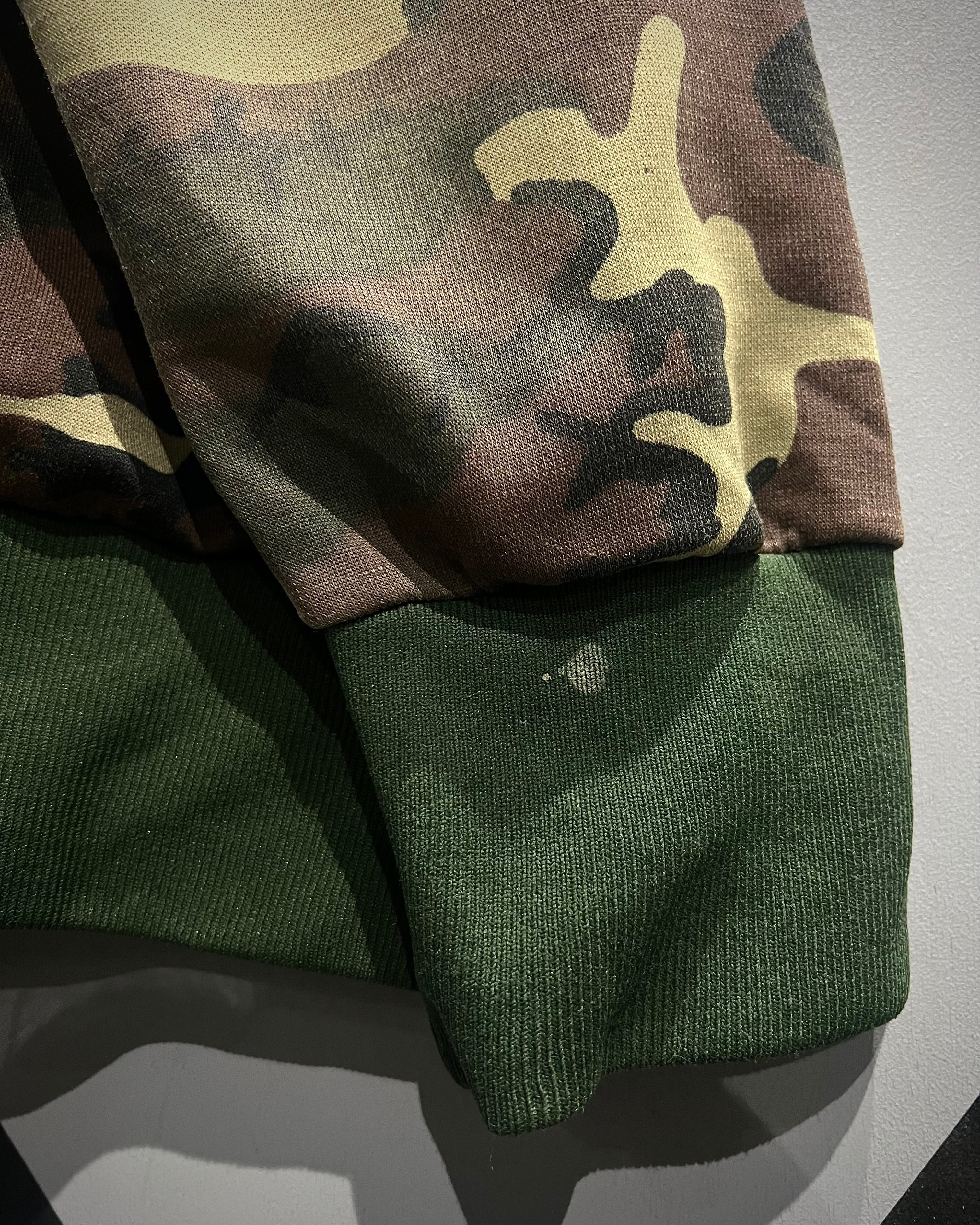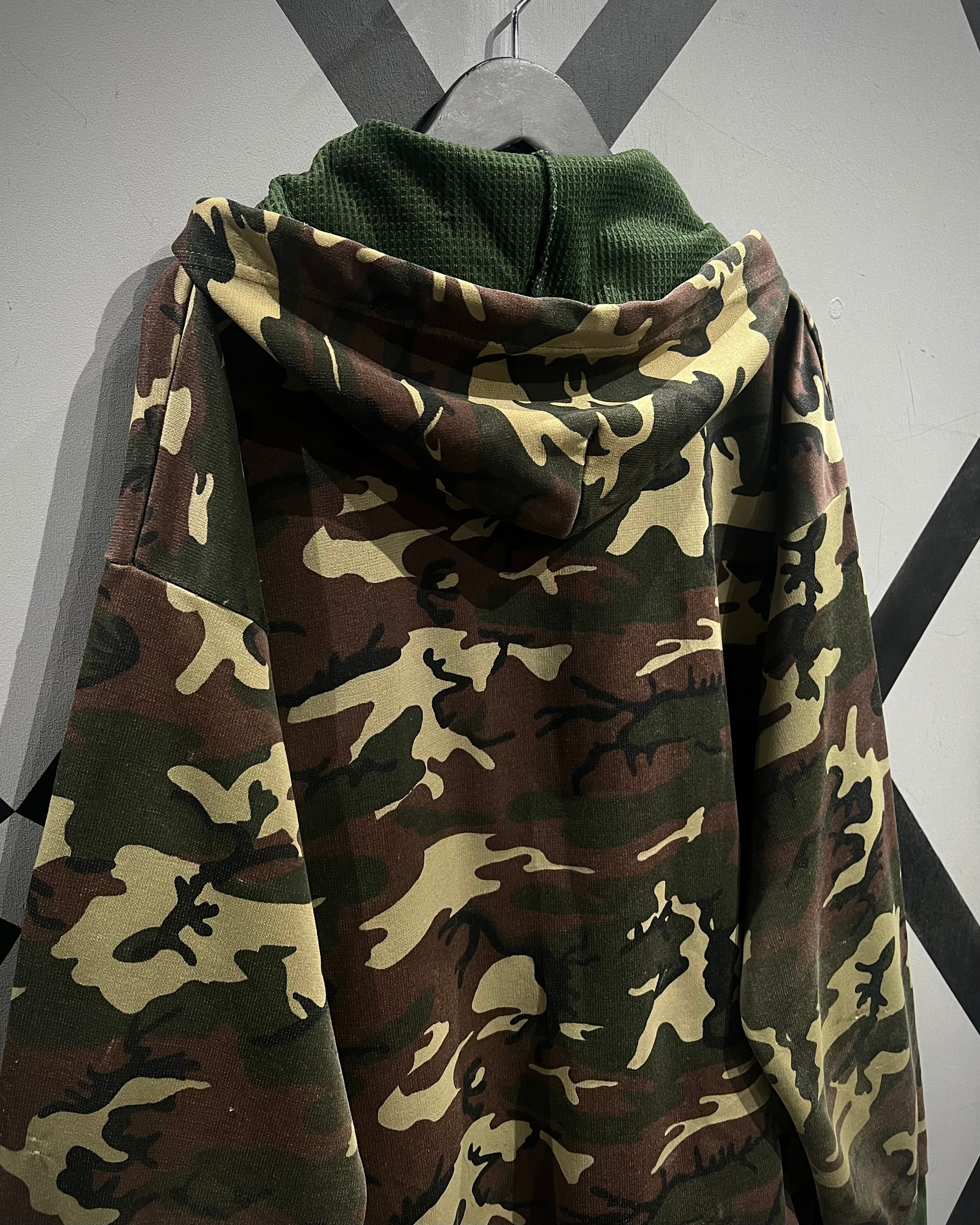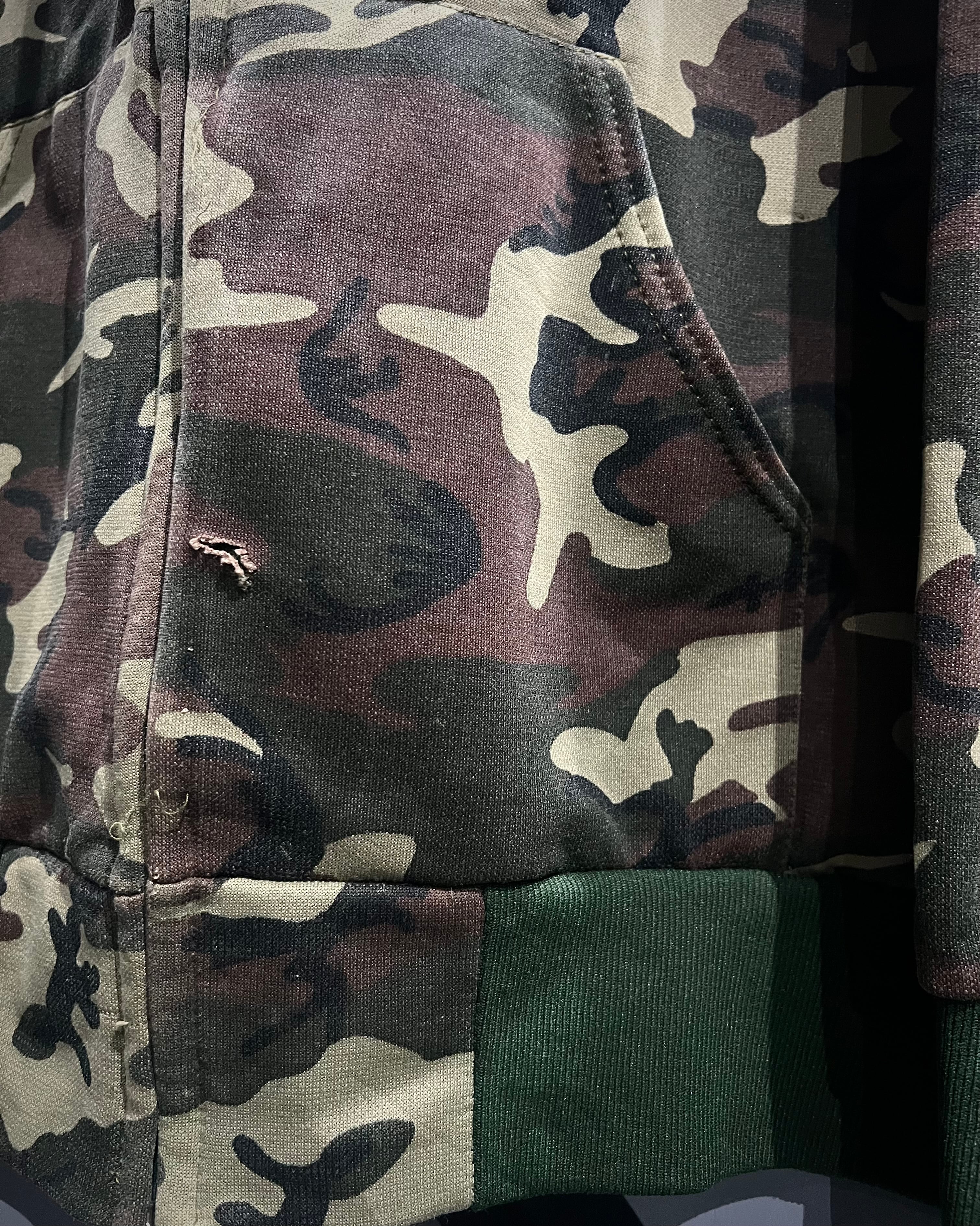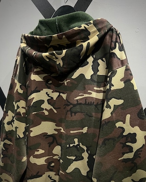 80’sらしい無骨なムードと、現代的なストリート感を兼ね備えたウッドランドカモのジップアップフーディ。