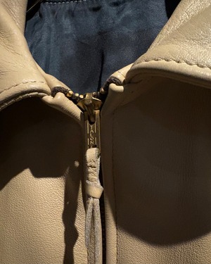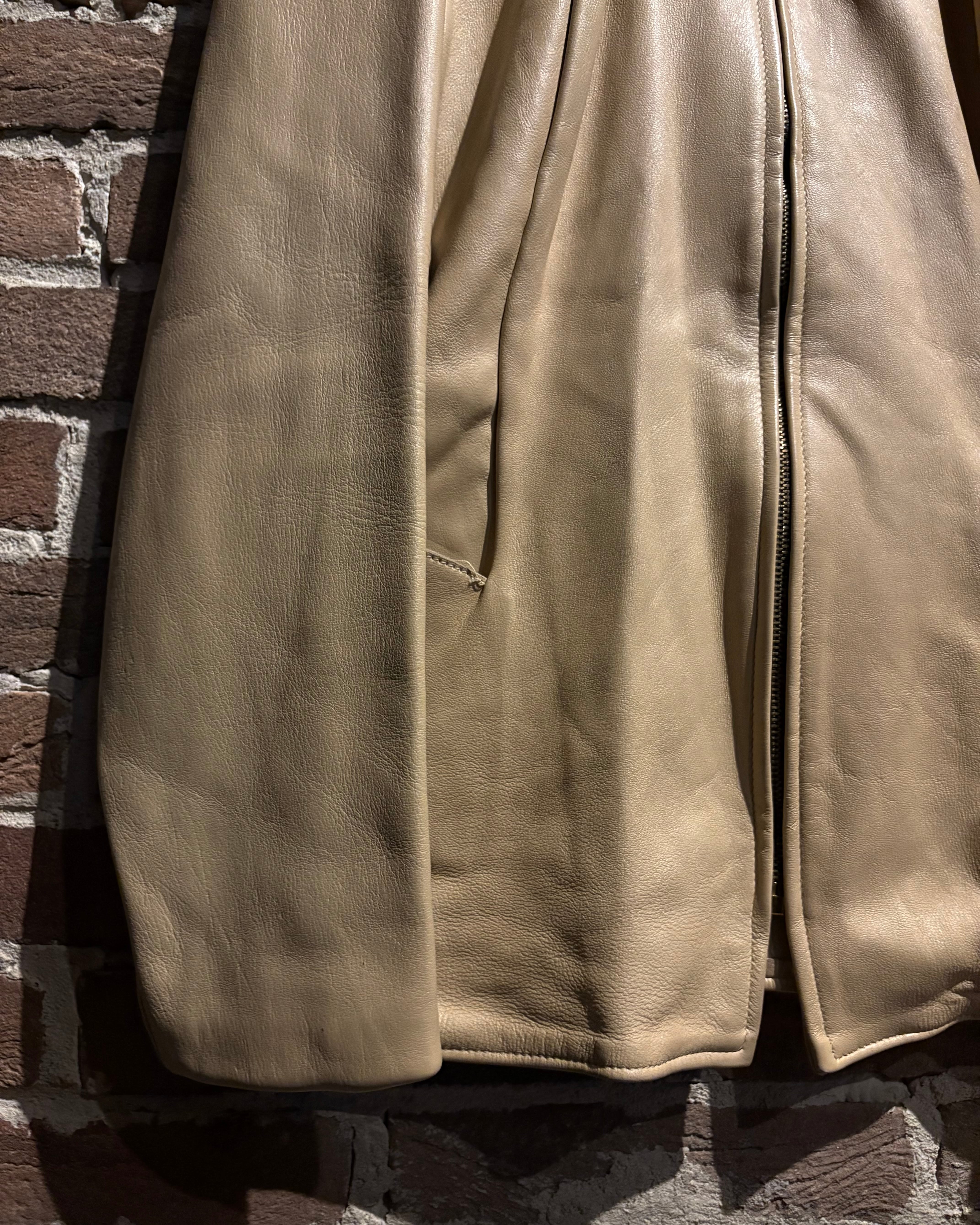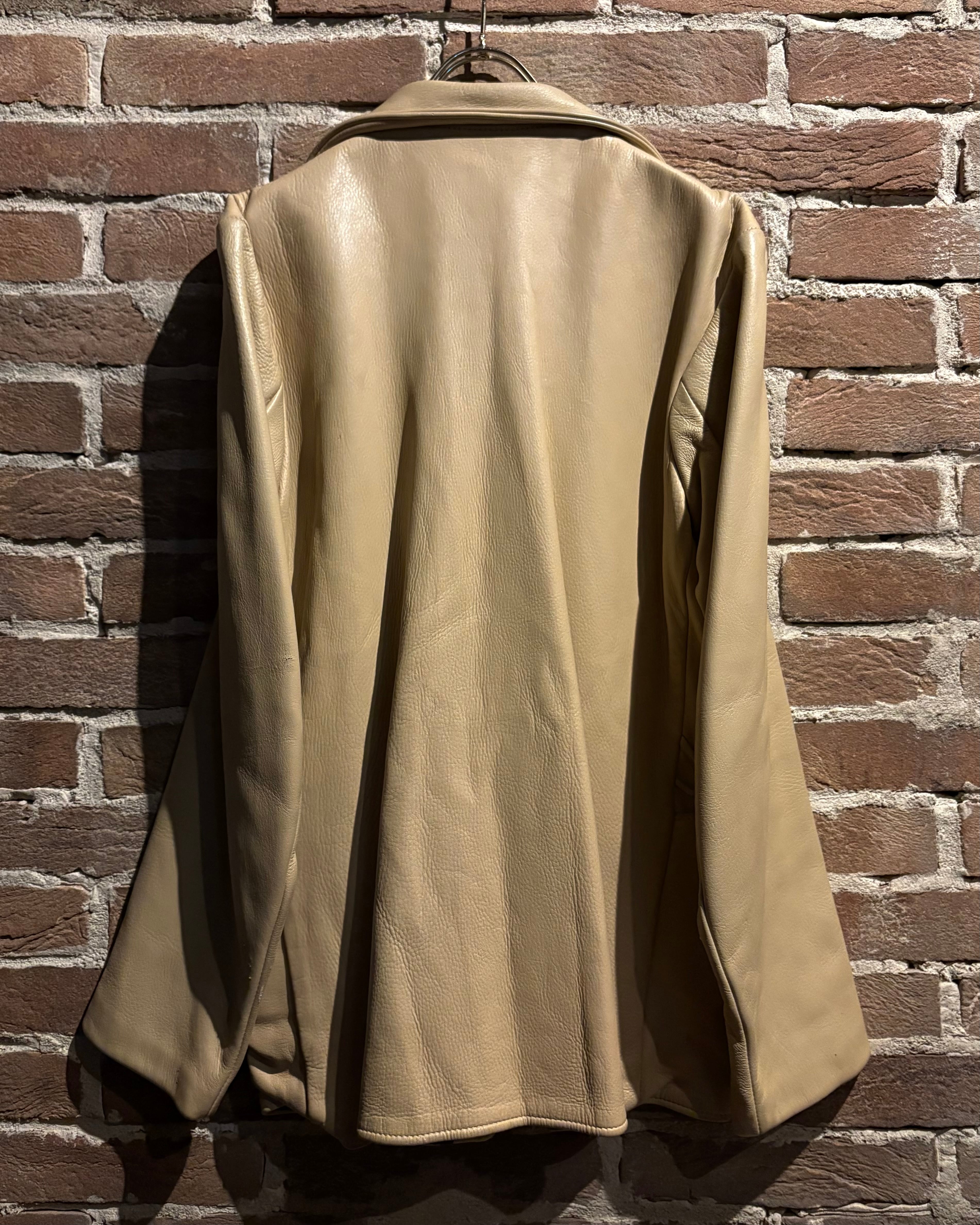 鈍く光を反射する滑らかな質感と、柔らかく身体に馴染むレザー特有の風合いが魅力の1着。ベージュの落ち着いた色味が、無骨になりがちなレザーに品の良さを加え、洗練された印象へと昇華しています。