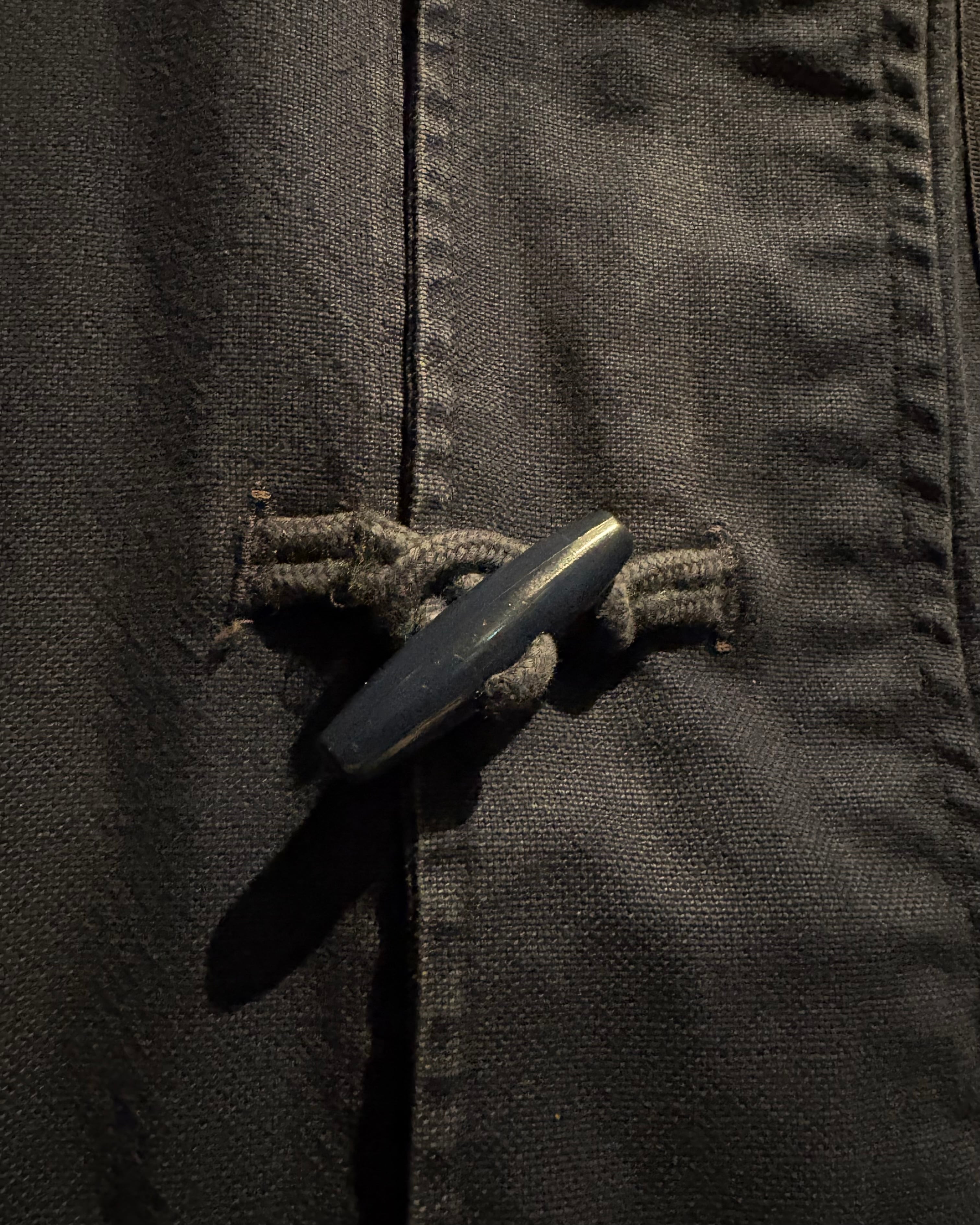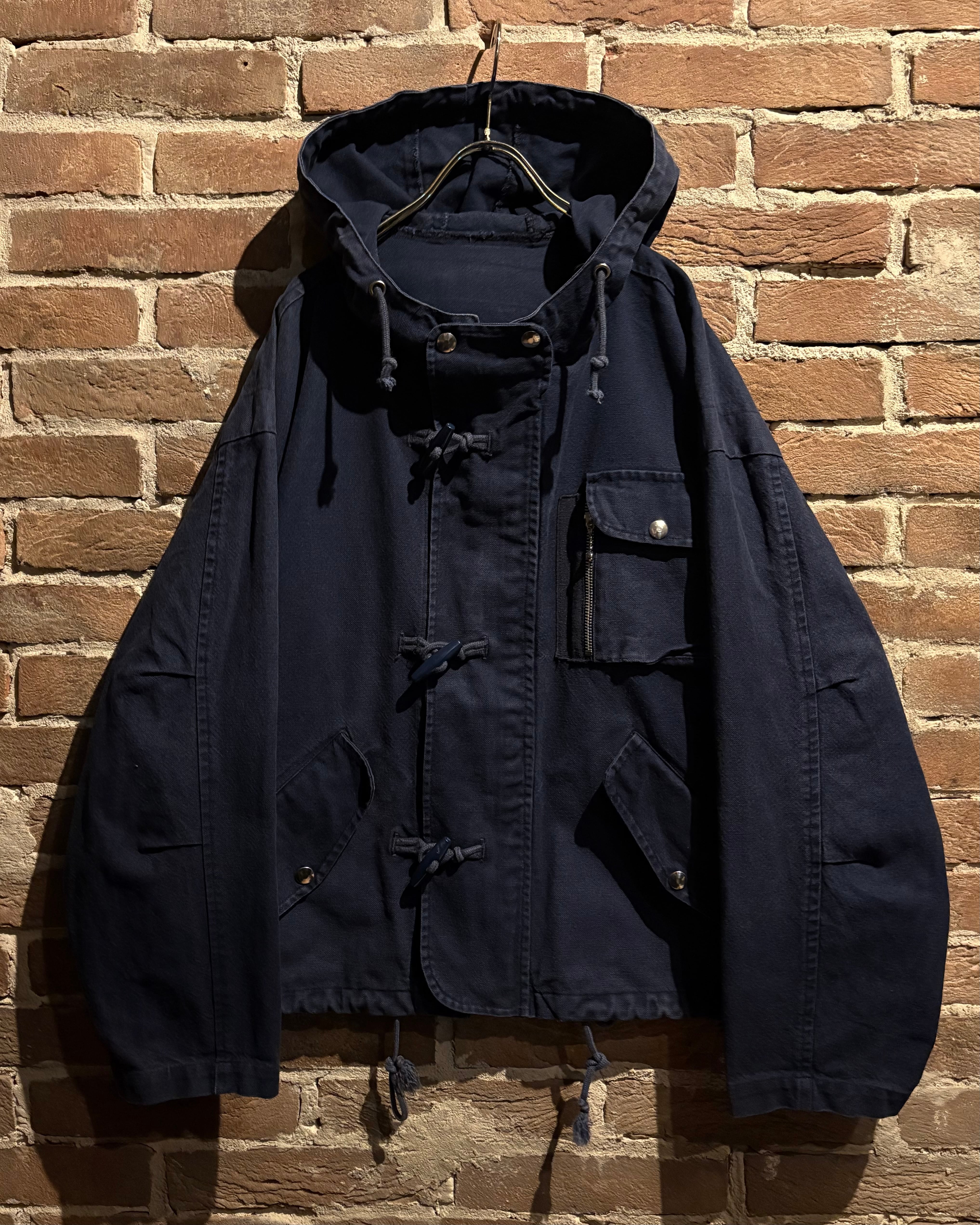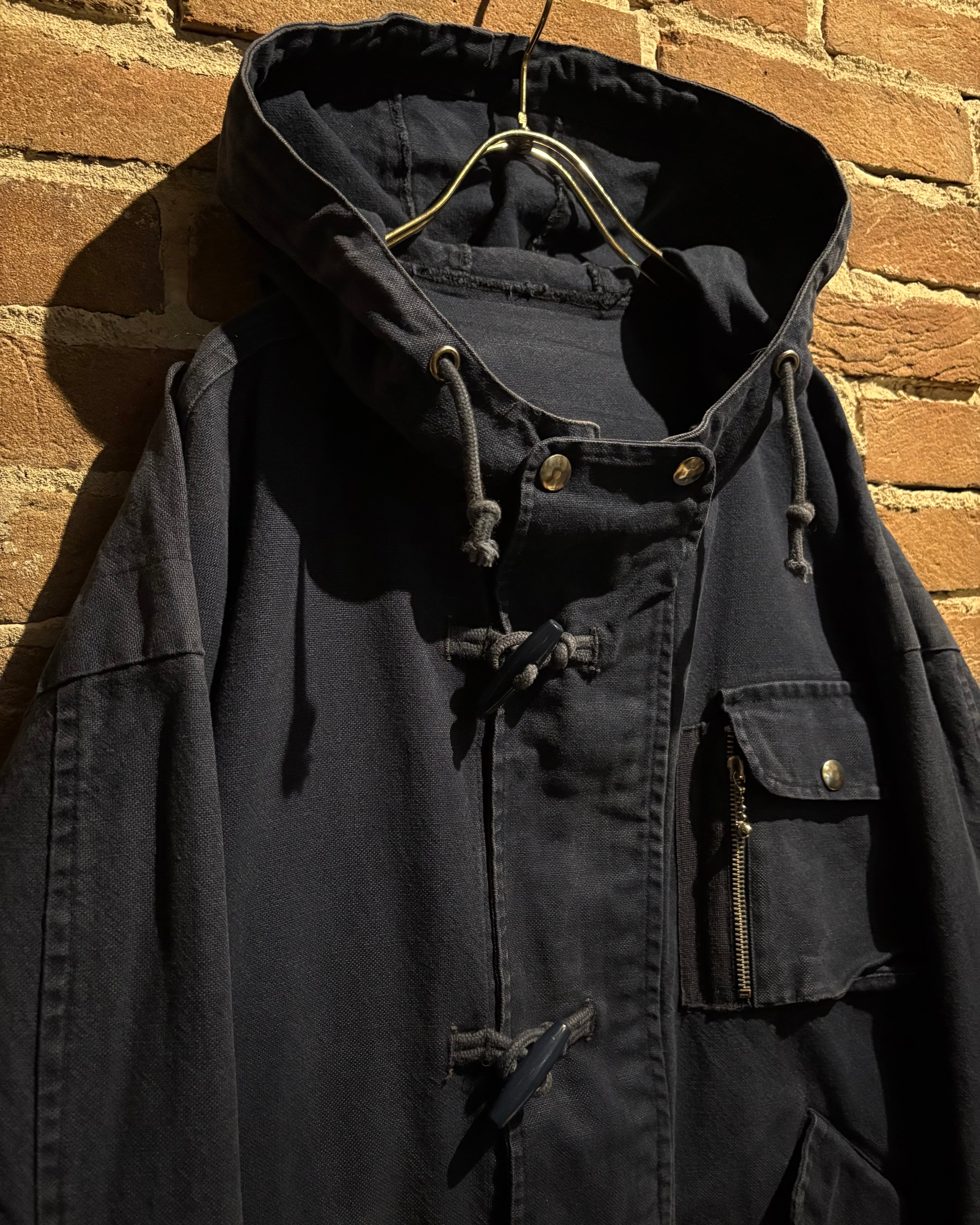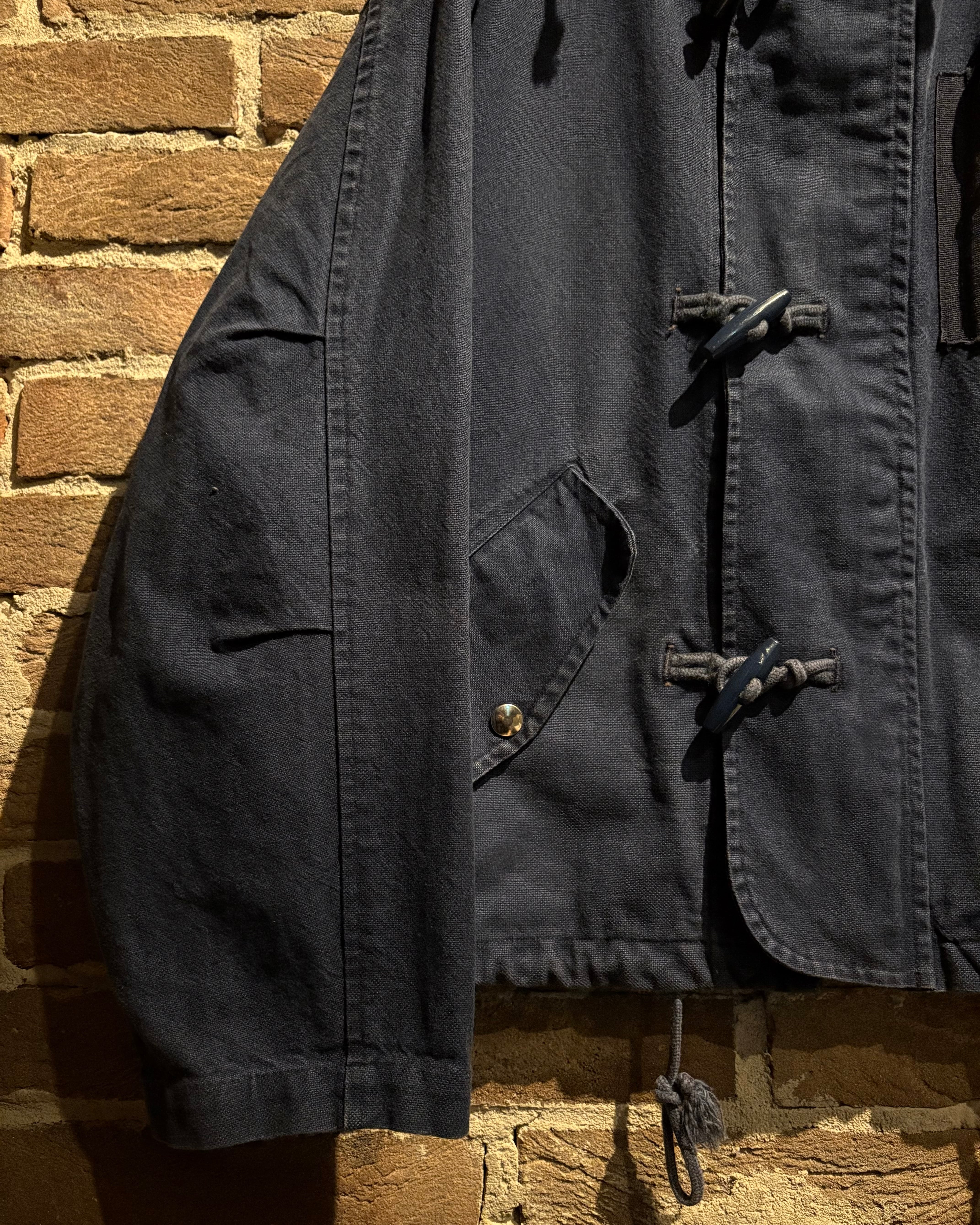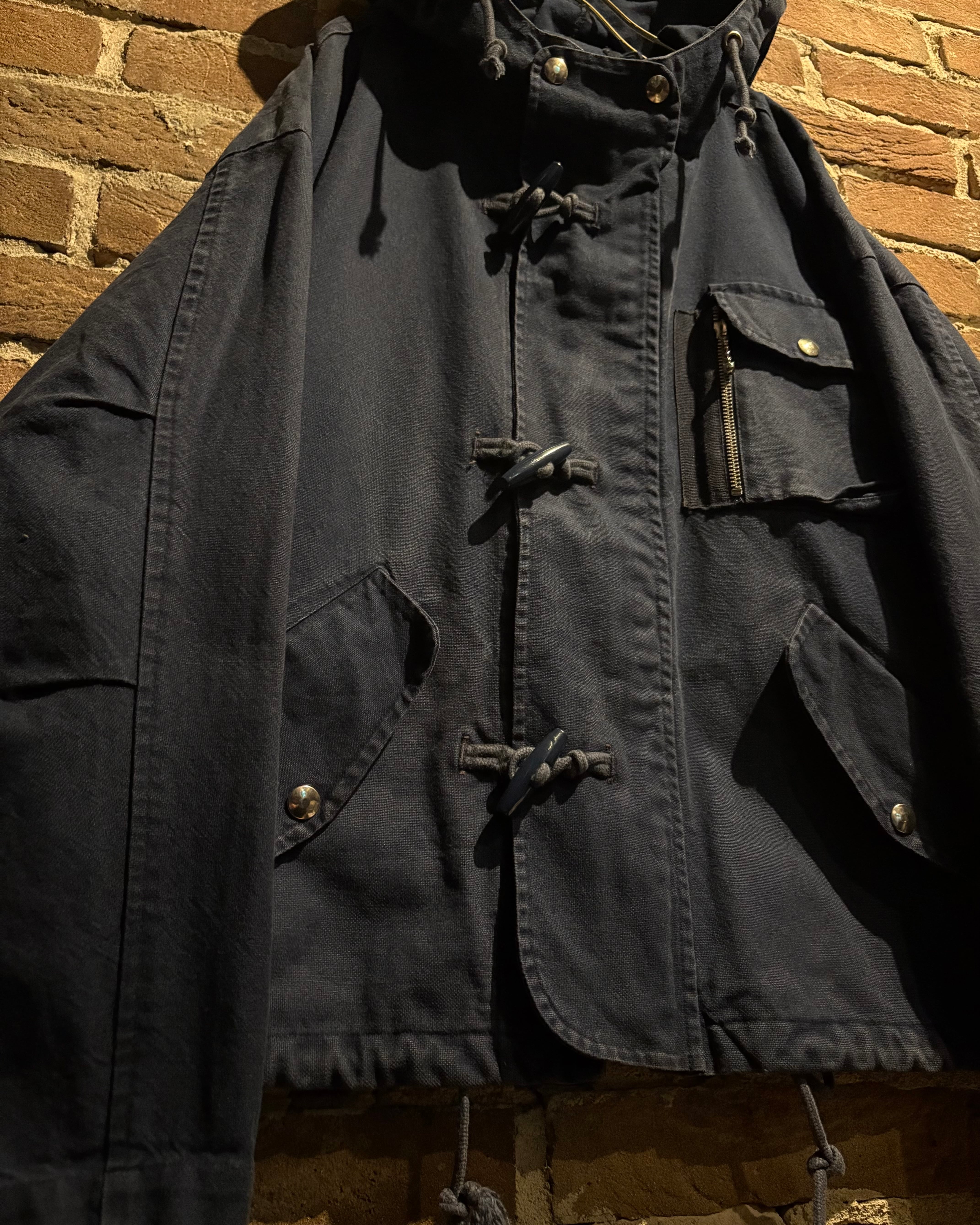 コシのあるネイビーファブリックを用い、フロントにトグルボタンのギミックを落とし込んだ短丈の90'sダッフルコート。