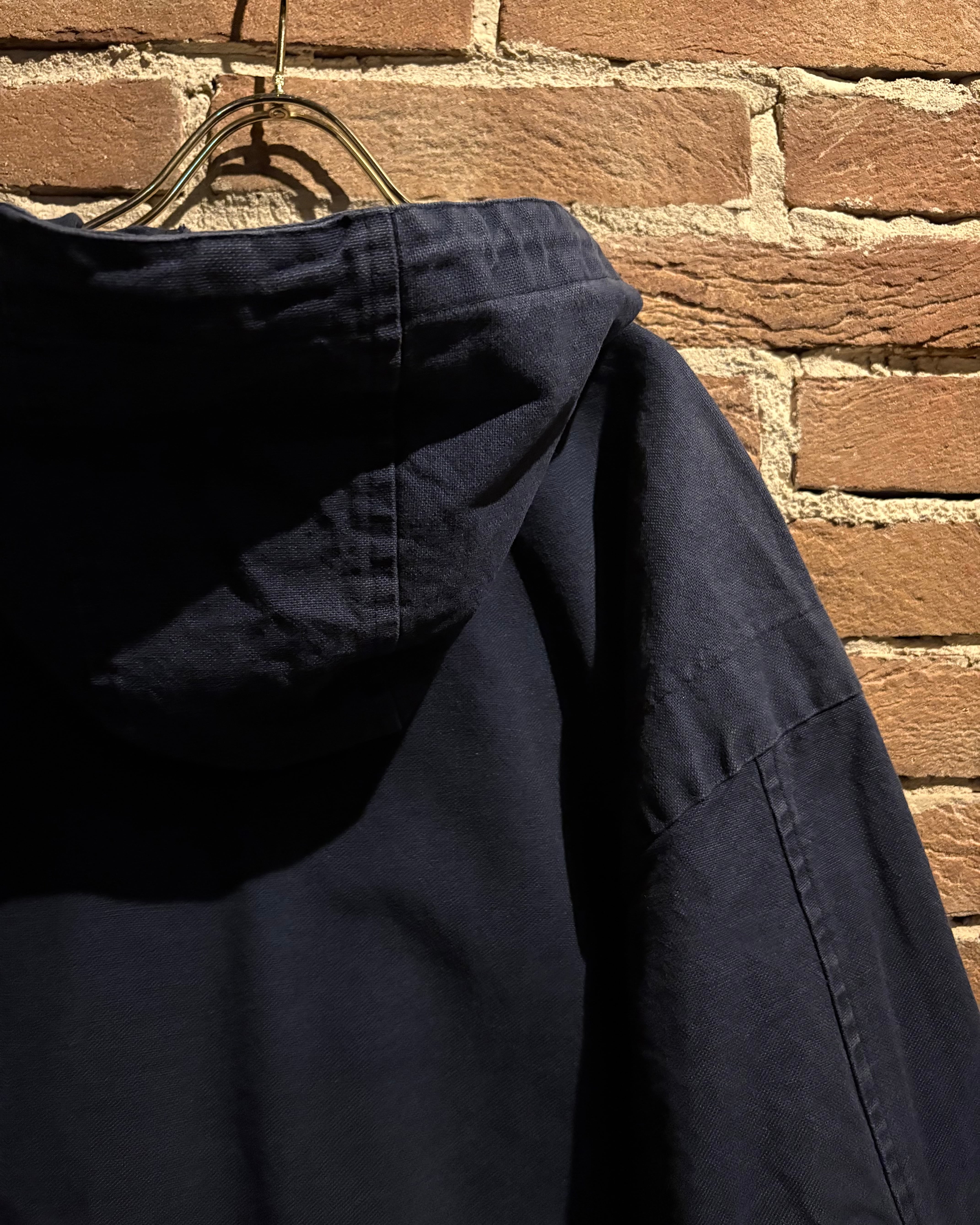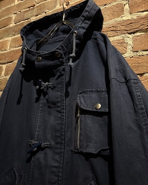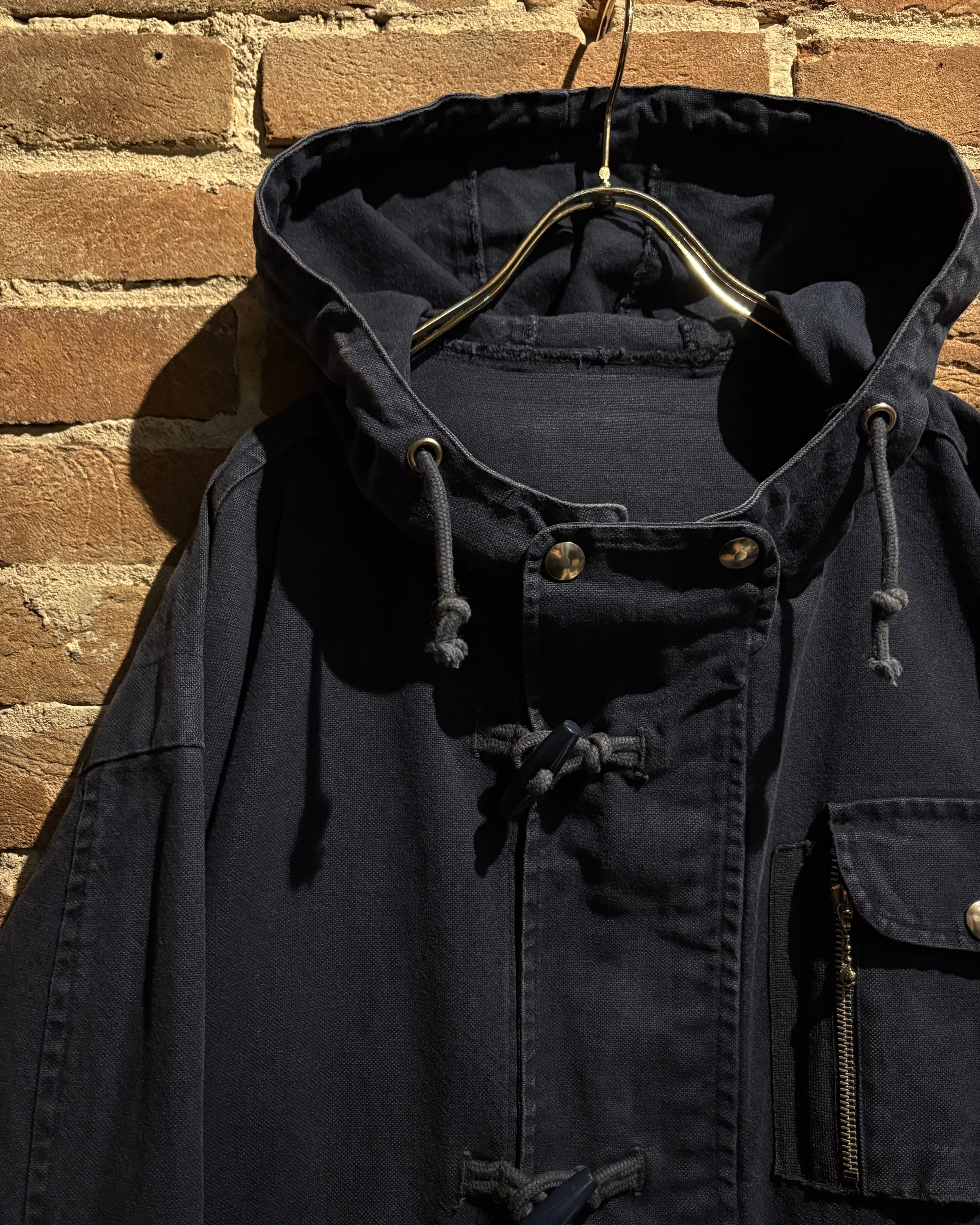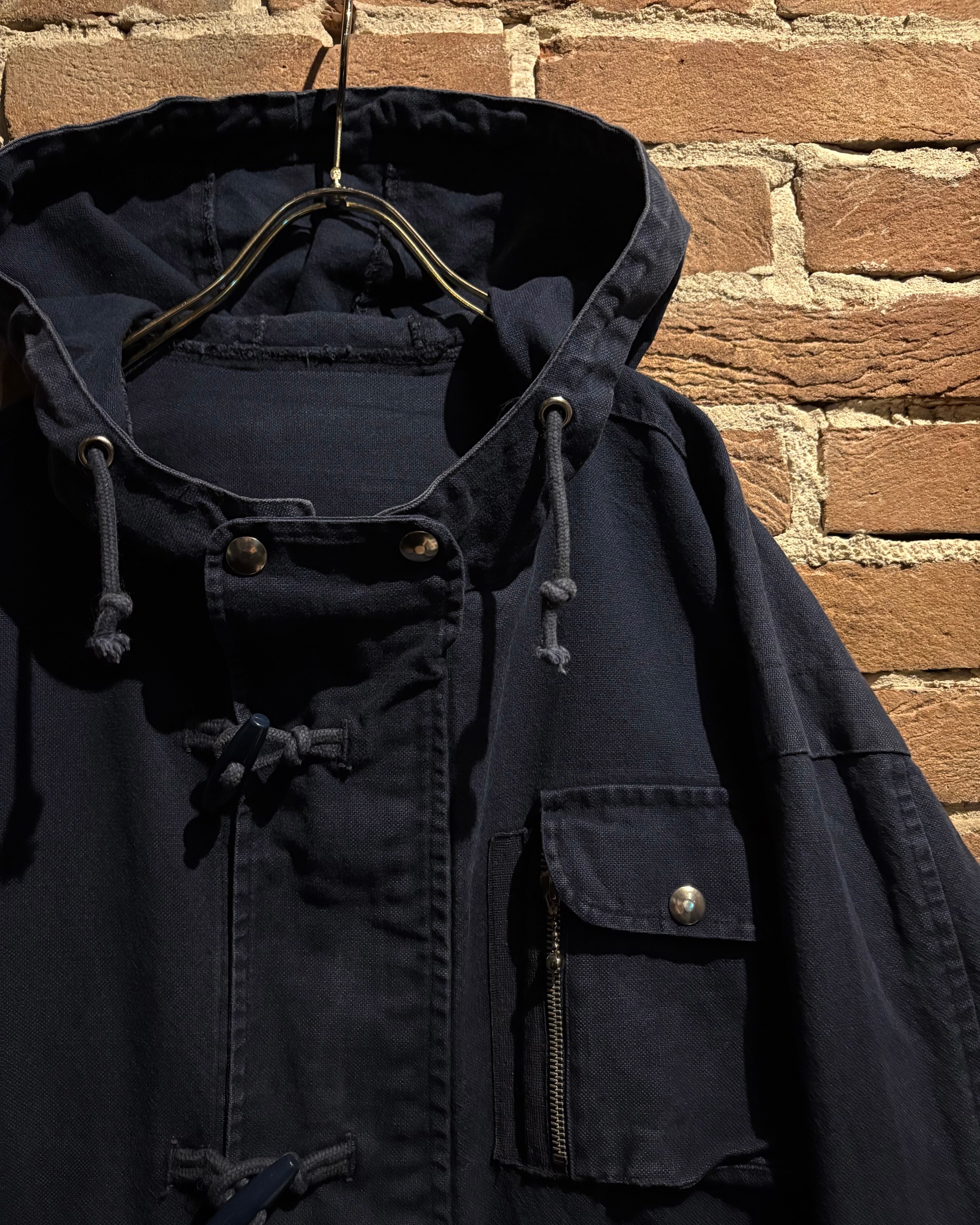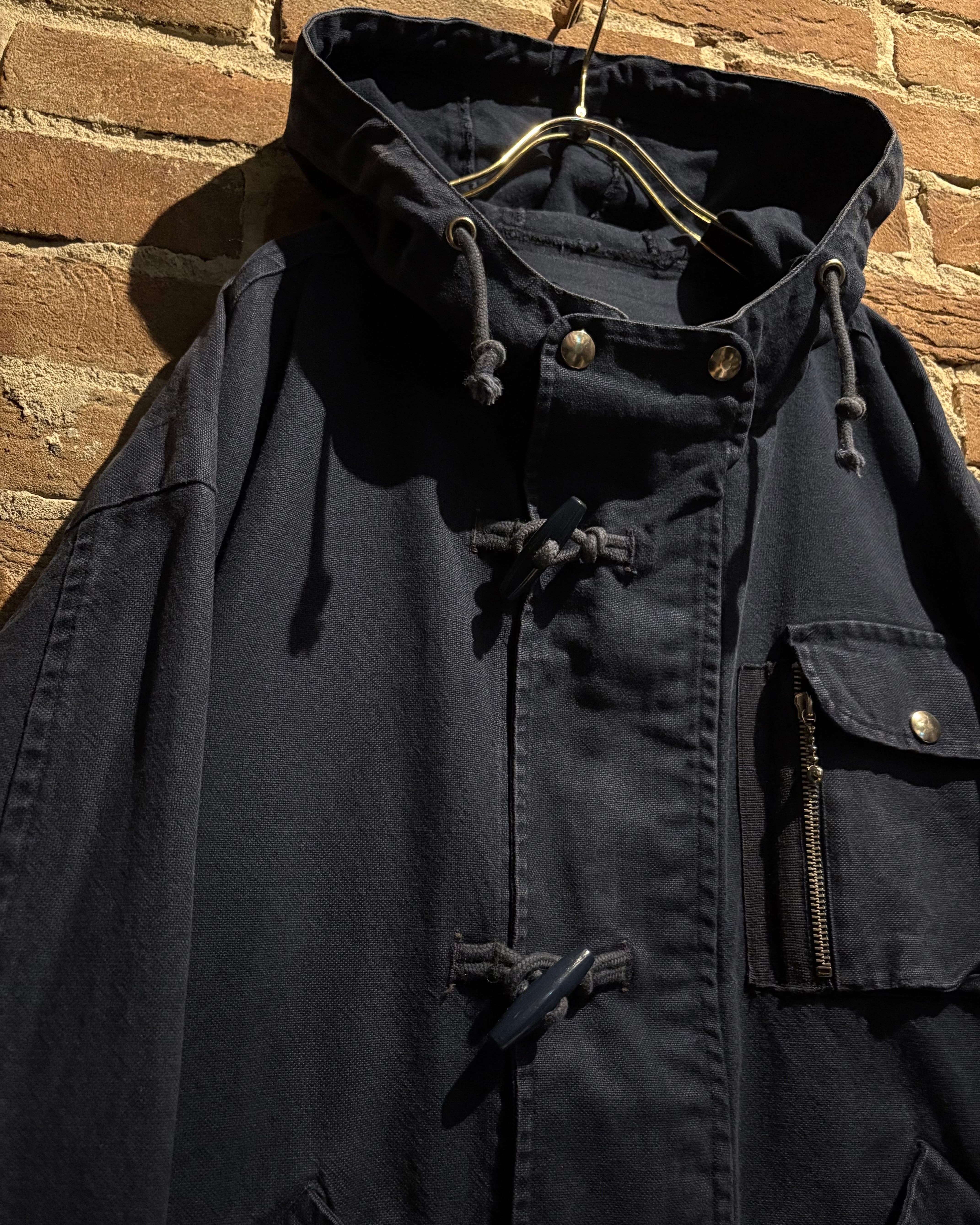 コシのあるネイビーファブリックを用い、フロントにトグルボタンのギミックを落とし込んだ短丈の90'sダッフルコート。