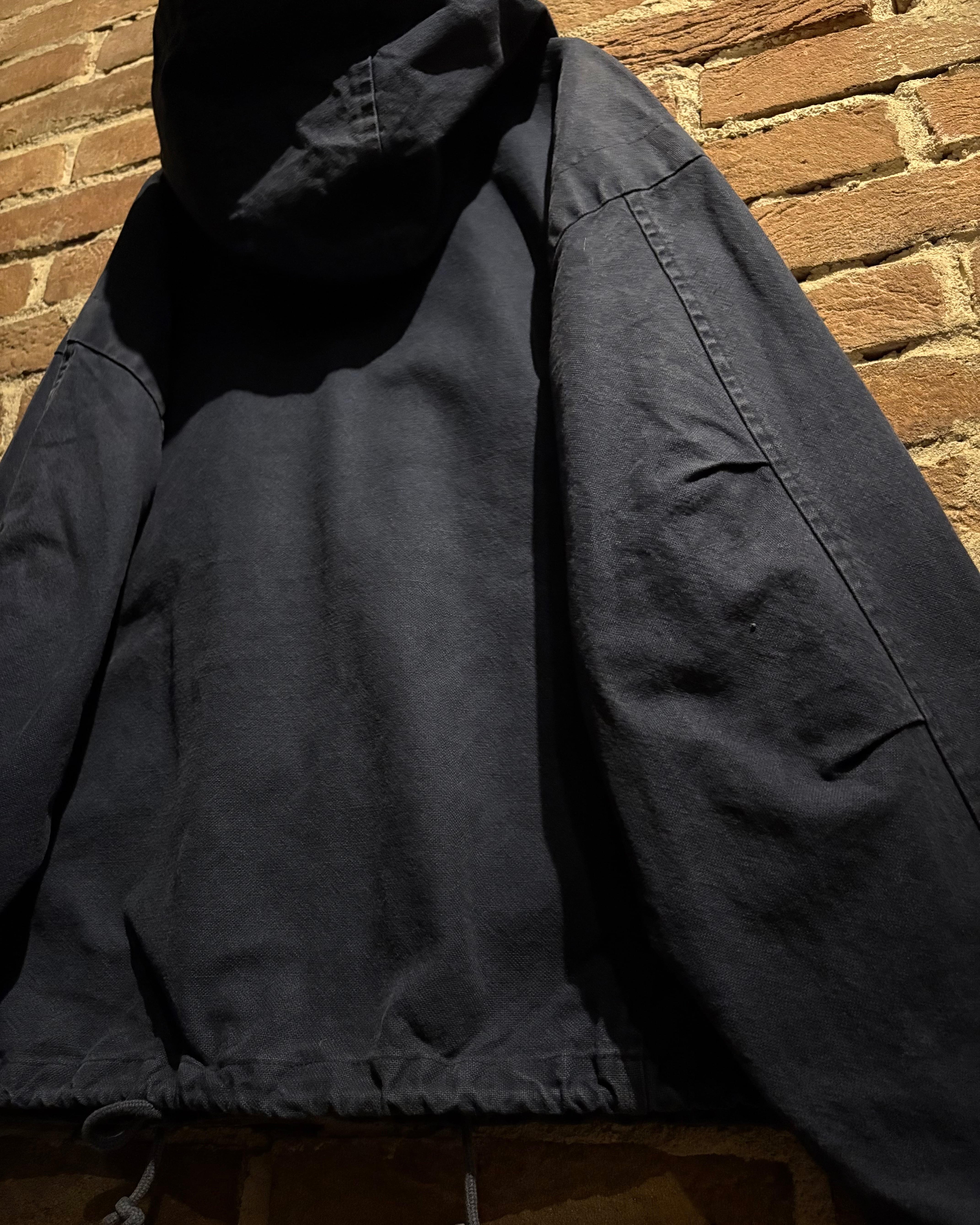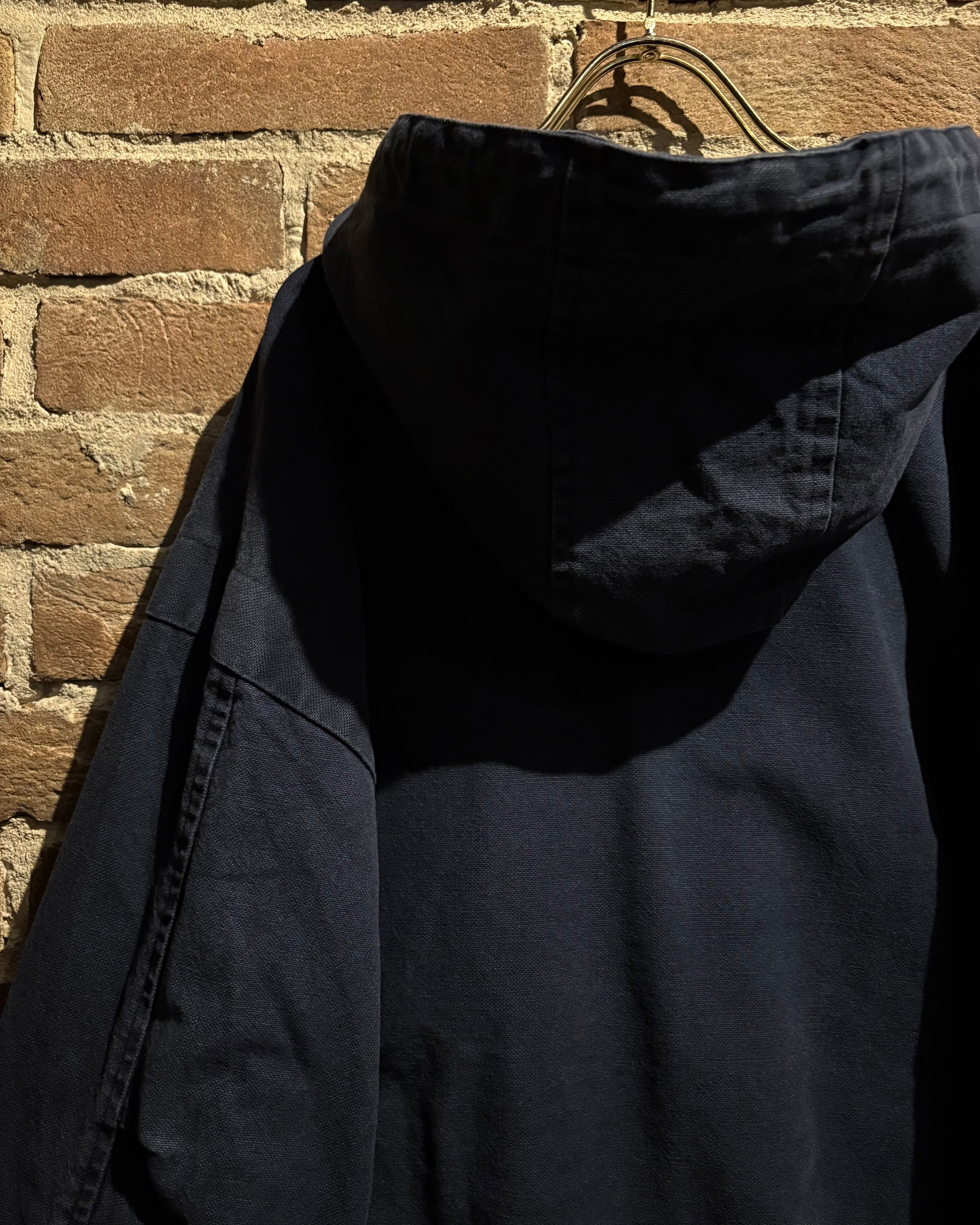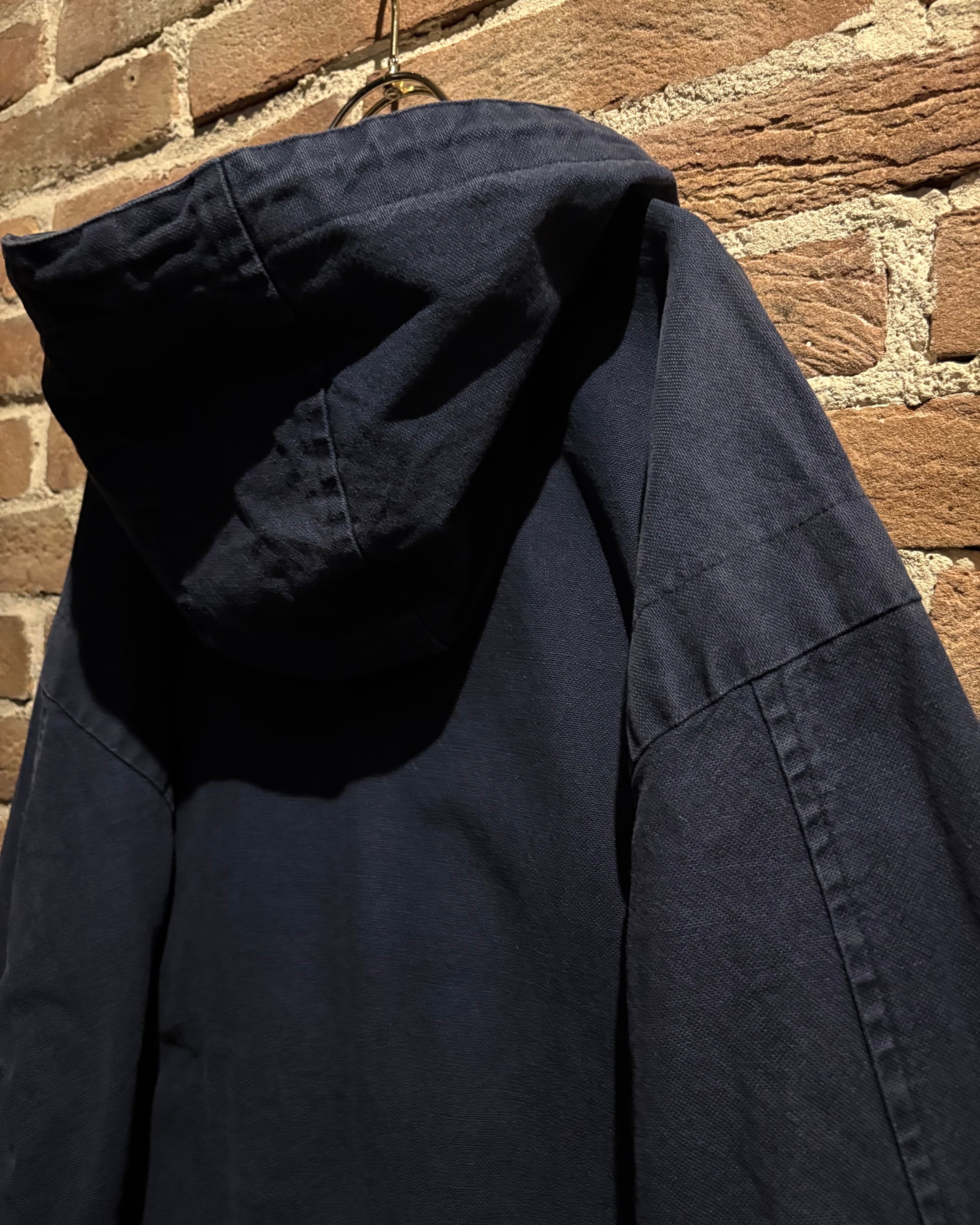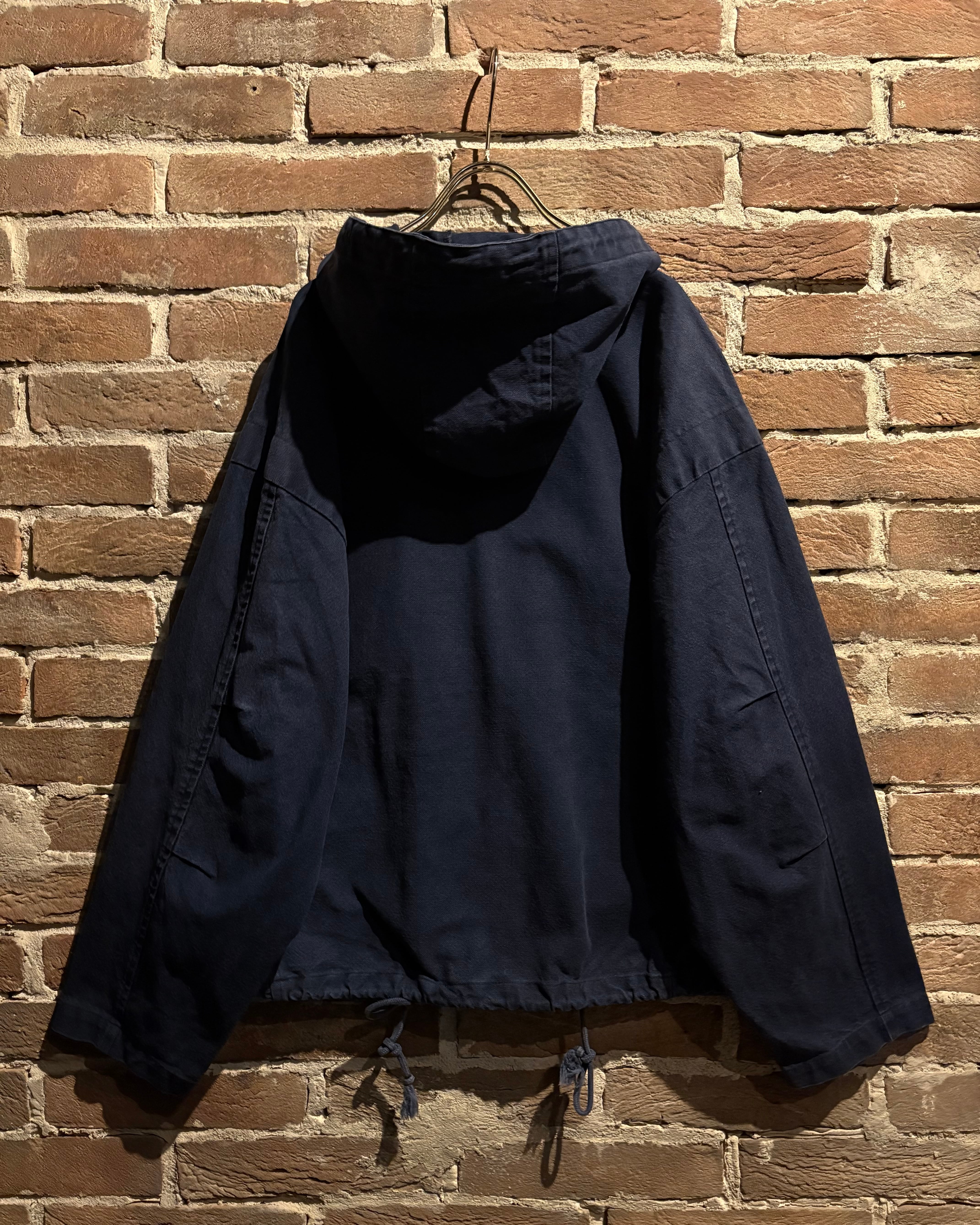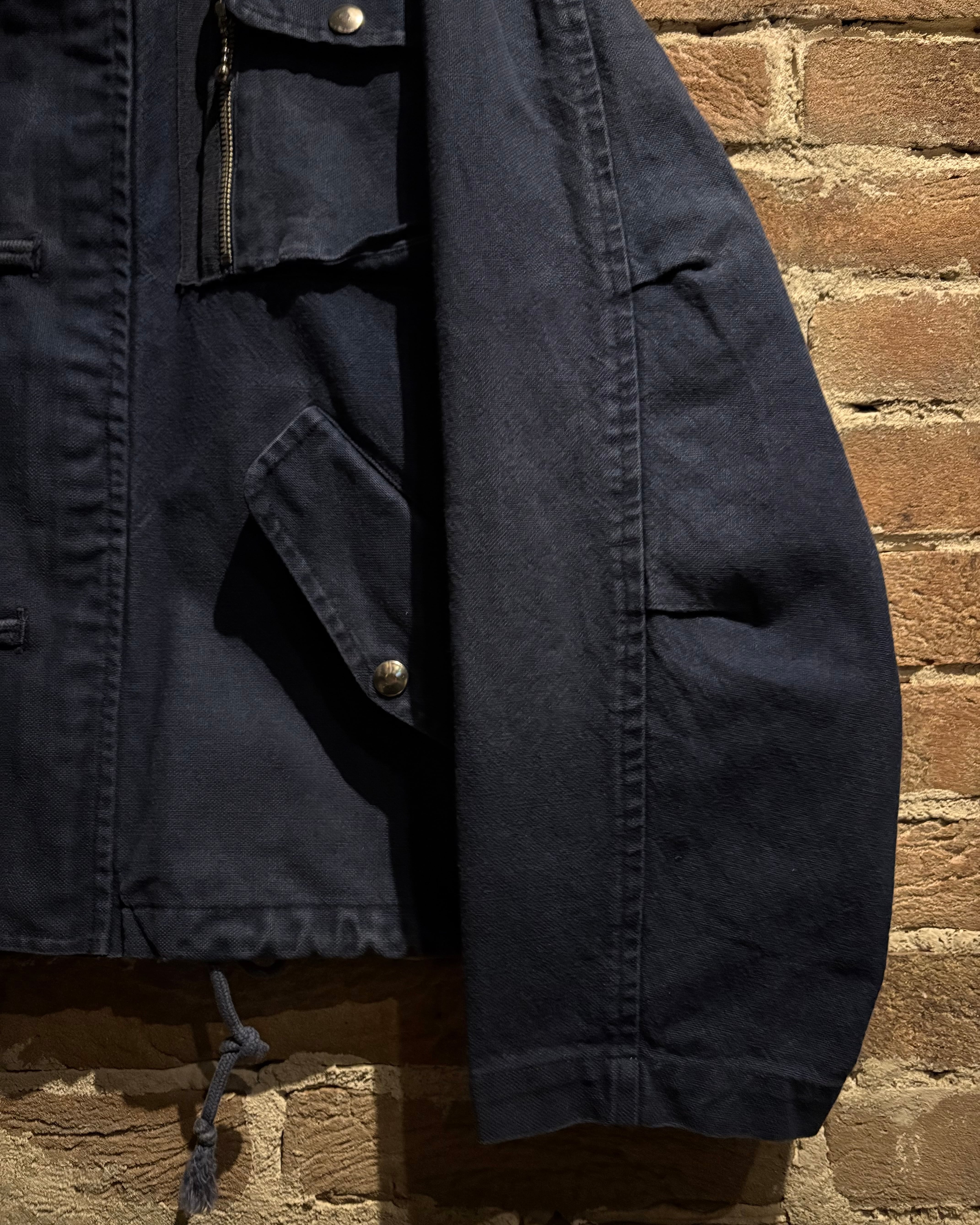 コシのあるネイビーファブリックを用い、フロントにトグルボタンのギミックを落とし込んだ短丈の90'sダッフルコート。