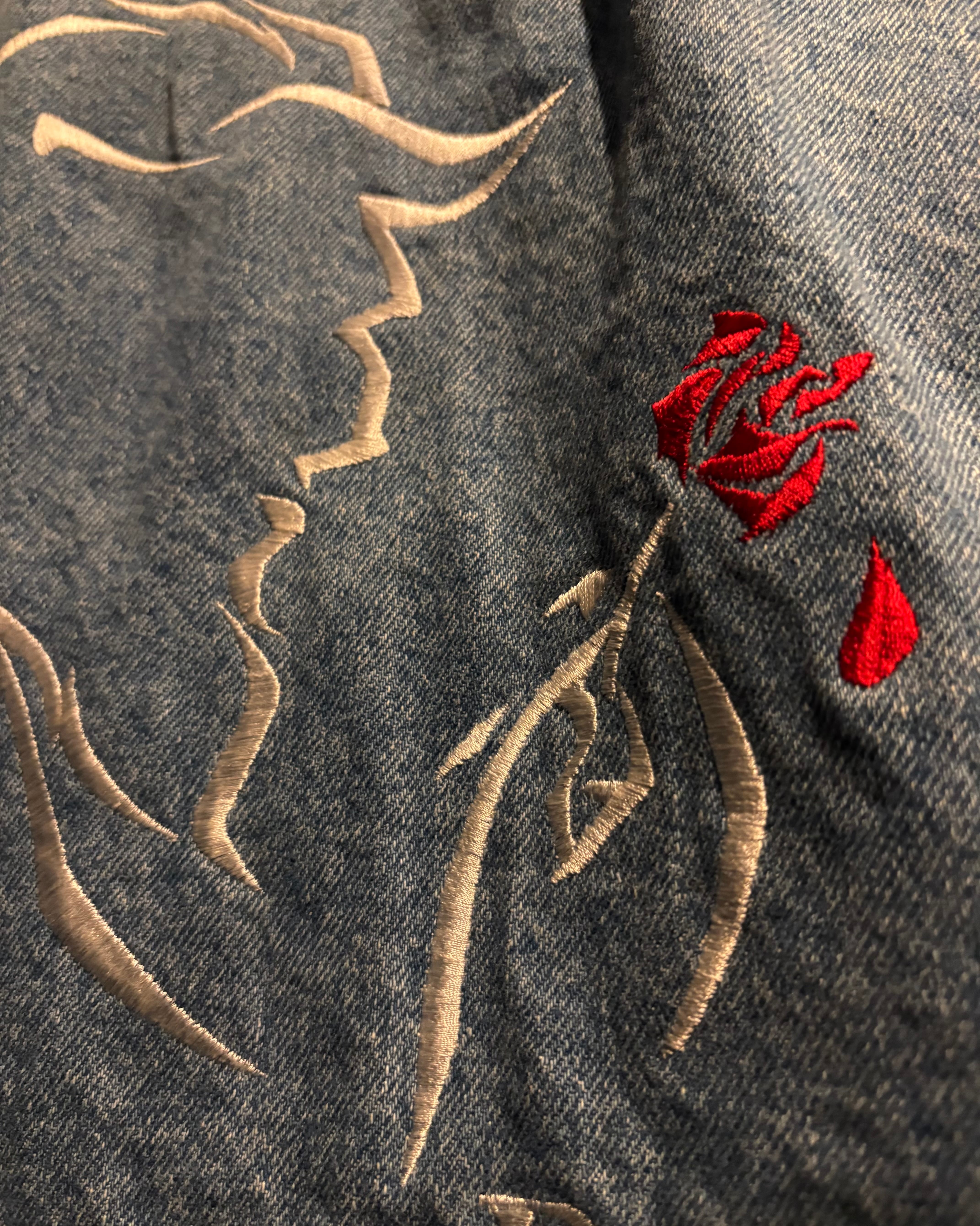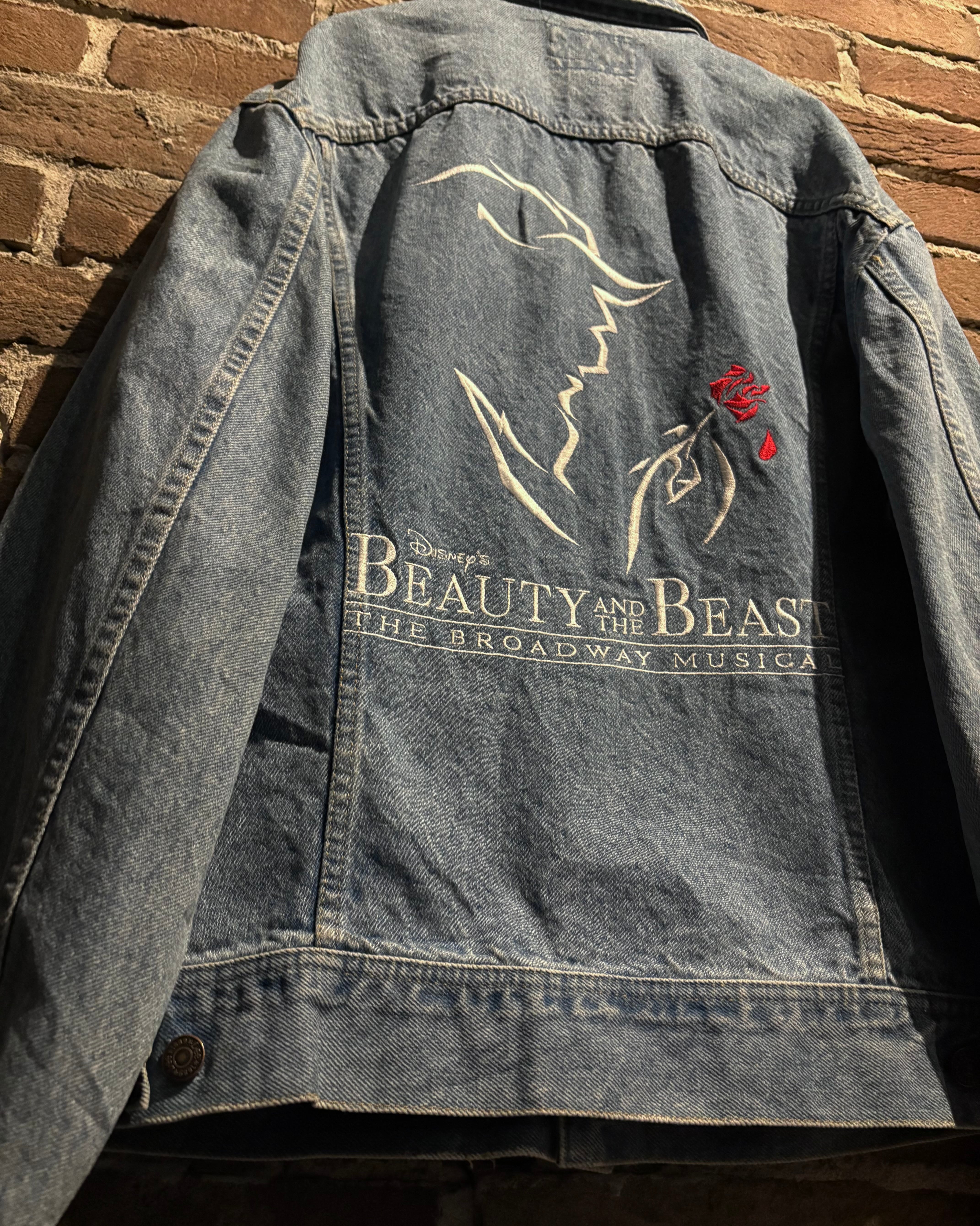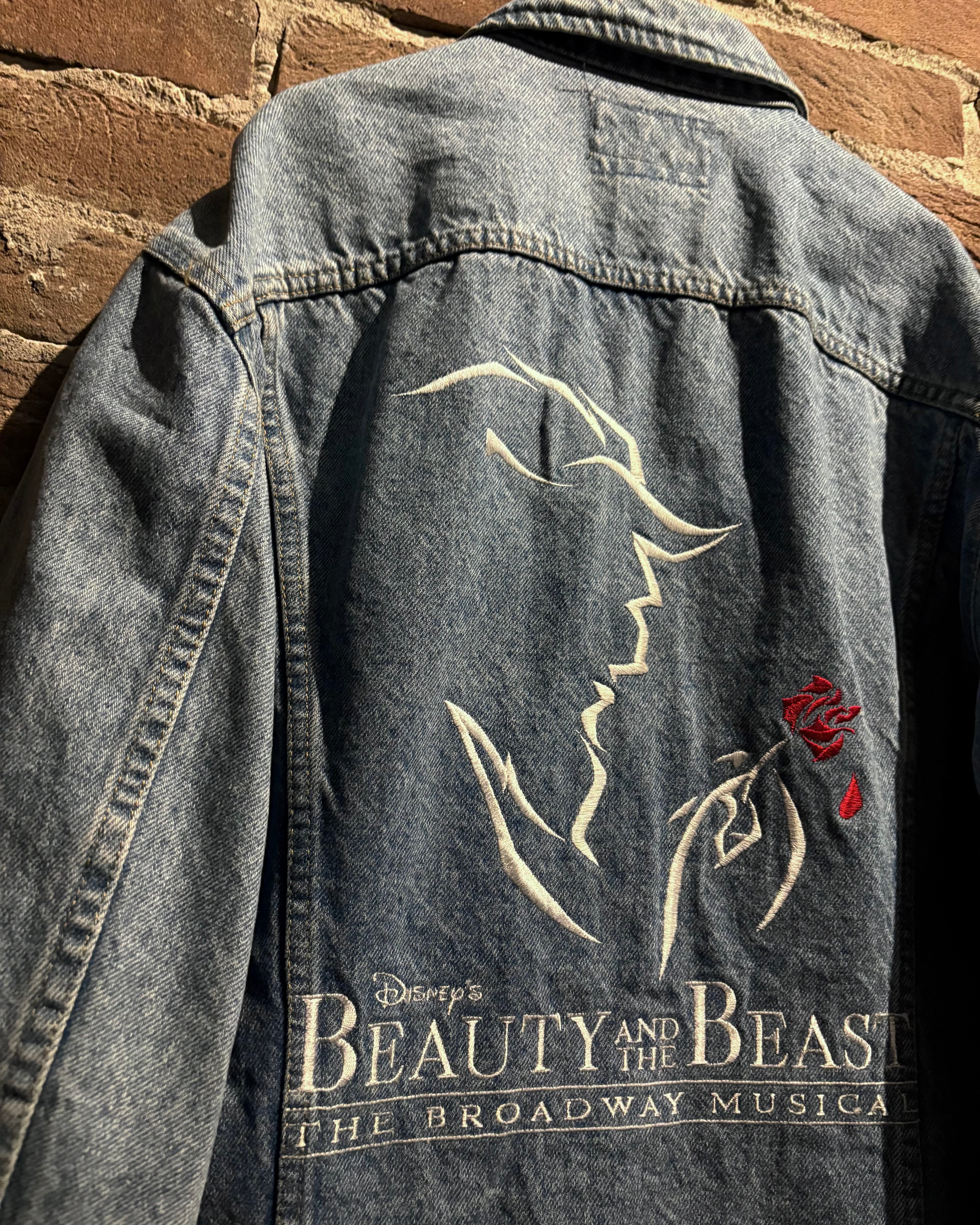 背面には『美女と野獣』を象徴する薔薇とシルエットを刺繍で表現し、その下には“THE BROADWAY MUSICAL”のロゴを配置。ブロードウェイミュージカル仕様の1着で、ファンの方はもちろん古着好きにも刺さる仕上がりです。
