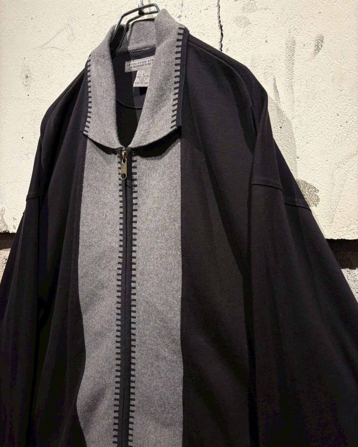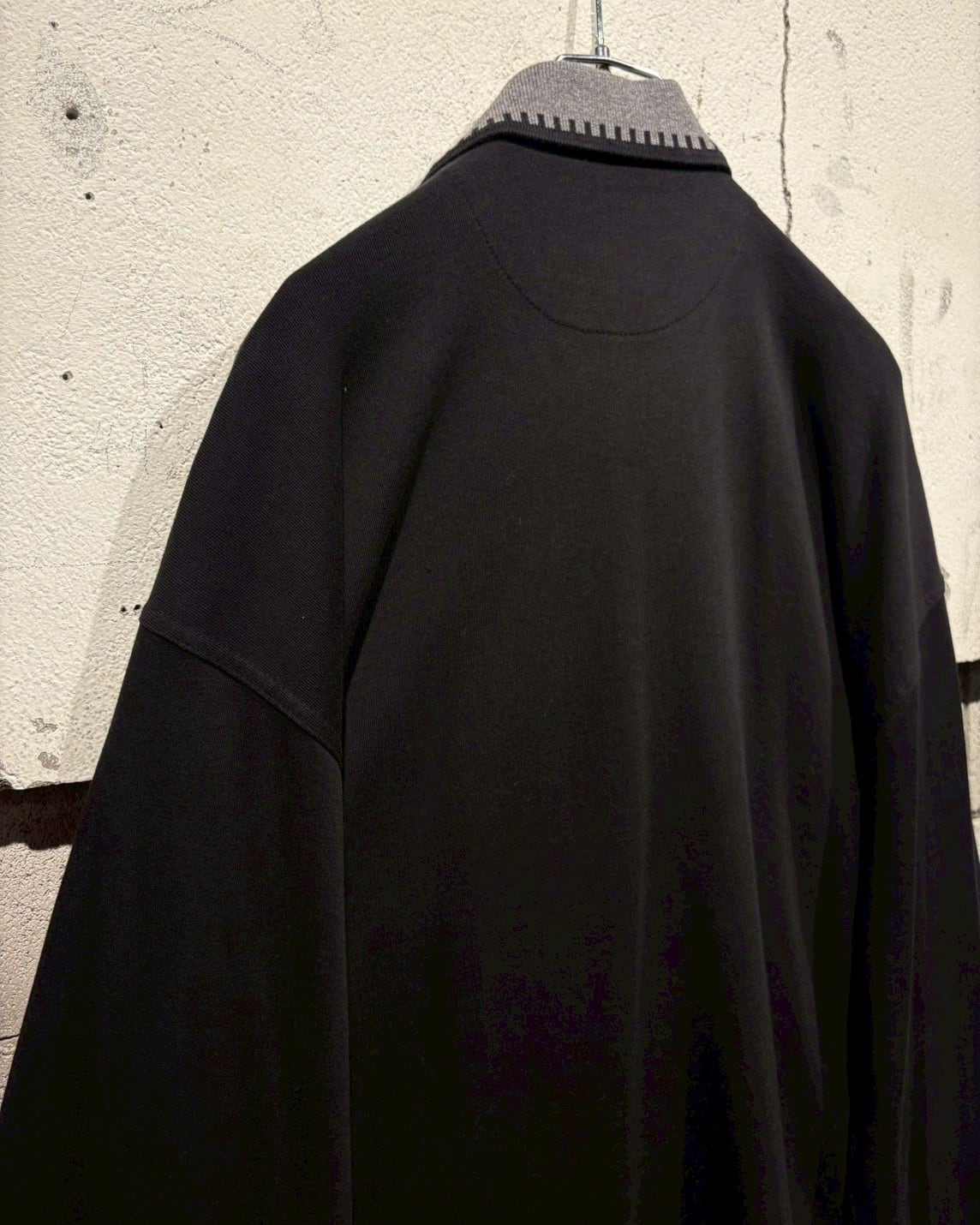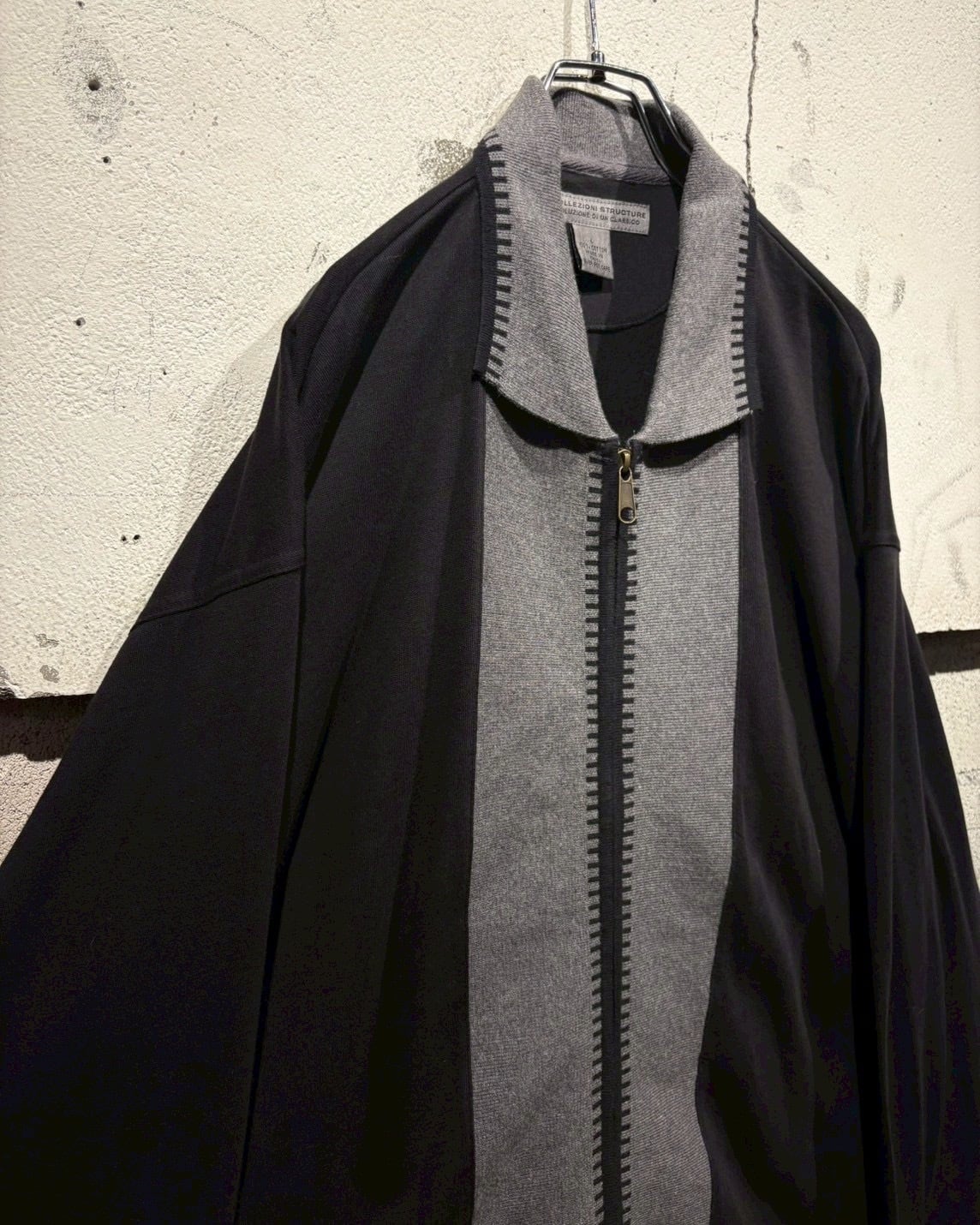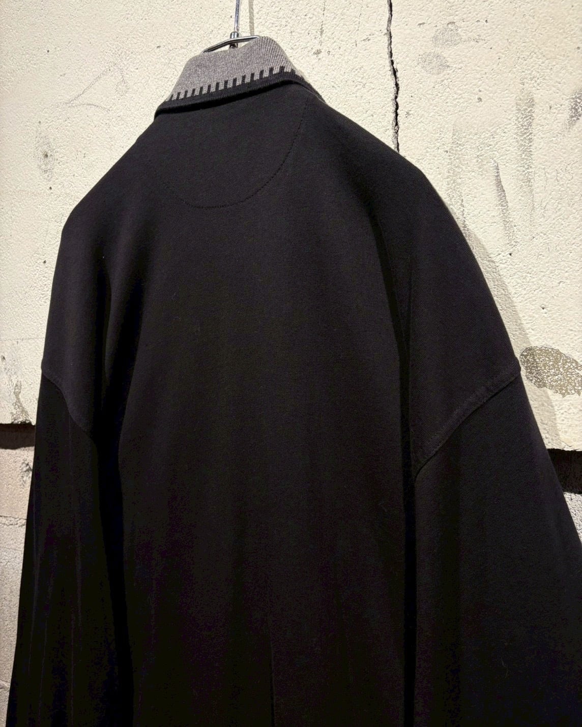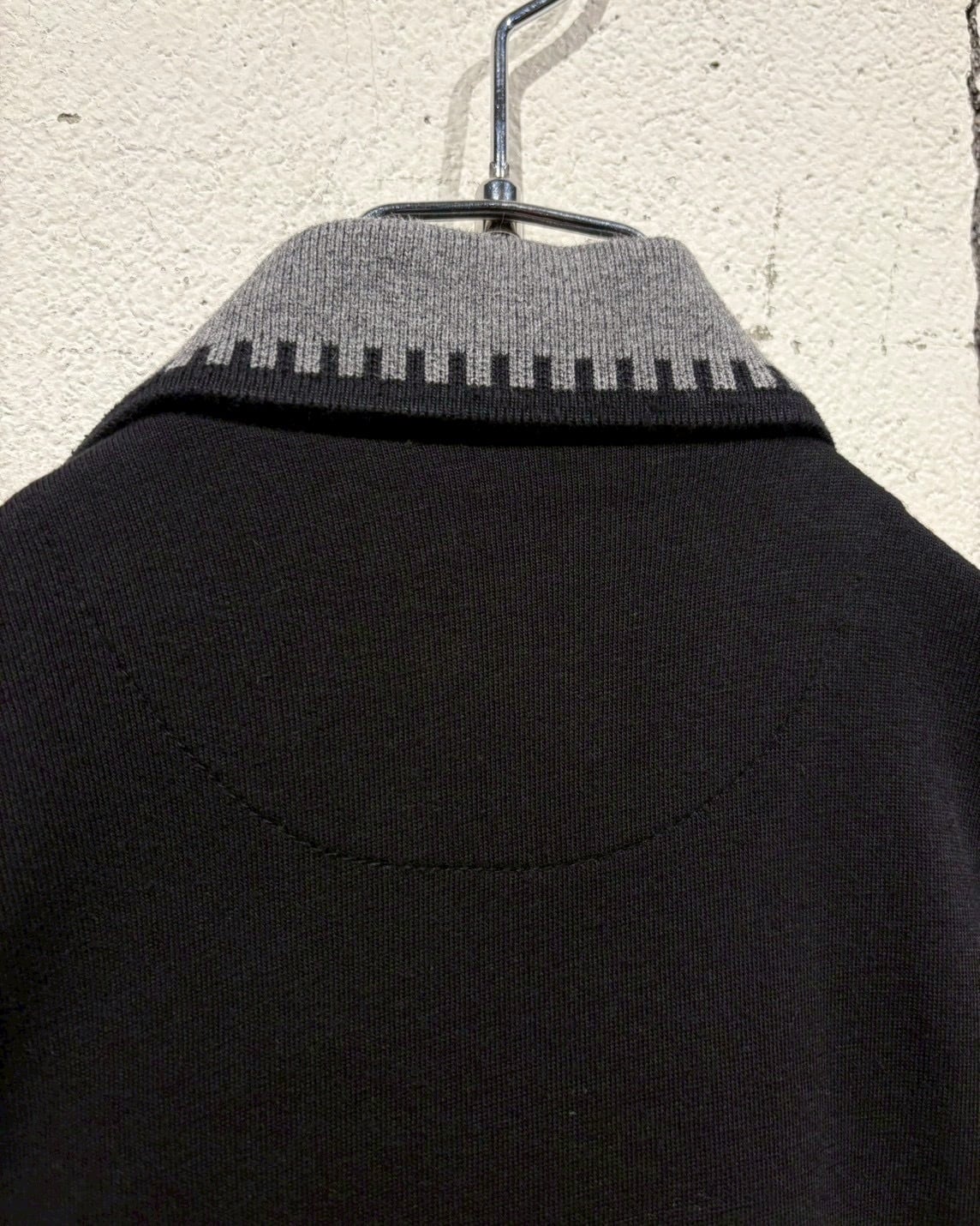 ブラックのボディをベースに、グレーの切り替えを施したシックな配色の1着。フロントから襟にかけて走るステッチ風のデザインが程よいアクセントに。