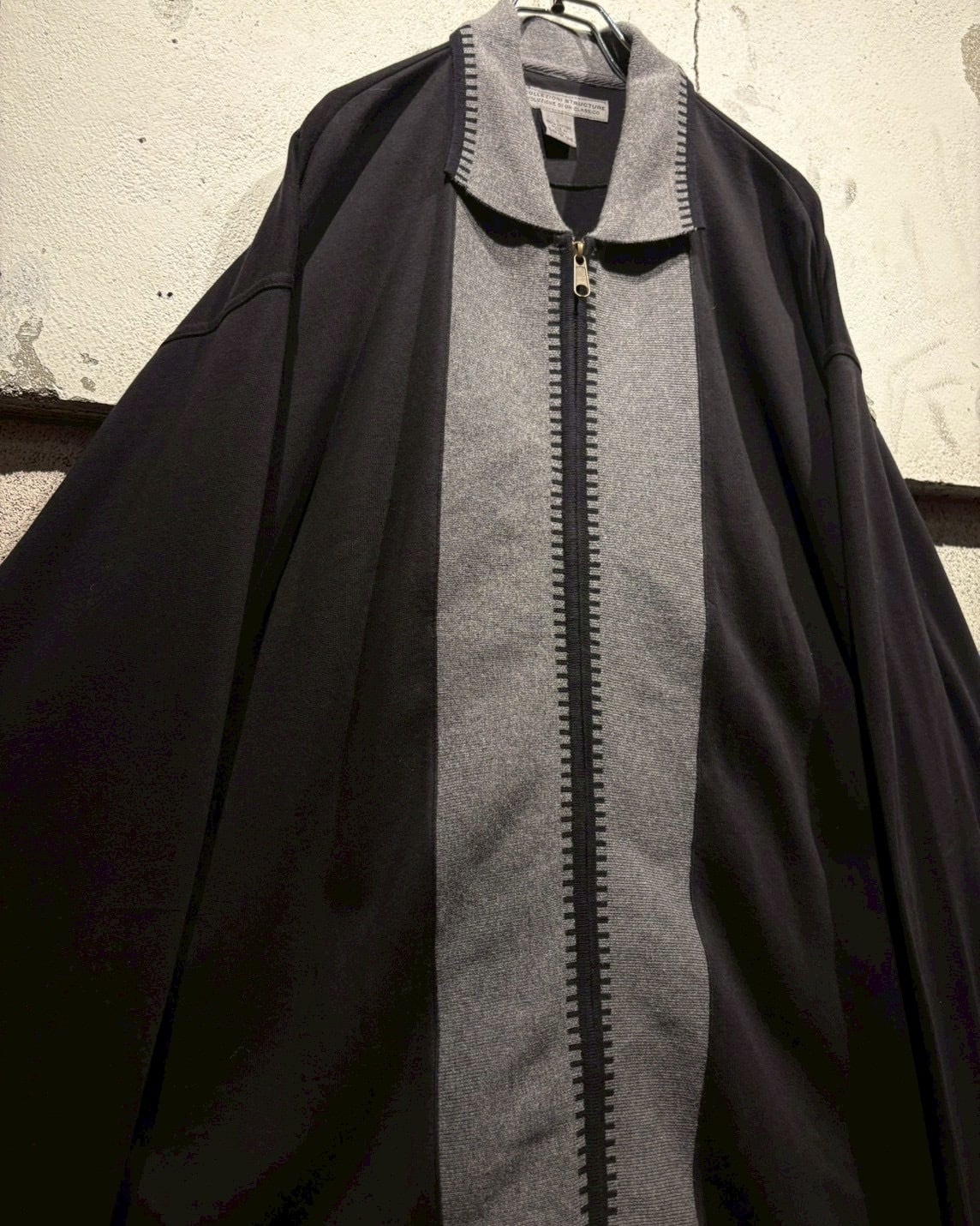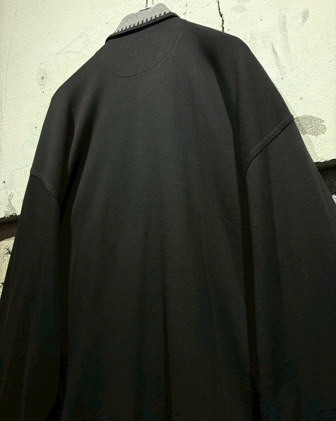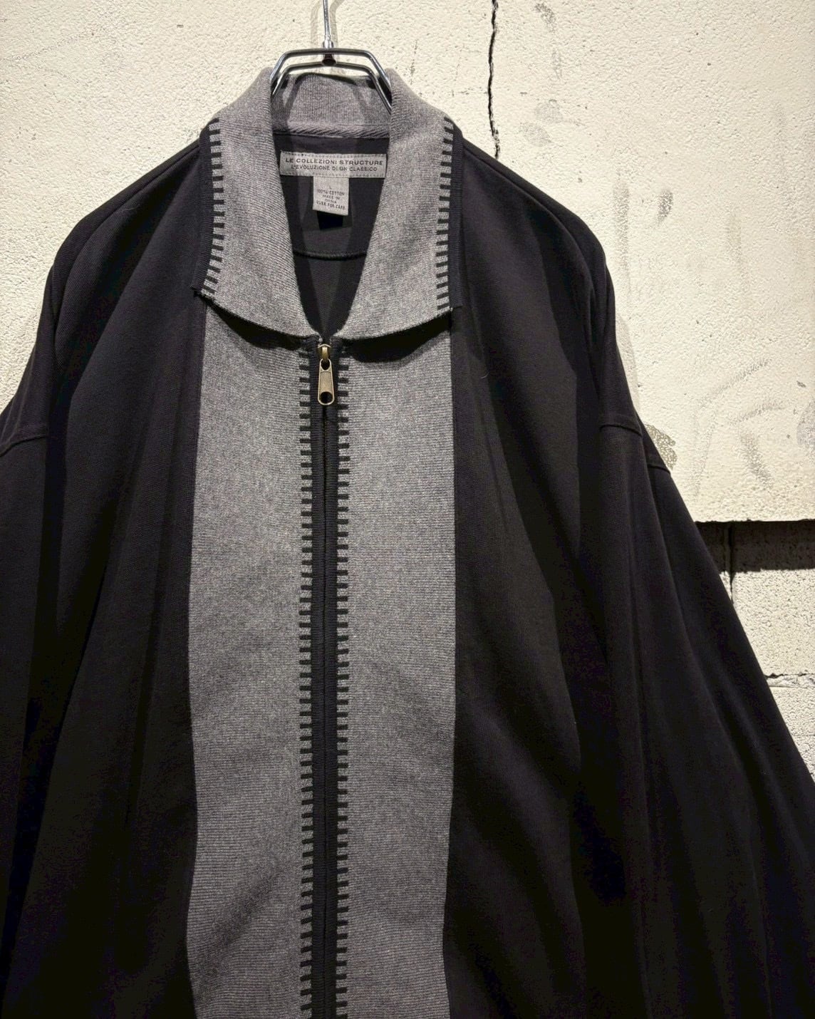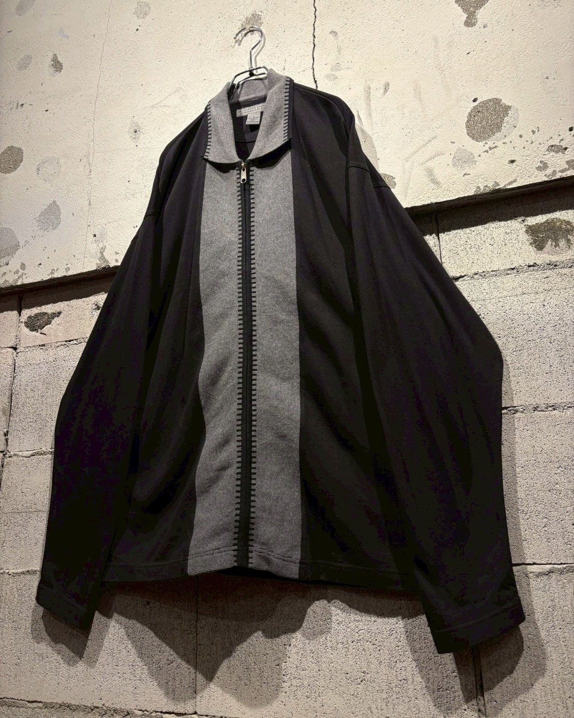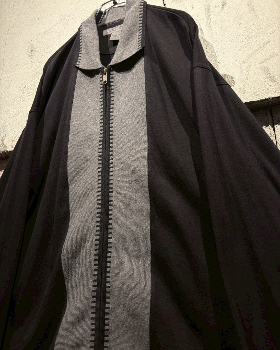 ブラックのボディをベースに、グレーの切り替えを施したシックな配色の1着。フロントから襟にかけて走るステッチ風のデザインが程よいアクセントに。