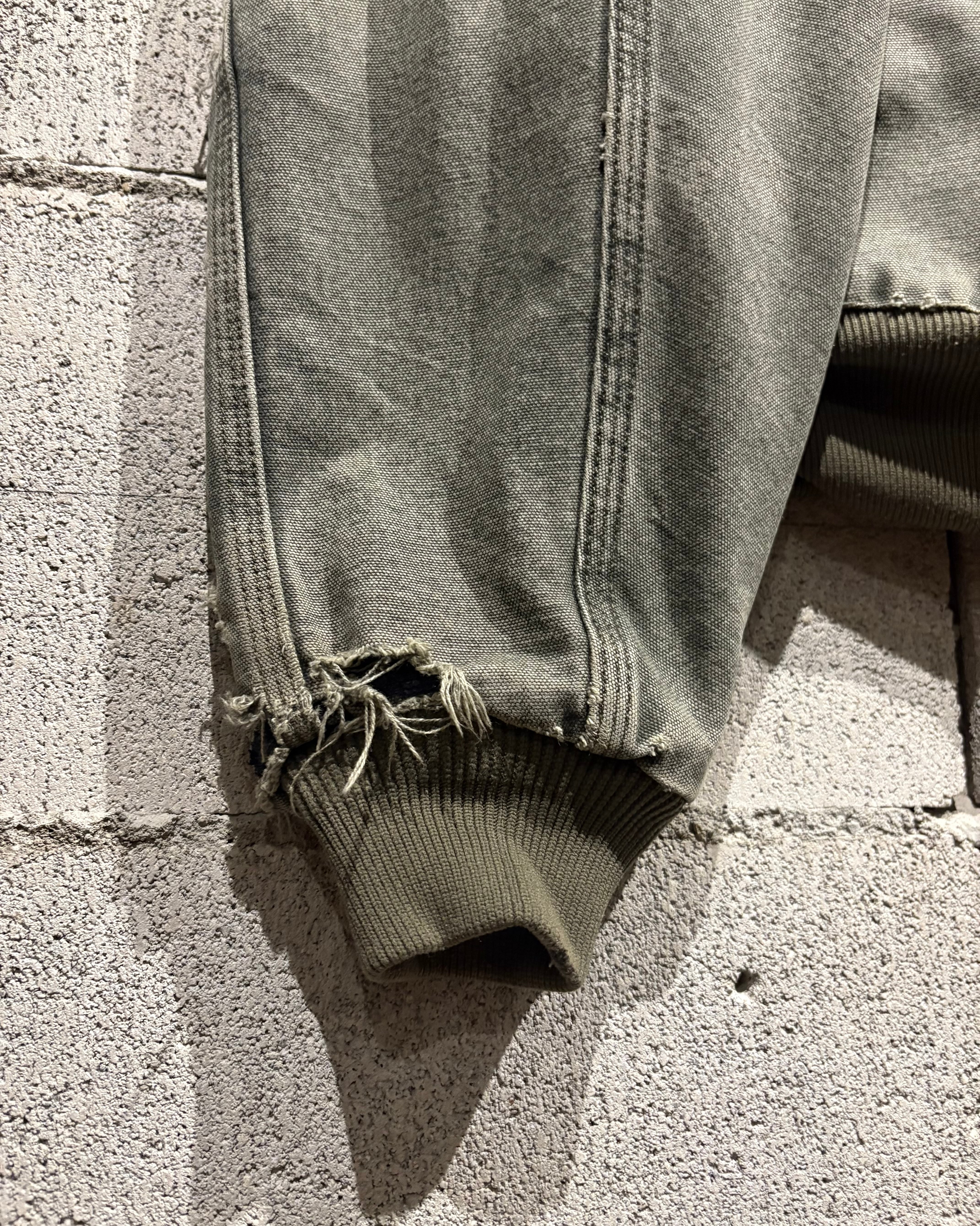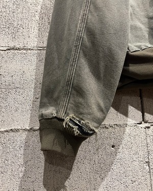 タフなダック地をベースに、長年の着用によって生まれた超フェードのモスグリーンの1着。