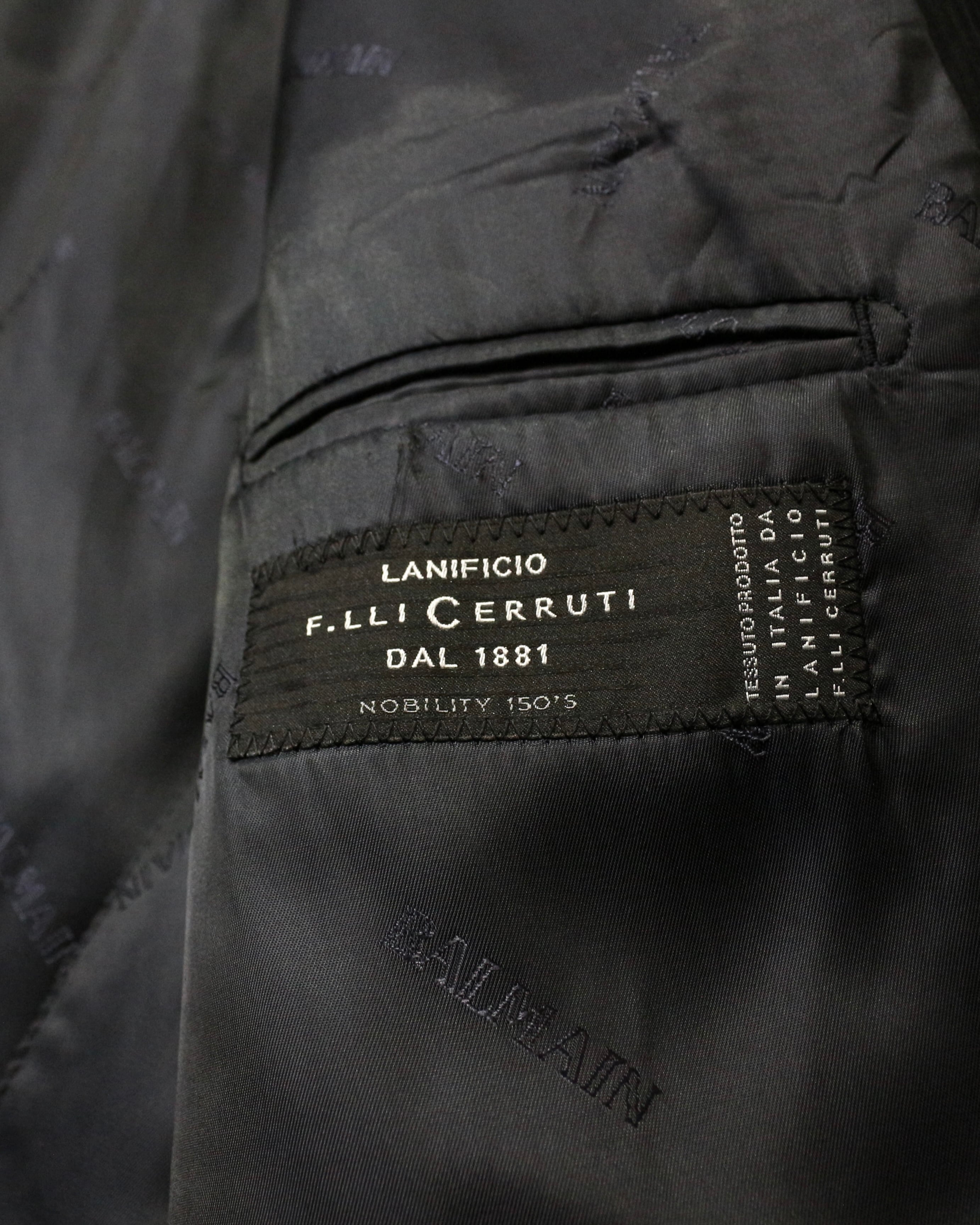 フロントはシングル2ボタン、ノッチドラペルと、ベーシックな作りの中にパターンの良さと仕立ての美しさが際立ちますね。裏地にはロゴが織り込まれ、見えない部分にまでブランドのアイデンティティが宿っています。
