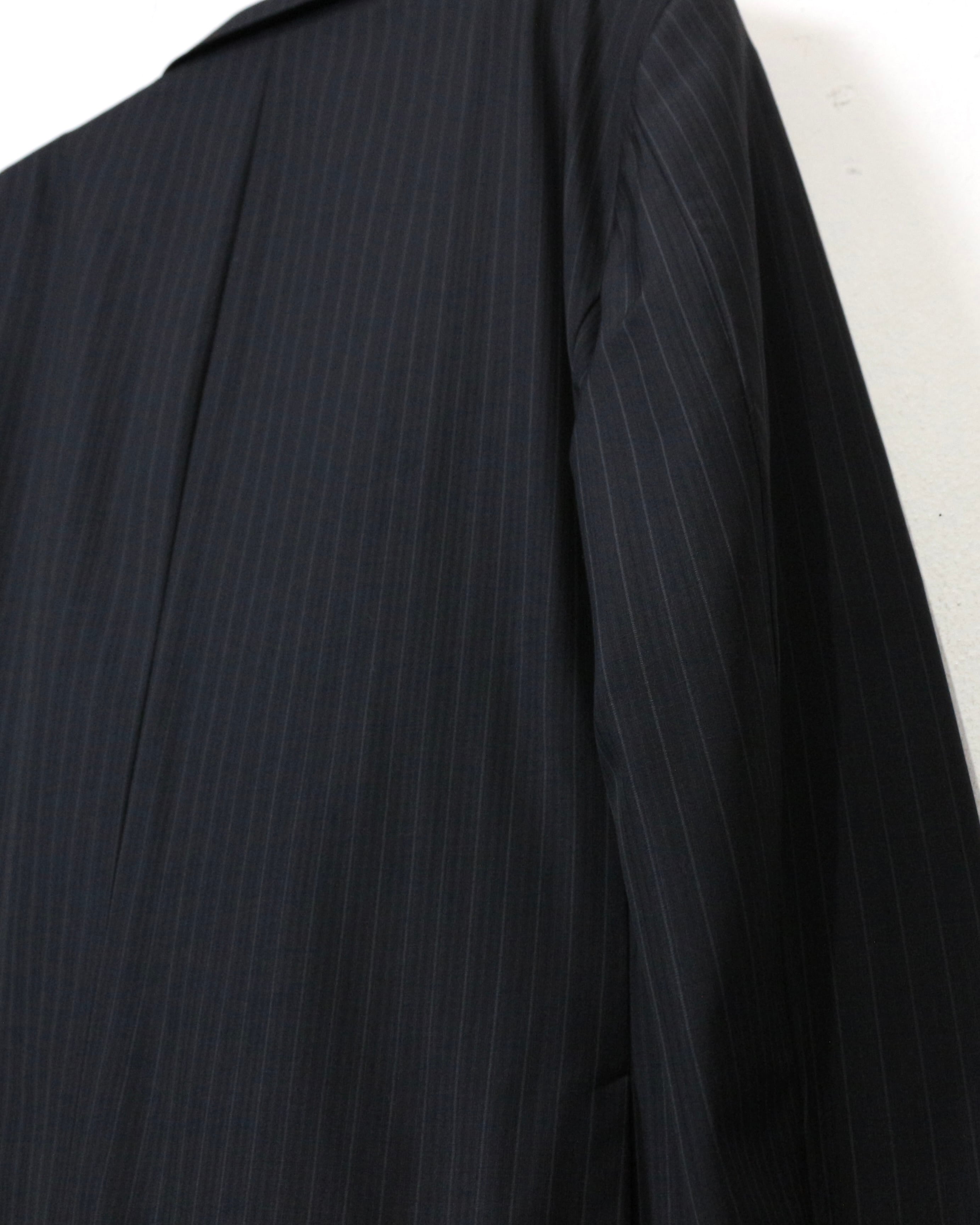 生地にはイタリアの名門ファブリックメーカー、“LANIFICIO CERRUTI”の“NOBILITY 150’s”を採用。極細ウールならではのしなやかさと滑らかなタッチ、そして上品な光沢が特徴で、ブラックベースに走るピンストライプが奥行きのある表情を演出。クラシックでありながらラグジュアリーなムードを纏った1着に仕上がっています。