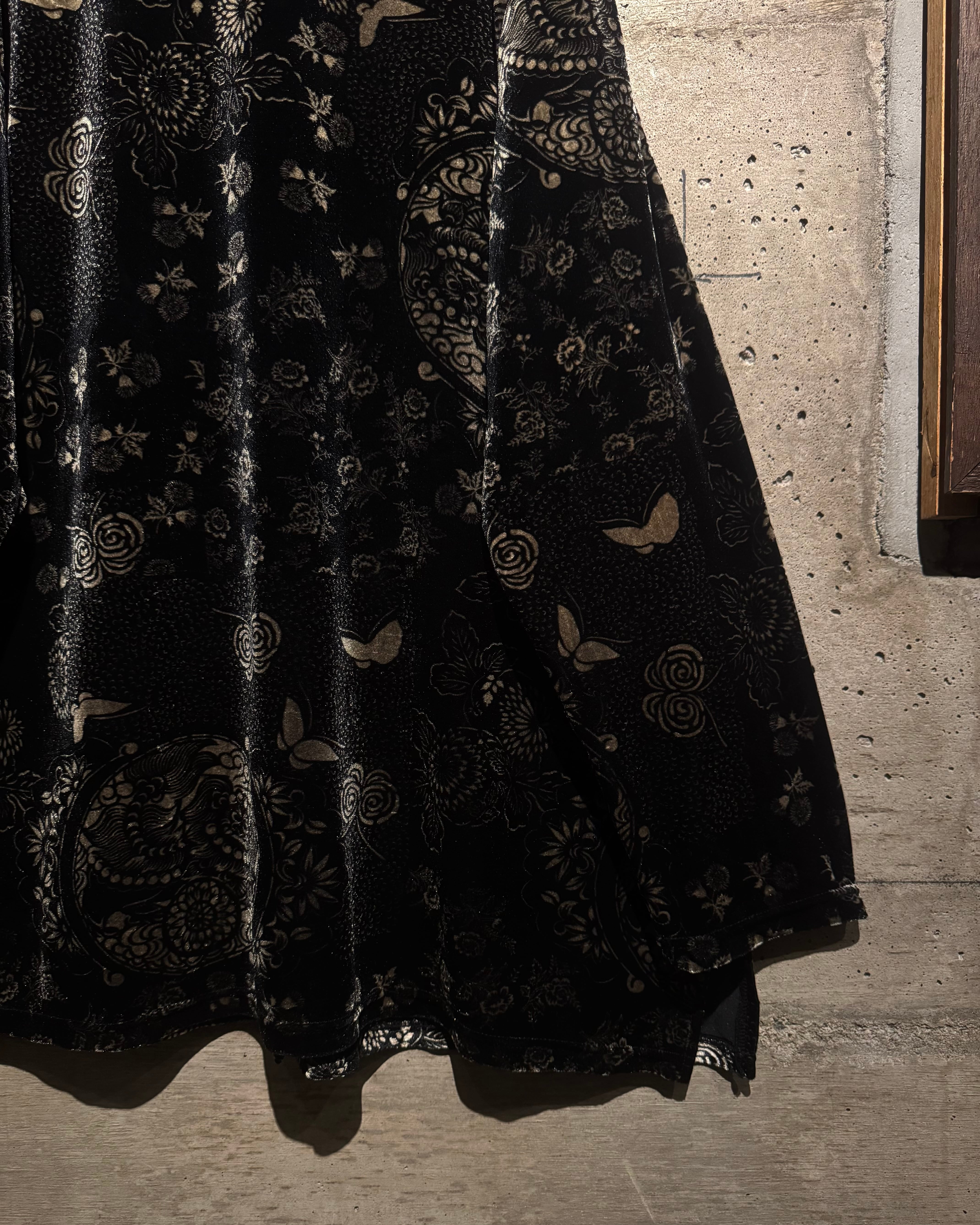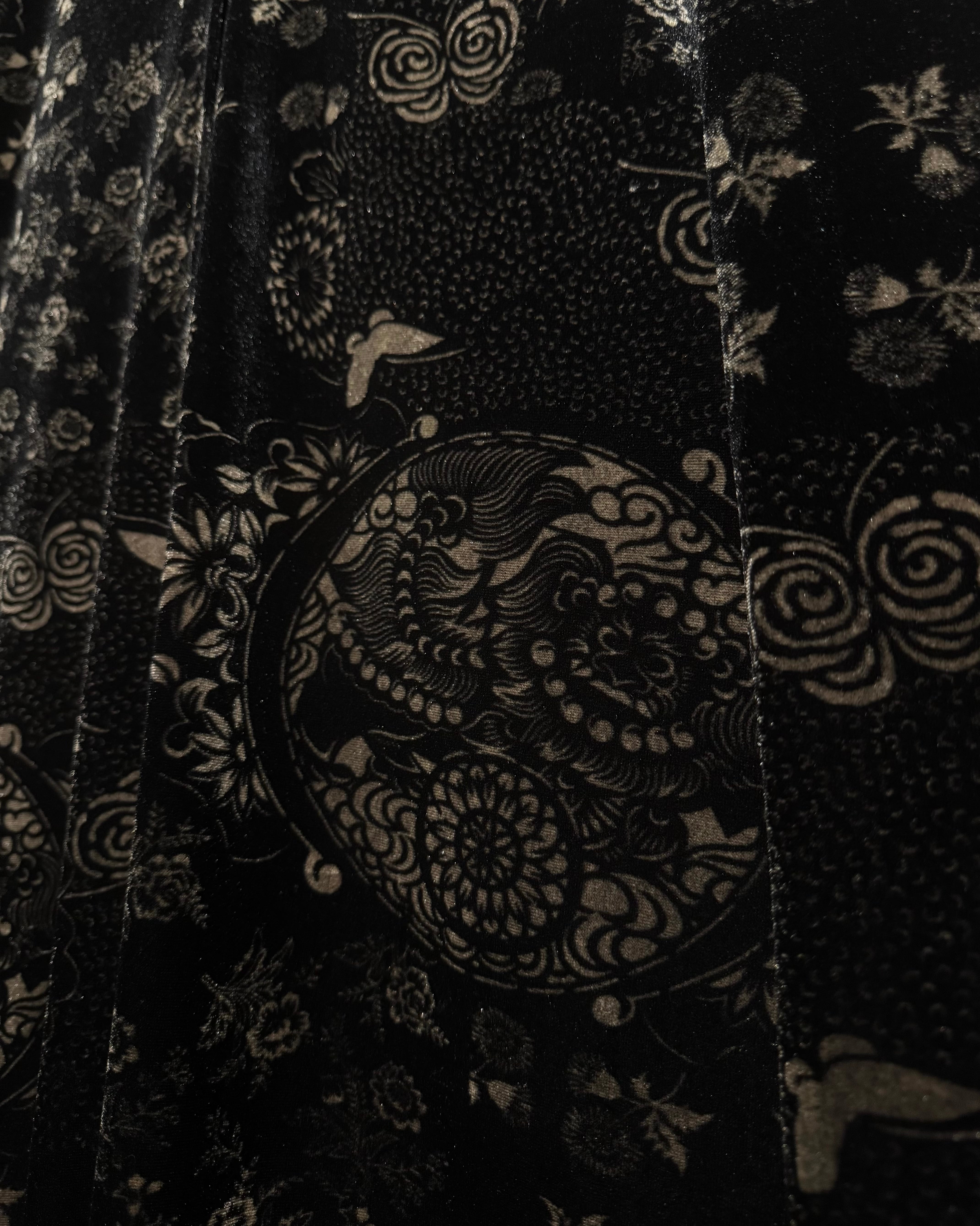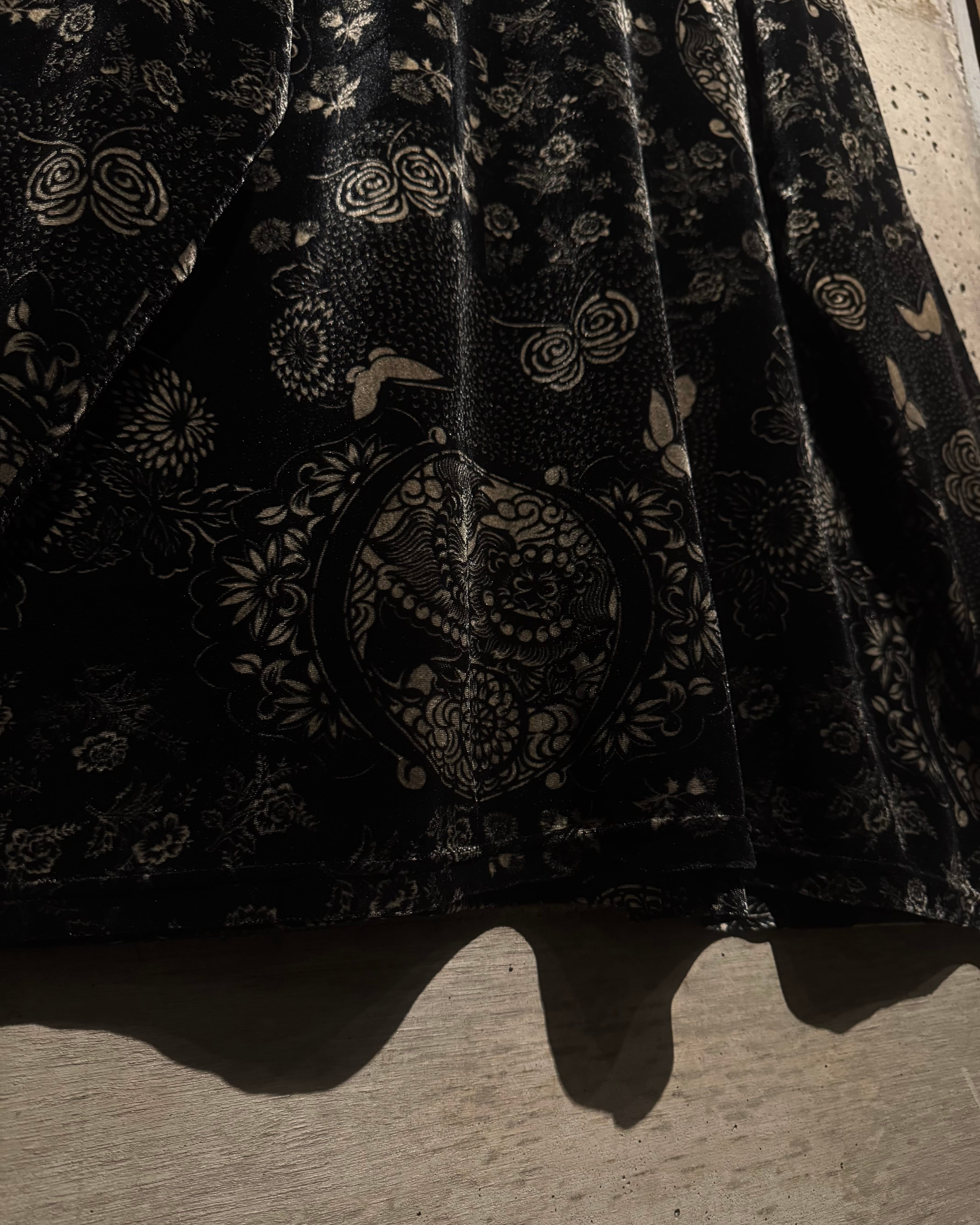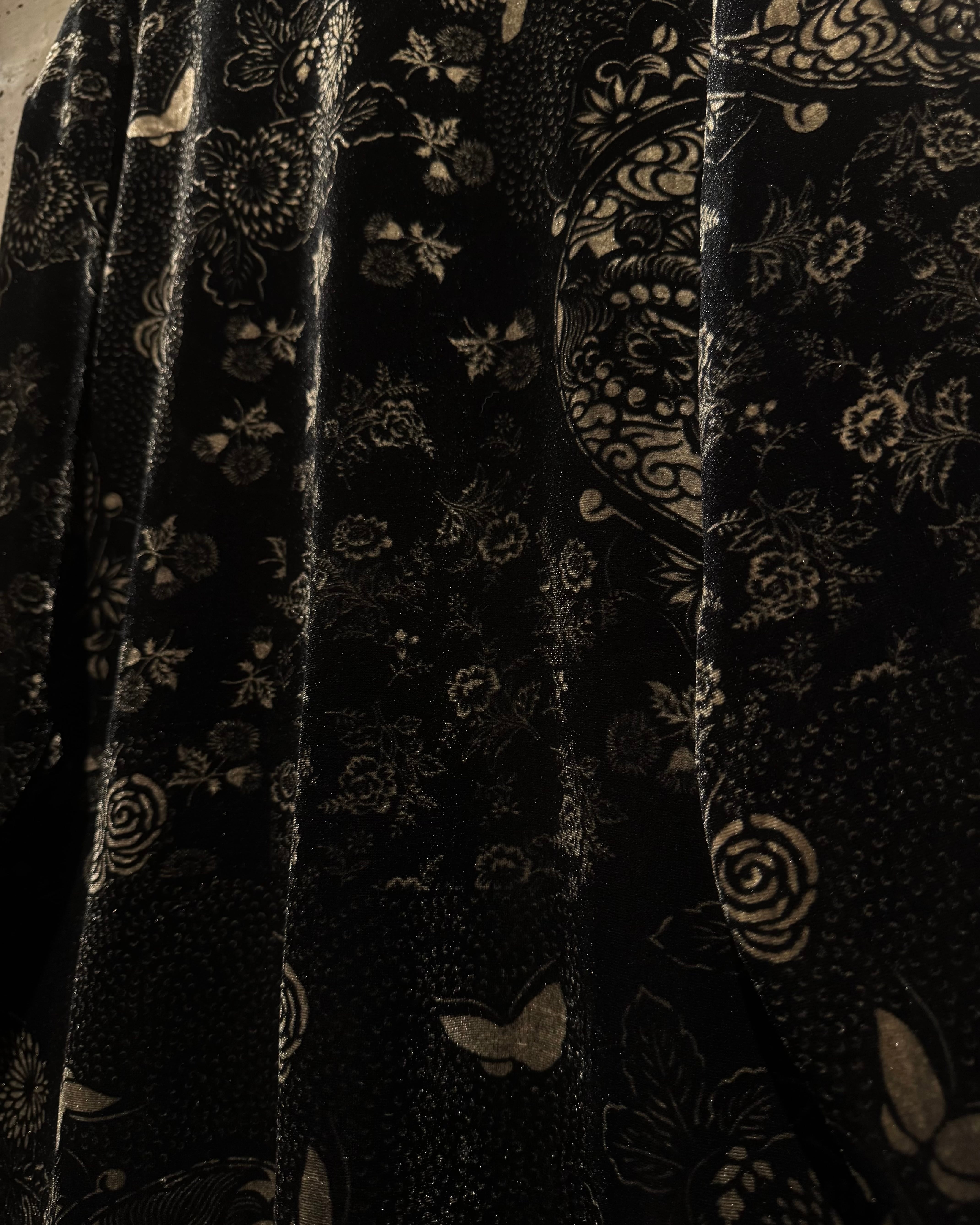 滑らかで光を含むようなベロア生地をベースに、花や蝶をモチーフとした繊細なデザインを全面に配置。ブラックトーンの中に浮かび上がる柄が奥行きを生み、ラグジュアリーで妖艶な雰囲気を纏っています。