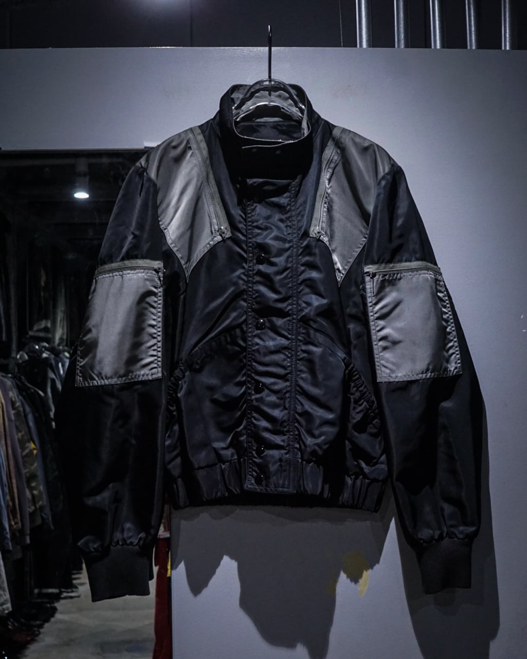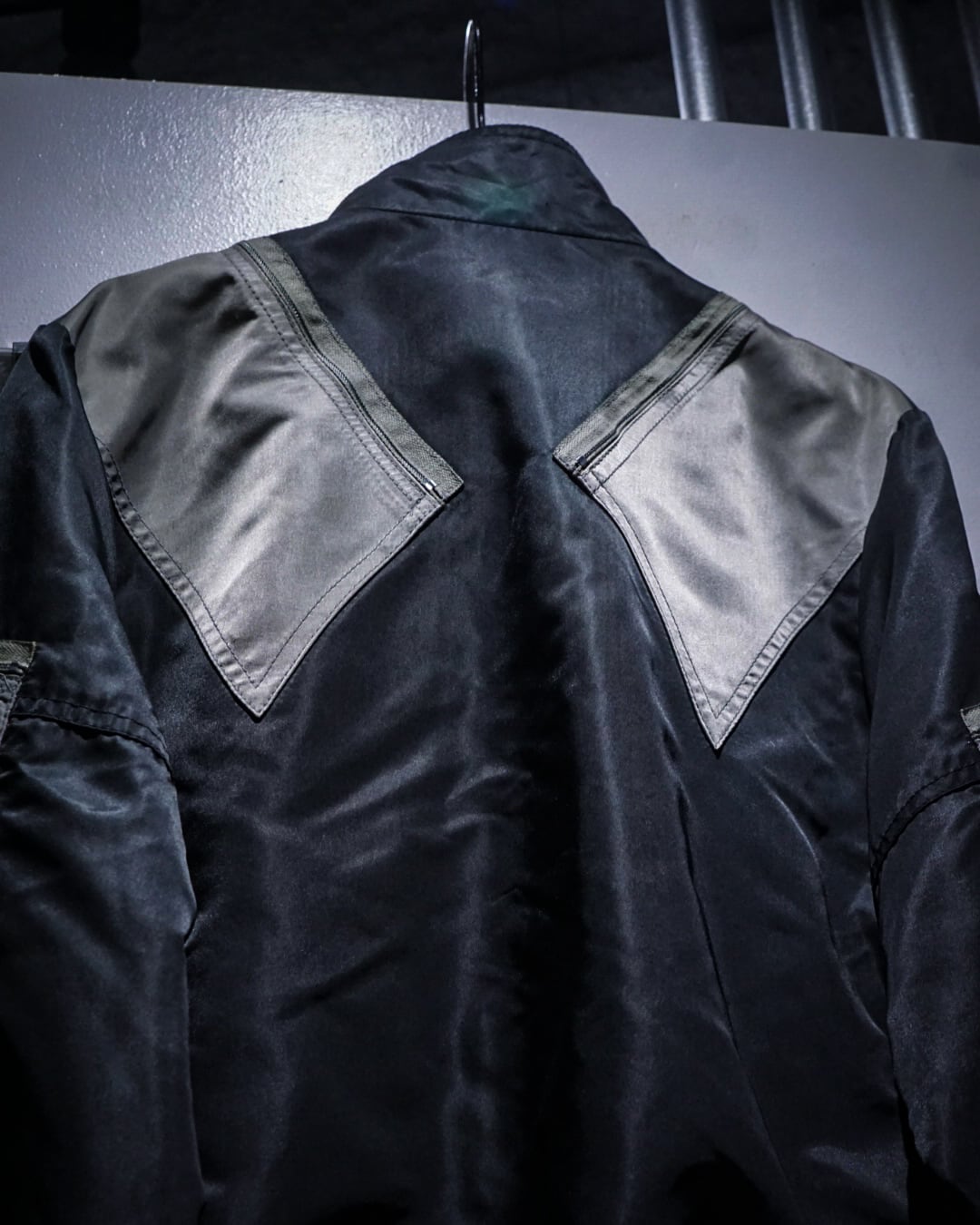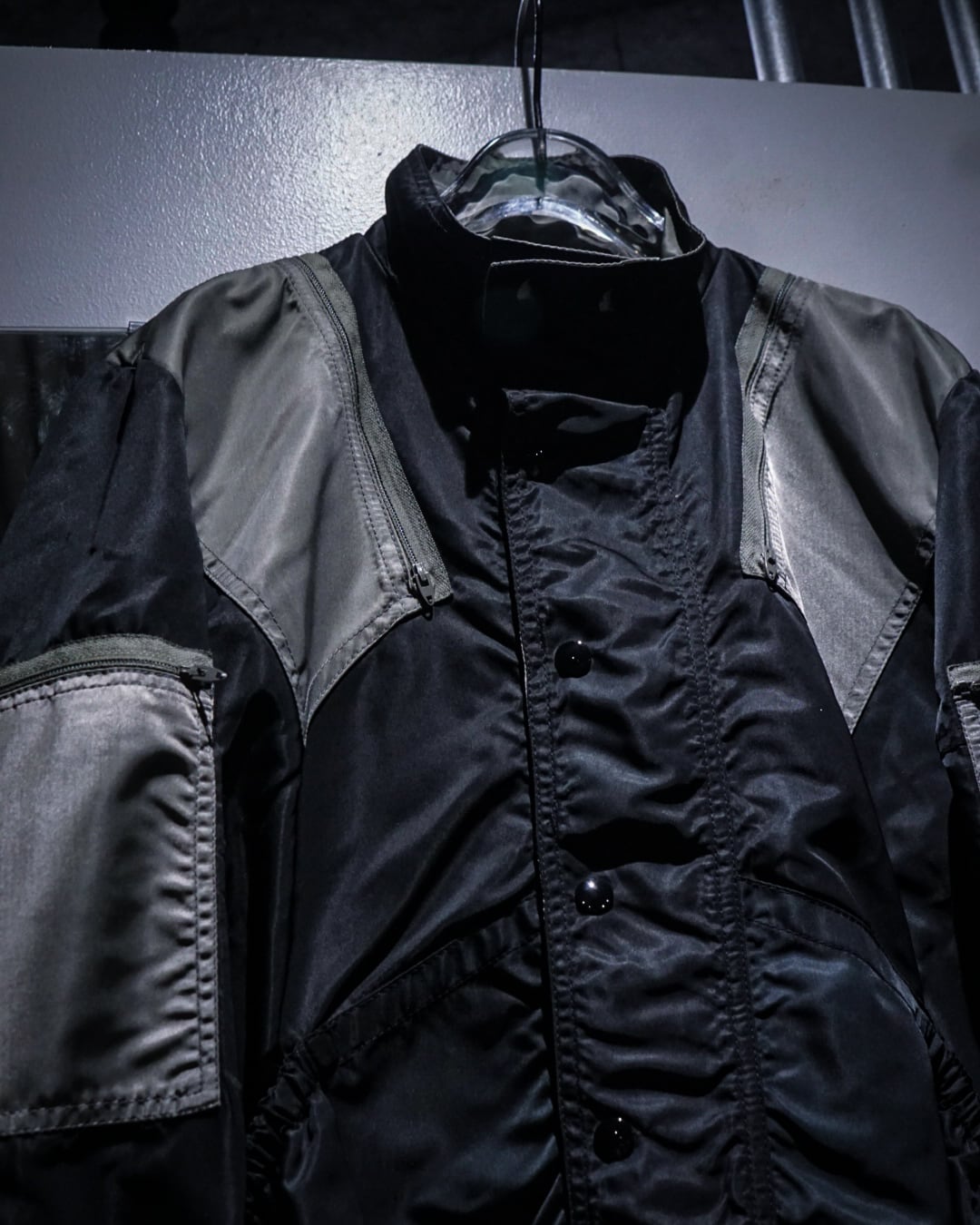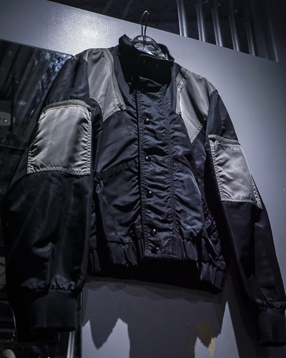 光沢を纏ったハリのある生地を用いて、当店らしいテクニカルなギミックを落とし込んだ稀有なバイカーギアジャケット。