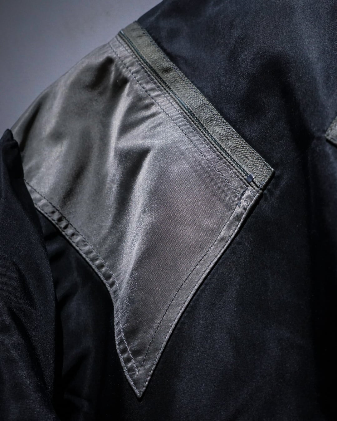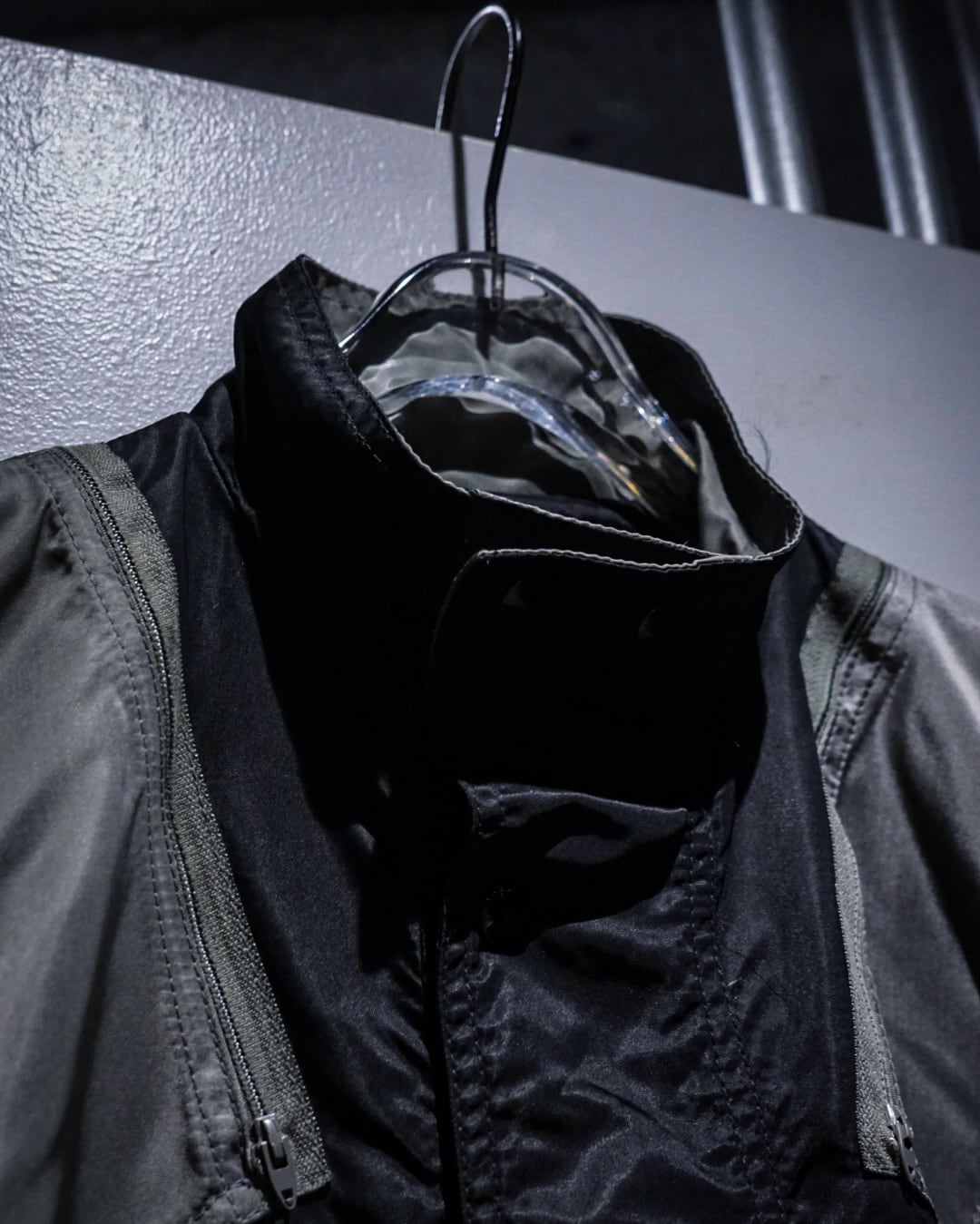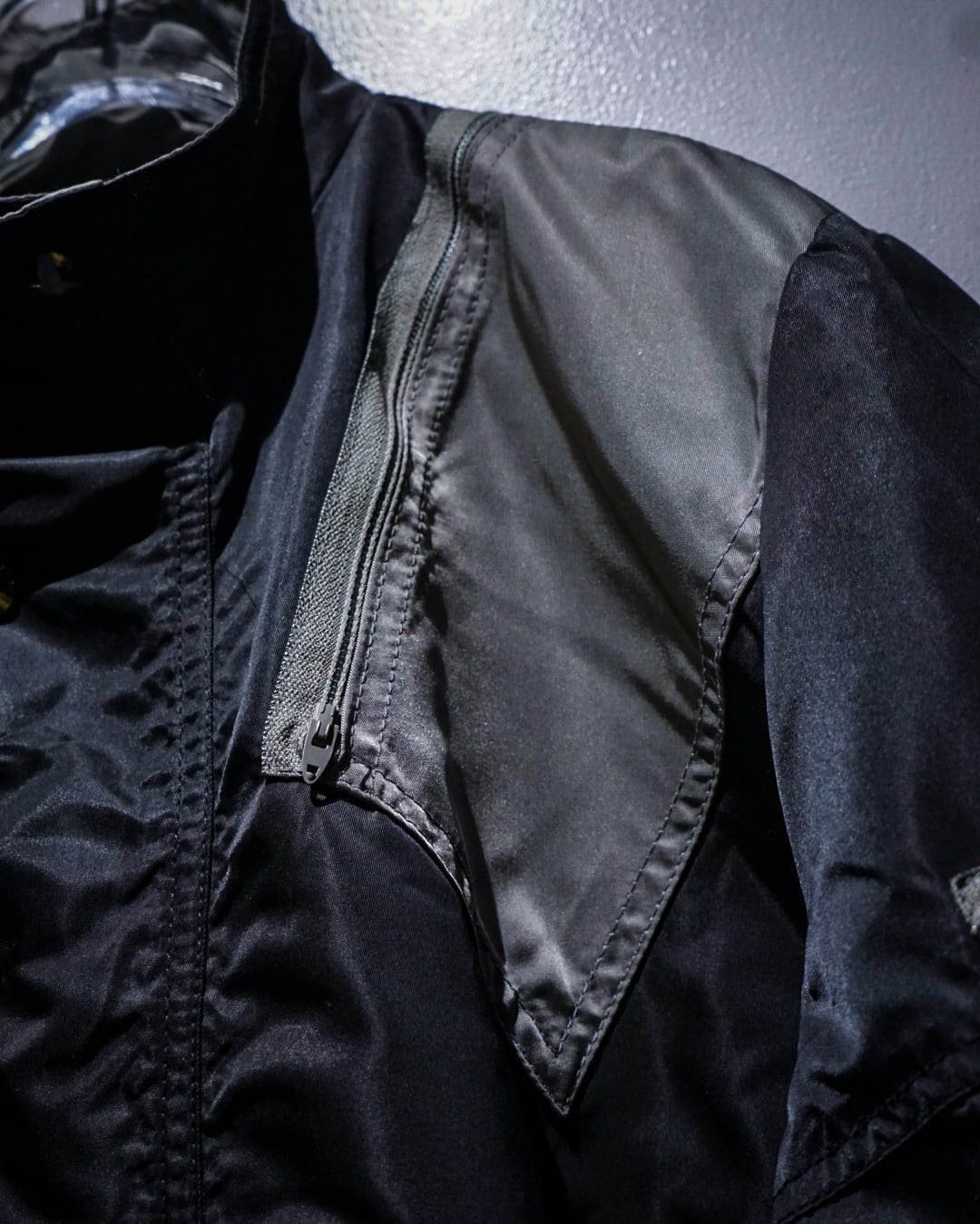 前たてはスナップボタンとジップの二重構造に首まで隠れるスタンドカラー仕様。テクニカルさがありながら、どこかモードなエッセンスを感じられます。