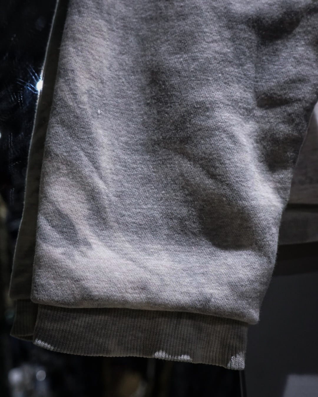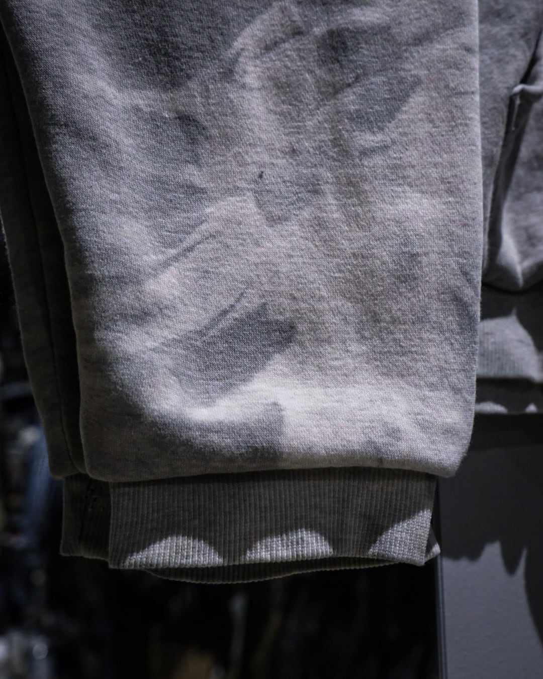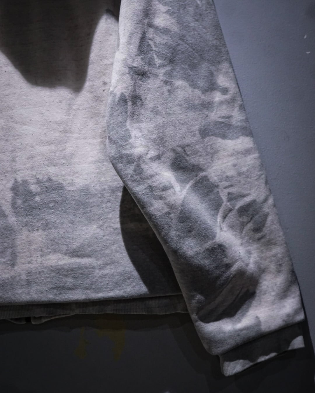 柔らかくも程よく肉感のあるコットンボディに、ムラ感のあるグレーベースの染めを施すことで、唯一無二な表情を持つ仕上がりに。滲みや陰影のバランス感が素晴らしく、シンプルながら強い存在感を放っています。