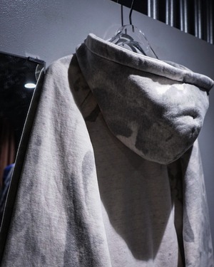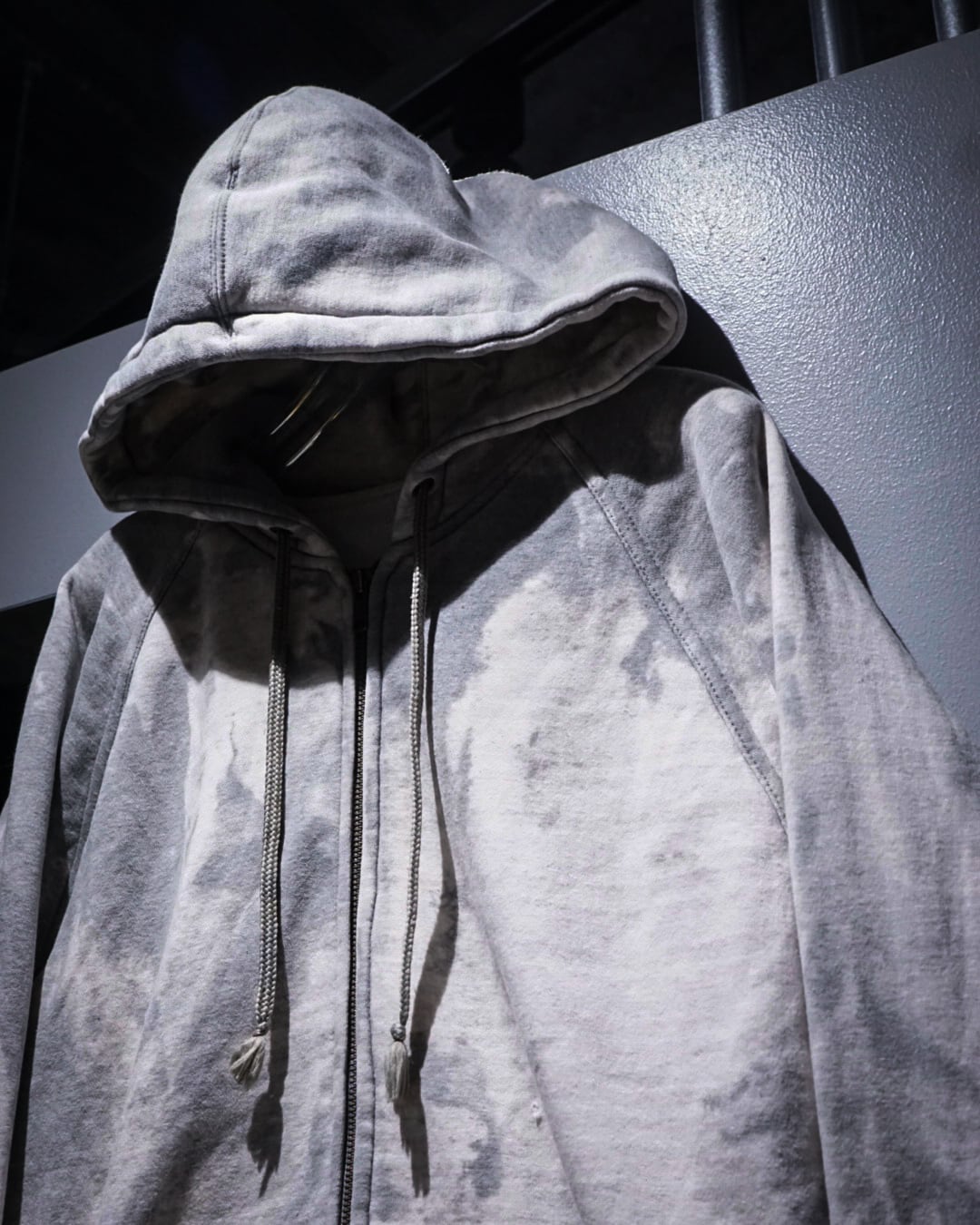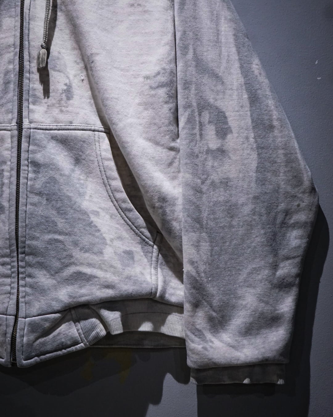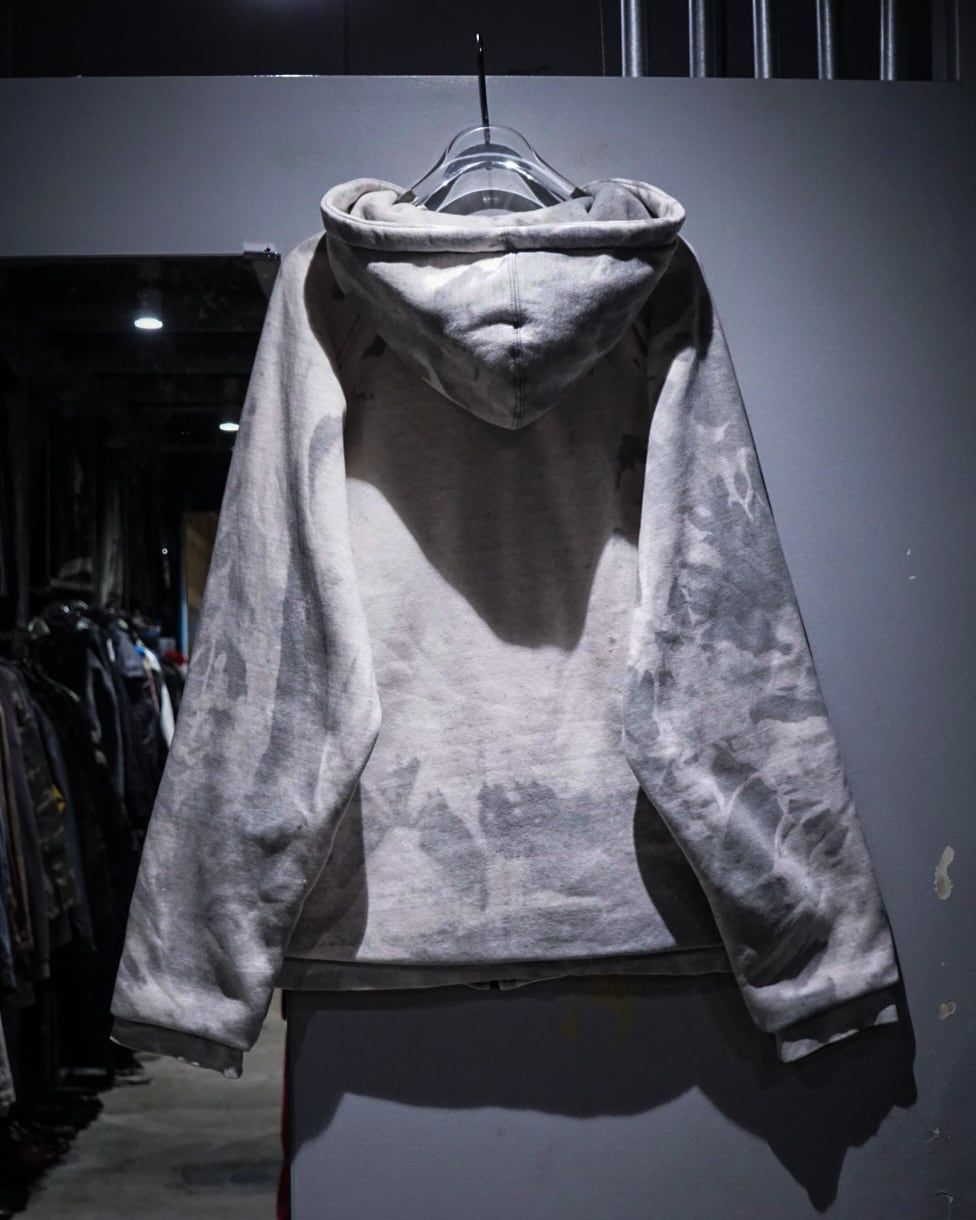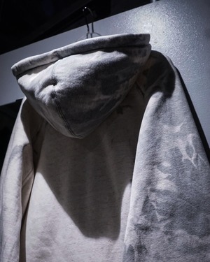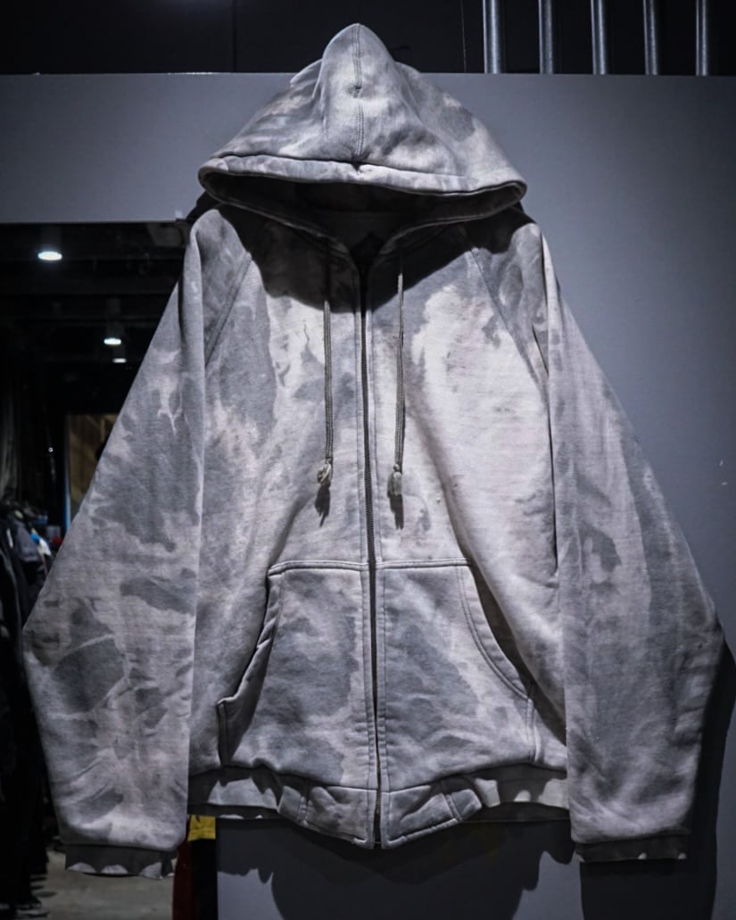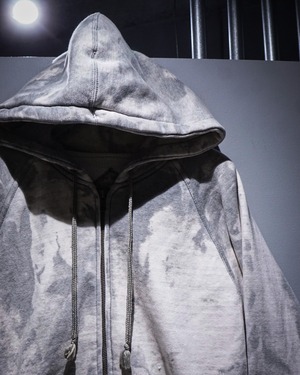 無機質な中にアート性を感じさせる、染めによる表情が際立つジップアップフーディ。