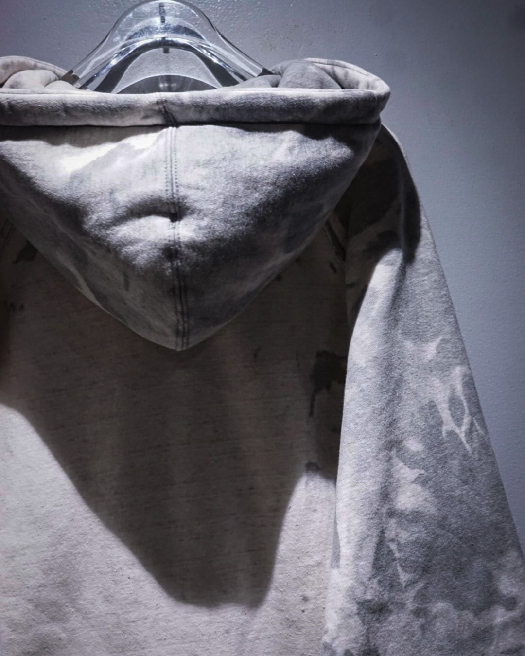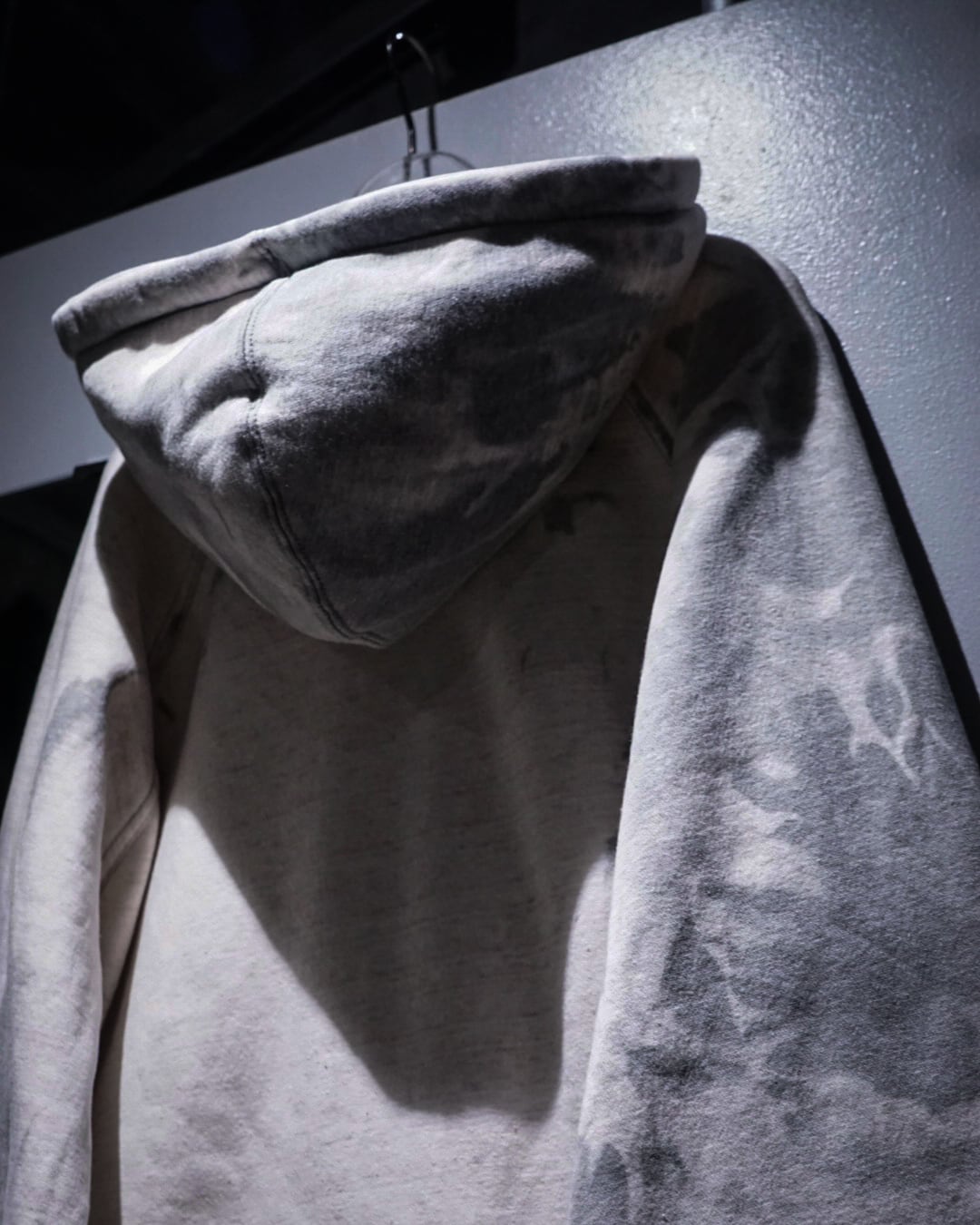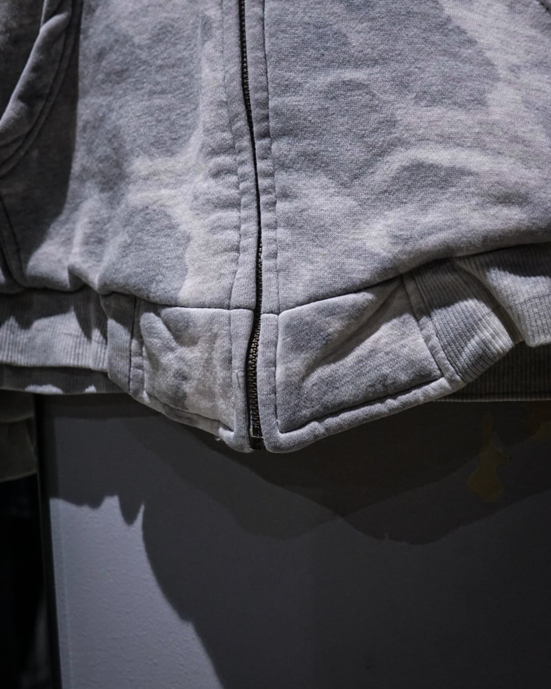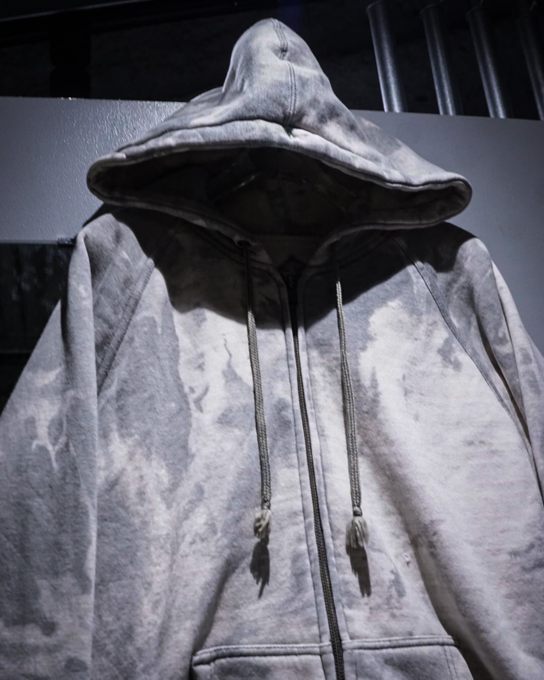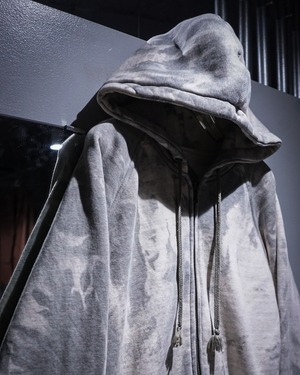 無機質な中にアート性を感じさせる、染めによる表情が際立つジップアップフーディ。