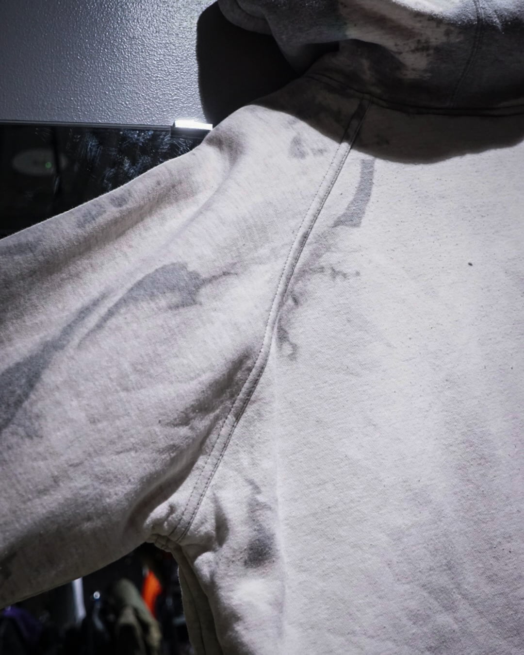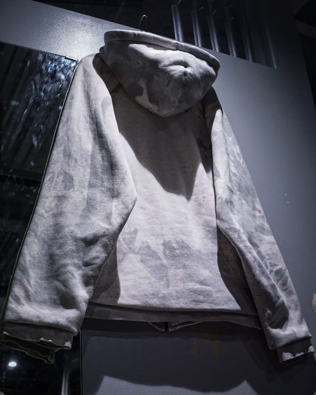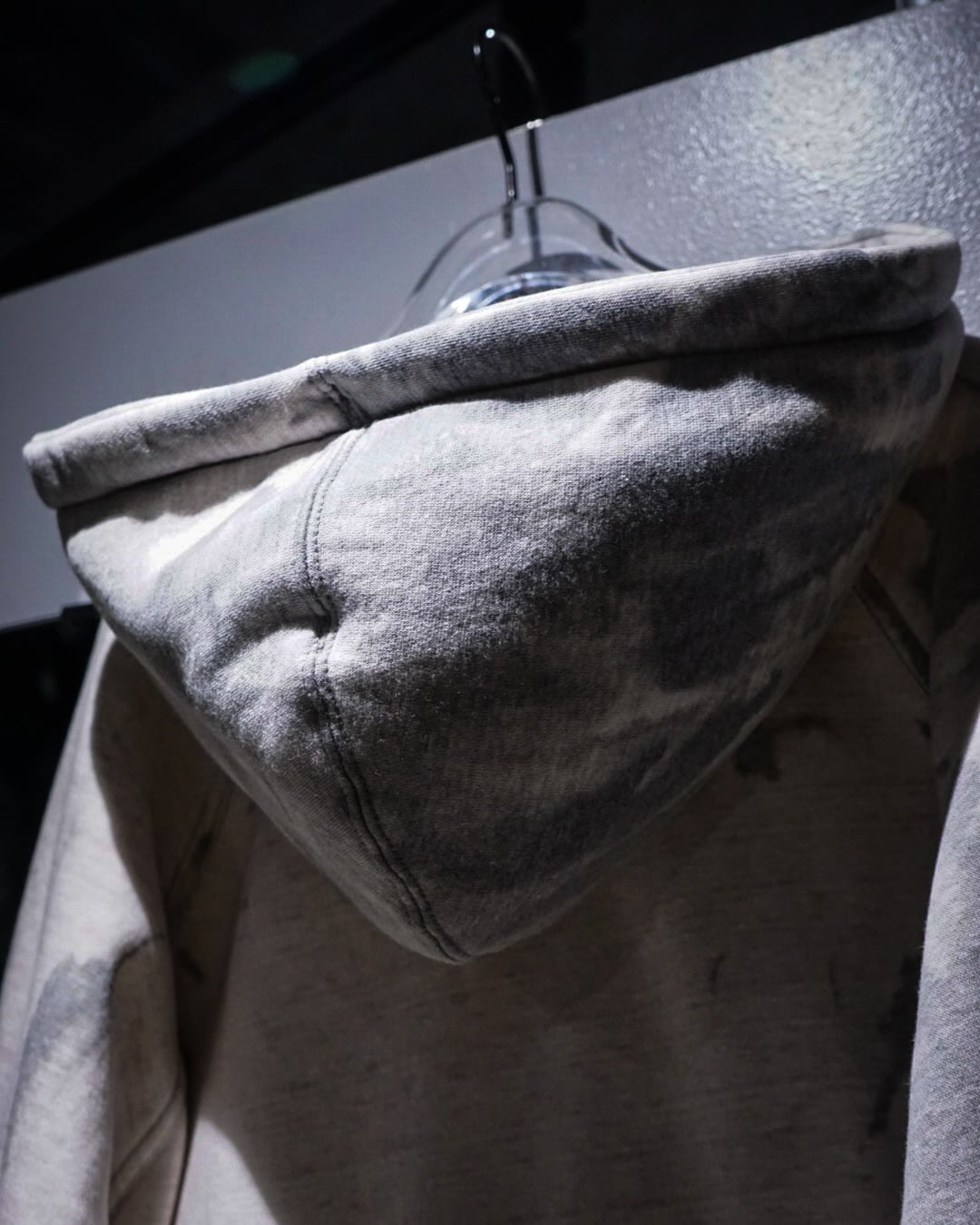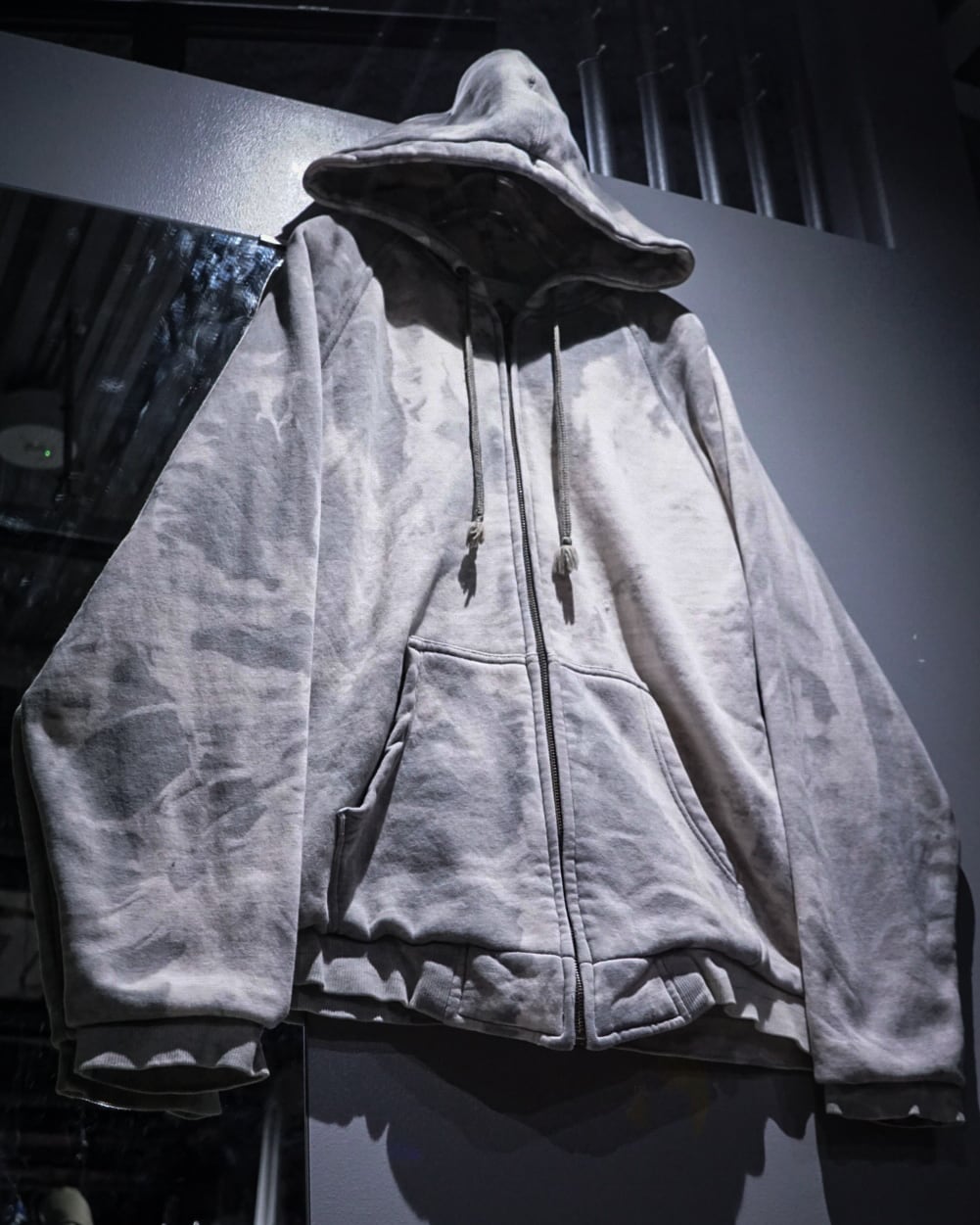 無機質な中にアート性を感じさせる、染めによる表情が際立つジップアップフーディ。