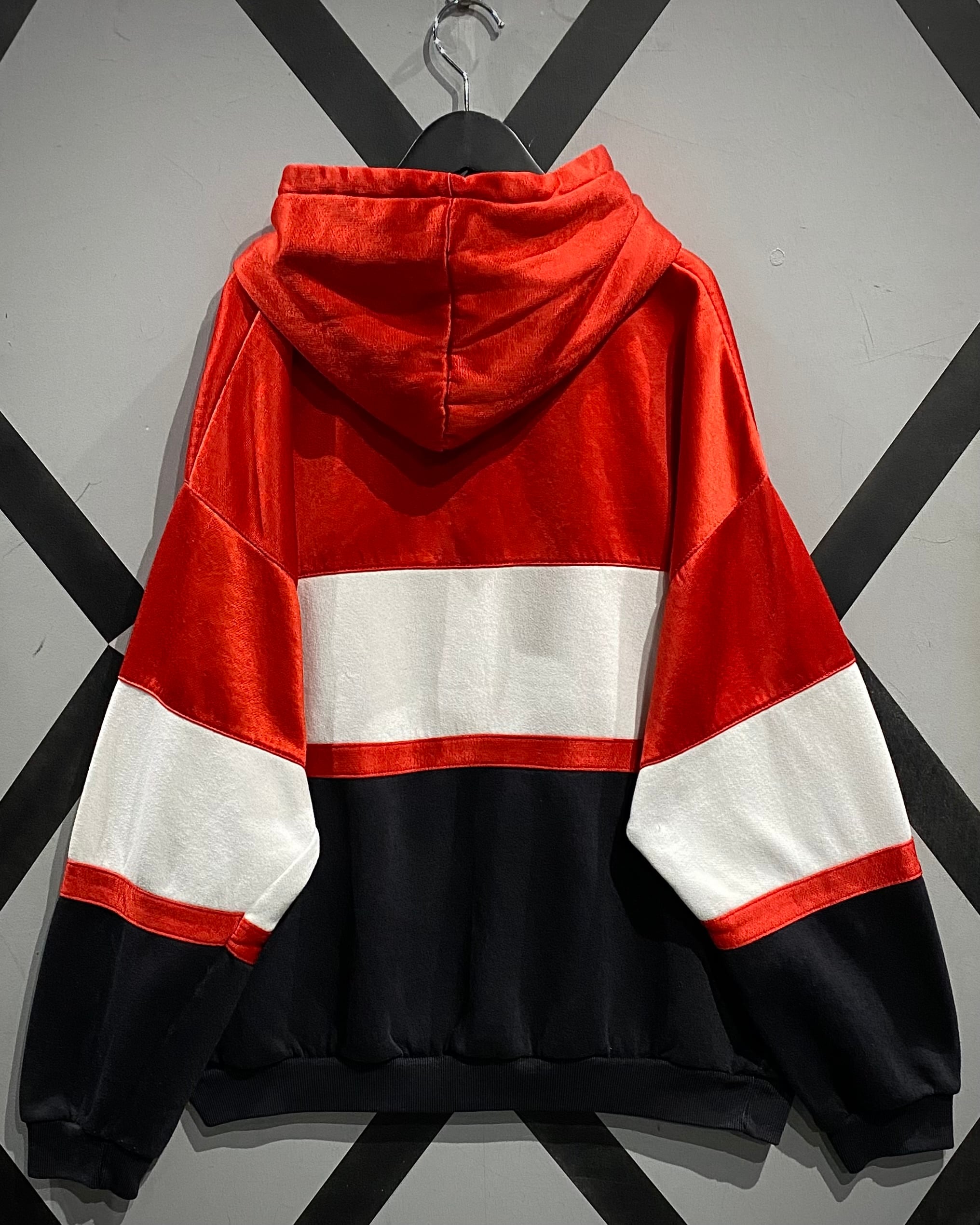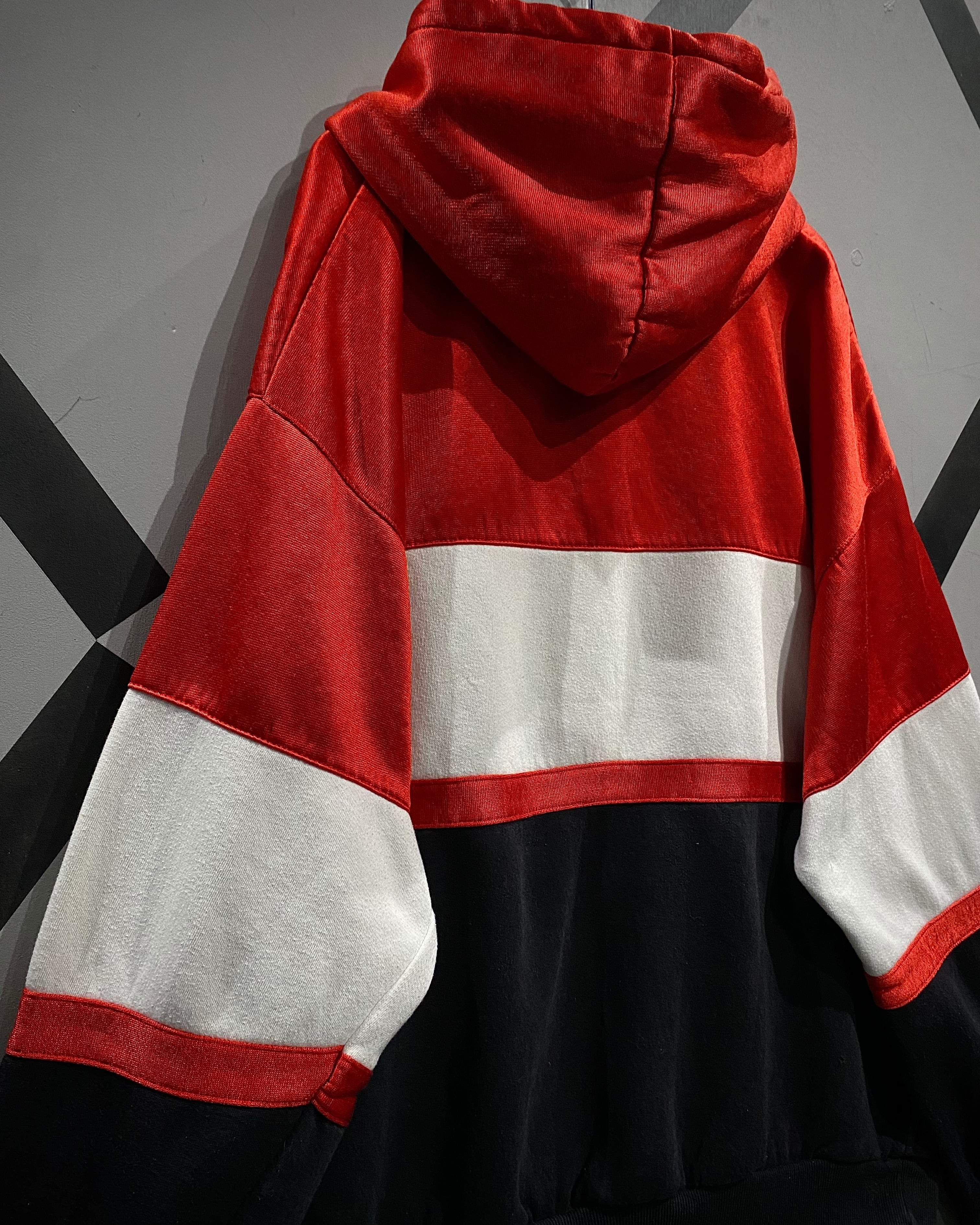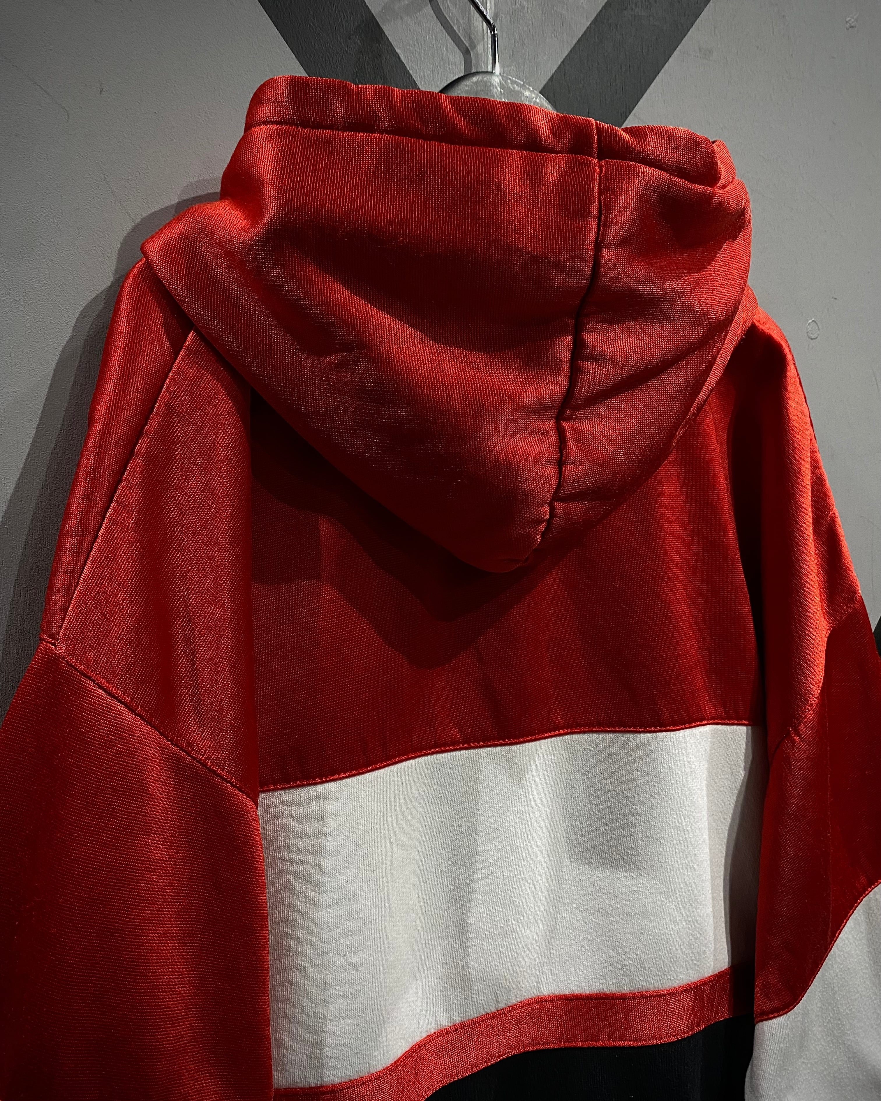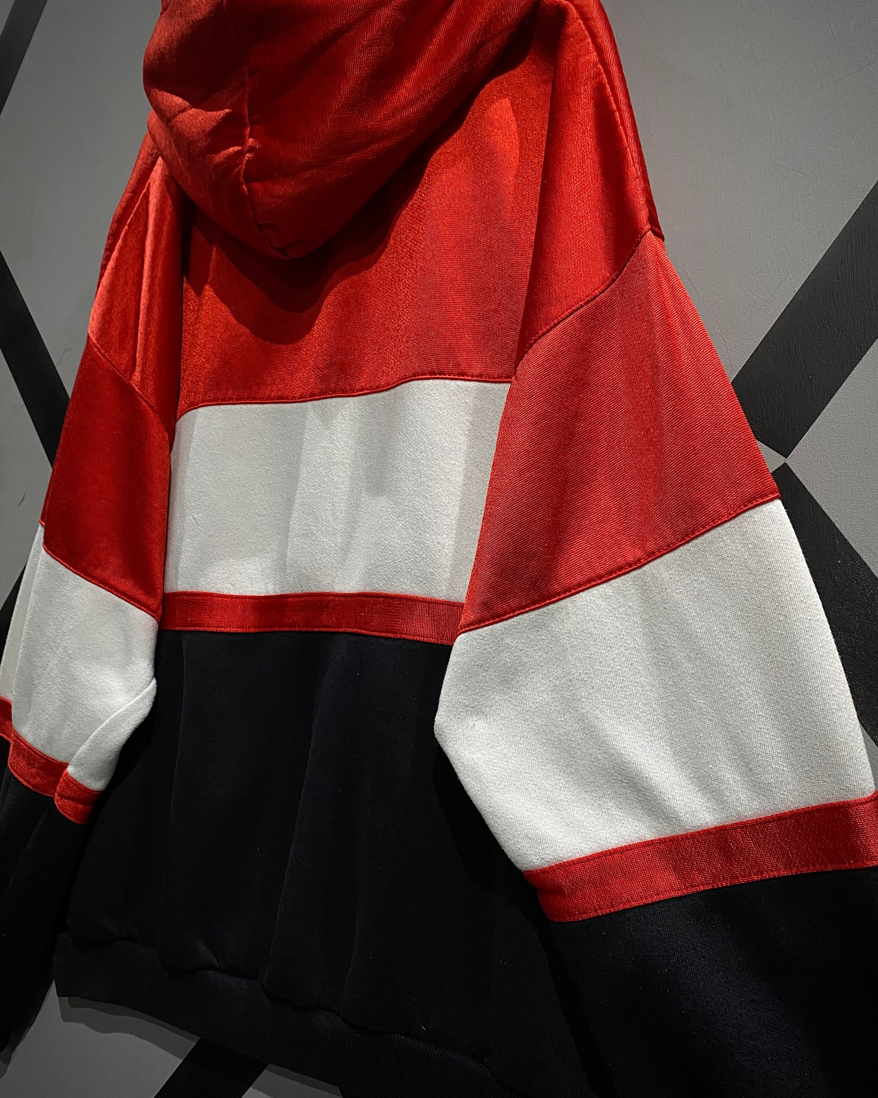 ブラック×ホワイト×レッドの大胆なカラーブロッキングが目を惹く1着。ブラックとホワイト部分には柔らかなスウェット生地を、レッド部分には滑らかでやや光沢のあるジャージ素材を採用し、ブランドならではのデザインアプローチが光ります。