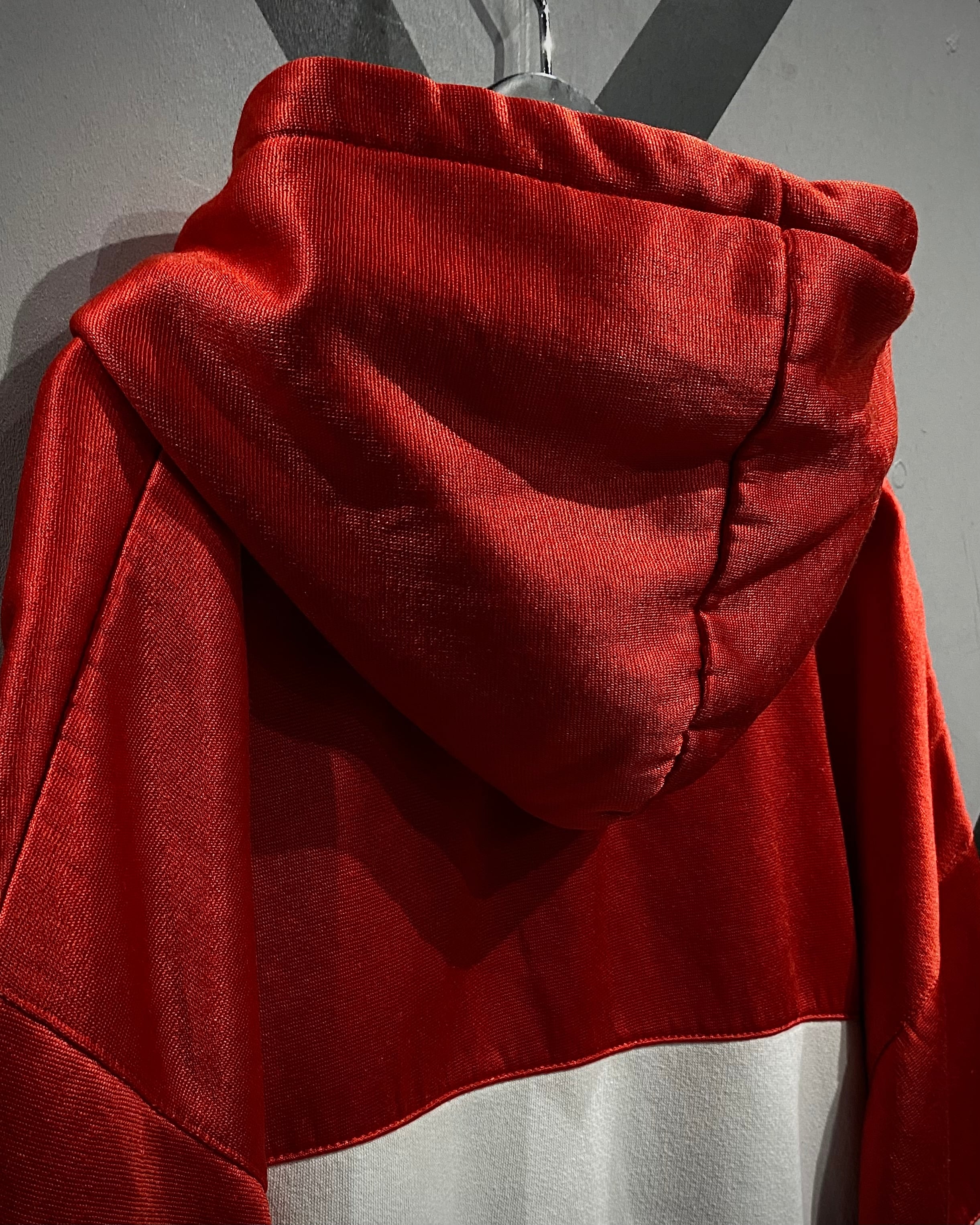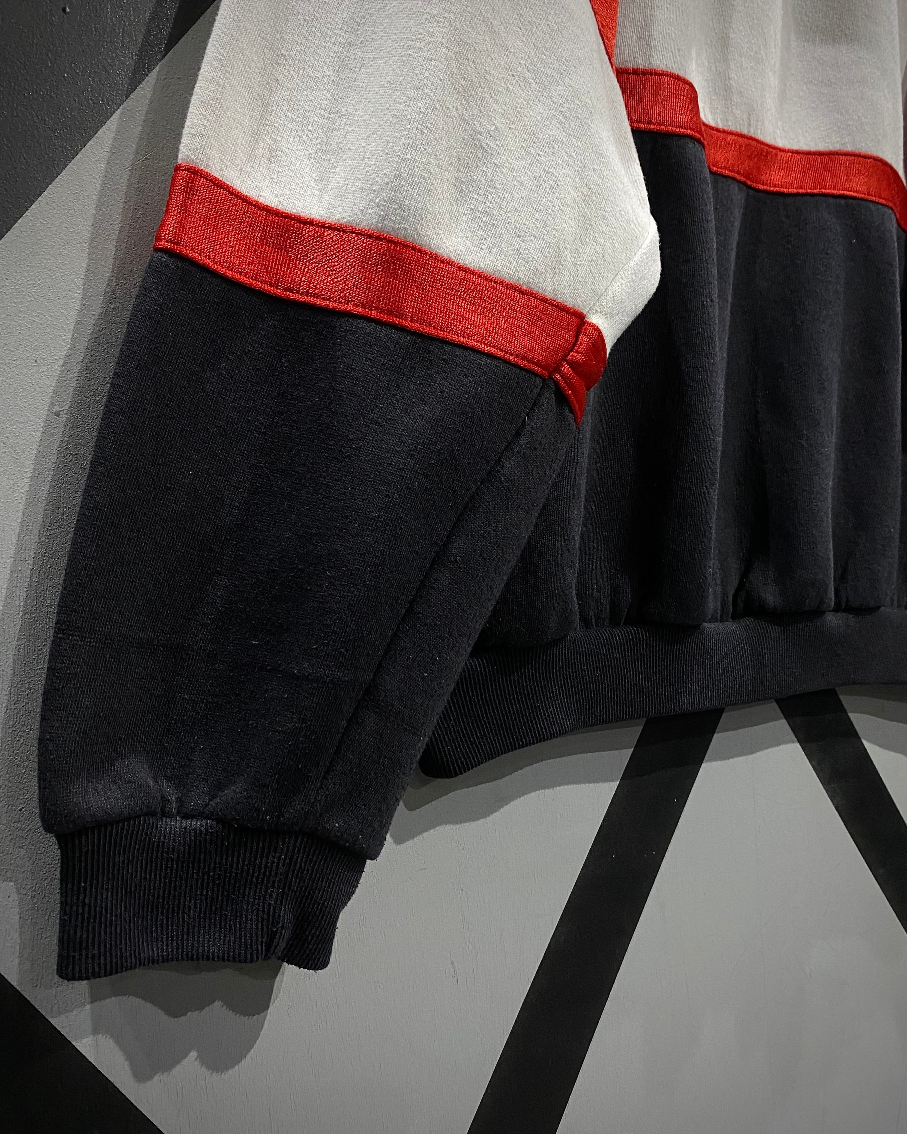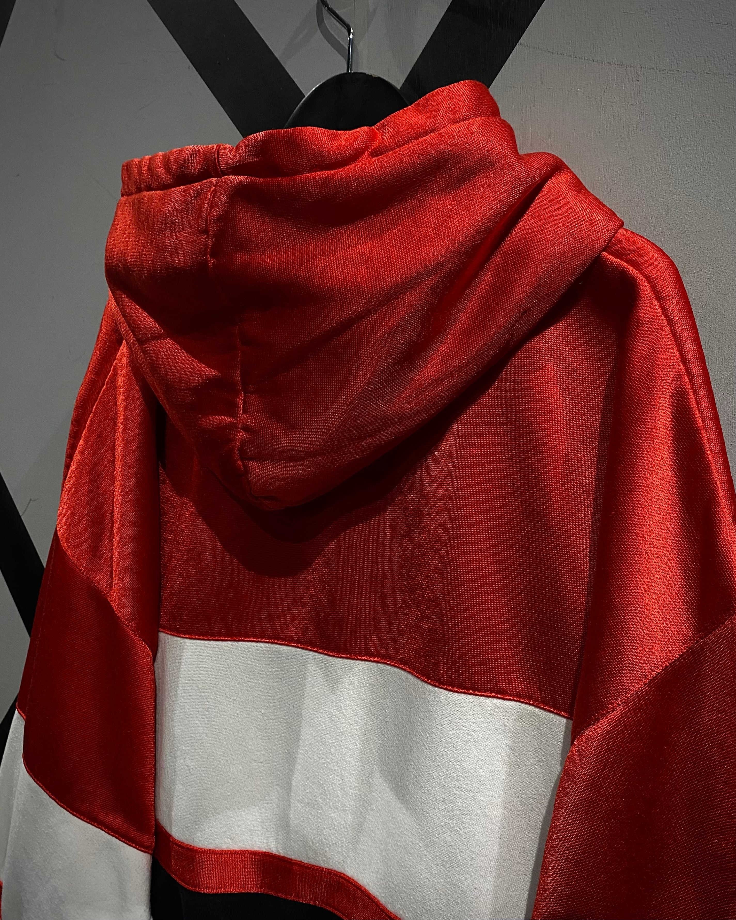 ブラック×ホワイト×レッドの大胆なカラーブロッキングが目を惹く1着。ブラックとホワイト部分には柔らかなスウェット生地を、レッド部分には滑らかでやや光沢のあるジャージ素材を採用し、ブランドならではのデザインアプローチが光ります。