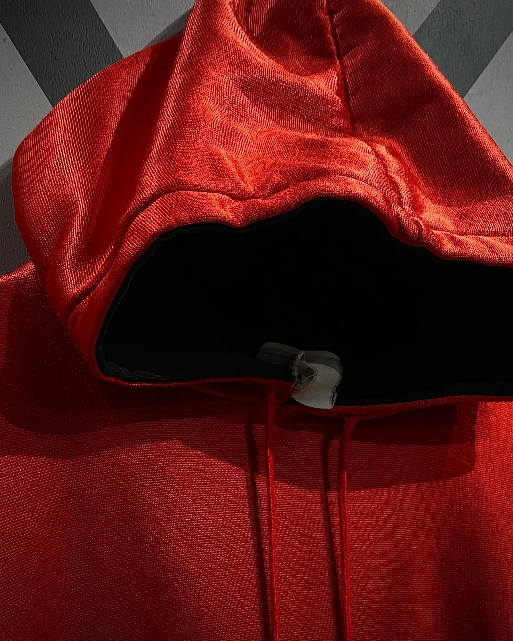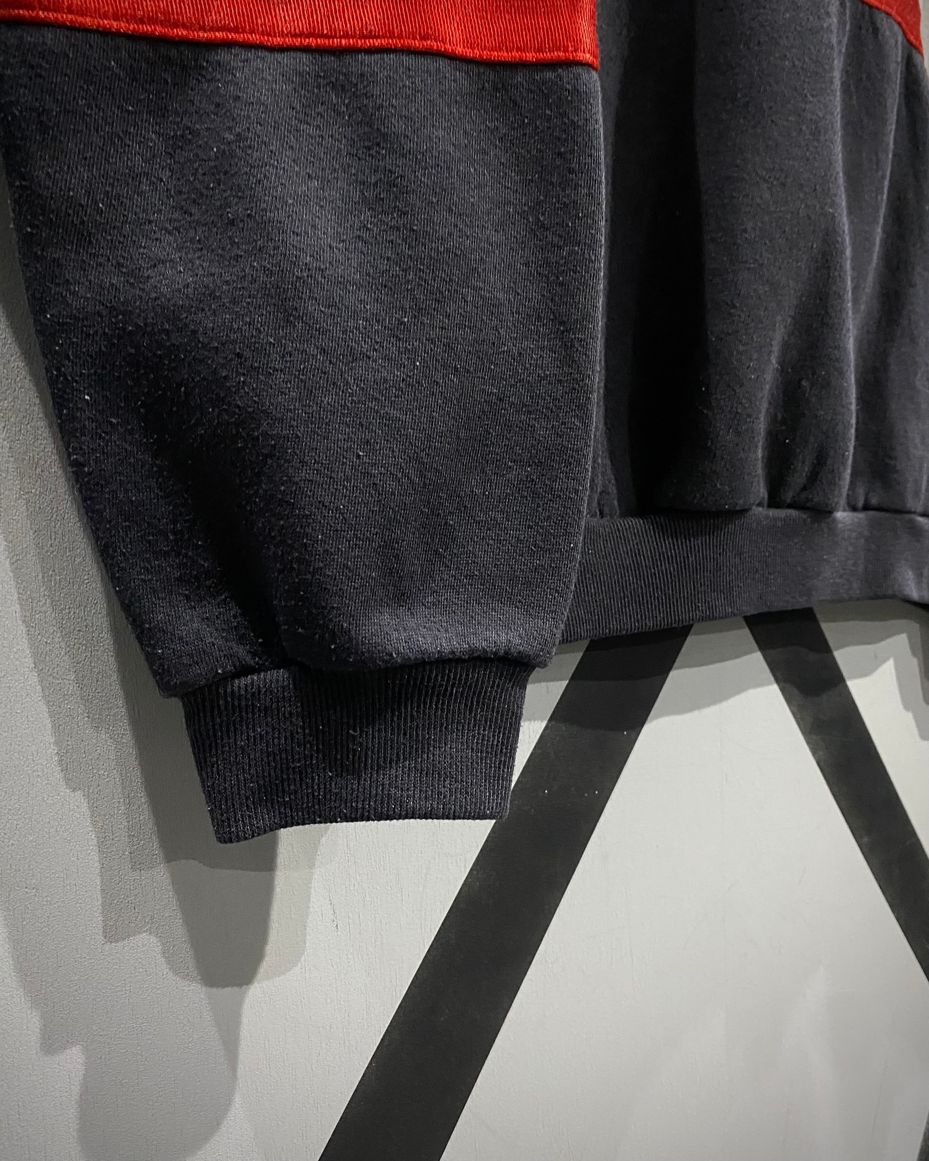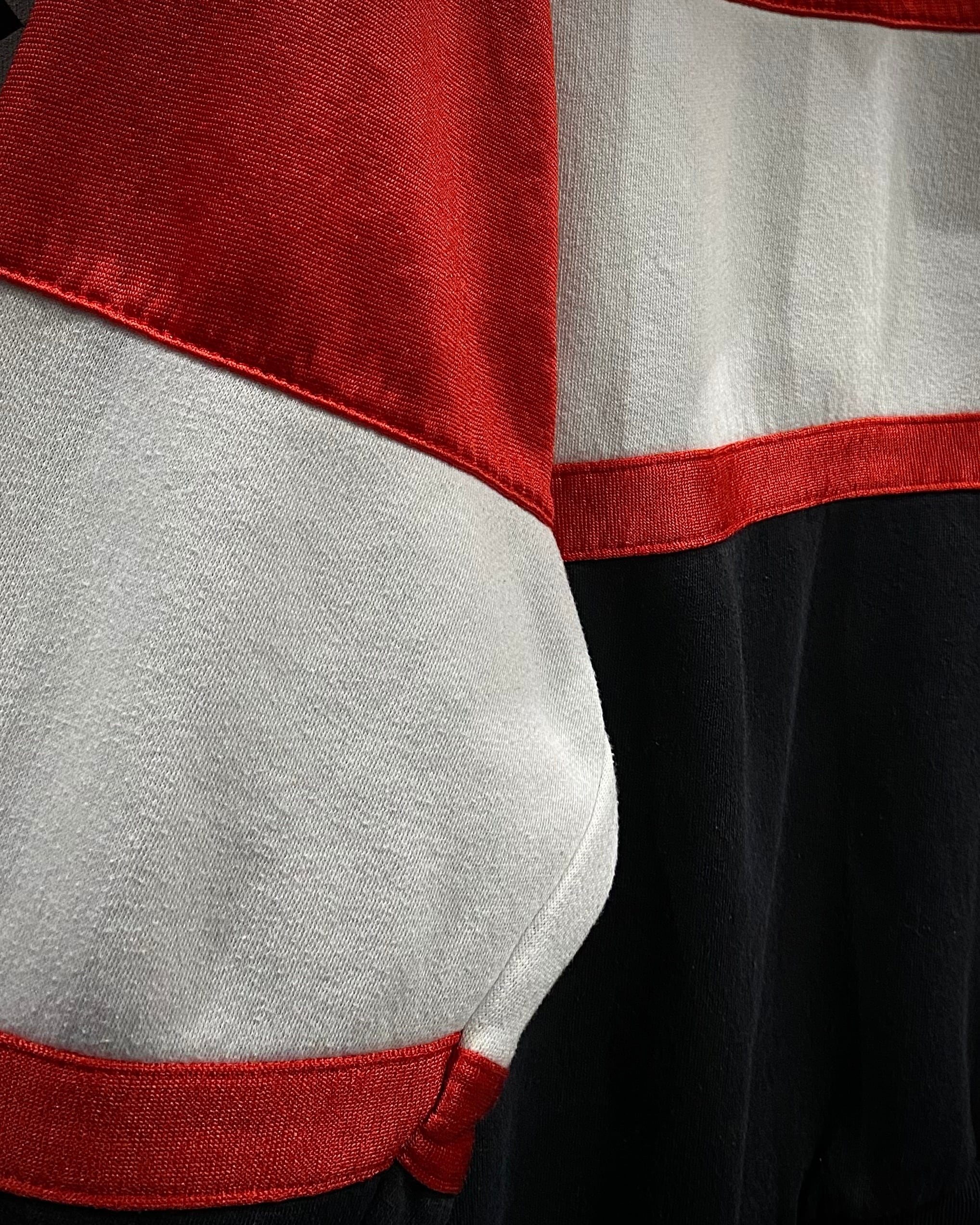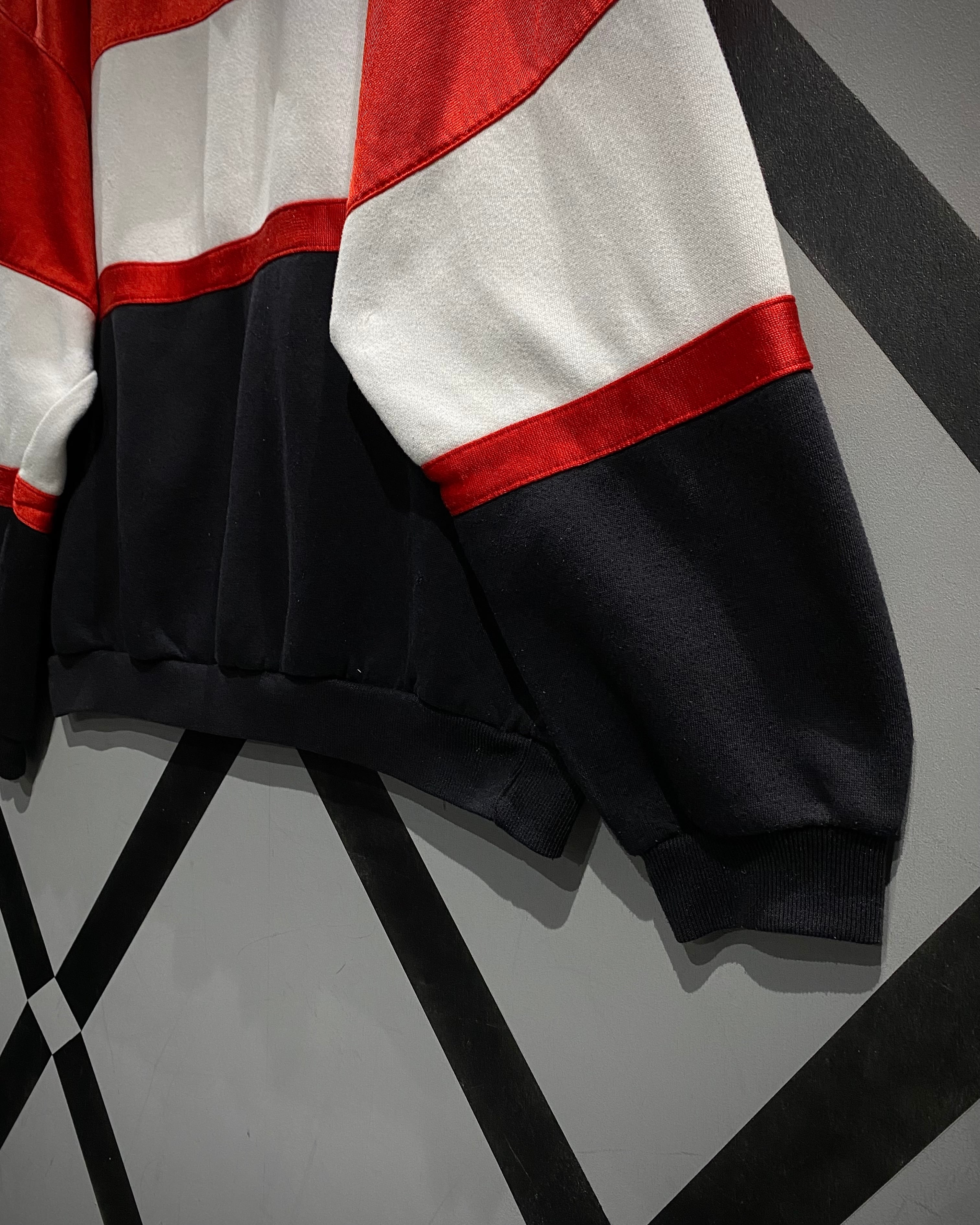 ブラック×ホワイト×レッドの大胆なカラーブロッキングが目を惹く1着。ブラックとホワイト部分には柔らかなスウェット生地を、レッド部分には滑らかでやや光沢のあるジャージ素材を採用し、ブランドならではのデザインアプローチが光ります。