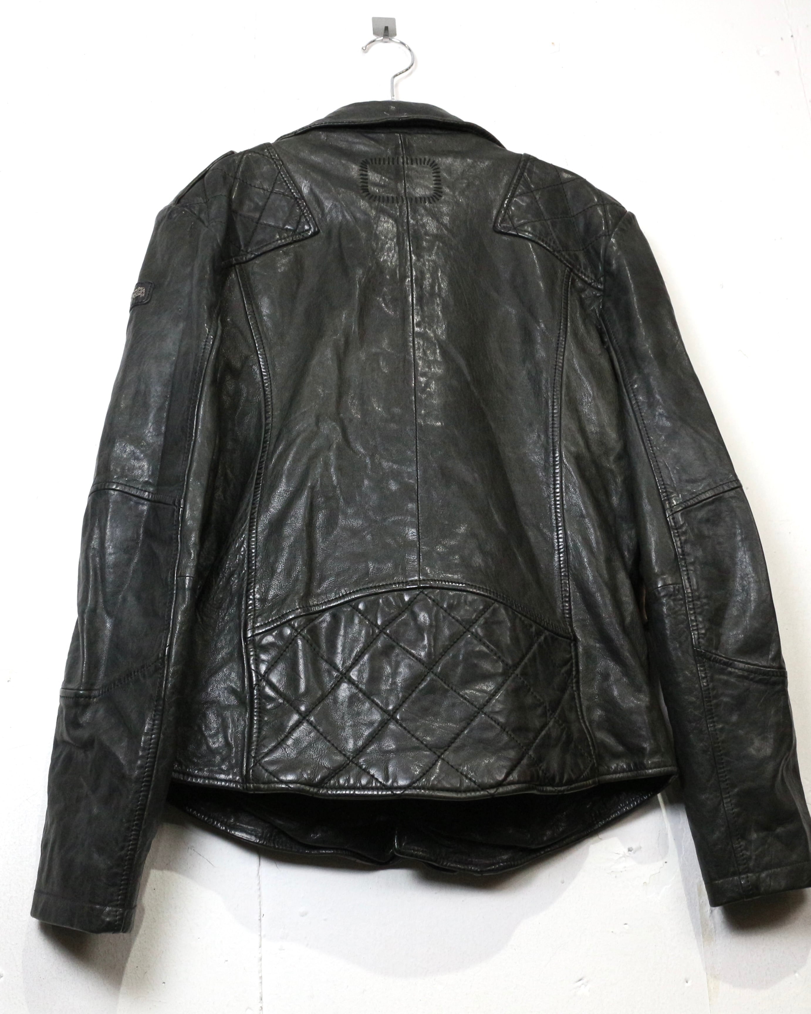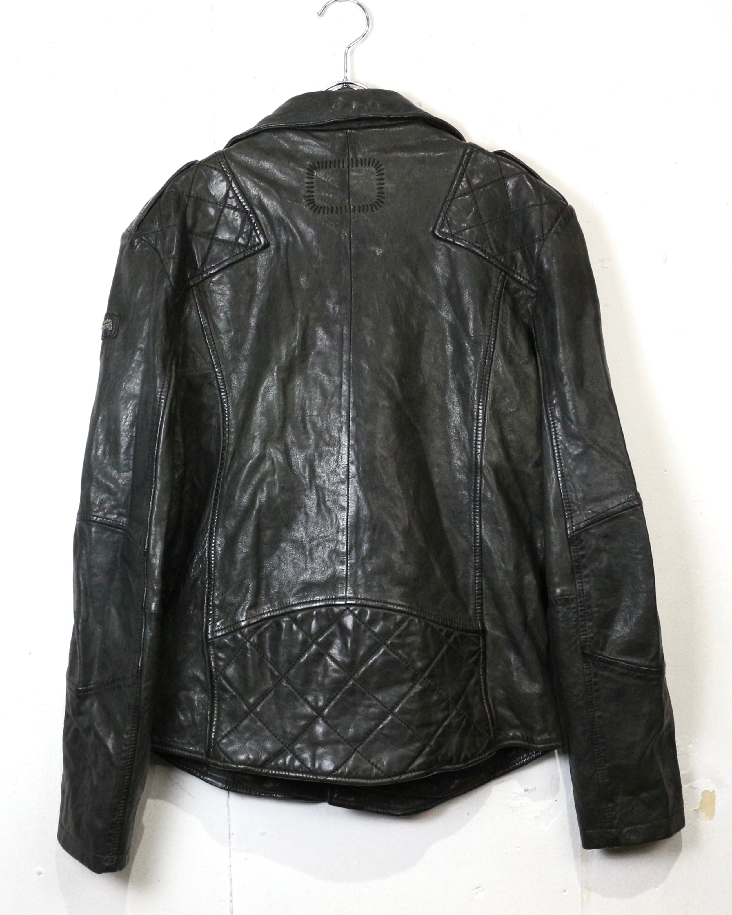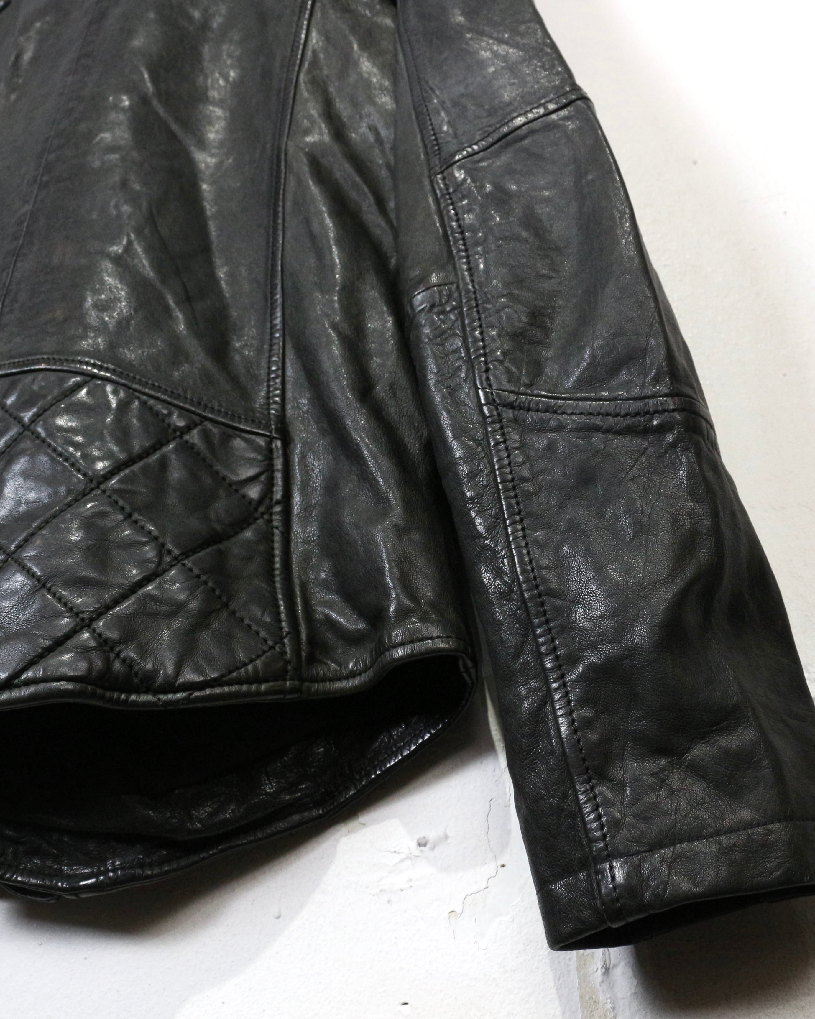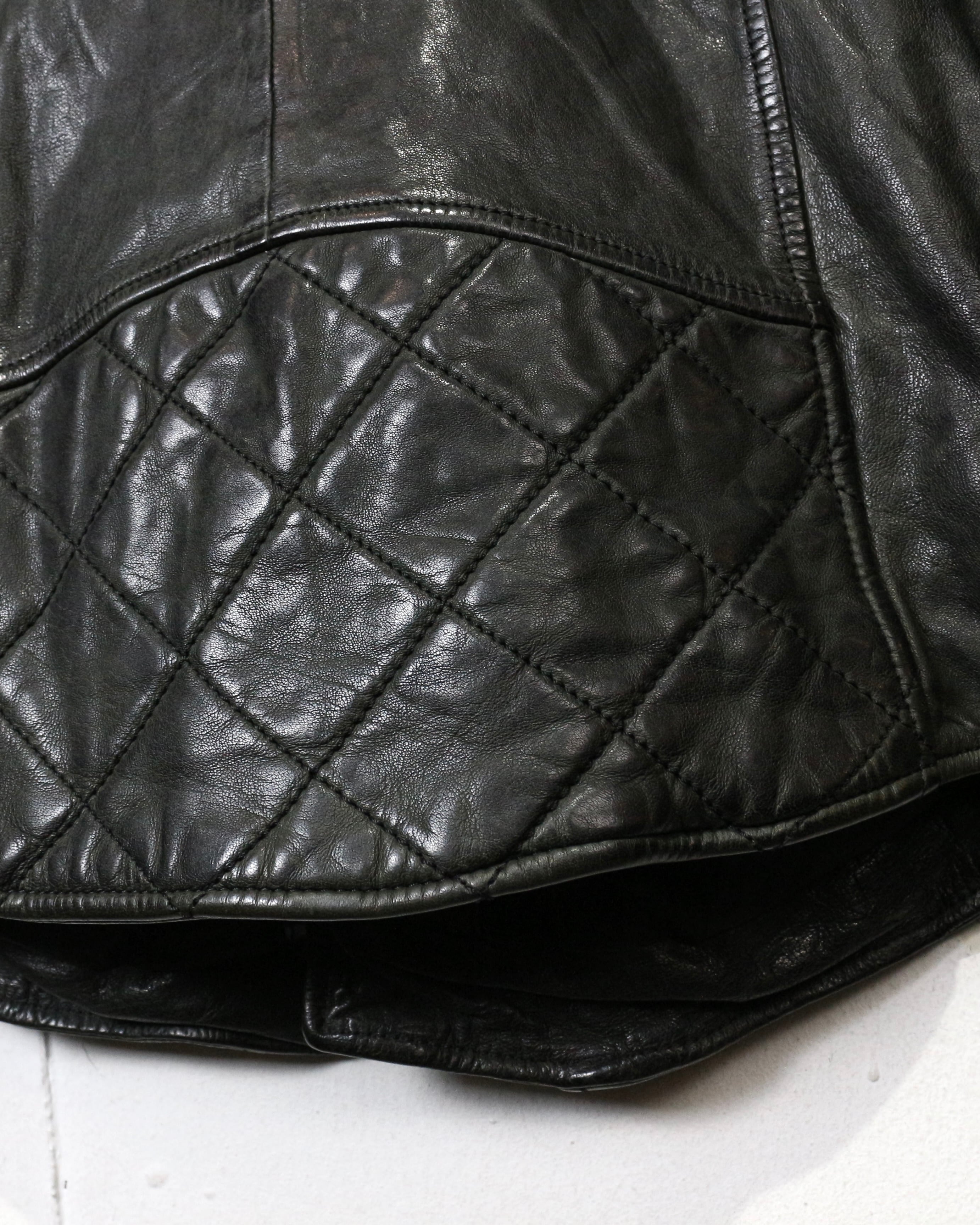 フロントは王道のダブル仕様。ラペルやジップ配置といったクラシックなディテールに加え、ショルダー部分と裾にはキルティングを施すことで、タフさとデザイン性をプラス。どこかモードなニュアンスを感じさせる仕上がりです。