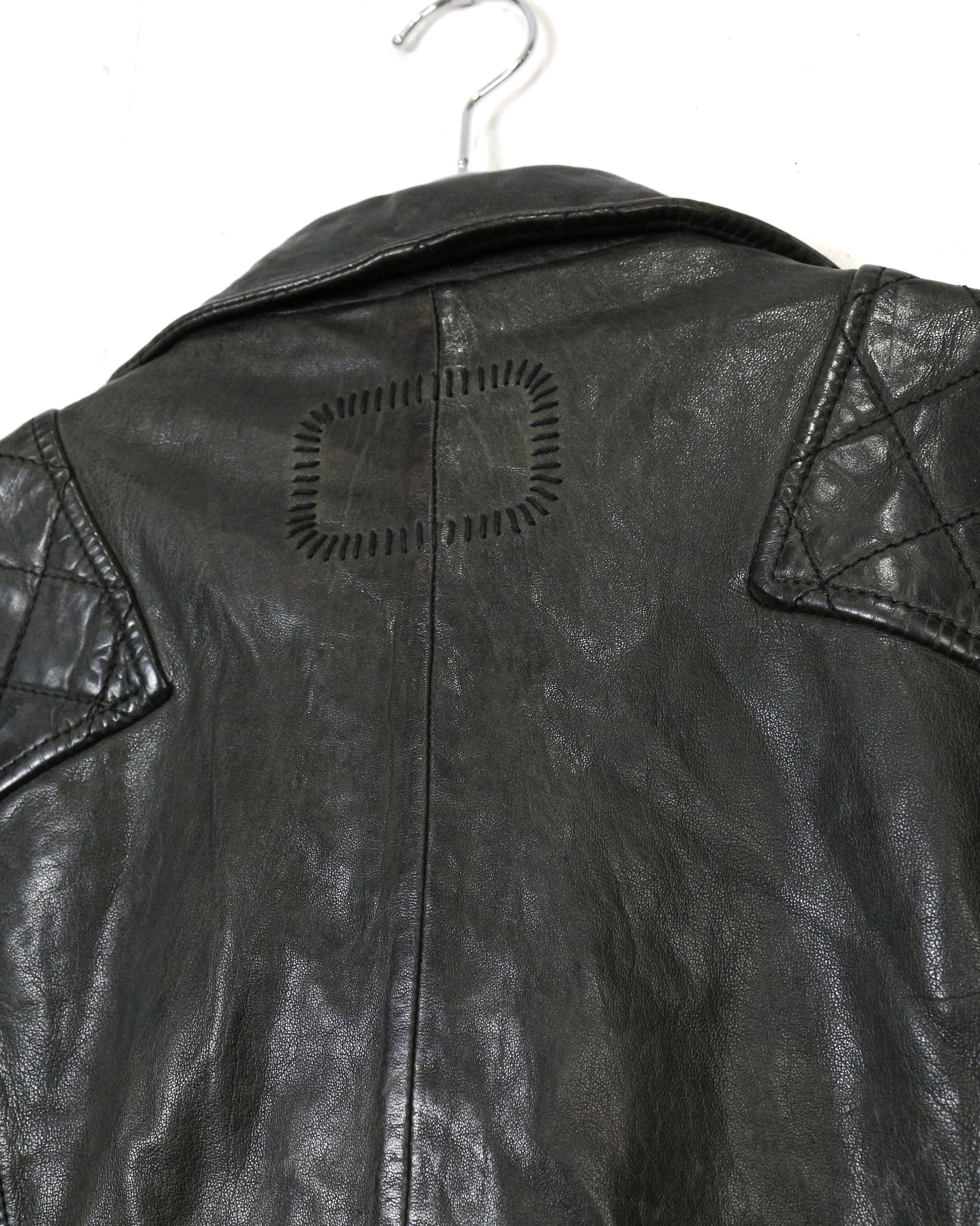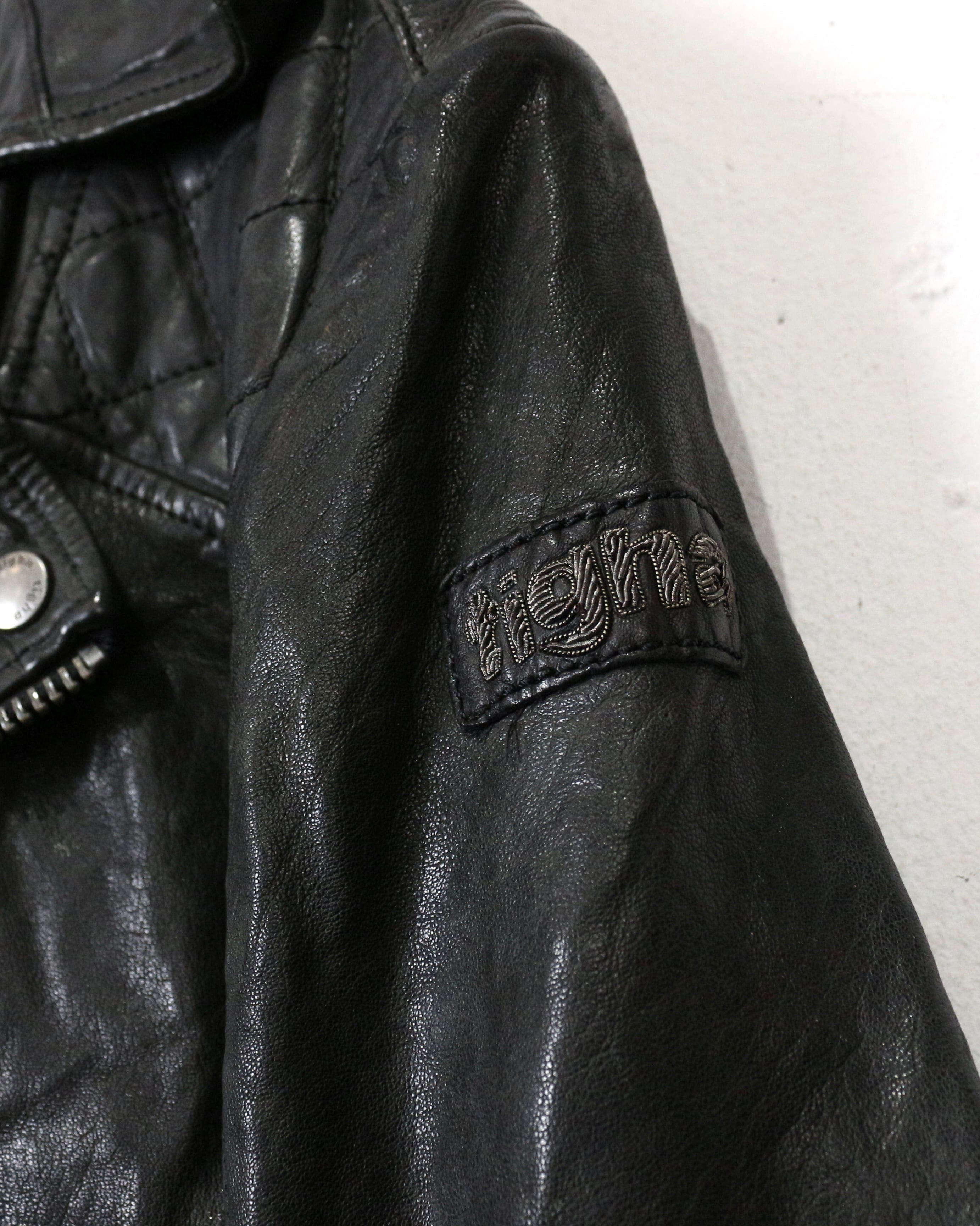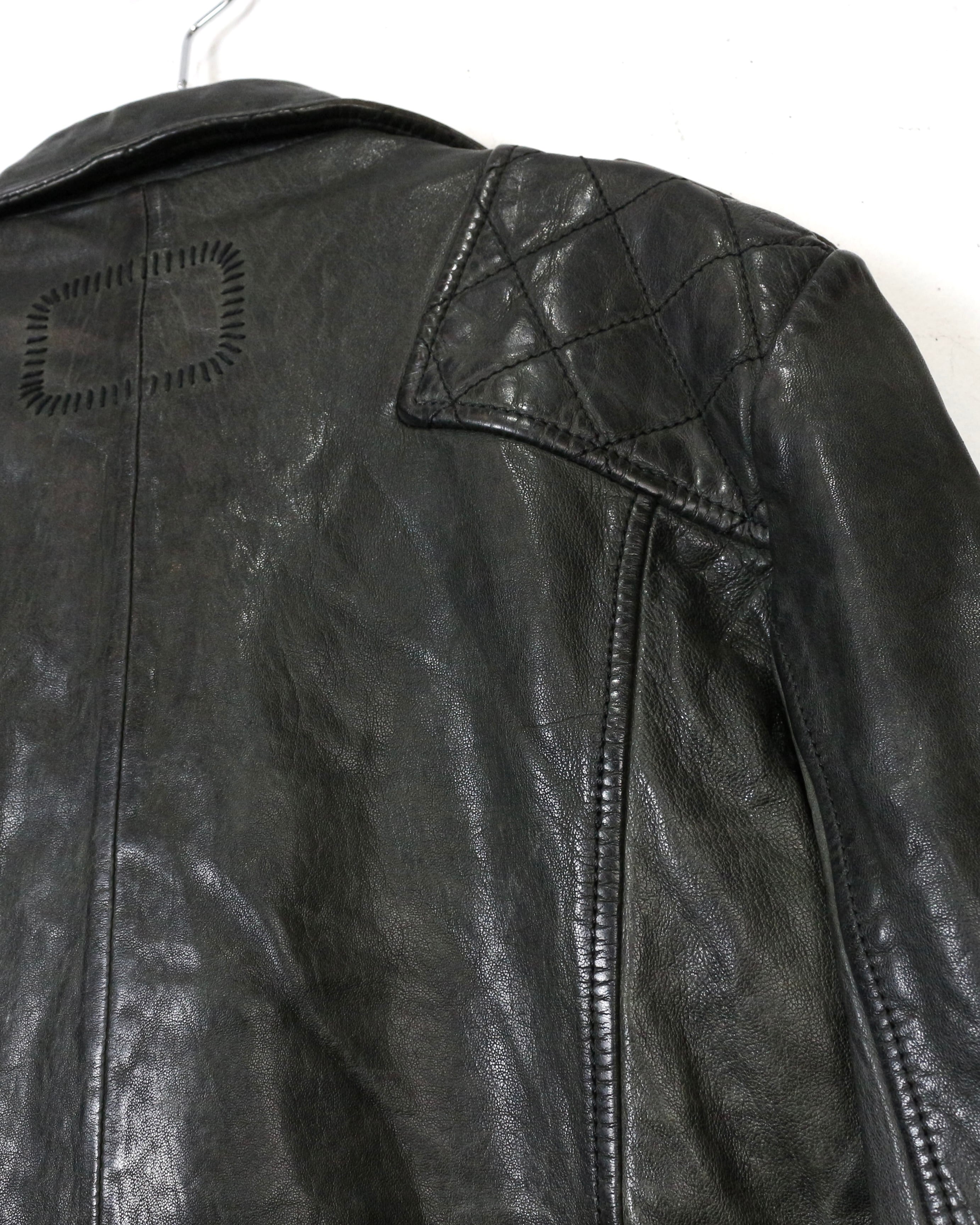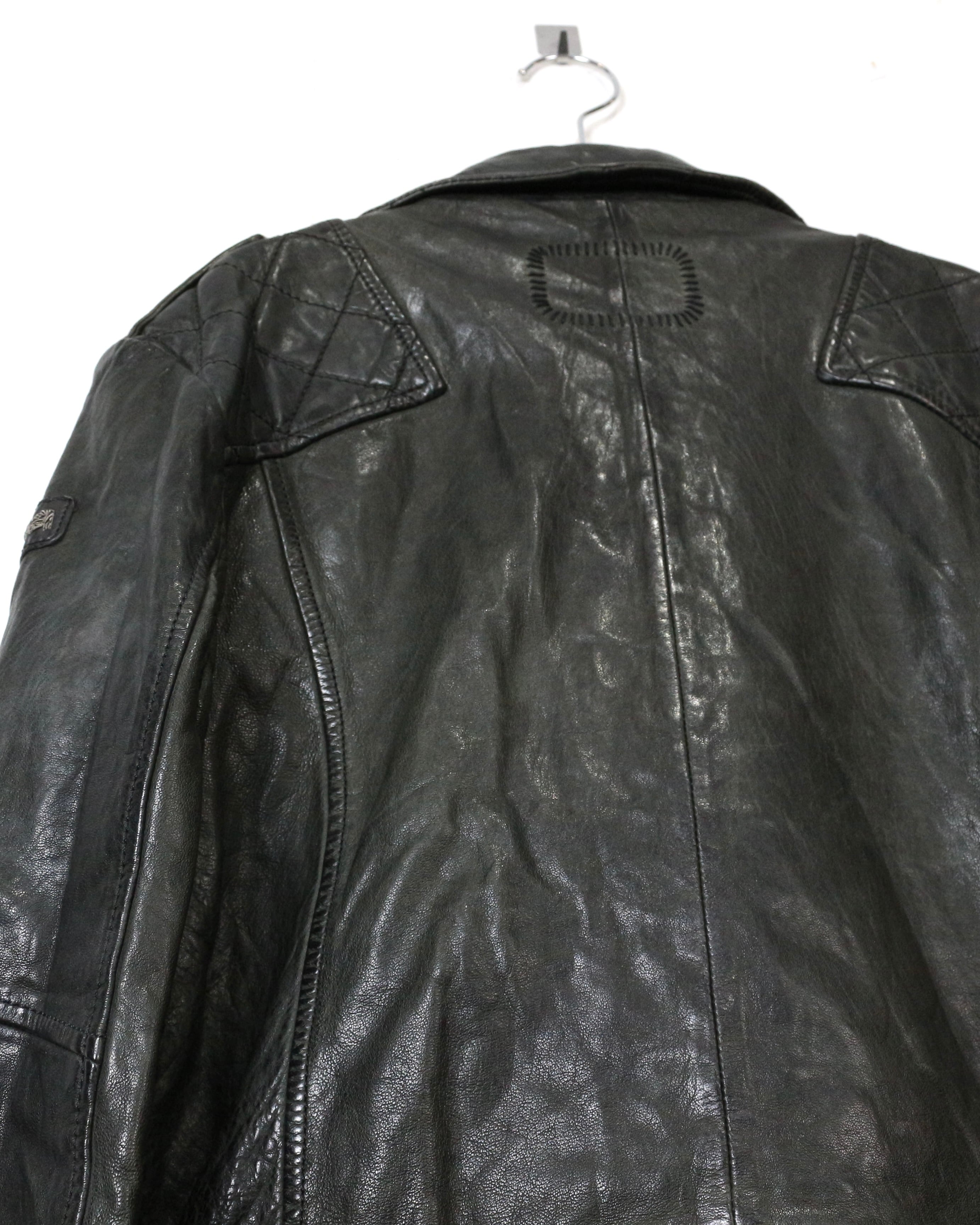 フロントは王道のダブル仕様。ラペルやジップ配置といったクラシックなディテールに加え、ショルダー部分と裾にはキルティングを施すことで、タフさとデザイン性をプラス。どこかモードなニュアンスを感じさせる仕上がりです。