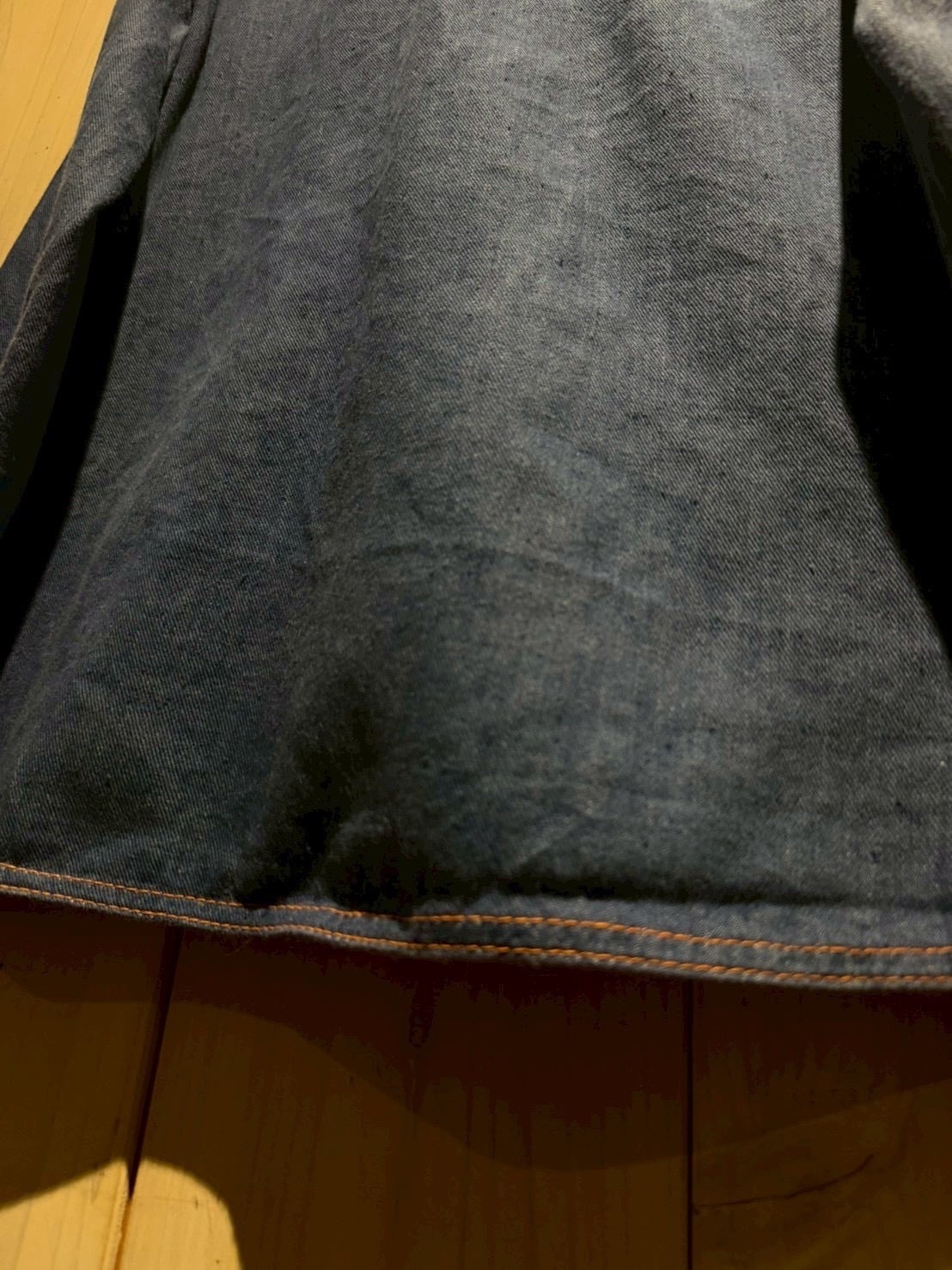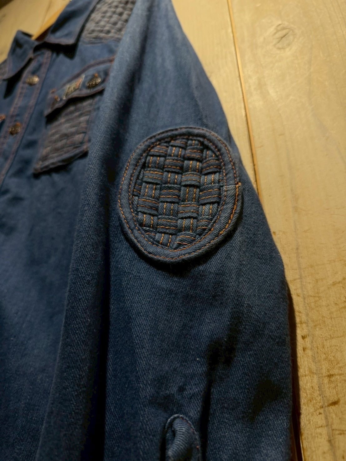 程よくフェードしたブルーデニムのボディに、フロントヨーク、ポケット、エルボーパッチへと大胆に施されたデニムの編み込みディテールが目を惹く1着。