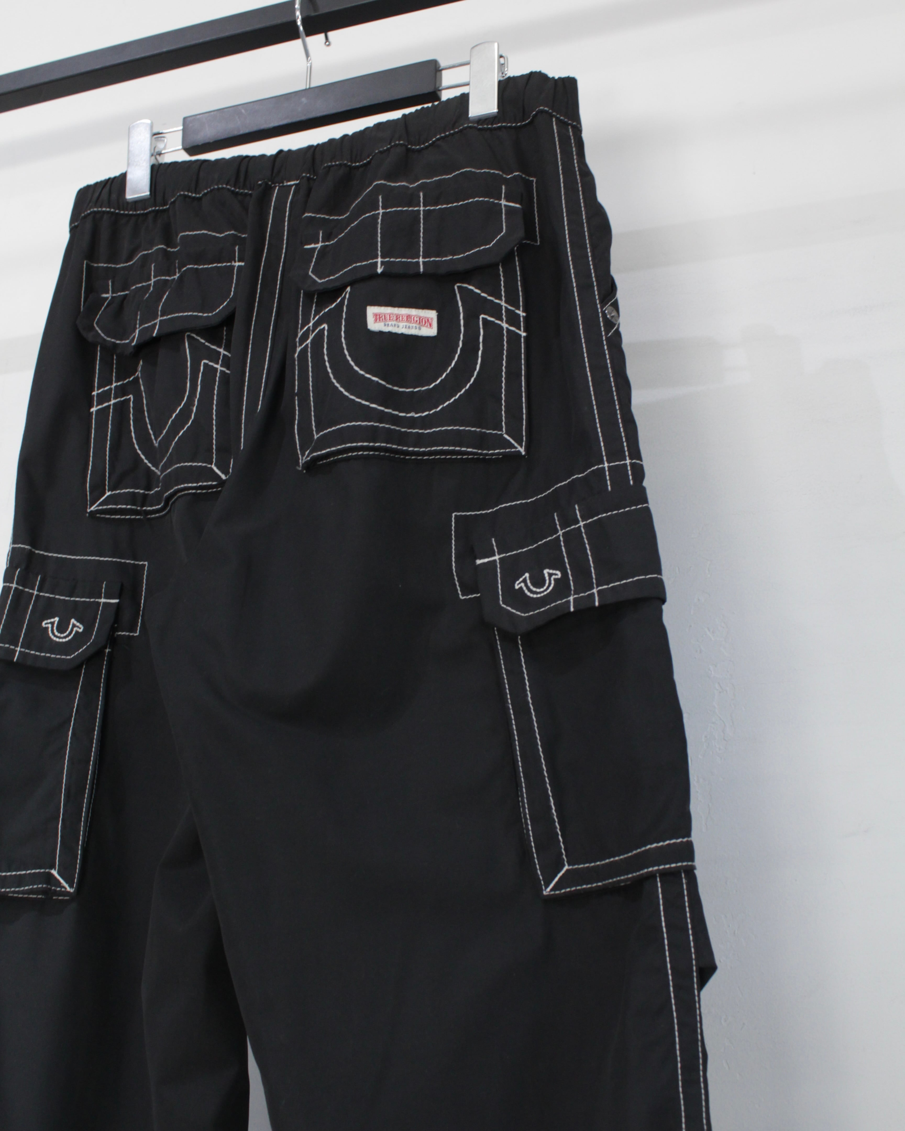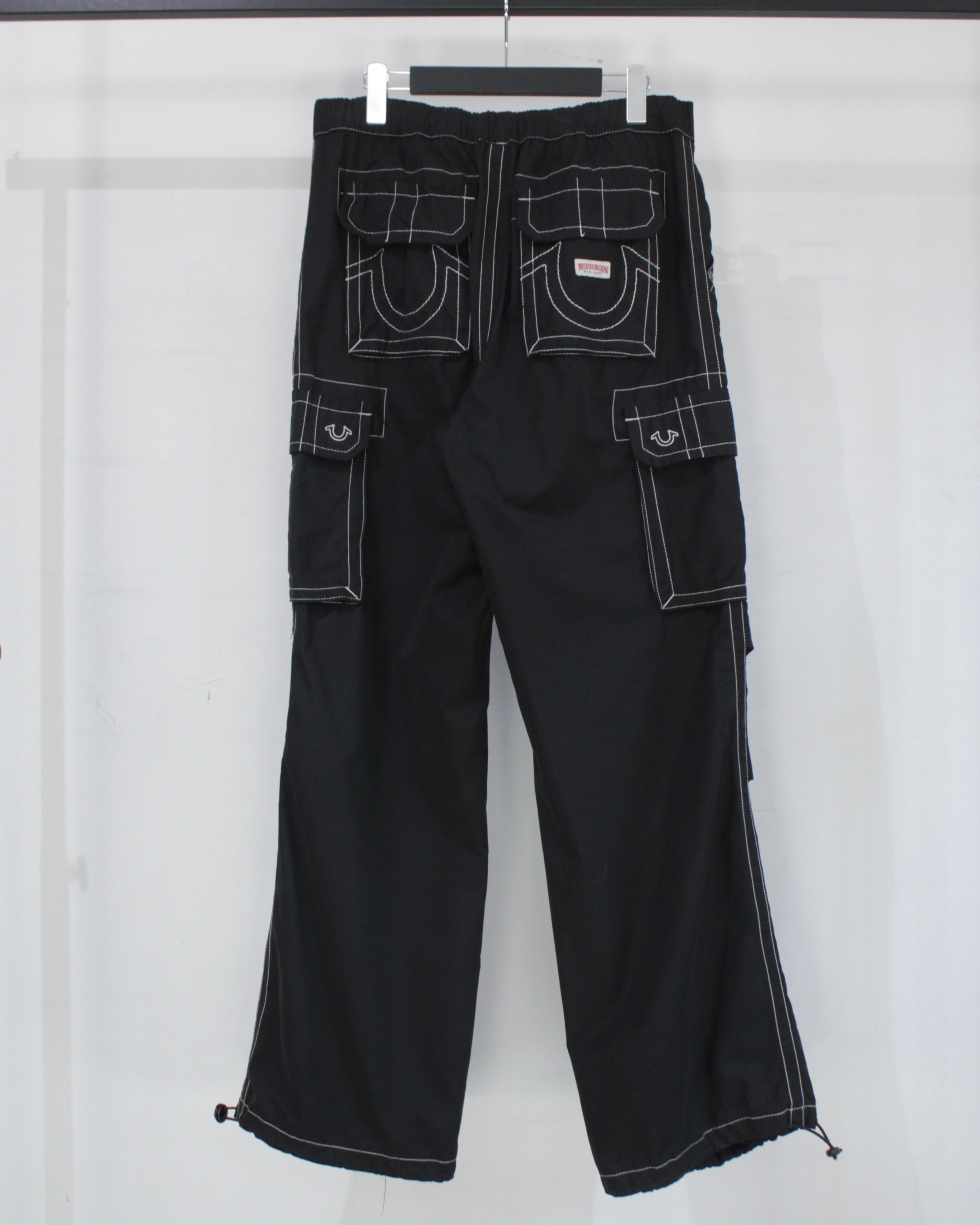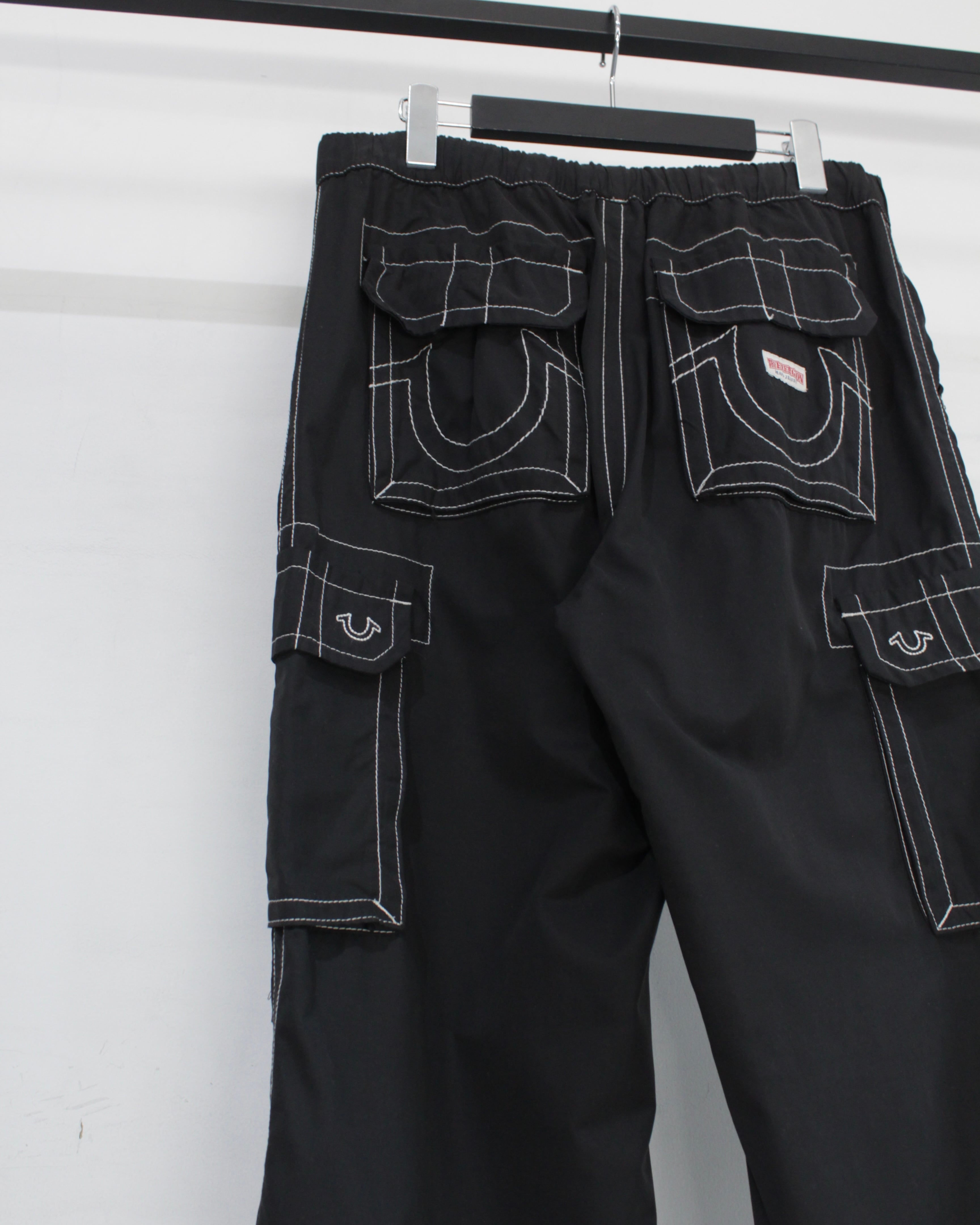アメリカ発、デニムシーンを牽引し続ける TRUE RELIGION より、ブランドの象徴的意匠を大胆に落とし込んだナイロンカーゴパンツ。