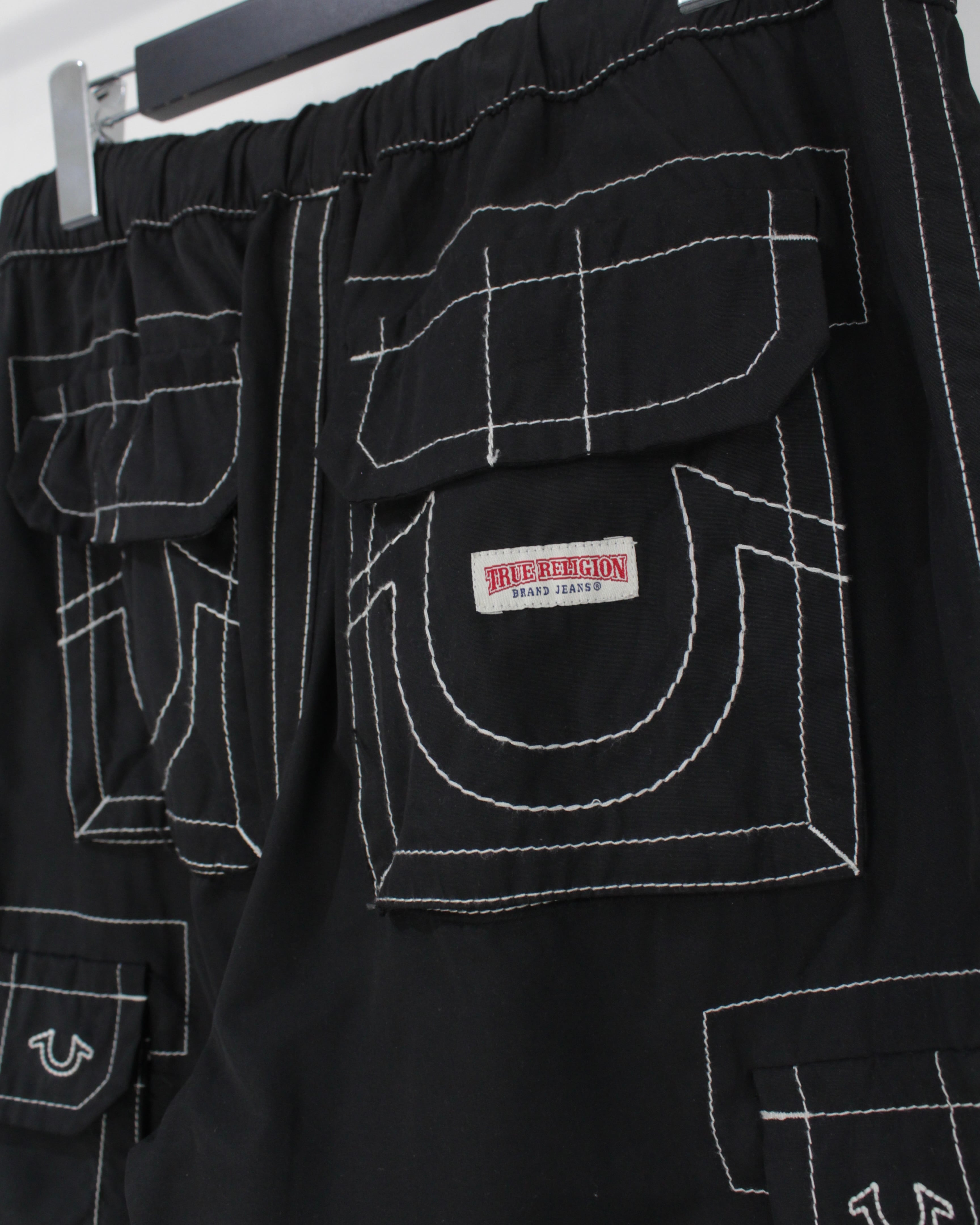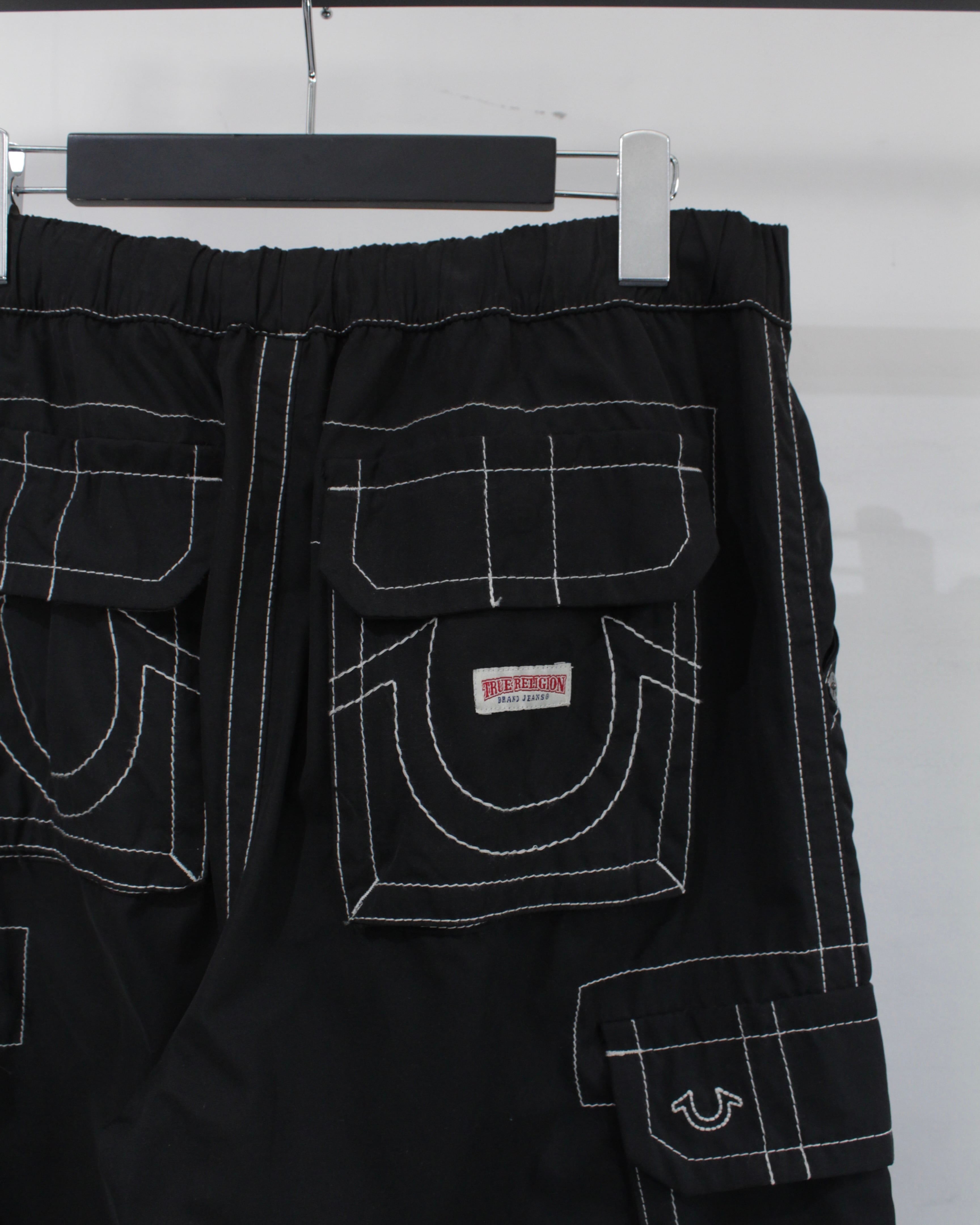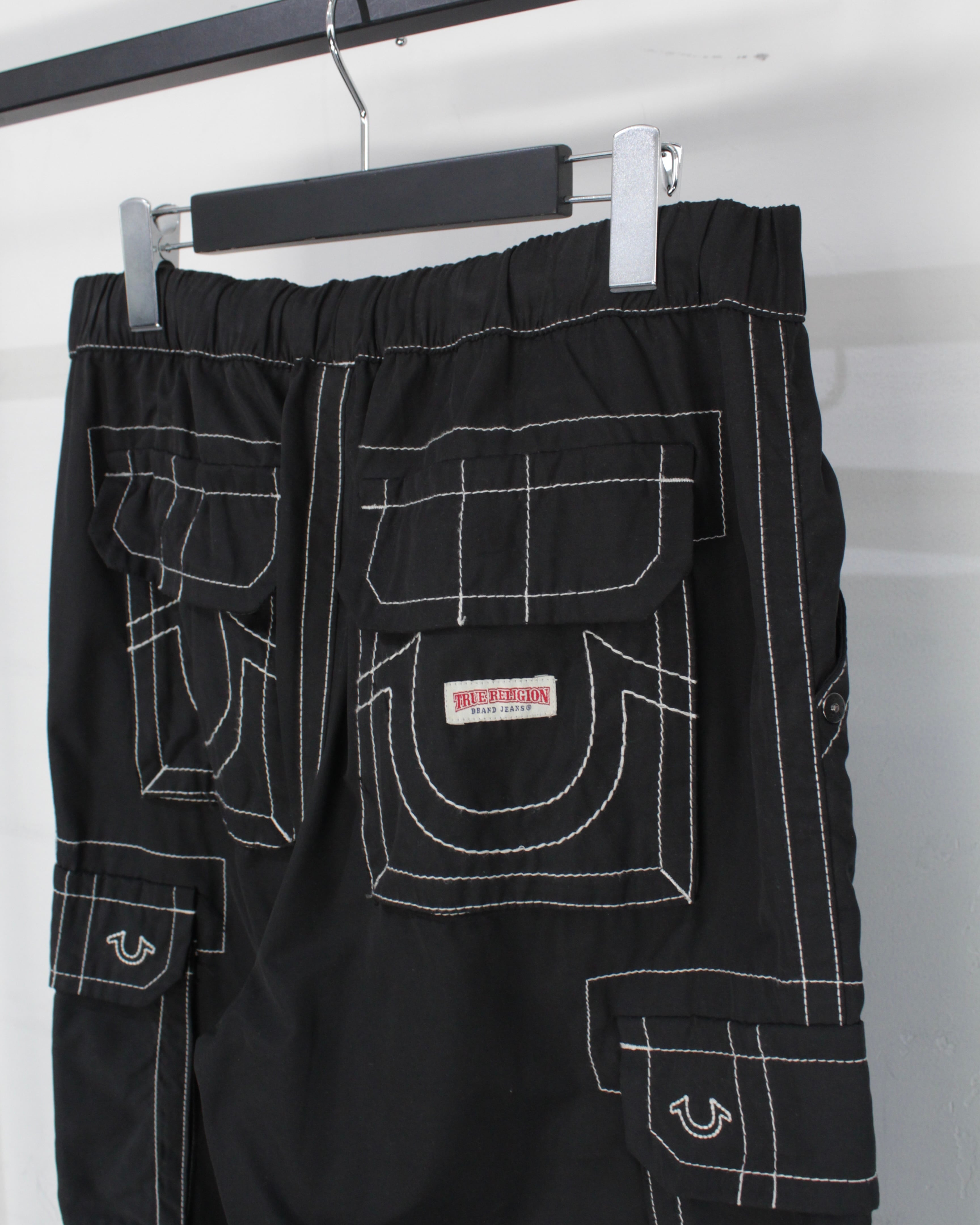 アメリカ発、デニムシーンを牽引し続ける TRUE RELIGION より、ブランドの象徴的意匠を大胆に落とし込んだナイロンカーゴパンツ。