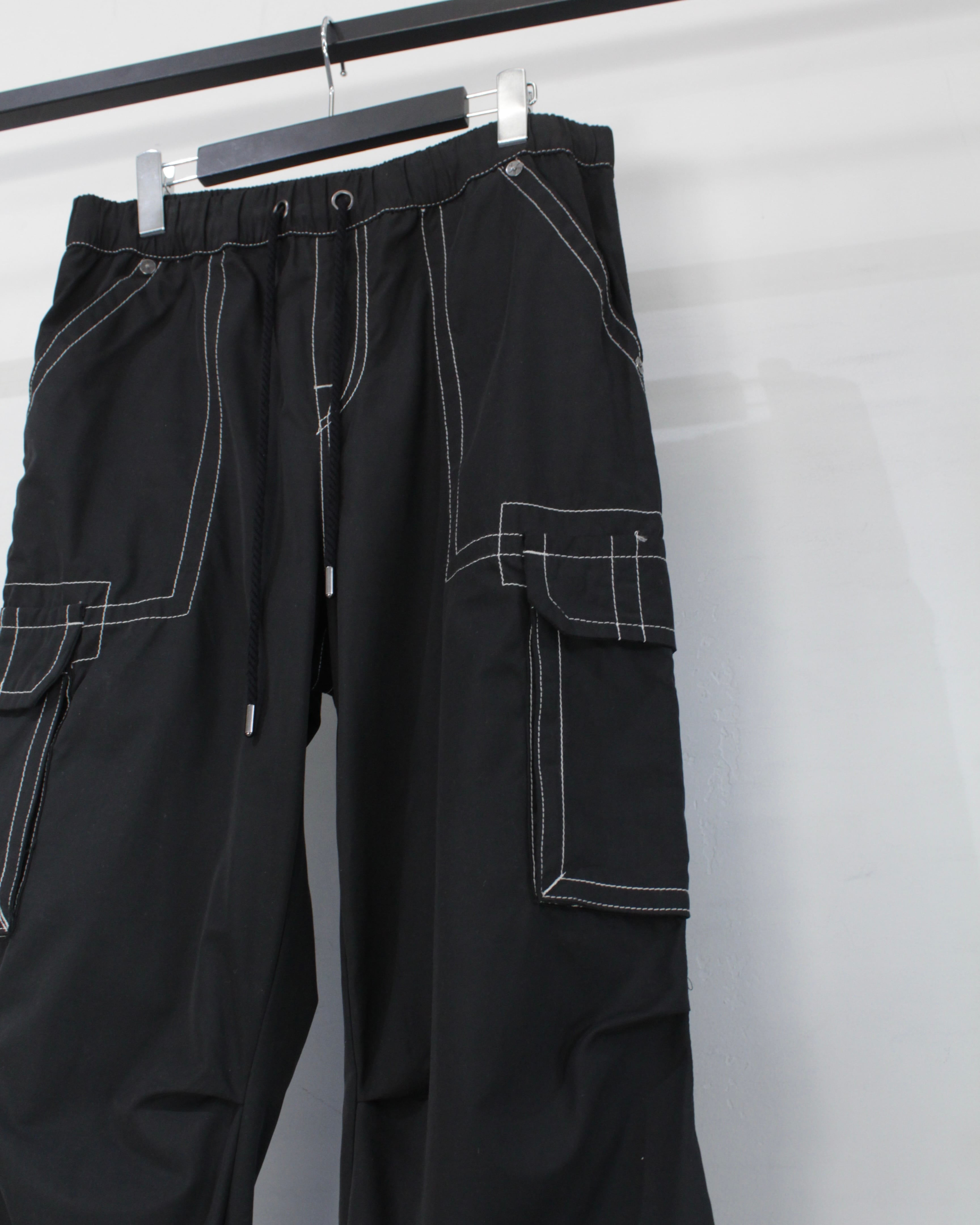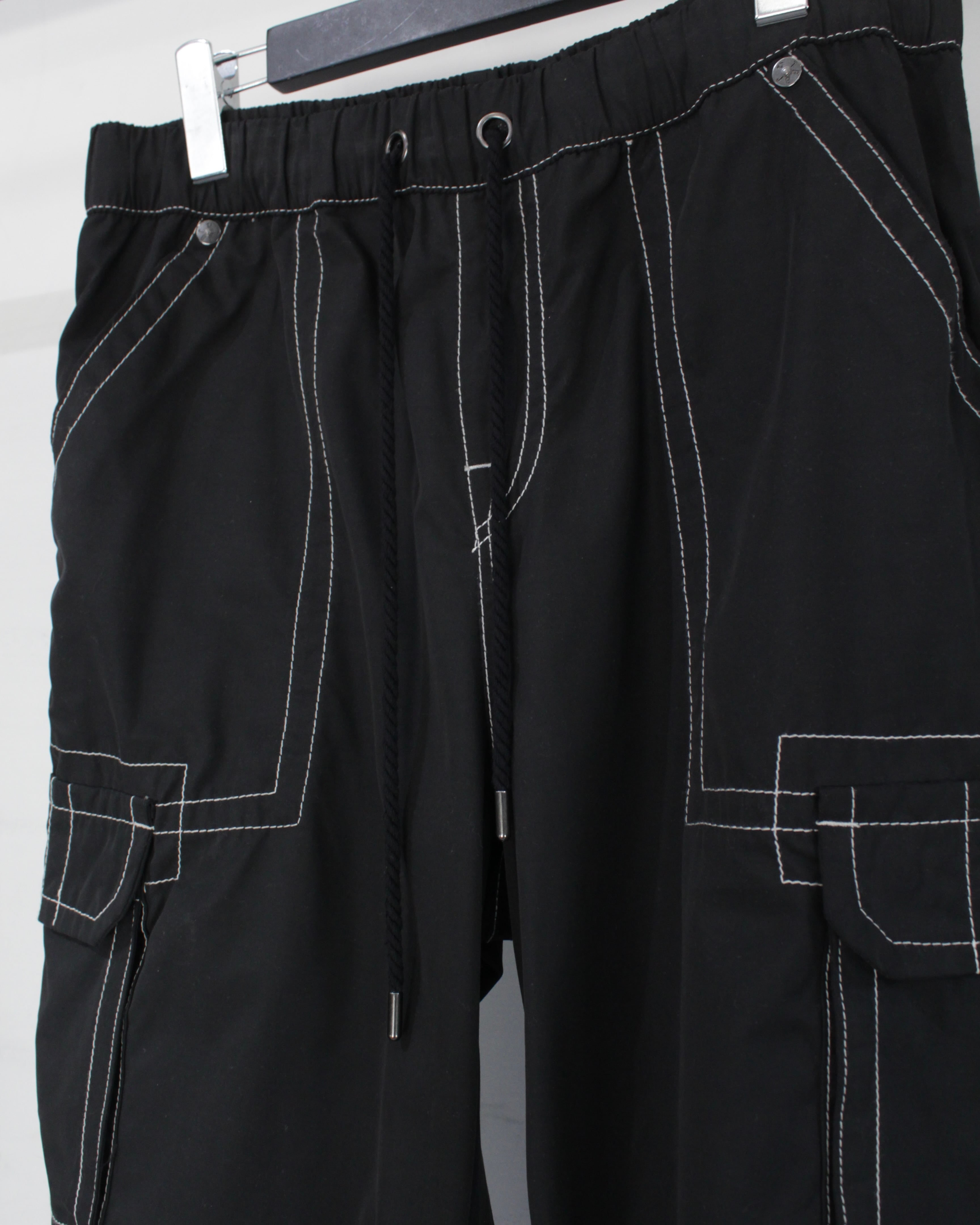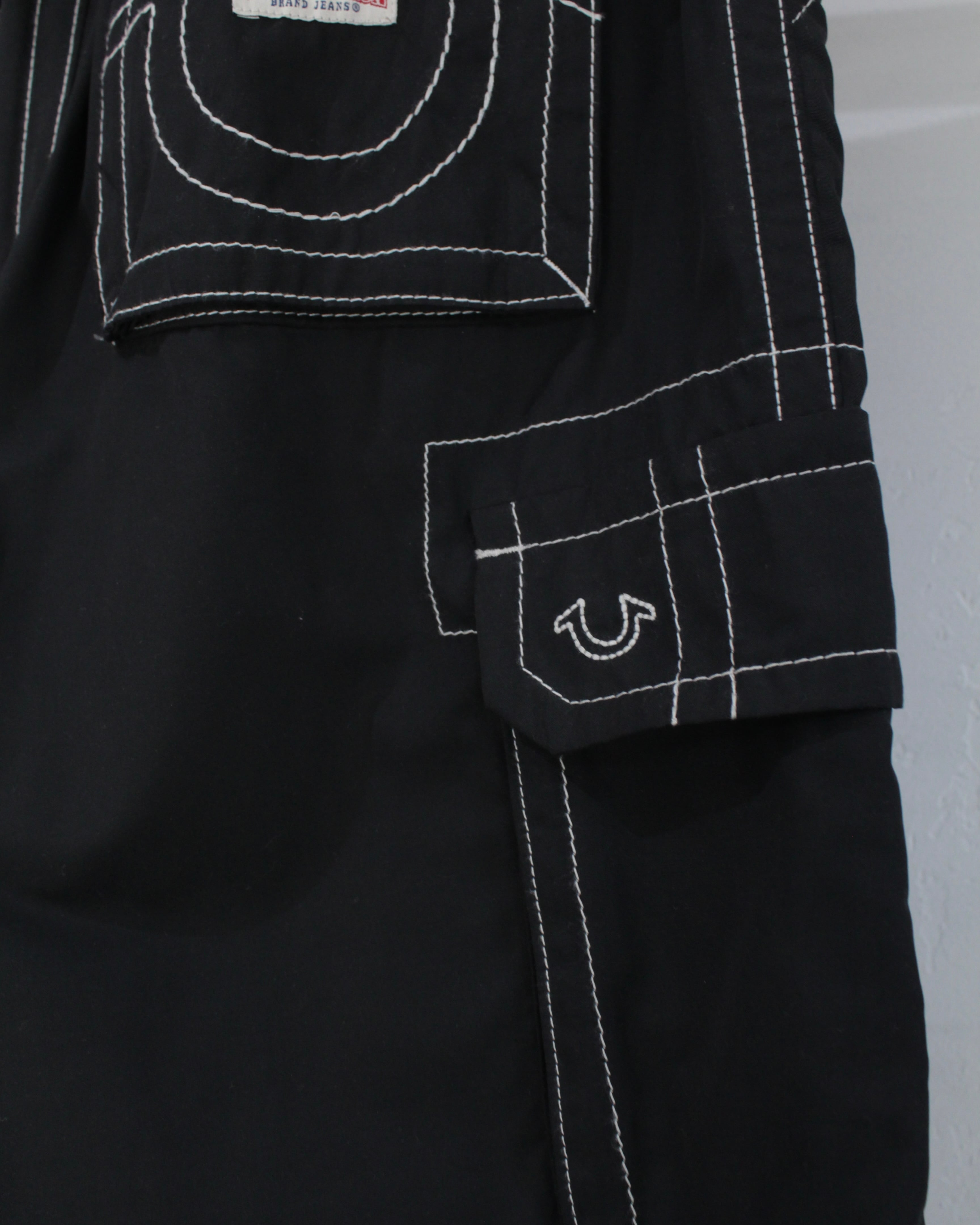 ブラックボディをベースに、全体へ走るコントラストの効いたホワイトステッチ。ブランドのアイコンであるホースシューデザインを彷彿とさせるカーブステッチをバックポケットに配置し、さらに各カーゴポケットにも同様の意匠を散りばめた圧巻のデザインワーク。無骨なカーゴパンツの枠に収まらない、TRUE RELIGION らしい主張の強い一本に仕上がっています。