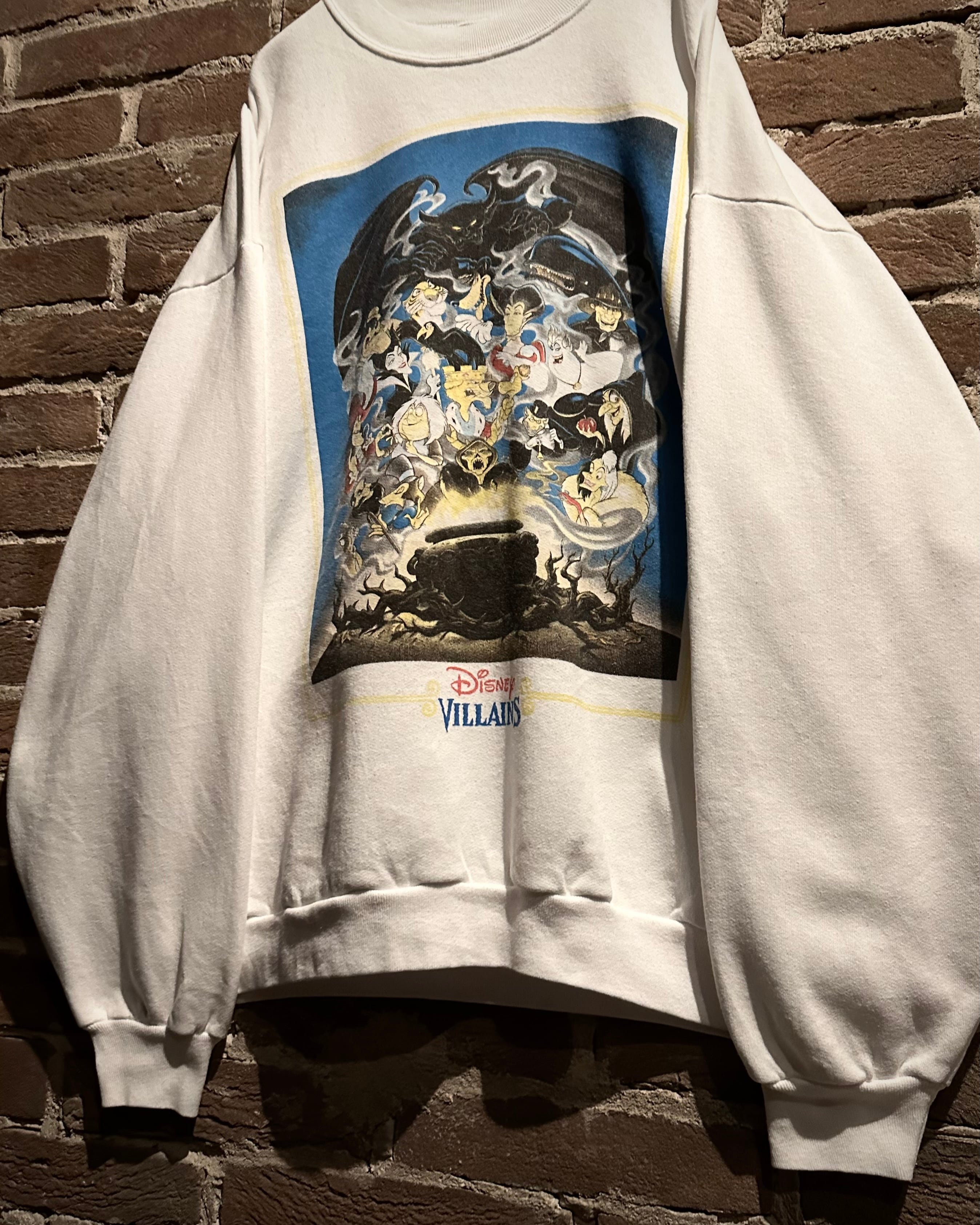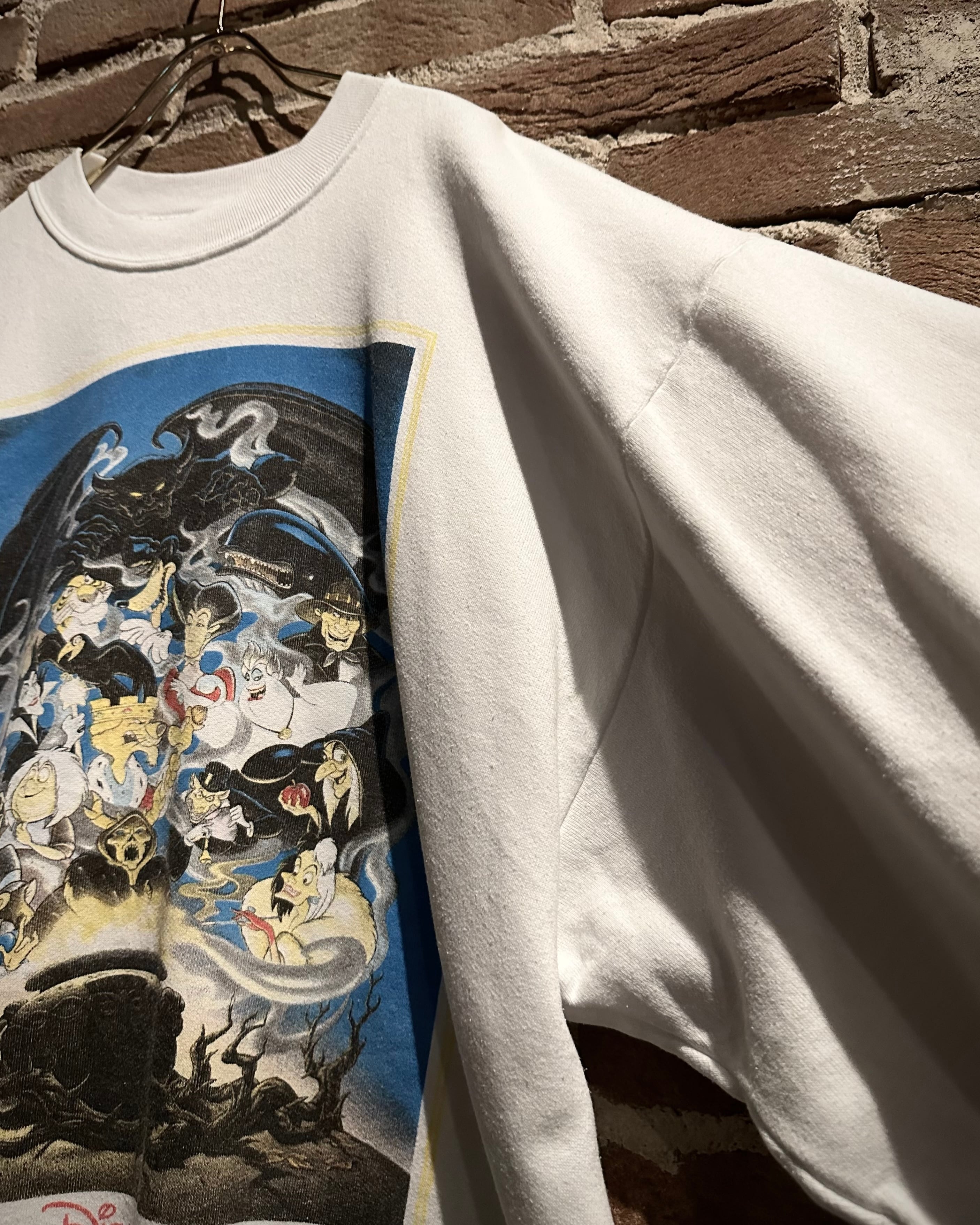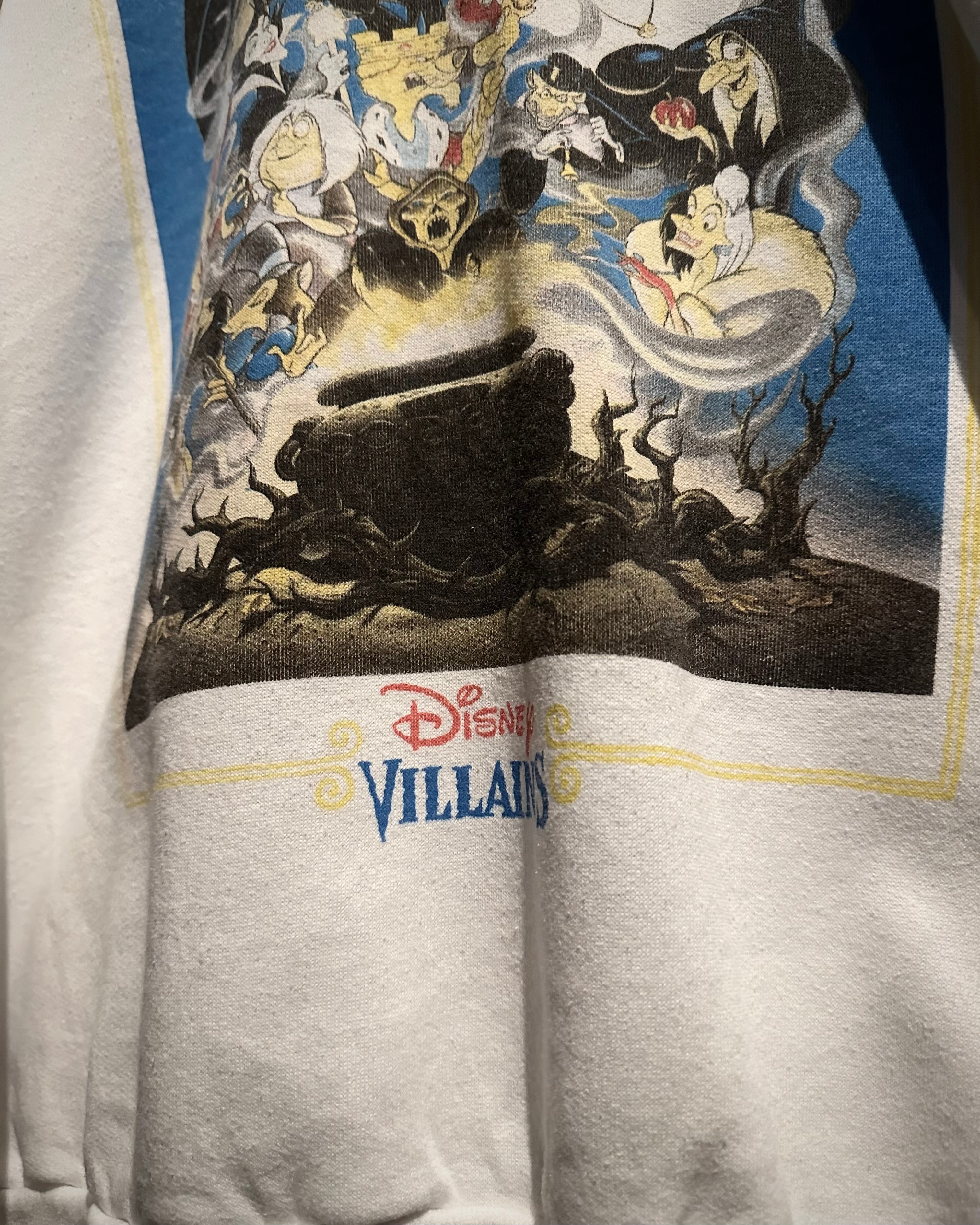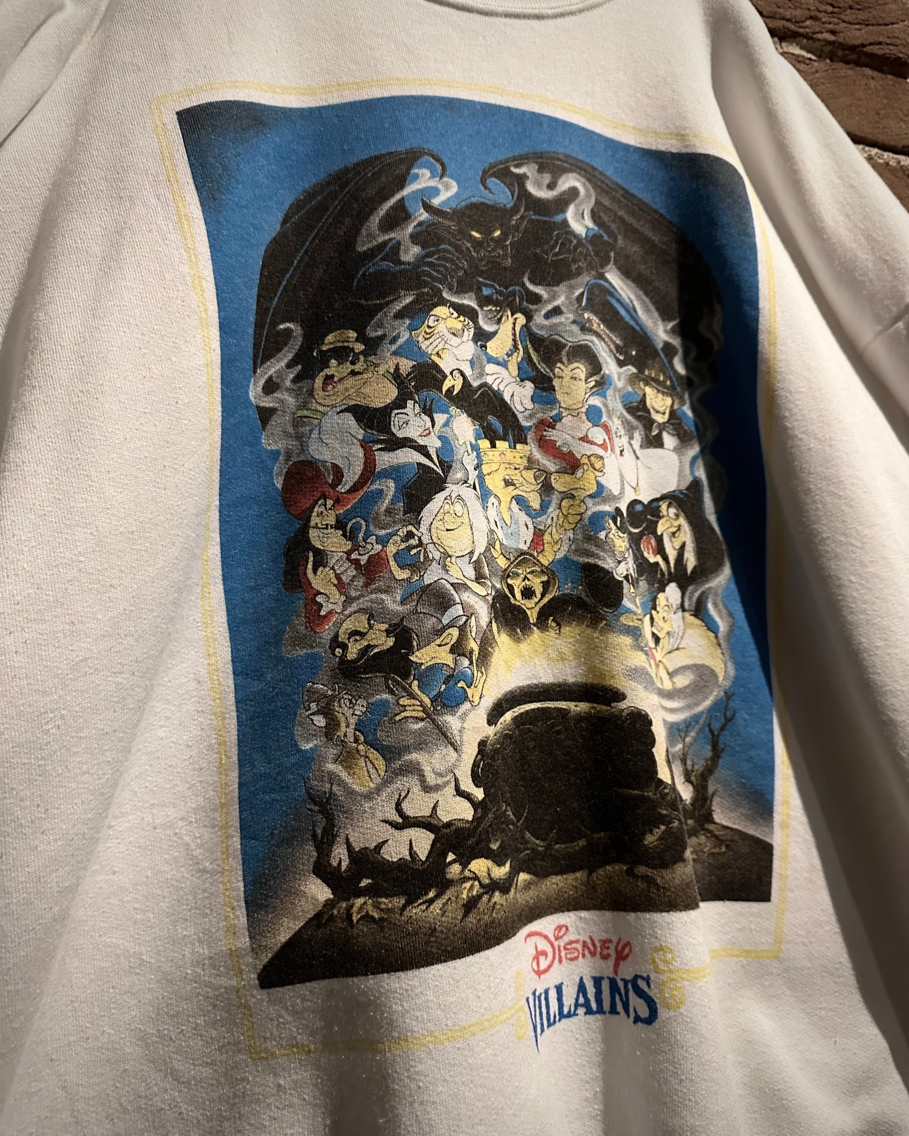 ホワイトのボディをベースに、フロントには様々な物語のヴィランたちを載せたスウェット。ヴィランモチーフ自体が珍しく、スウェットとなるとさらに希少な存在です。