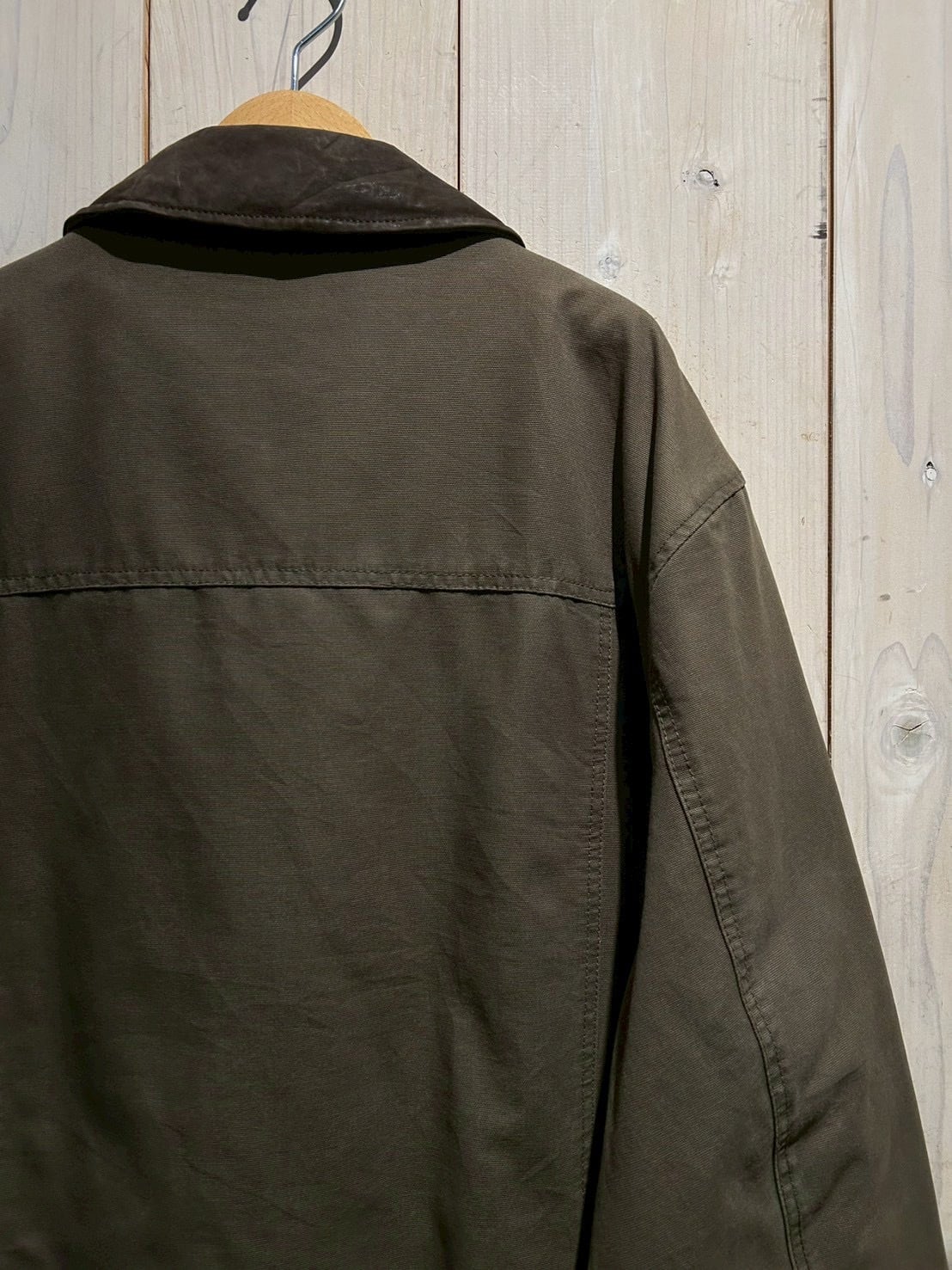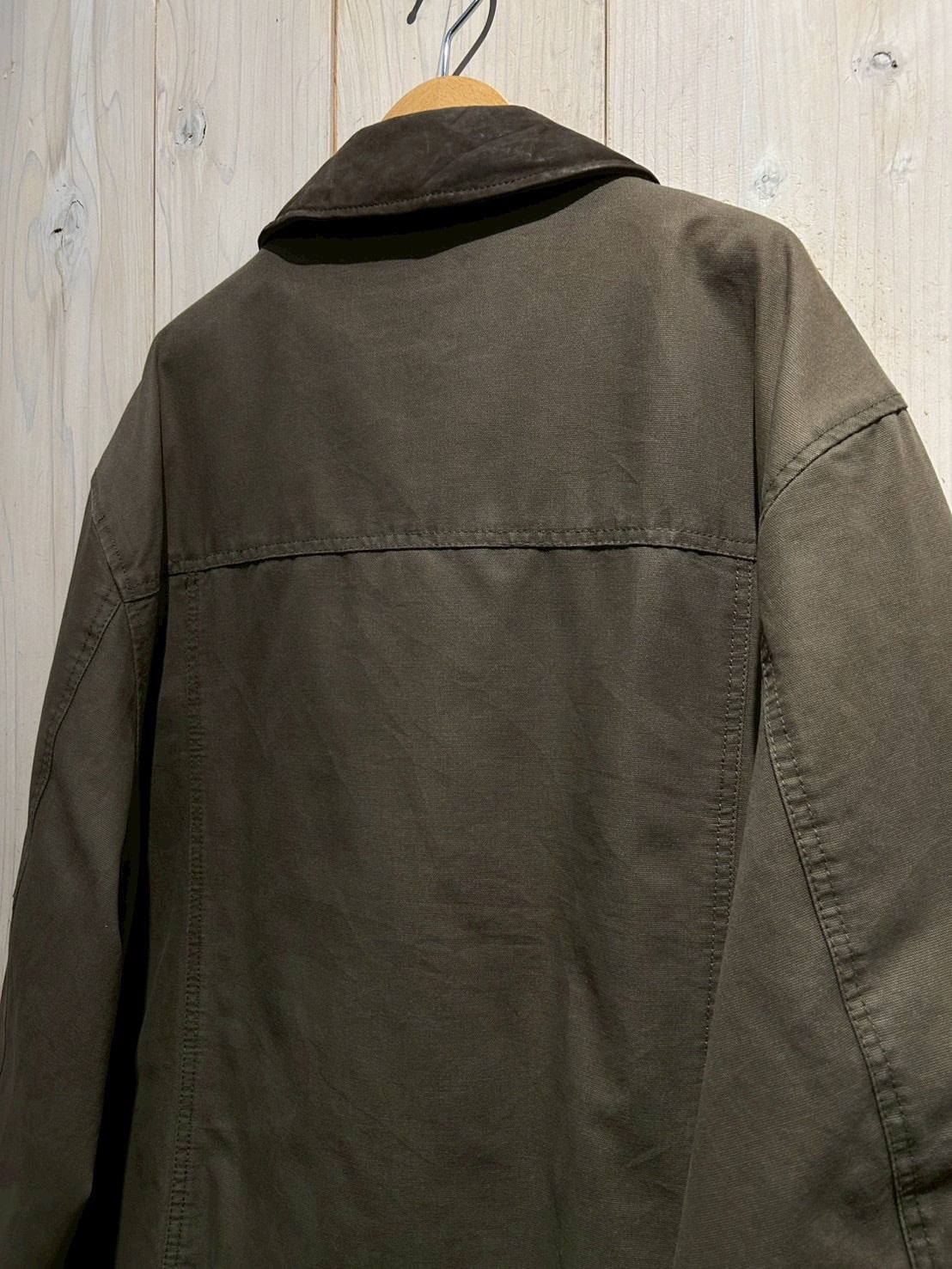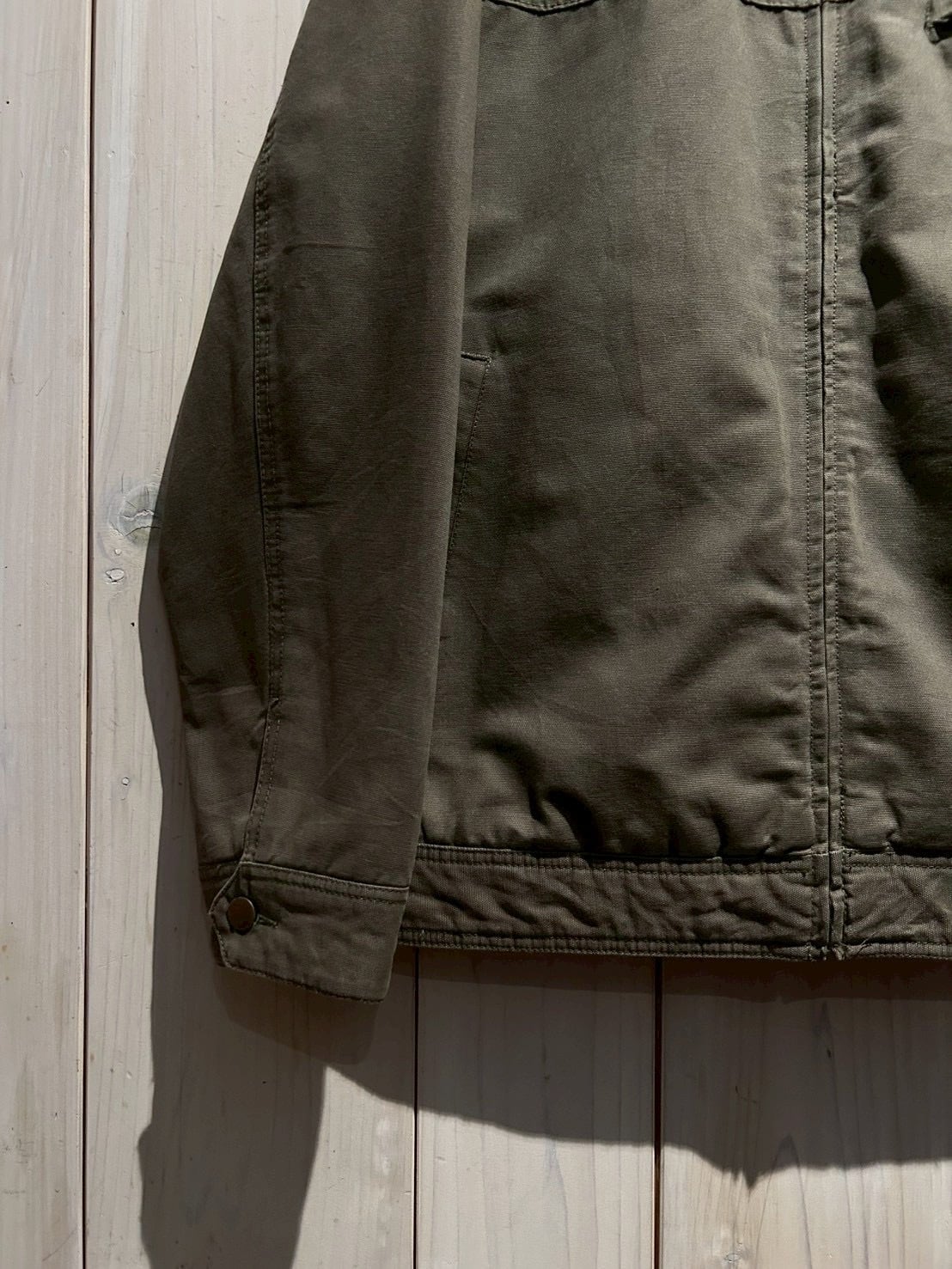 ダック地をベースに、程よくフェードしたオリーブカラーがヴィンテージらしい奥行きを演出。ハリとコシを残しつつも着込まれたことによる柔らかさが加わり、リアルなエイジングを感じさせる風合いに仕上がっています。