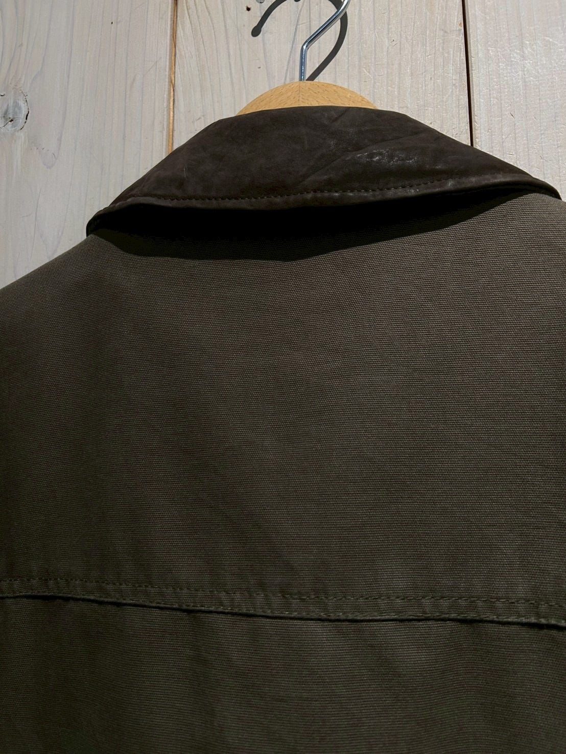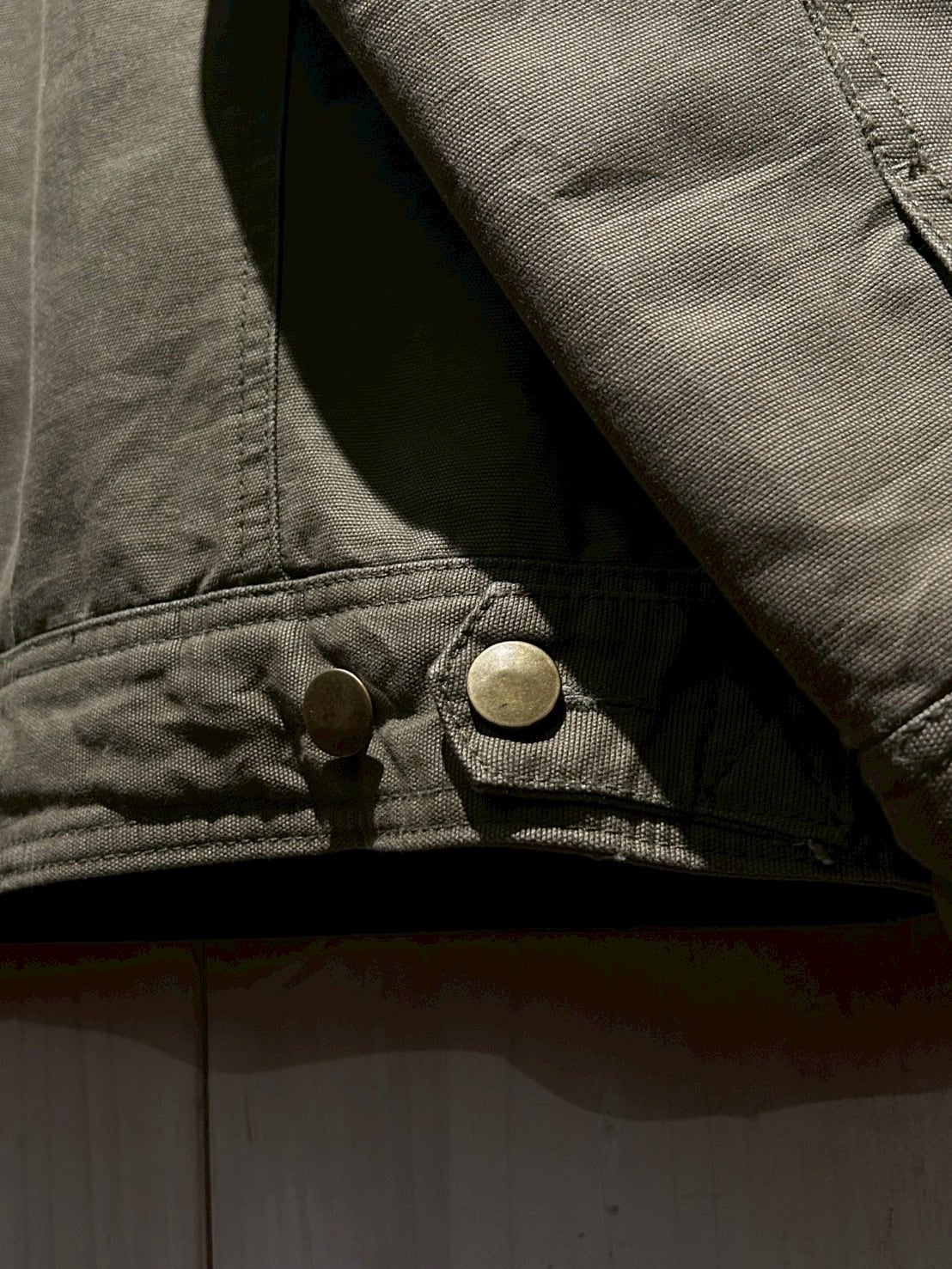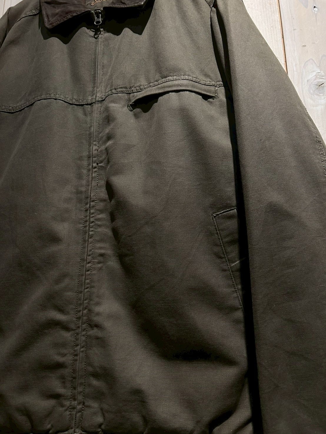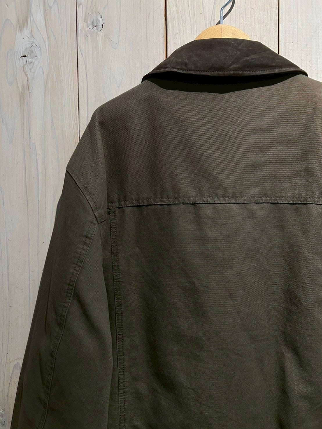 ダック地をベースに、程よくフェードしたオリーブカラーがヴィンテージらしい奥行きを演出。ハリとコシを残しつつも着込まれたことによる柔らかさが加わり、リアルなエイジングを感じさせる風合いに仕上がっています。