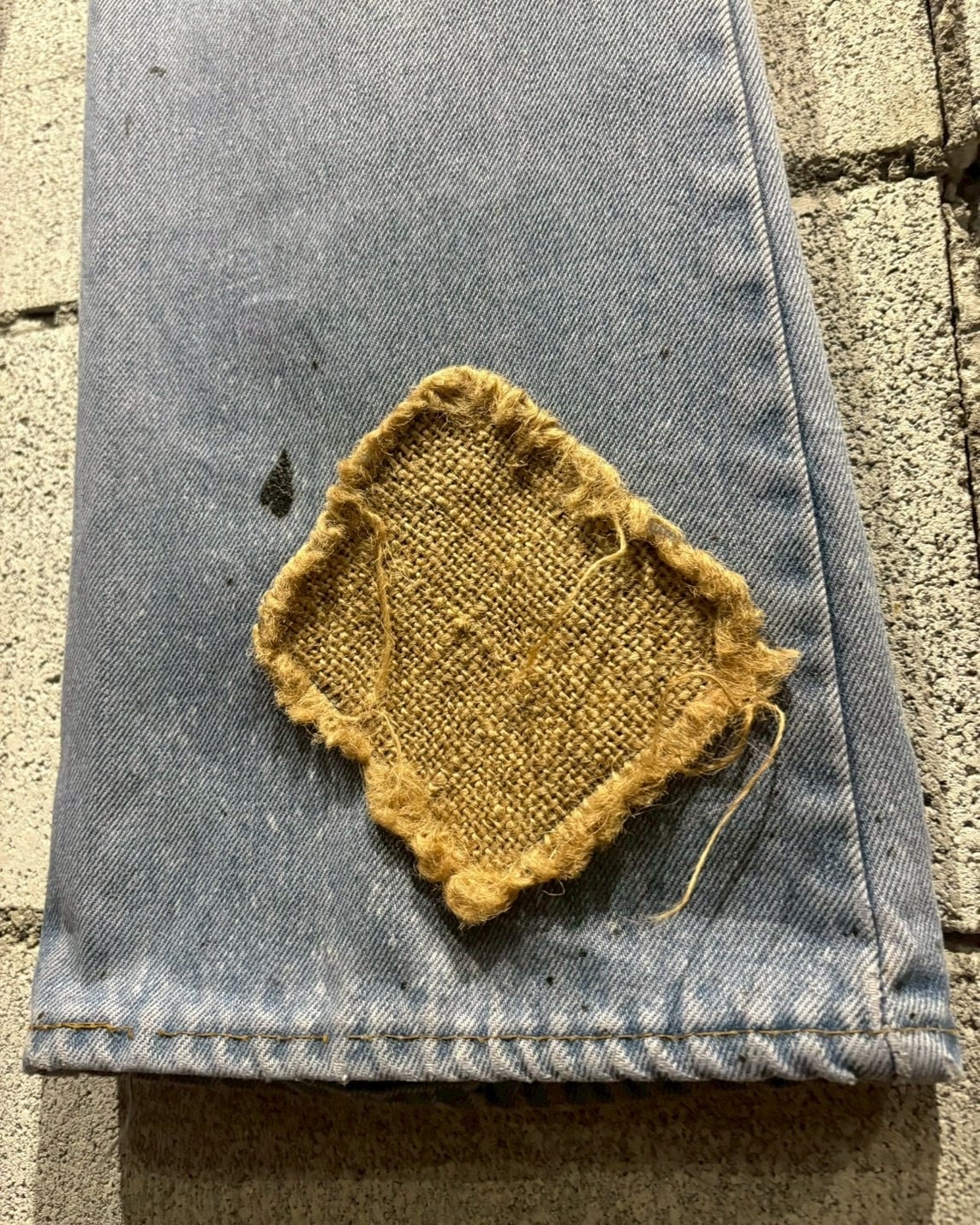 フロントや裾に施された粗野なリペアや、麻のようなファブリックを当てたパッチワークは前所有者によるカスタム。加えてポケットが欠損している点も含め、経年と人の手によって作られた唯一無二の表情が古着好きの心をくすぐります。
