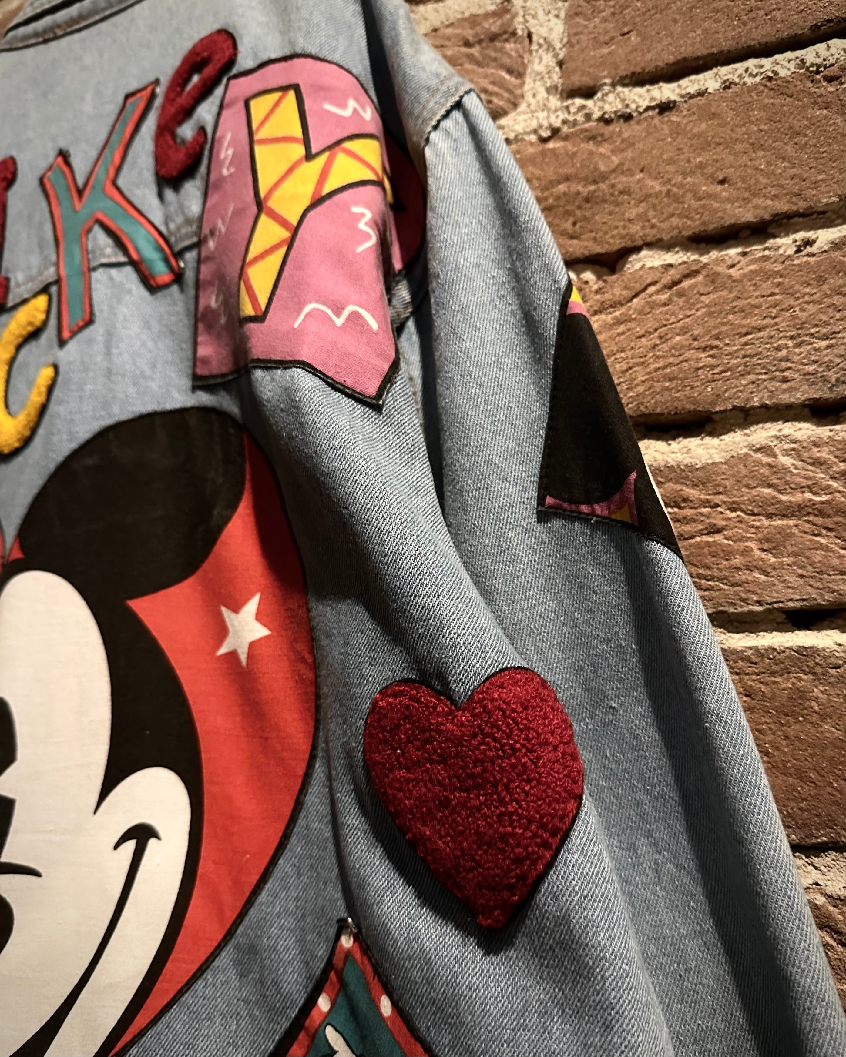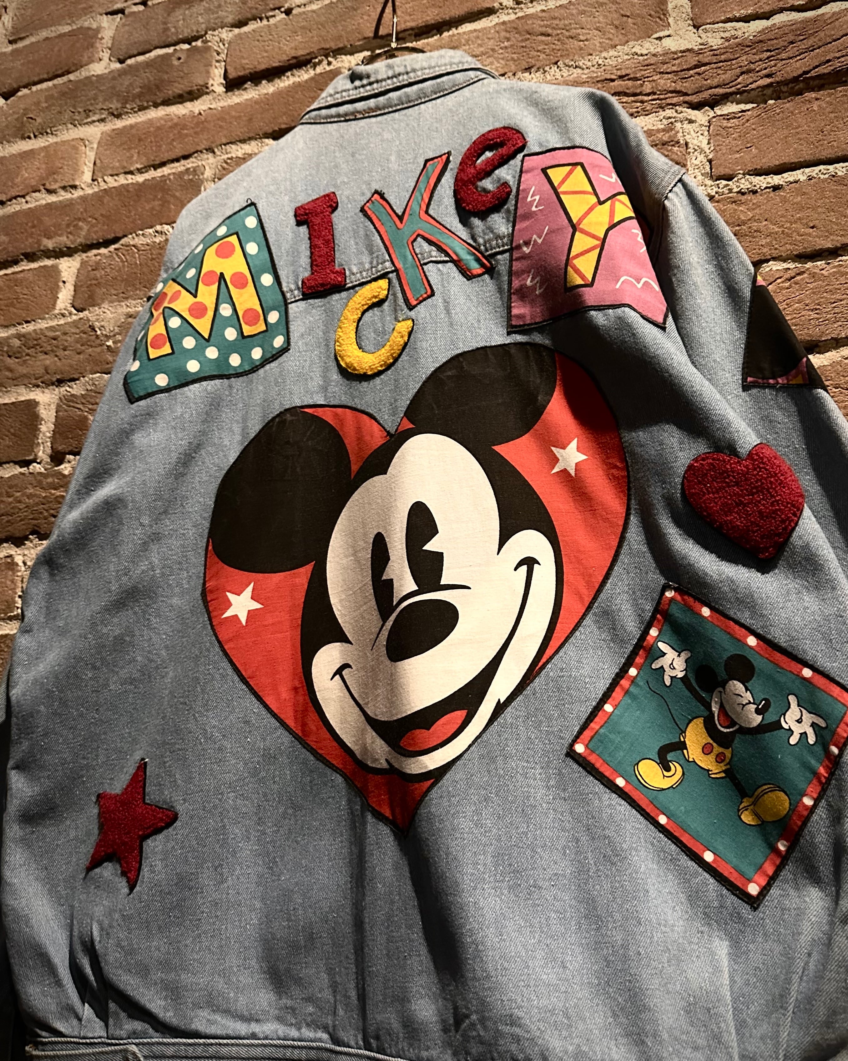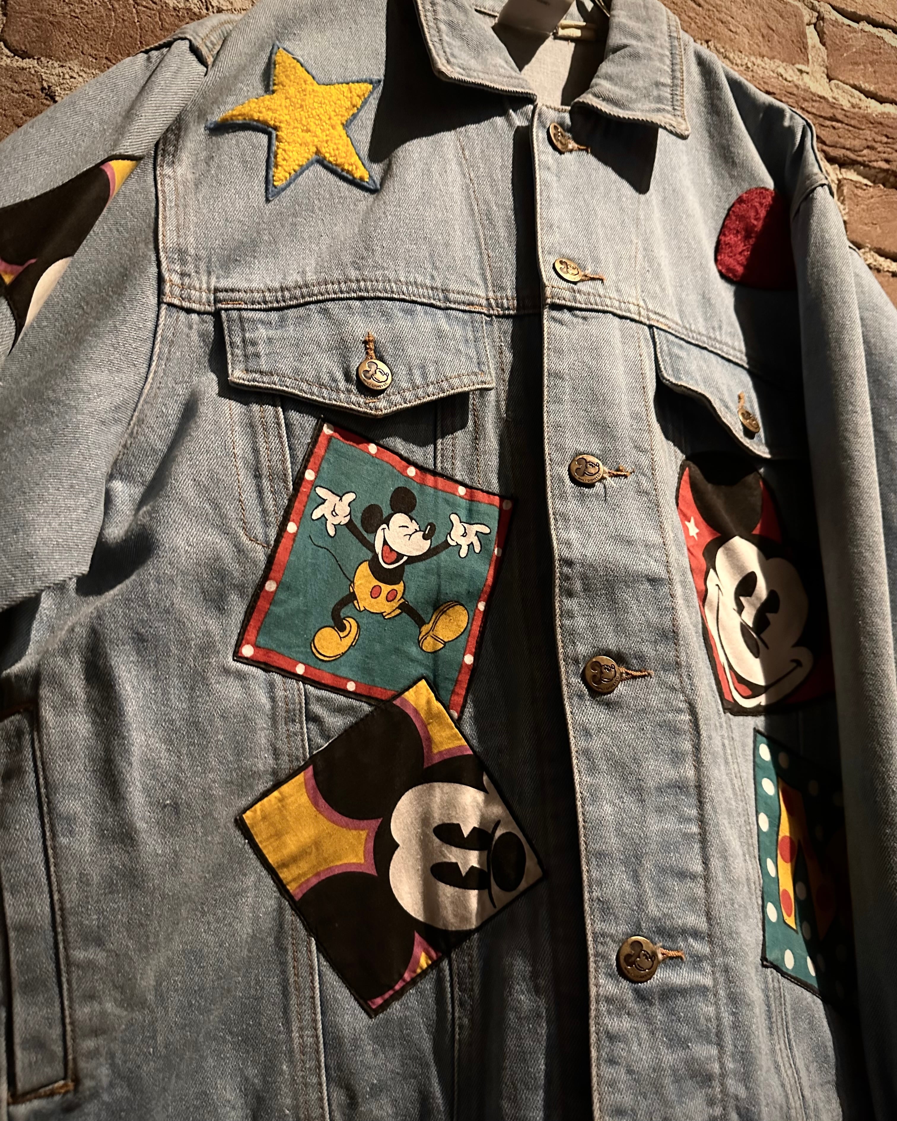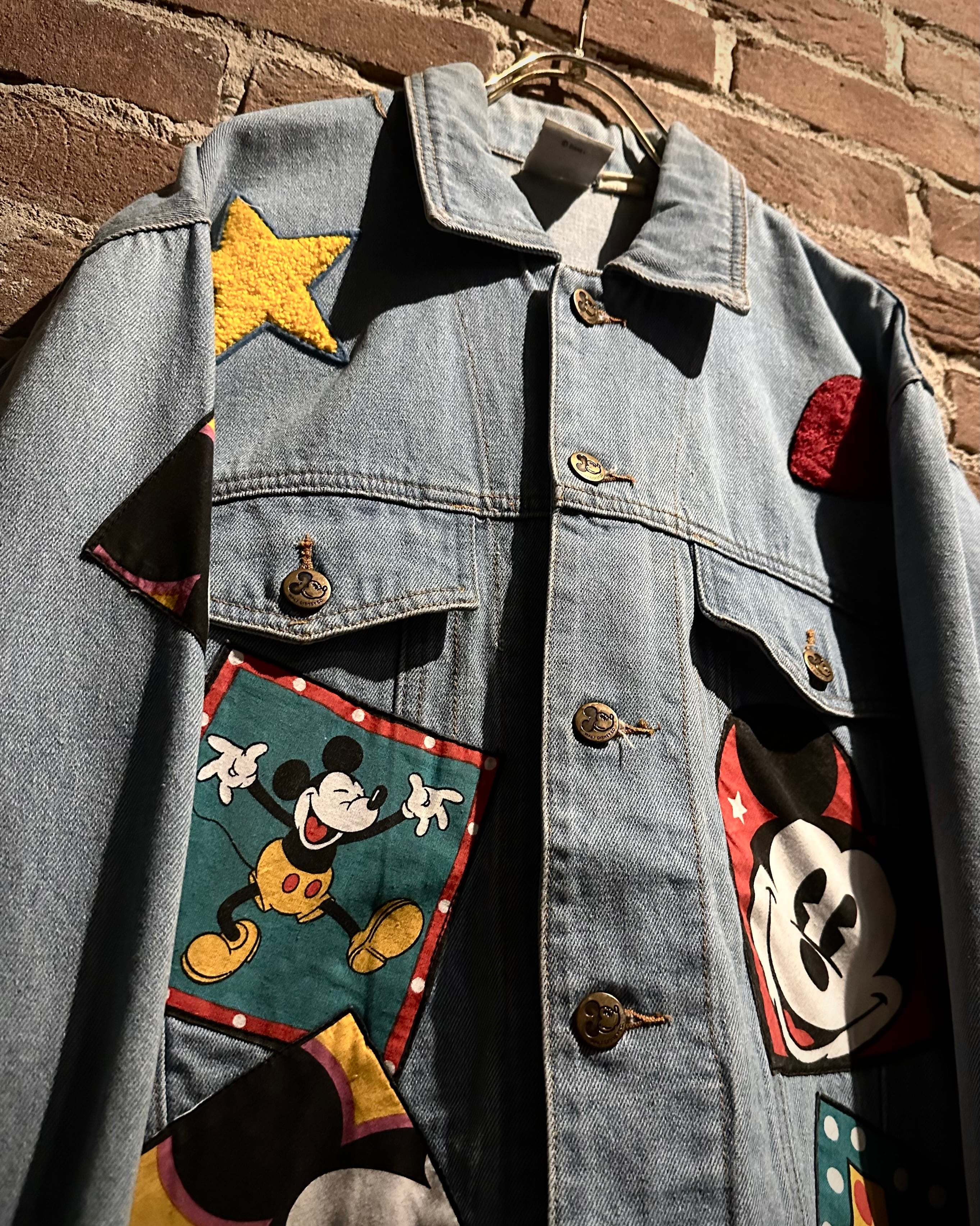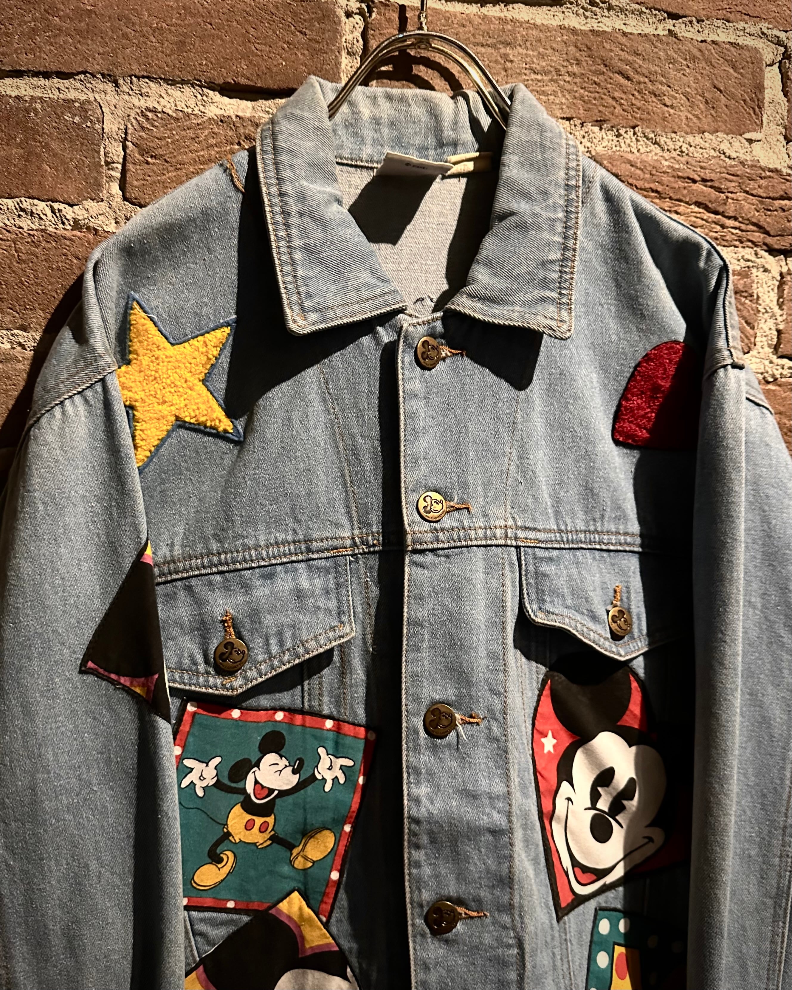 柔らかなブルーのデニムボディに、様々なミッキーのワッペンを施したディズニーオフィシャルのデニムジャケット。