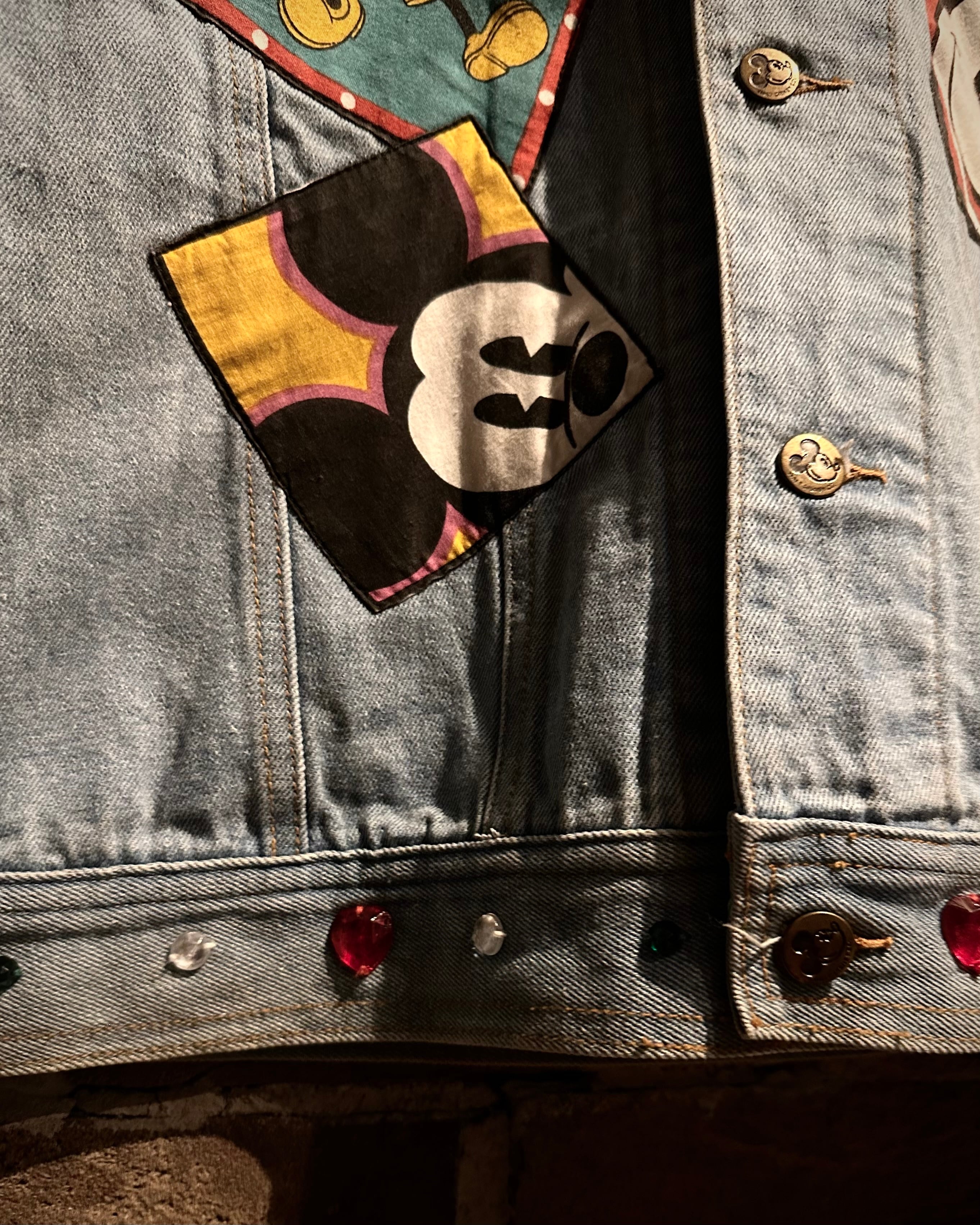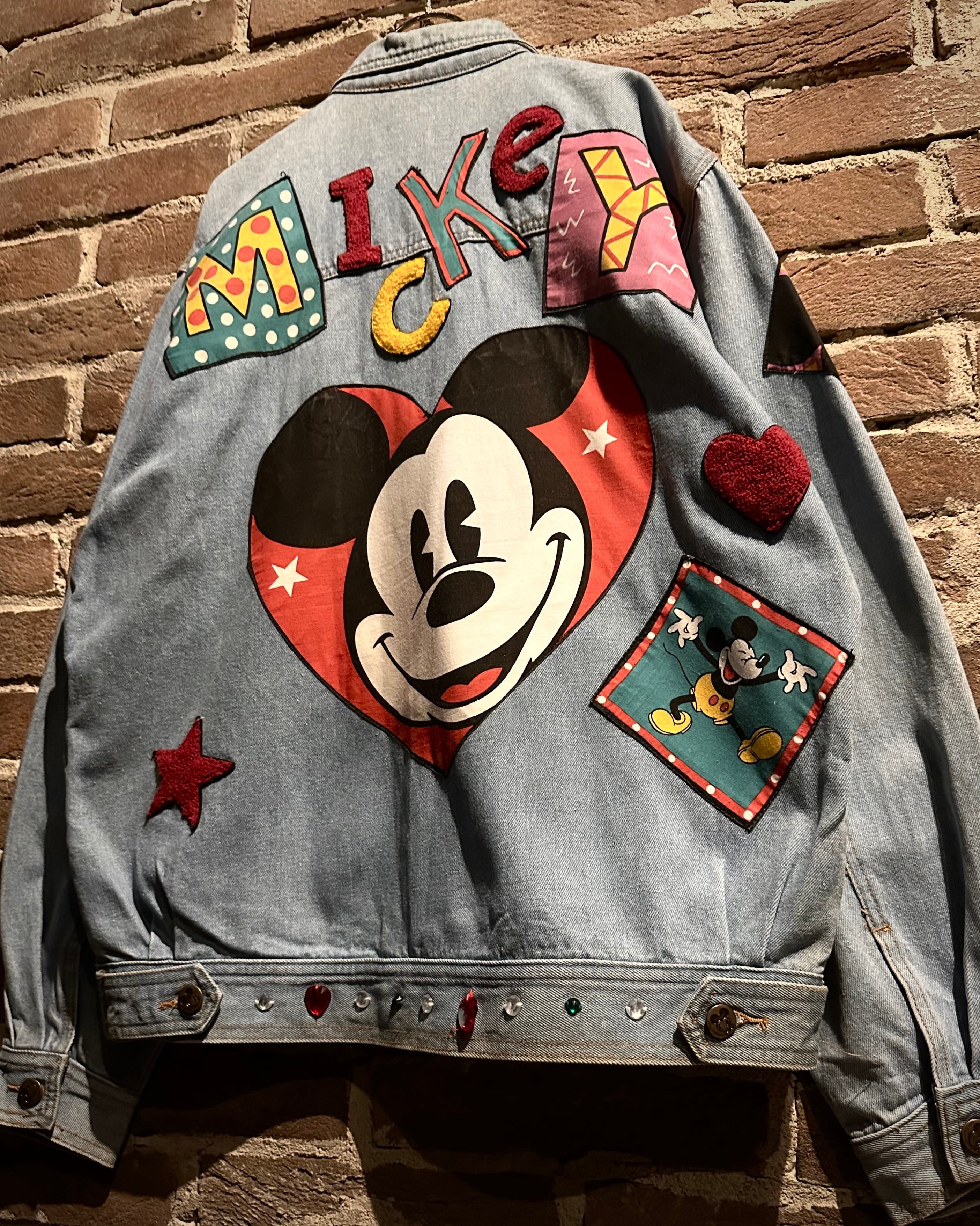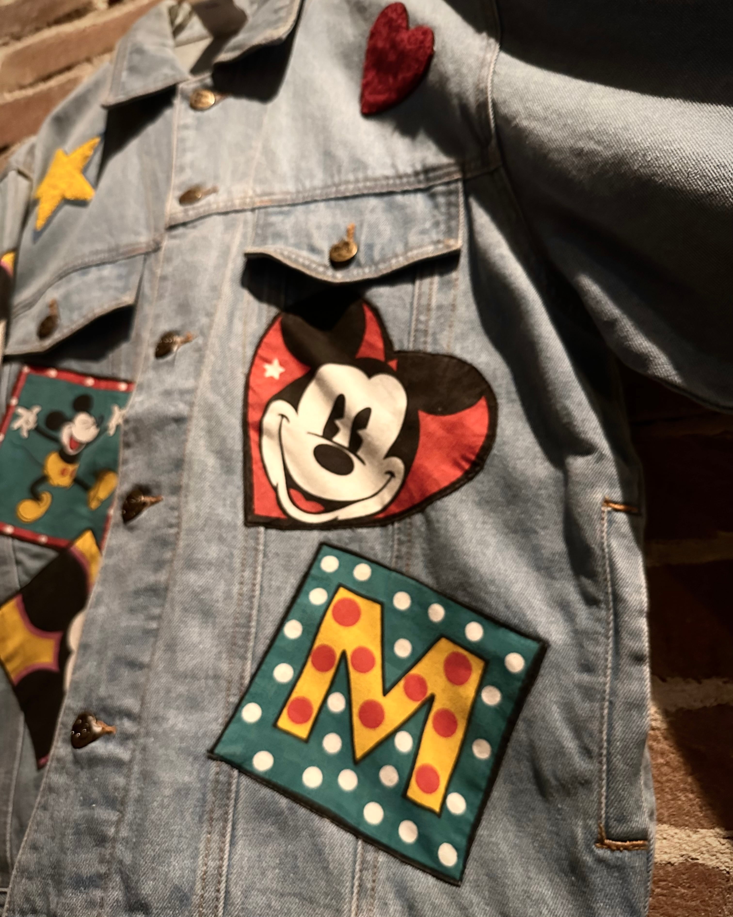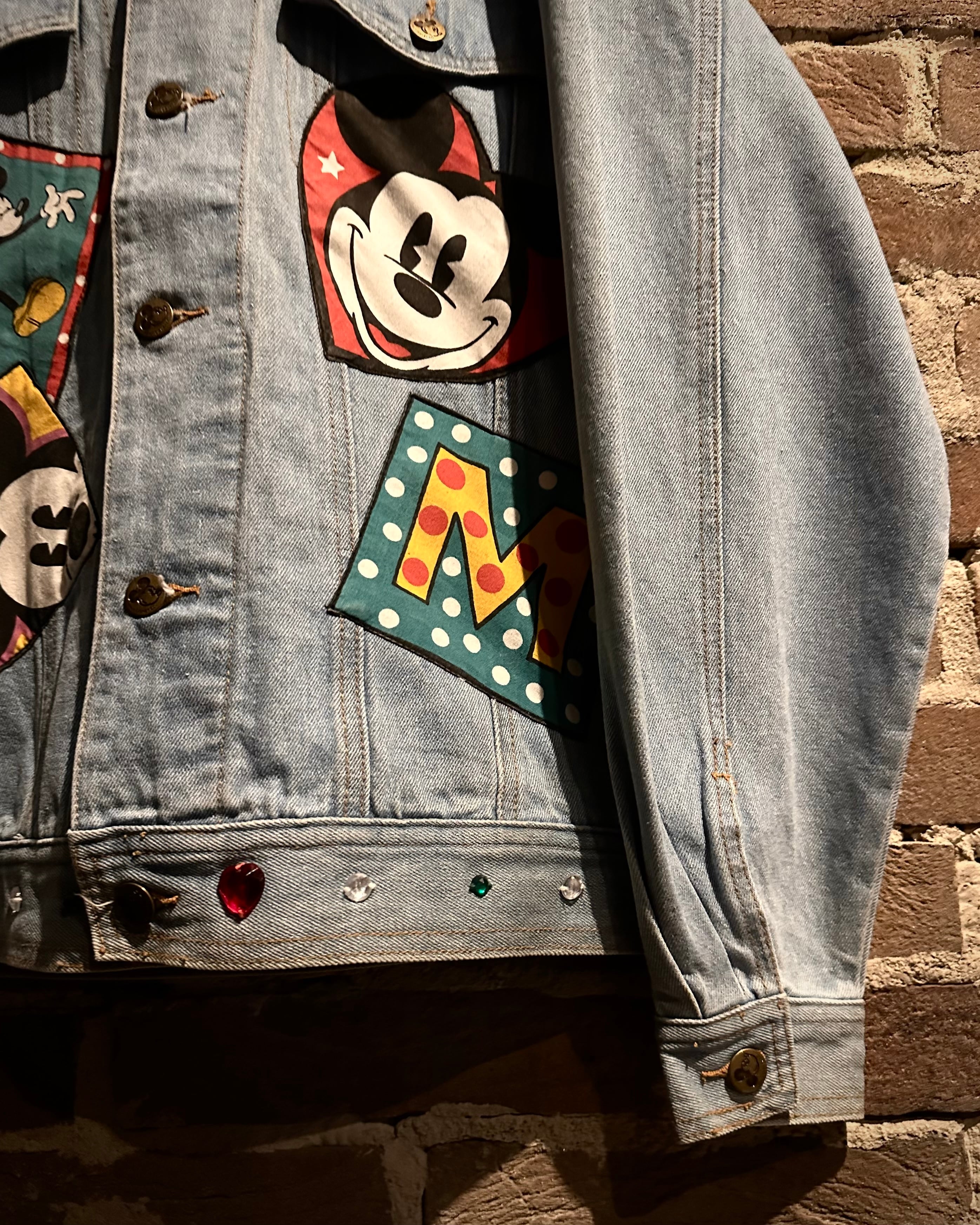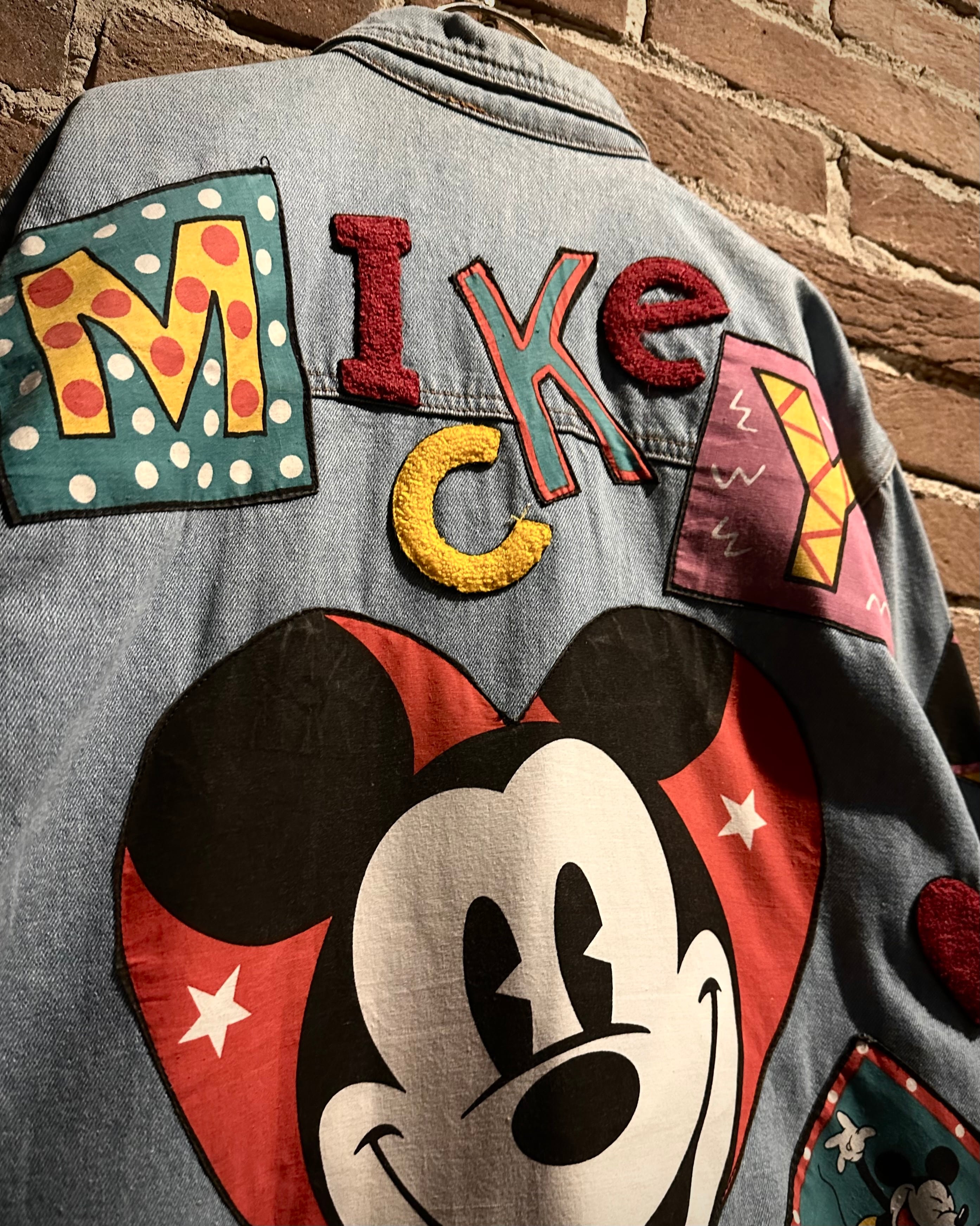 柔らかなブルーのデニムボディに、様々なミッキーのワッペンを施したディズニーオフィシャルのデニムジャケット。