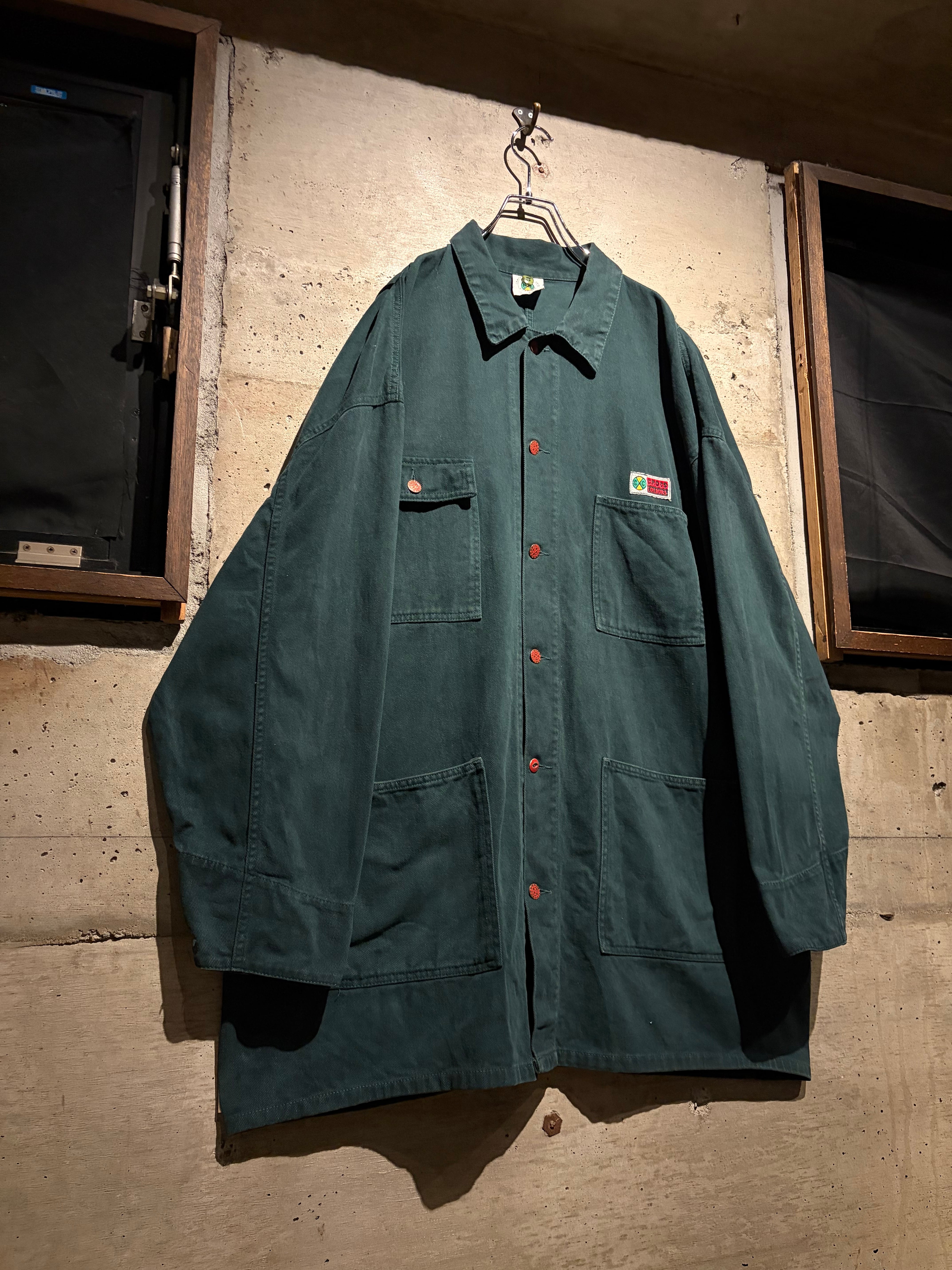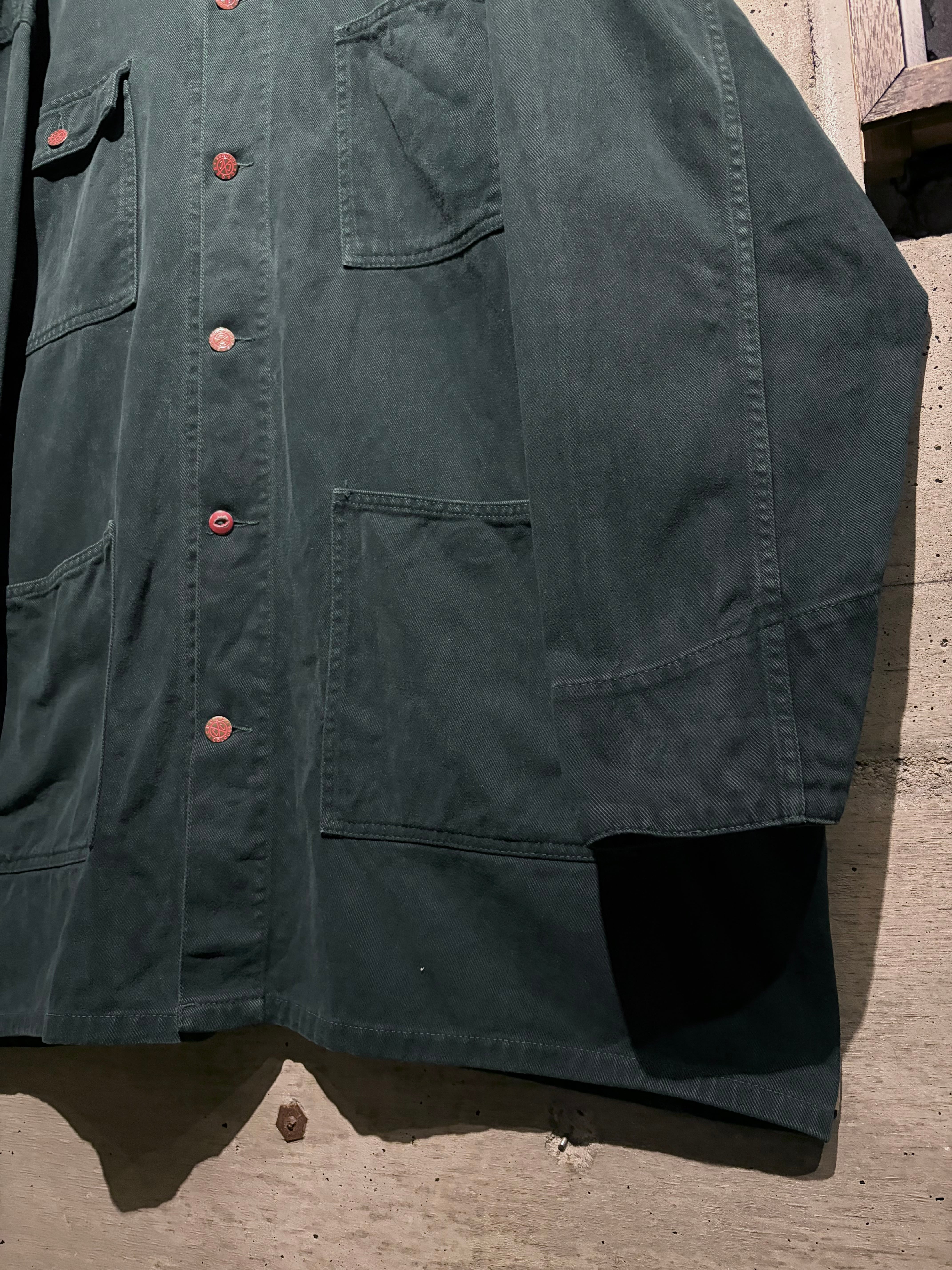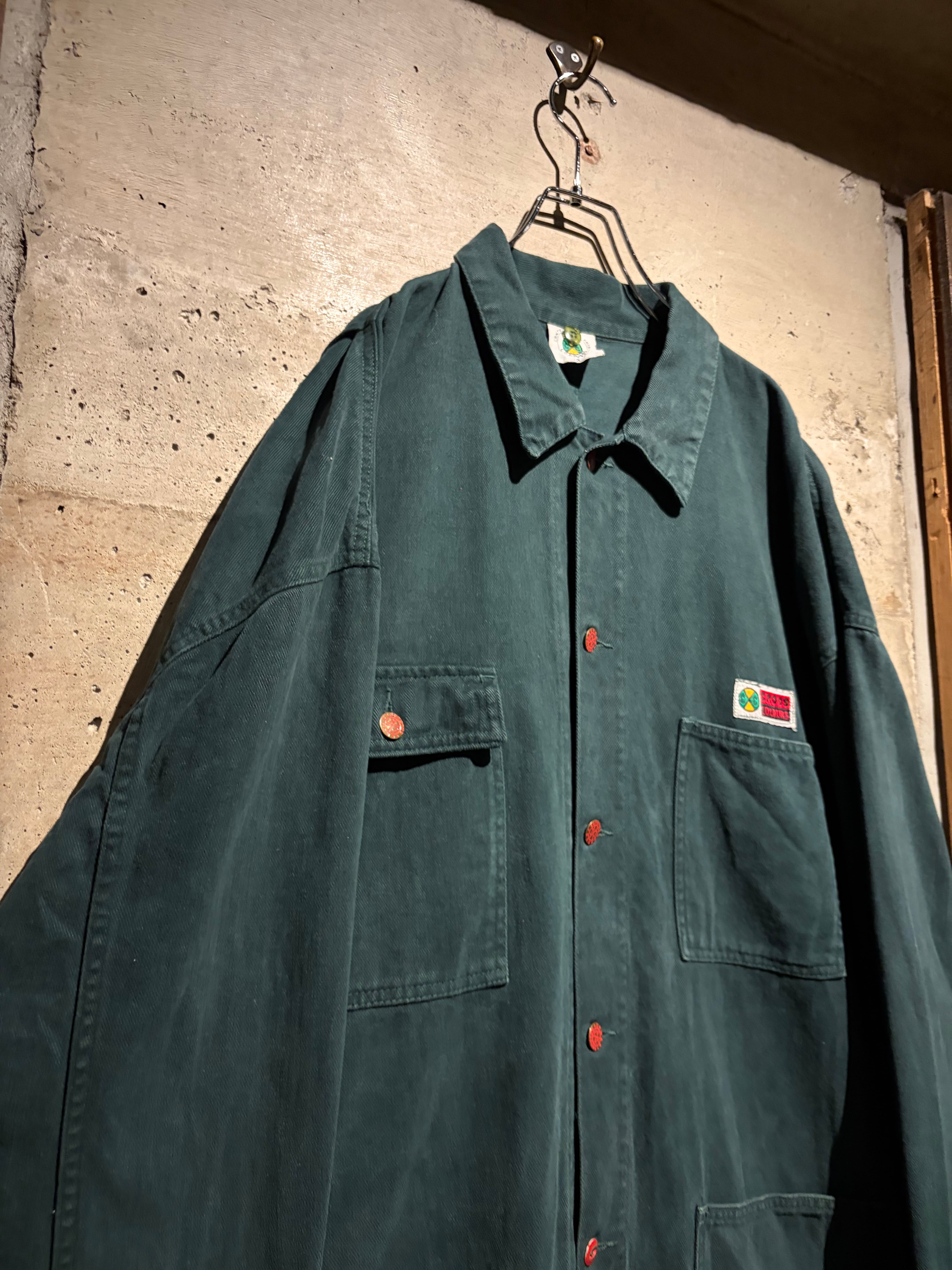 深みのある表情を見せる、後染めグリーンのデニムを使用した、USA製カバーオールタイプのデニムジャケット。