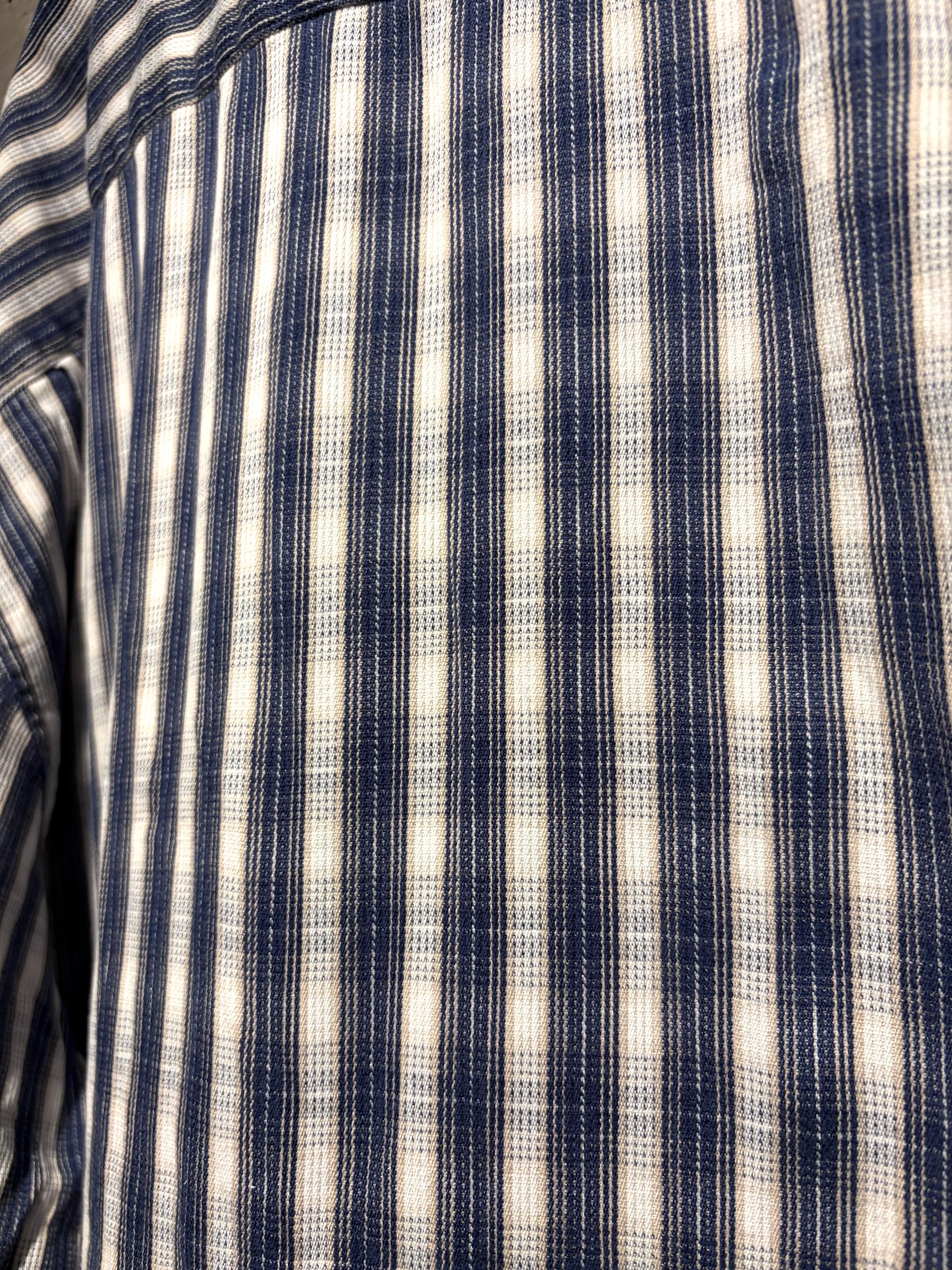 ブルー×ホワイトを基調とした細かなチェックパターンをやや凹凸のある織りで表現した、シンプルながらも立体的かつ柔らかな表情が特徴的な1着。
