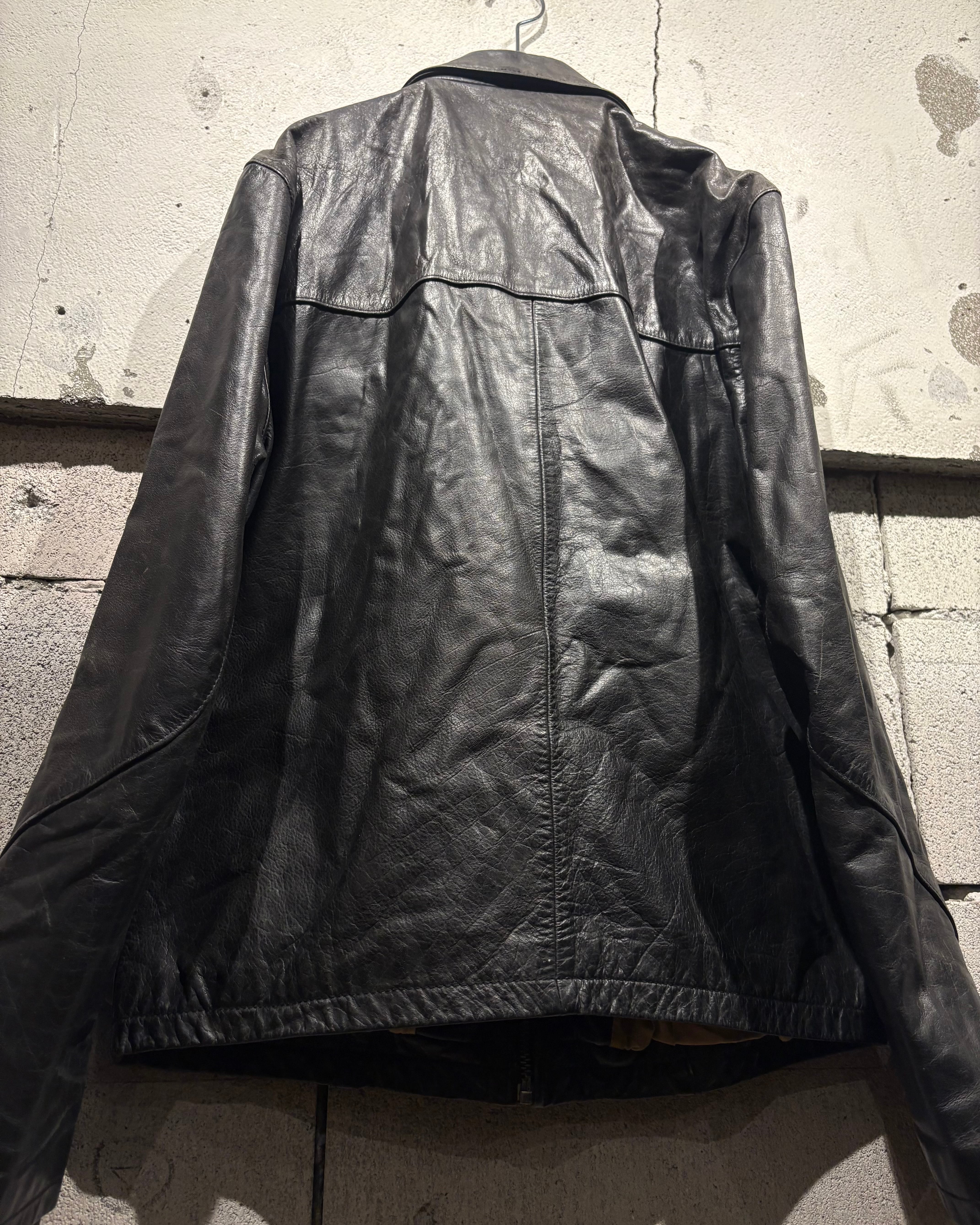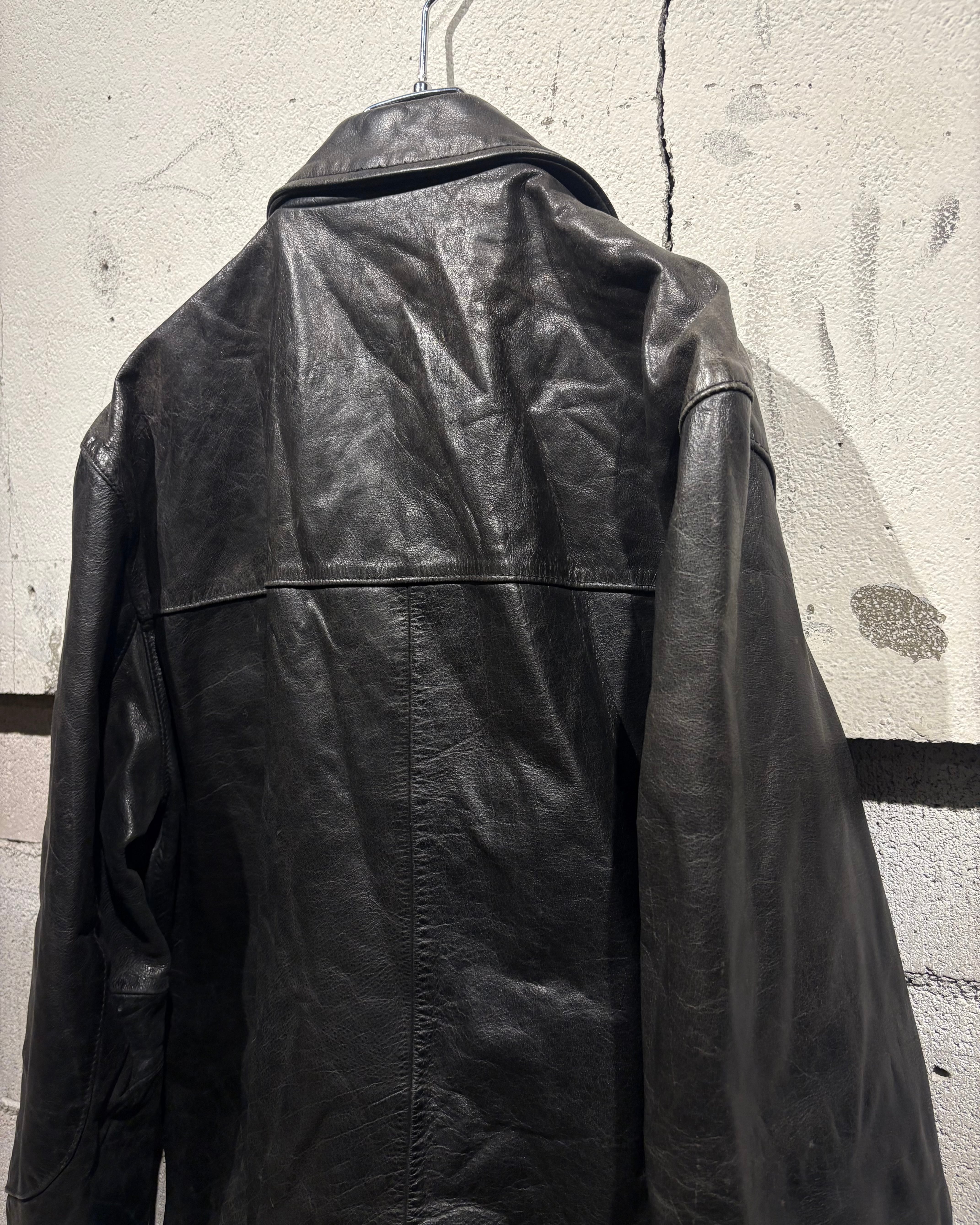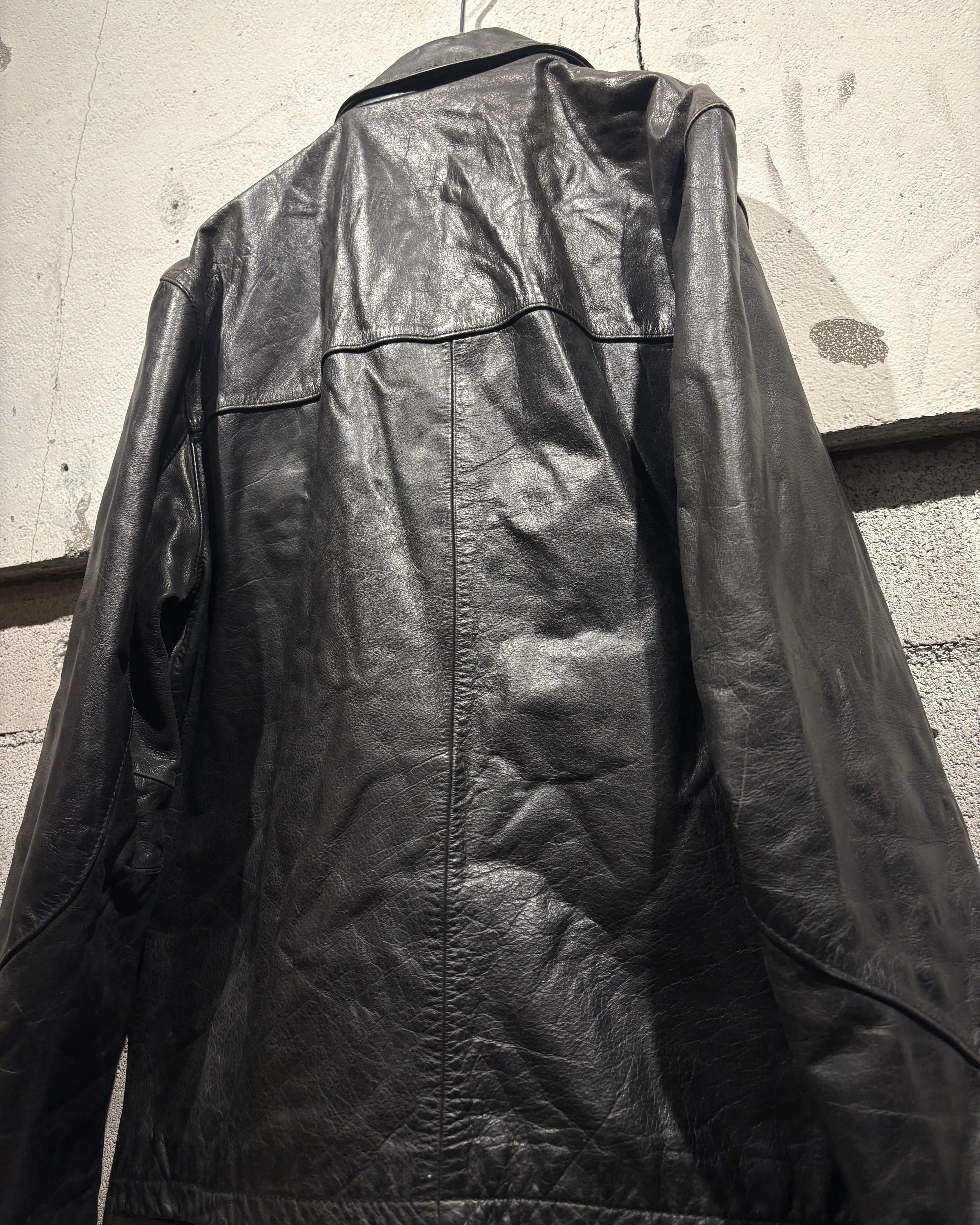 艶を抑えたブラックレザーに、経年による程良いフェード感が加わることで、奥行きのある表情に。しなやかで馴染みの良いレザーが身体に沿うように落ち、タフさの中に上品さを感じさせますね。