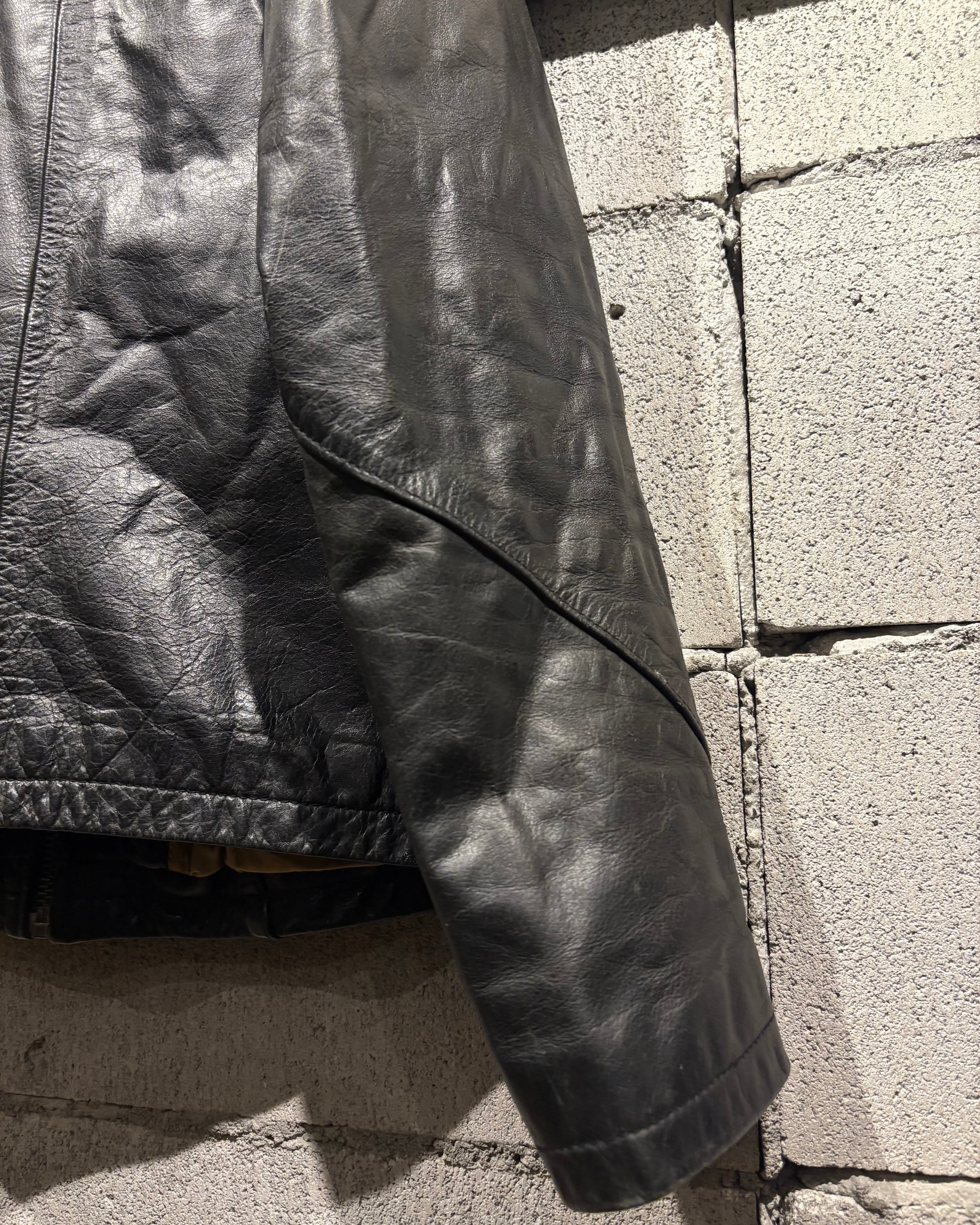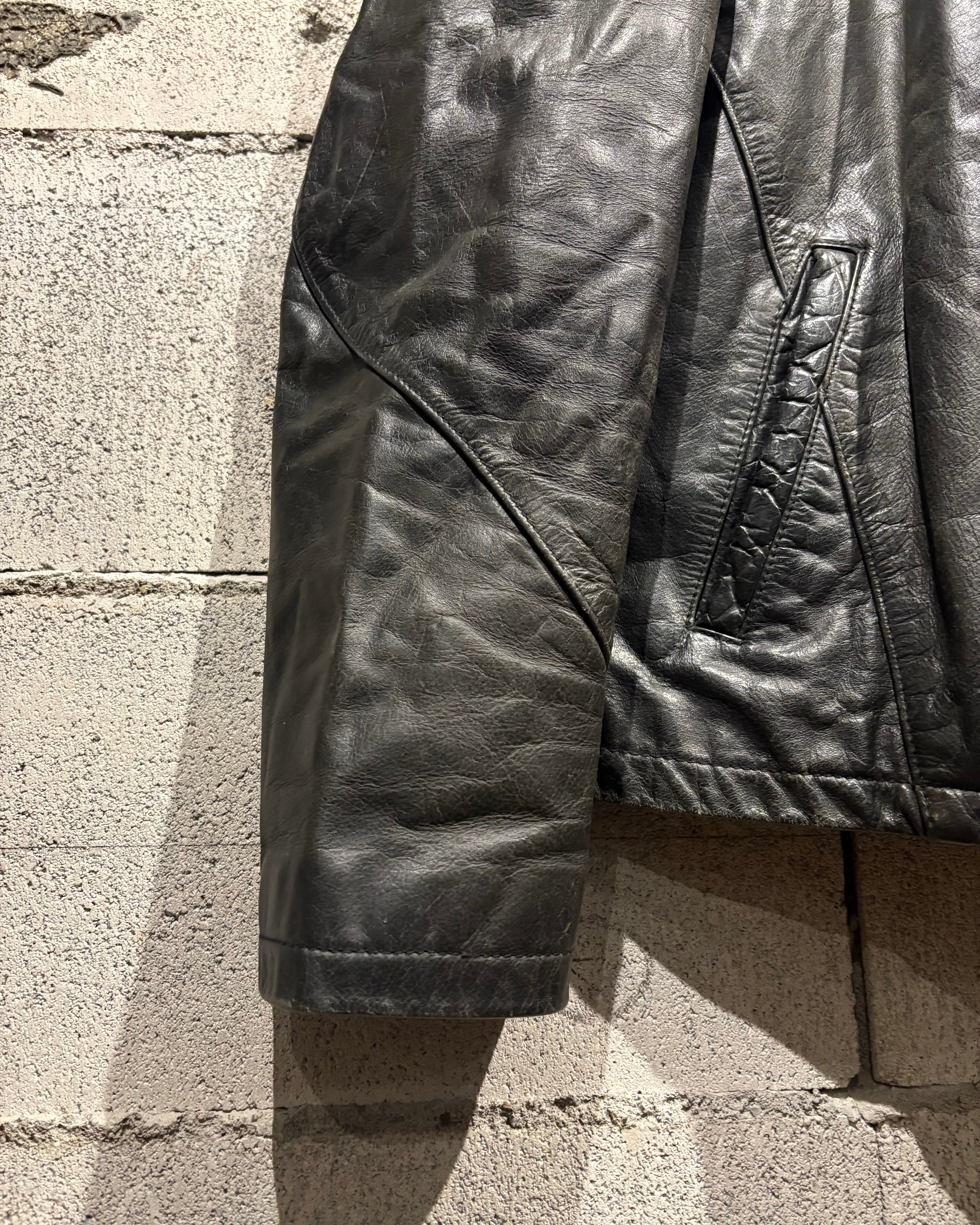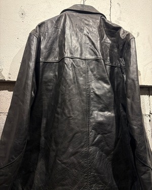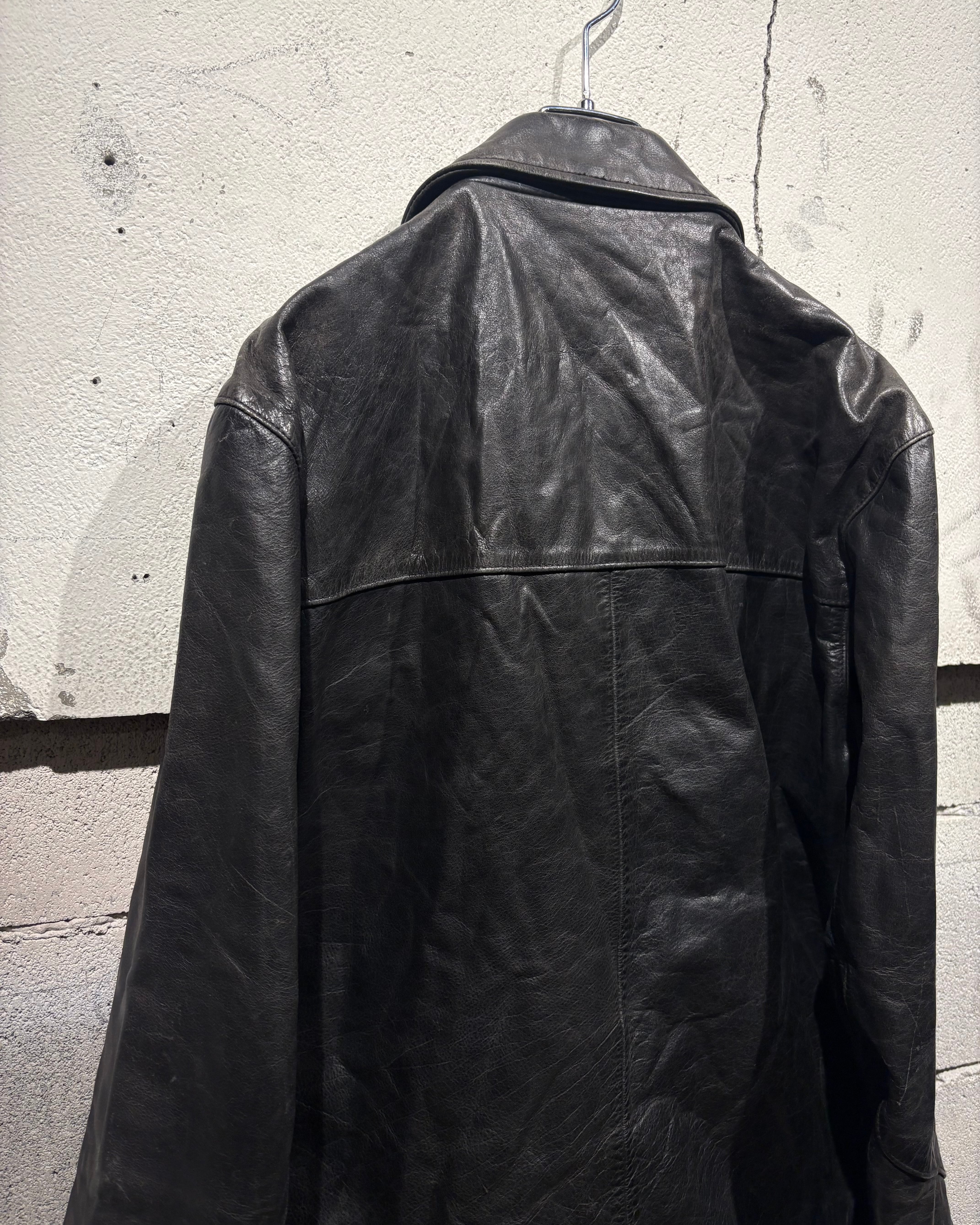 艶を抑えたブラックレザーに、経年による程良いフェード感が加わることで、奥行きのある表情に。しなやかで馴染みの良いレザーが身体に沿うように落ち、タフさの中に上品さを感じさせますね。
