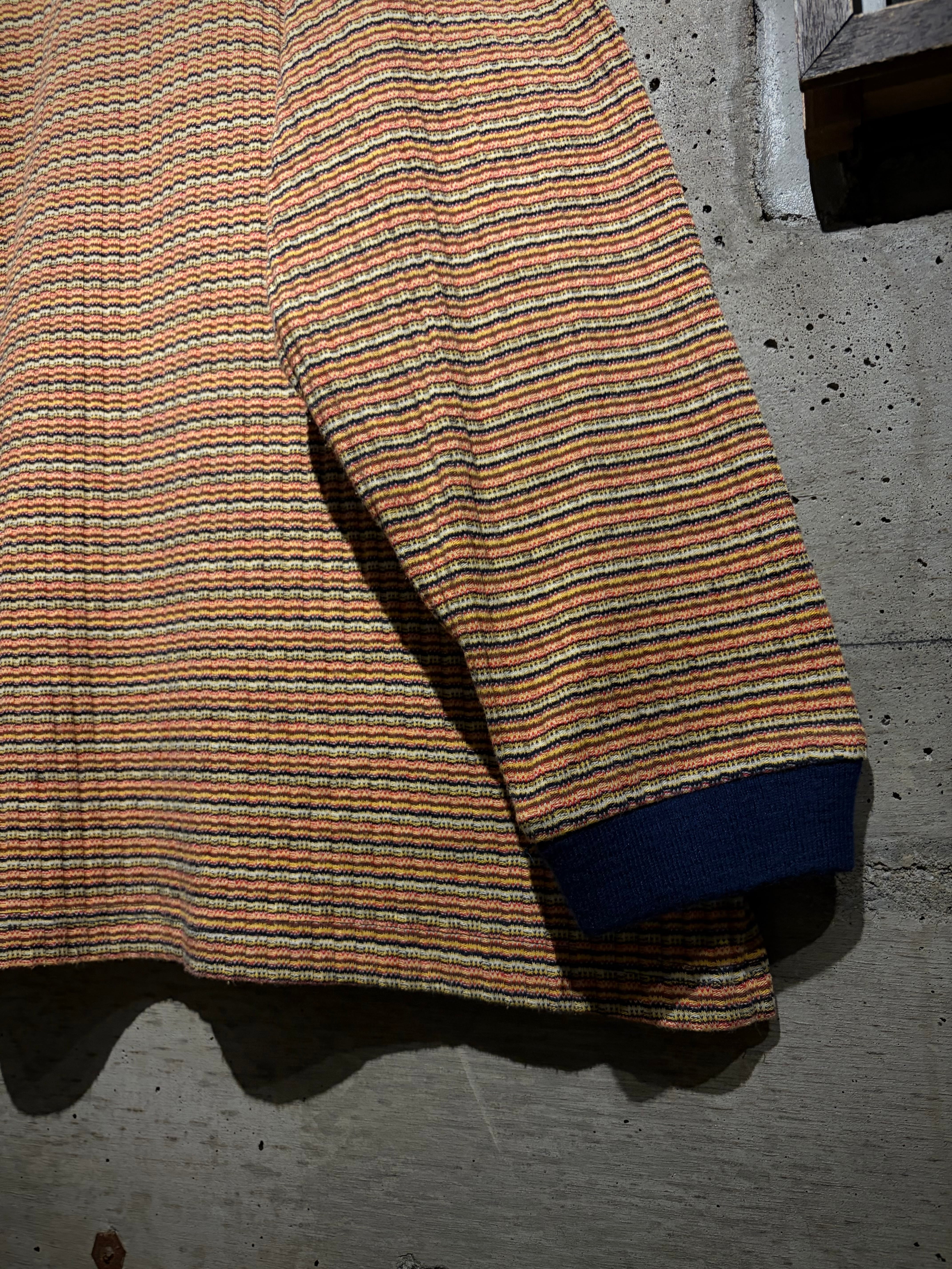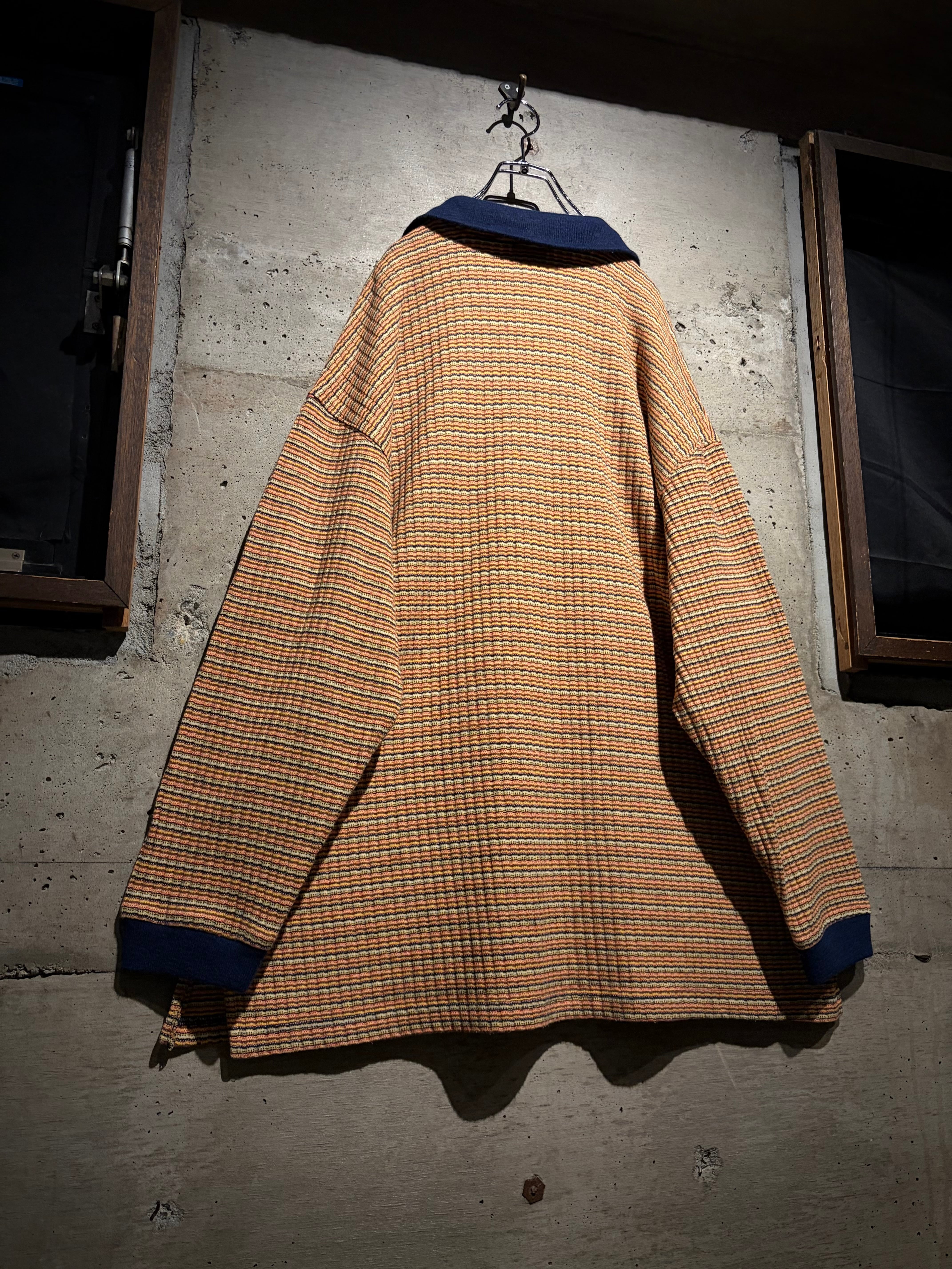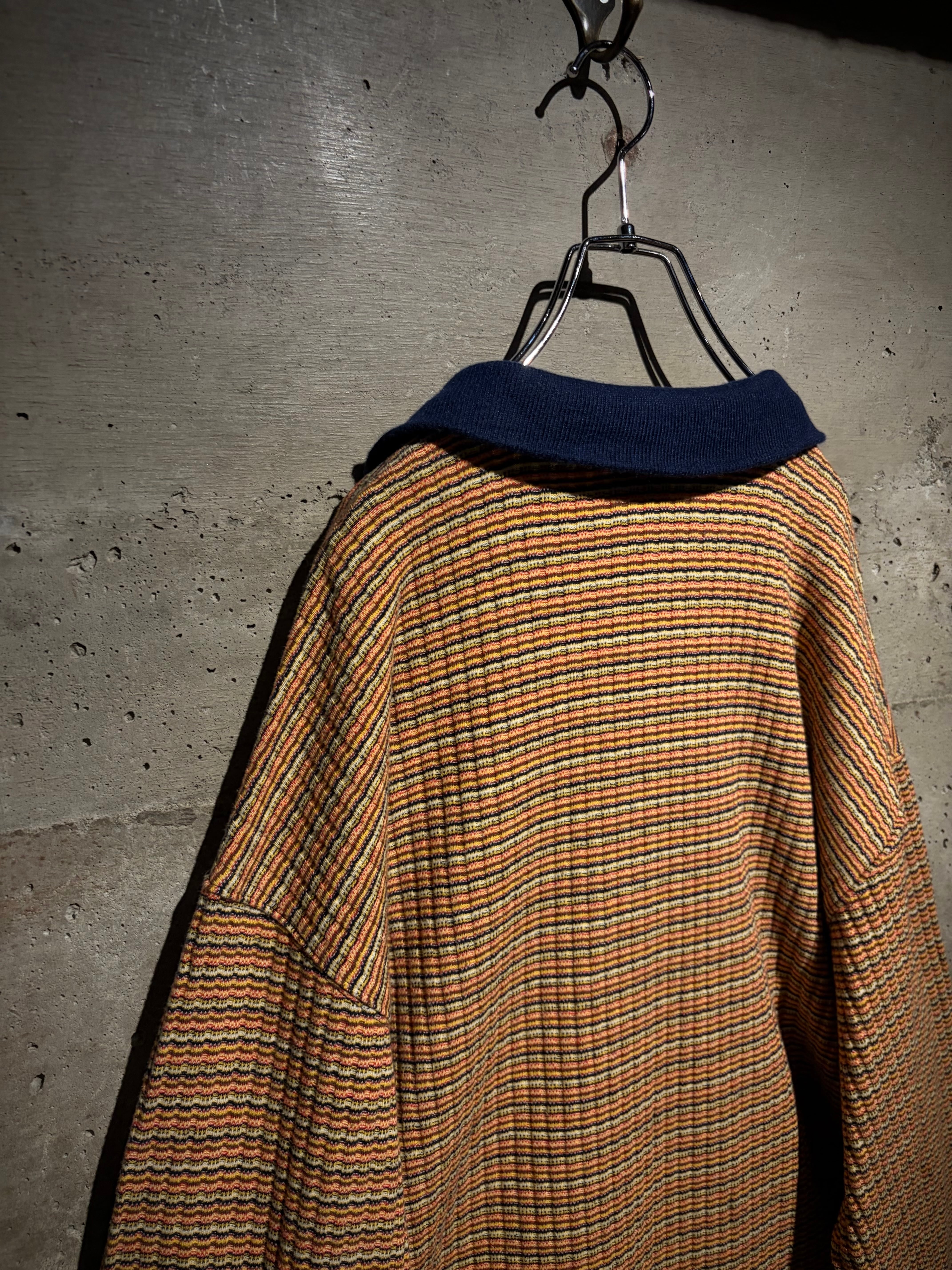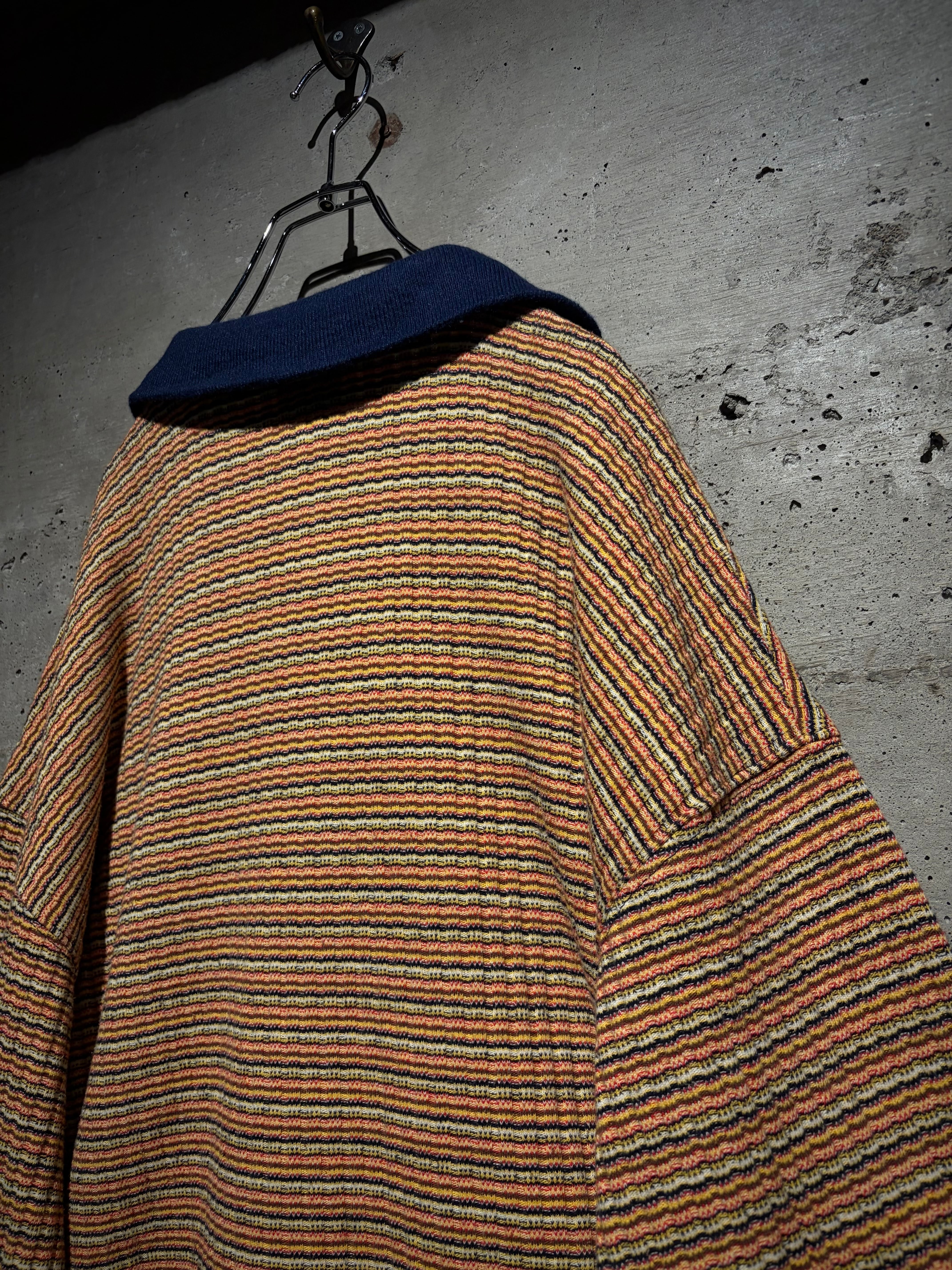 マルチカラーの細かなボーダーボディに、ネイビーの襟を切り替えた1着。凹凸のあるニッティング生地を採用することで、奥行きのある表情に昇華。